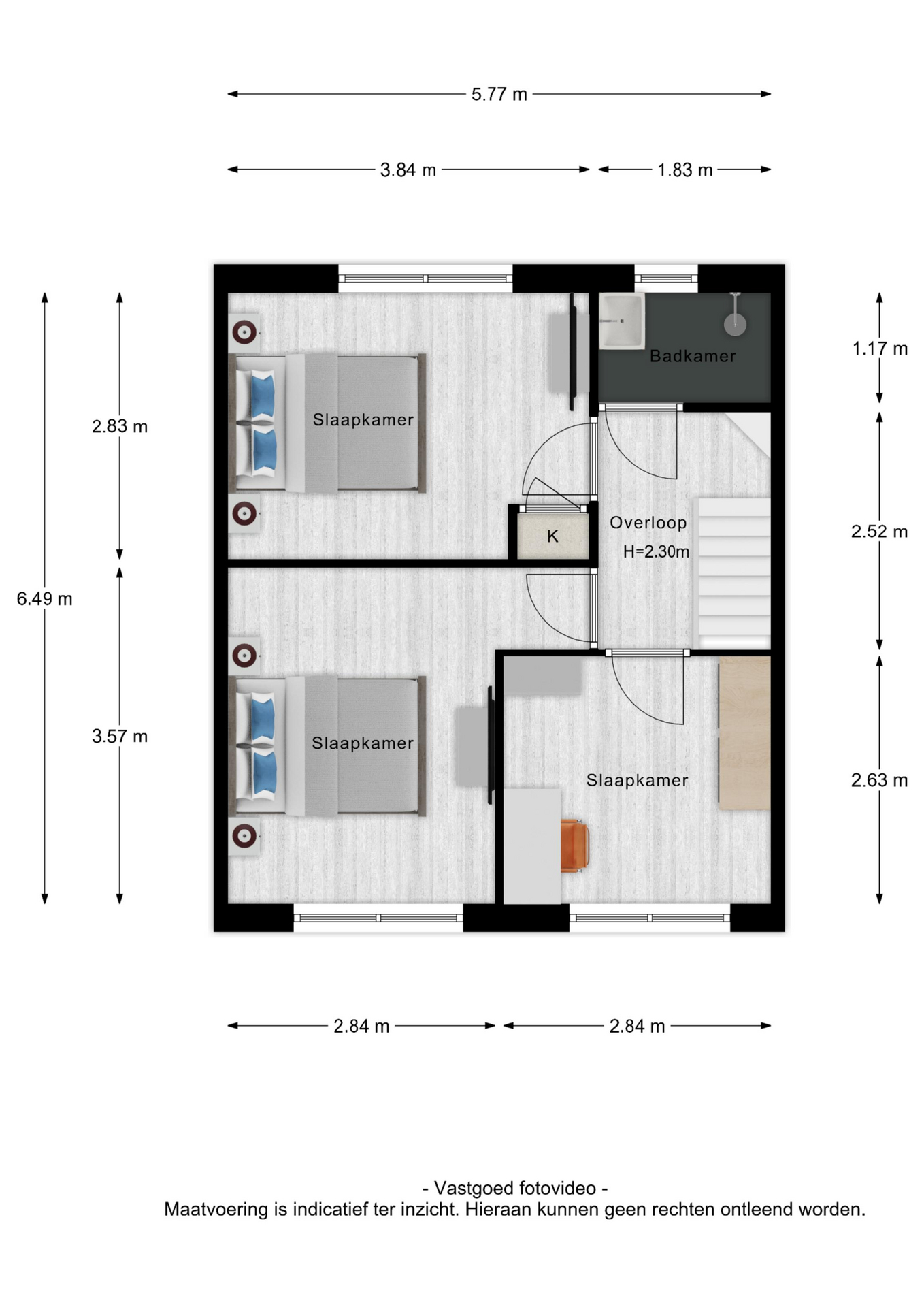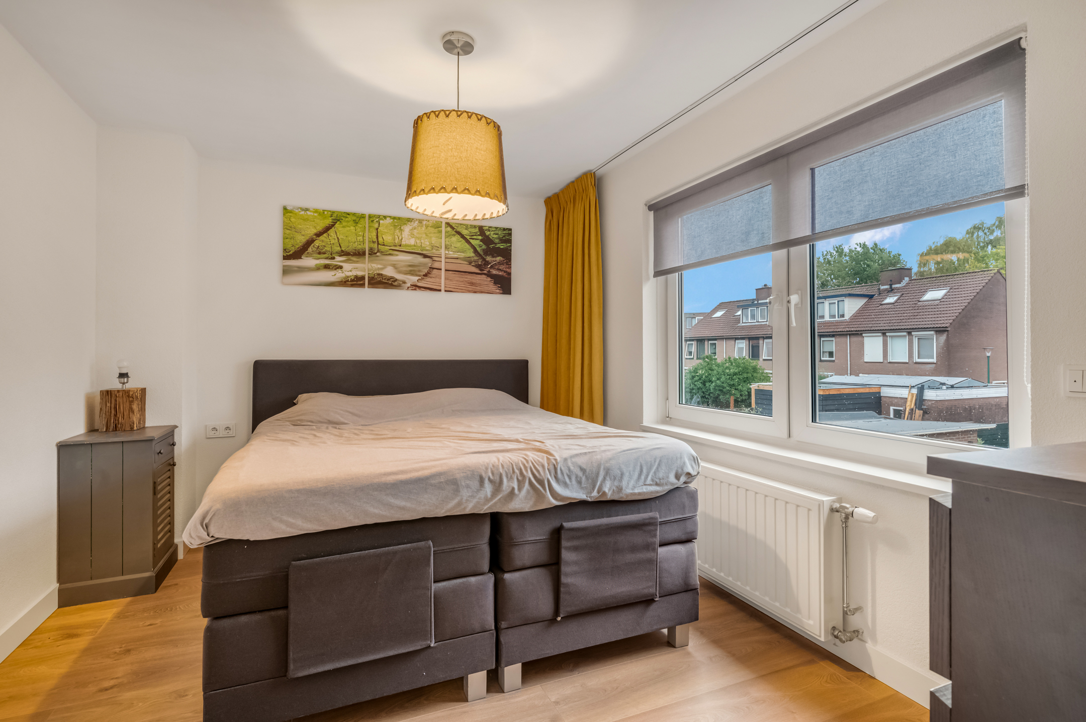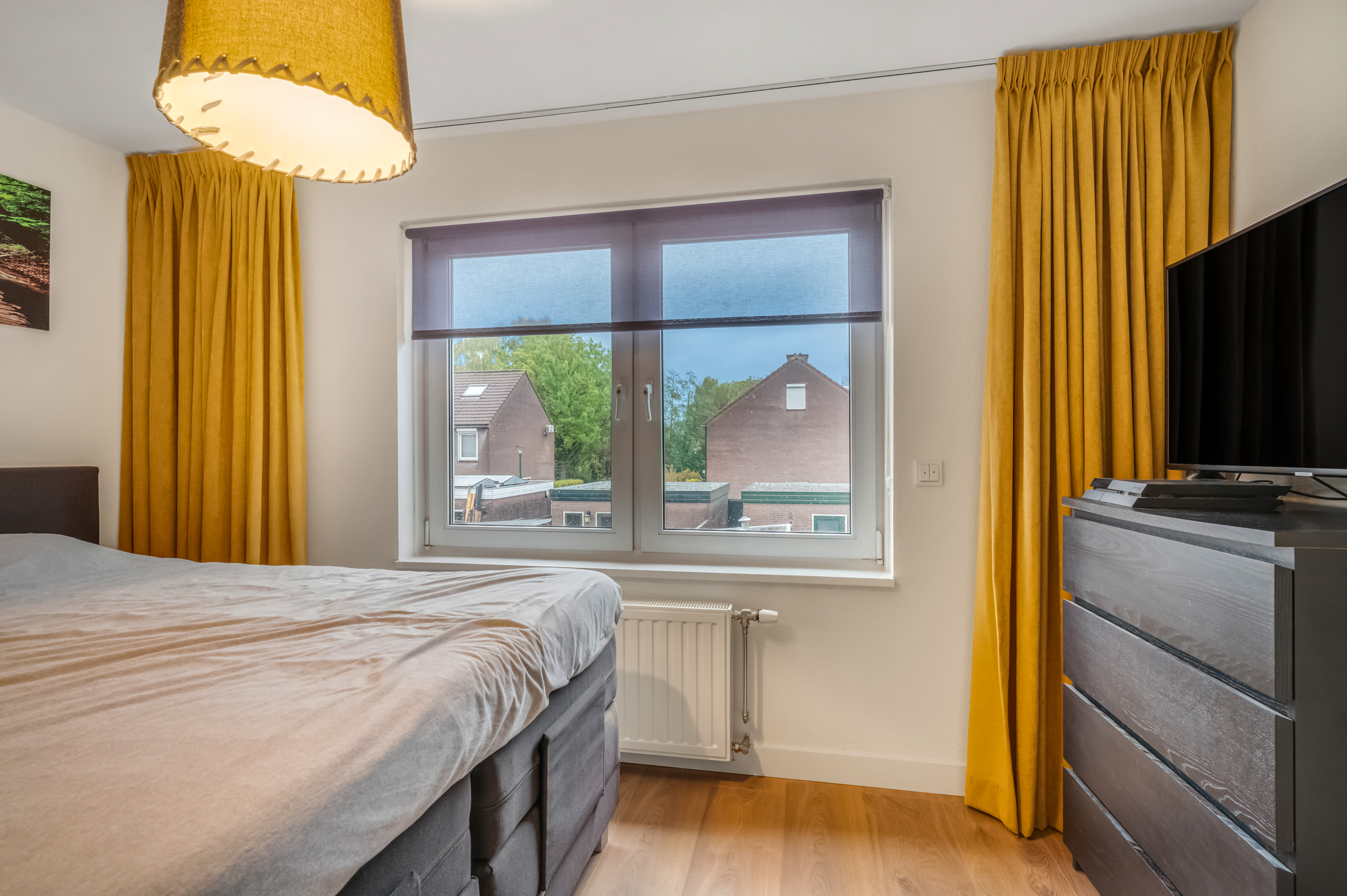 De overloop biedt toegang tot drie slaapkamers, allemaal voorzien van kunststof kozijnen en met HR-glas. De slaapkamer aan de achterzijde is uitgerust met een vaste kast. De moderne badkamer beschikt over een ruime inloopdouche, een wastafel en is fraai afgewerkt.