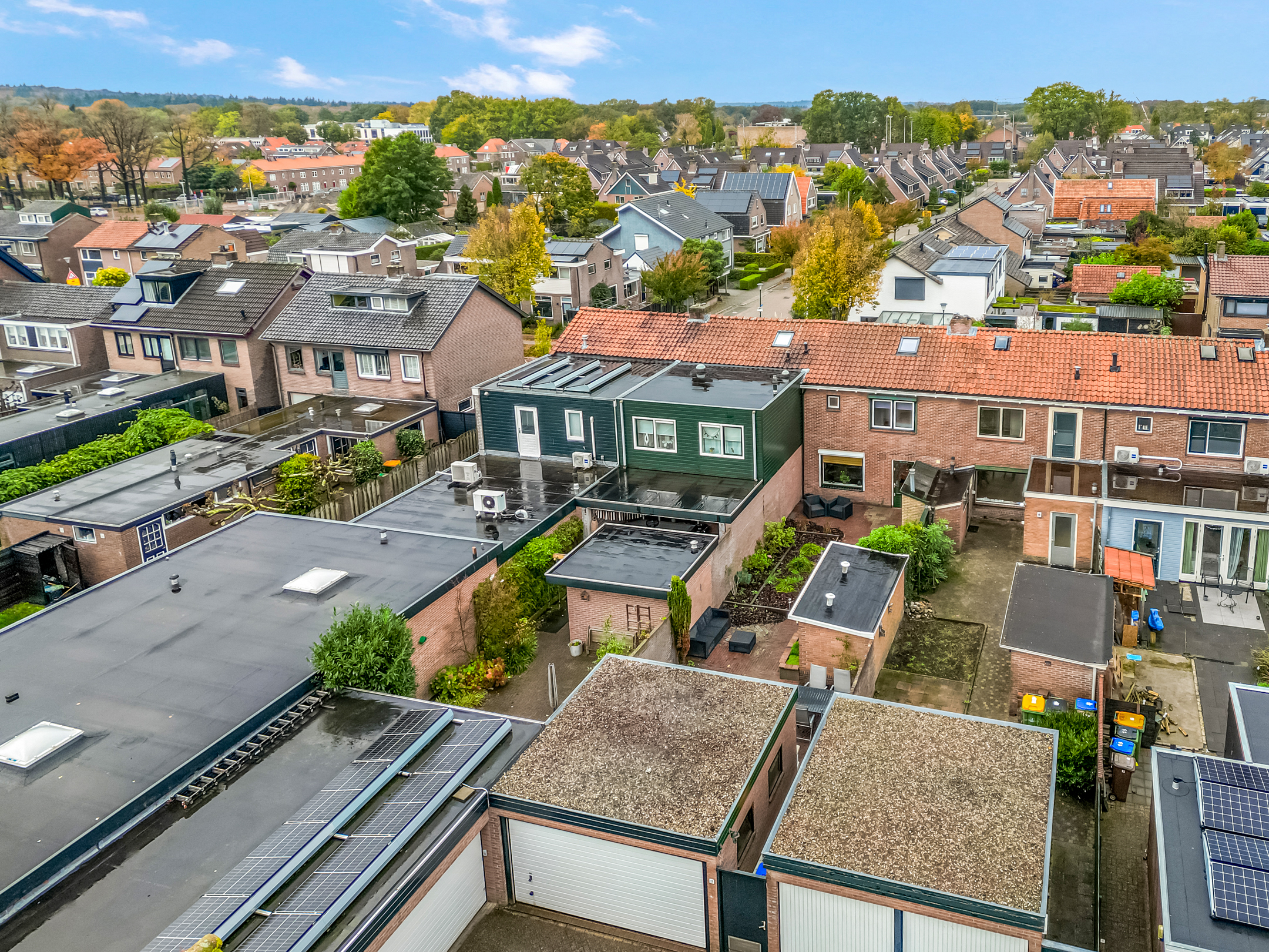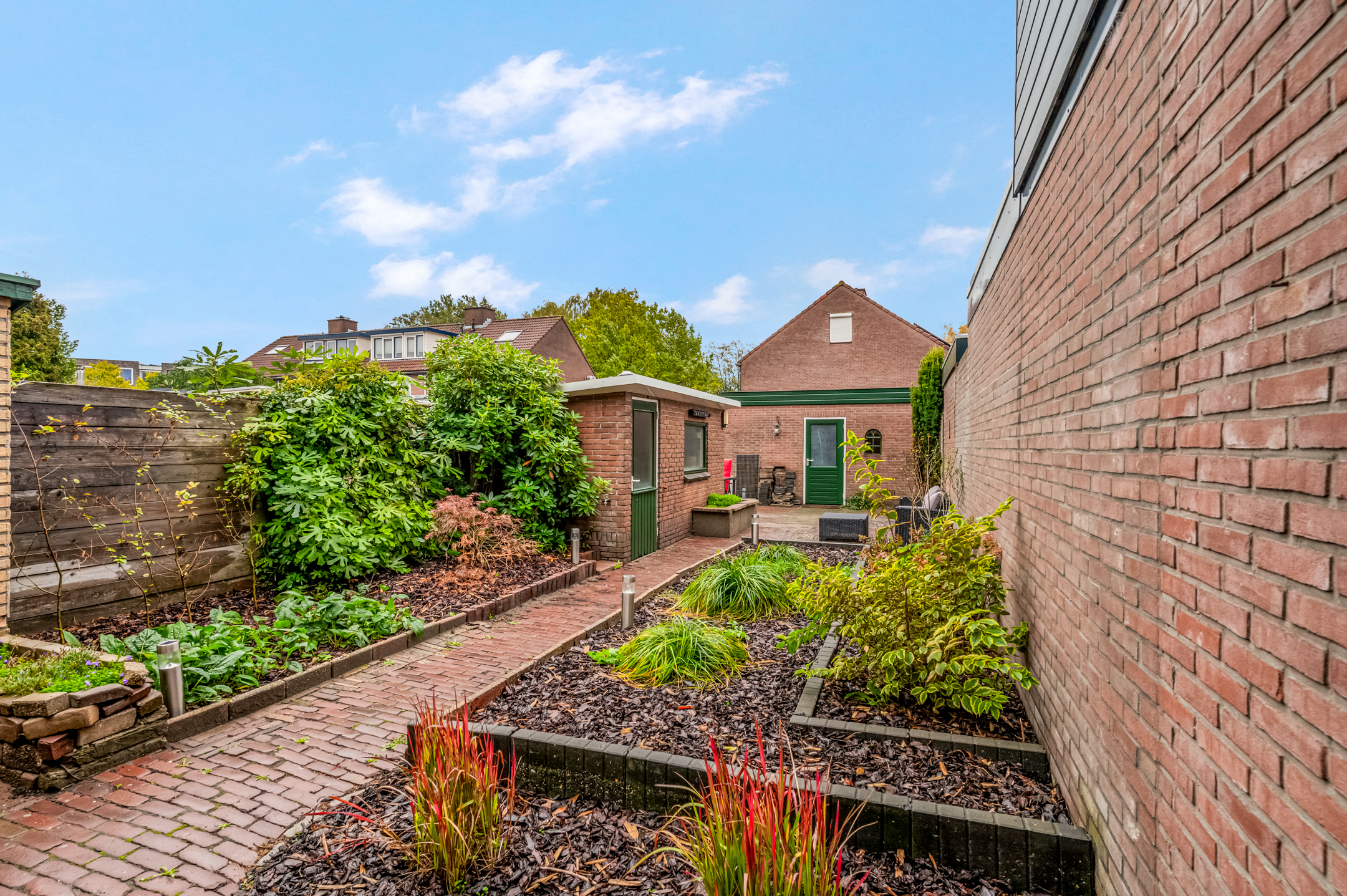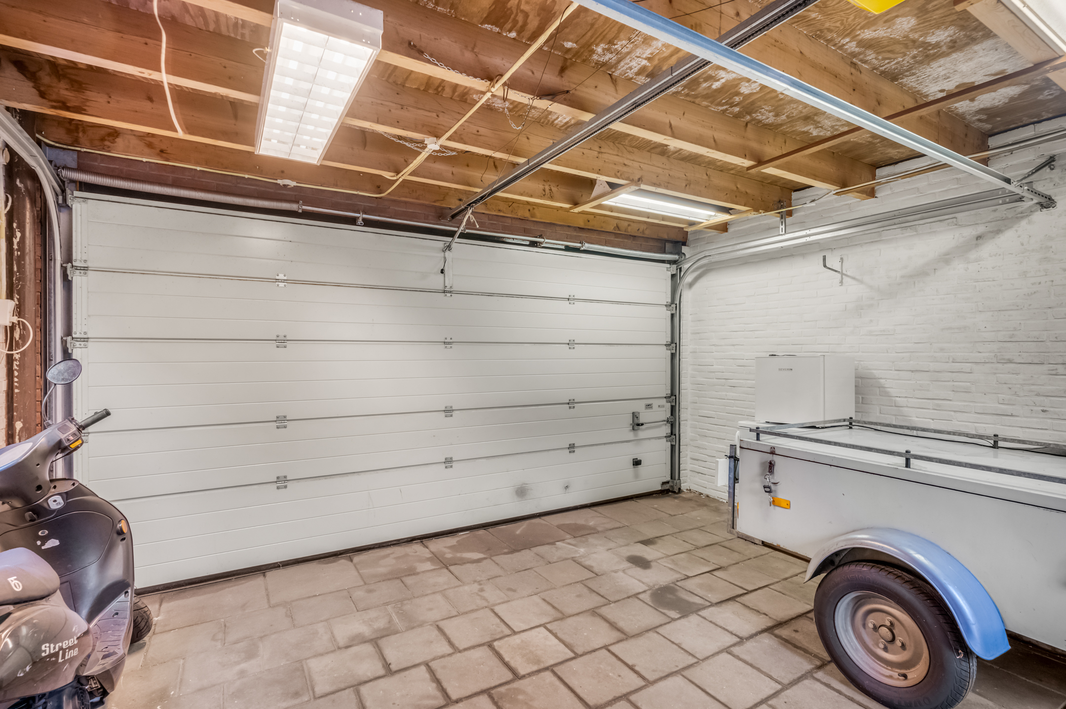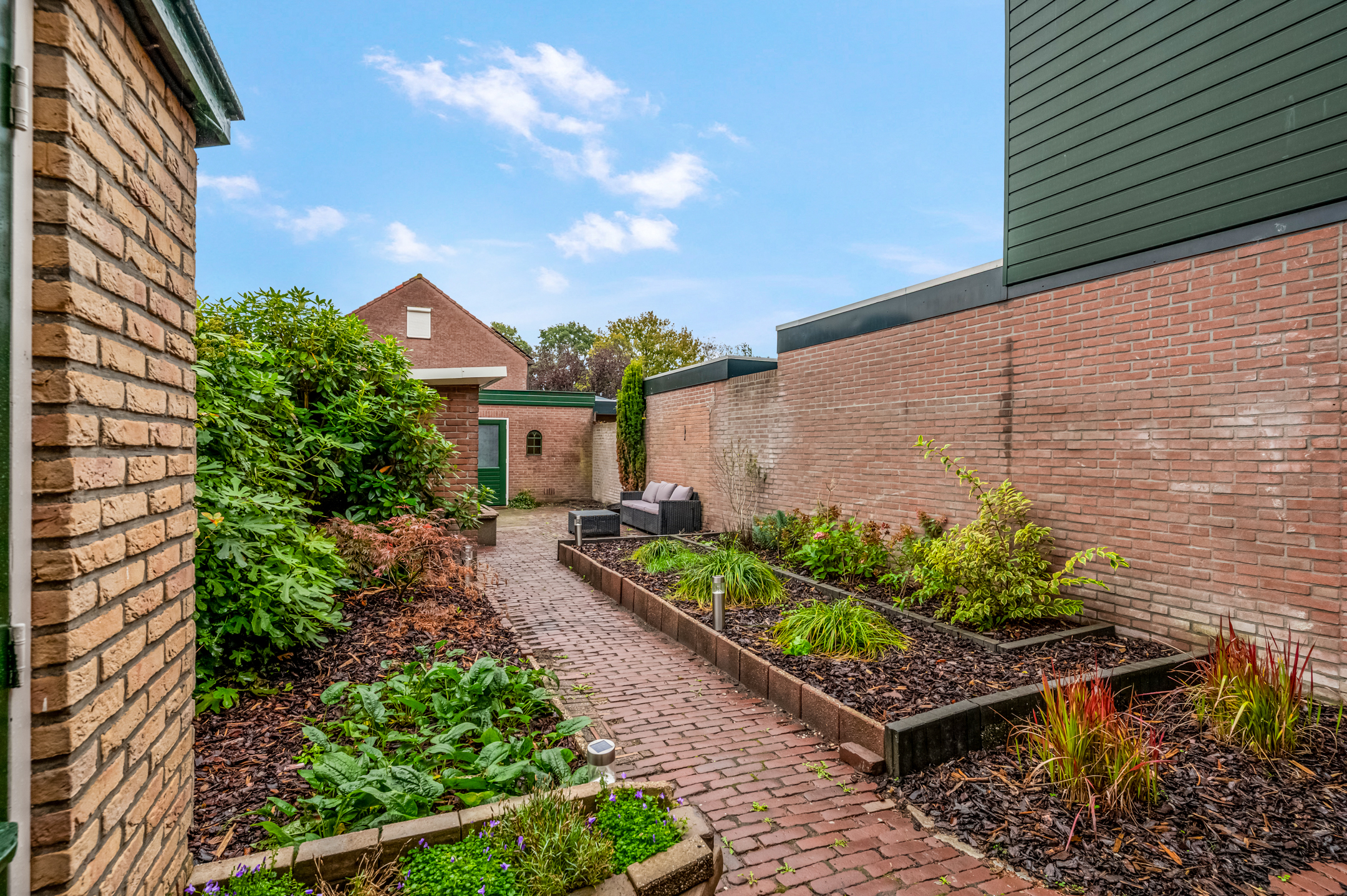 De achtertuin ligt op het zuidoosten en is ingericht met sierbestrating en diverse borders. De tuin is bereikbaar via een poort of via de dubbele garage. Achterin de tuin staat de vrijstaande dubbele garage met elektrische deur, geschikt voor twee auto’s. Tevens is er een extra berging aanwezig voor tuingereedschap of fietsen.