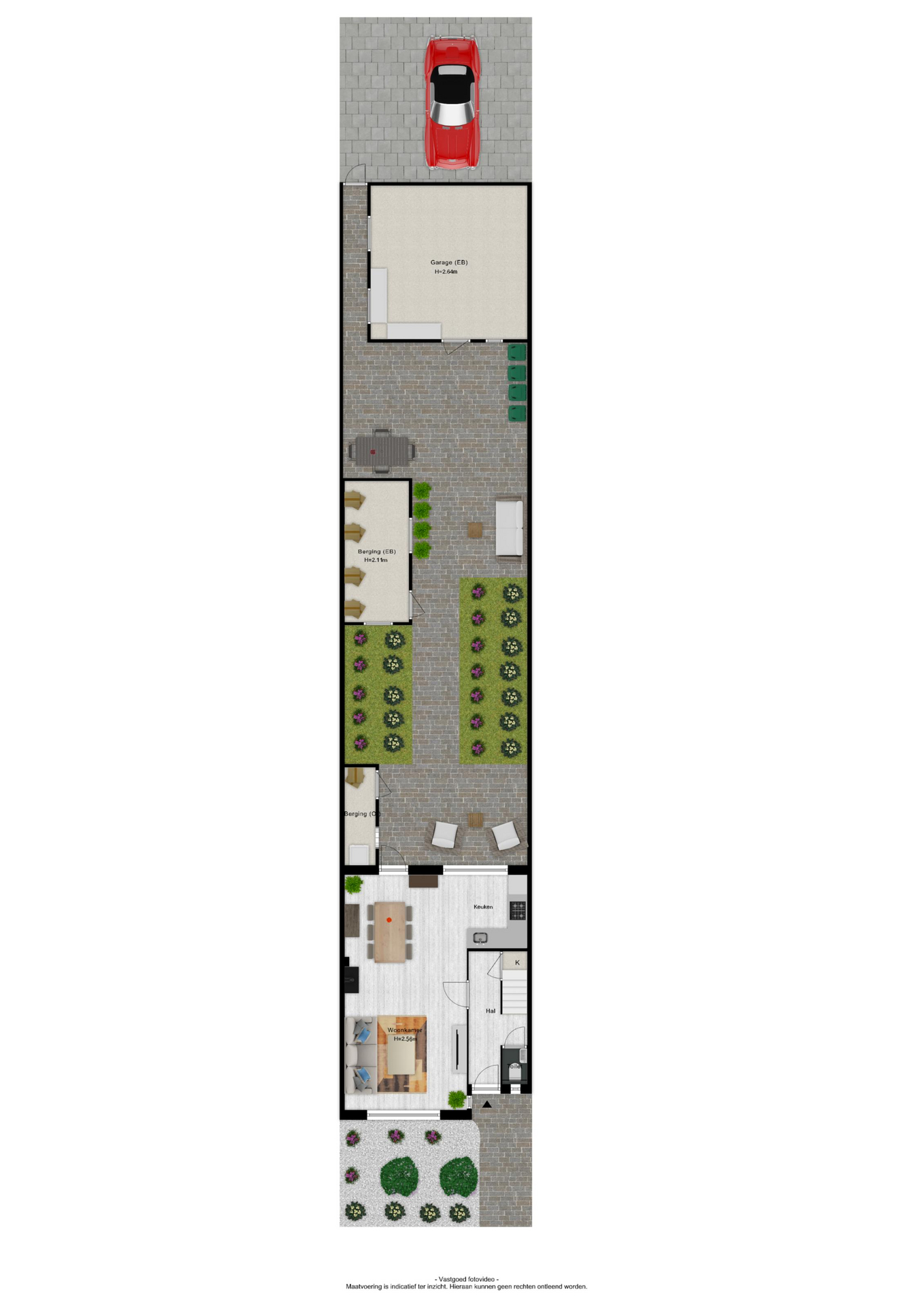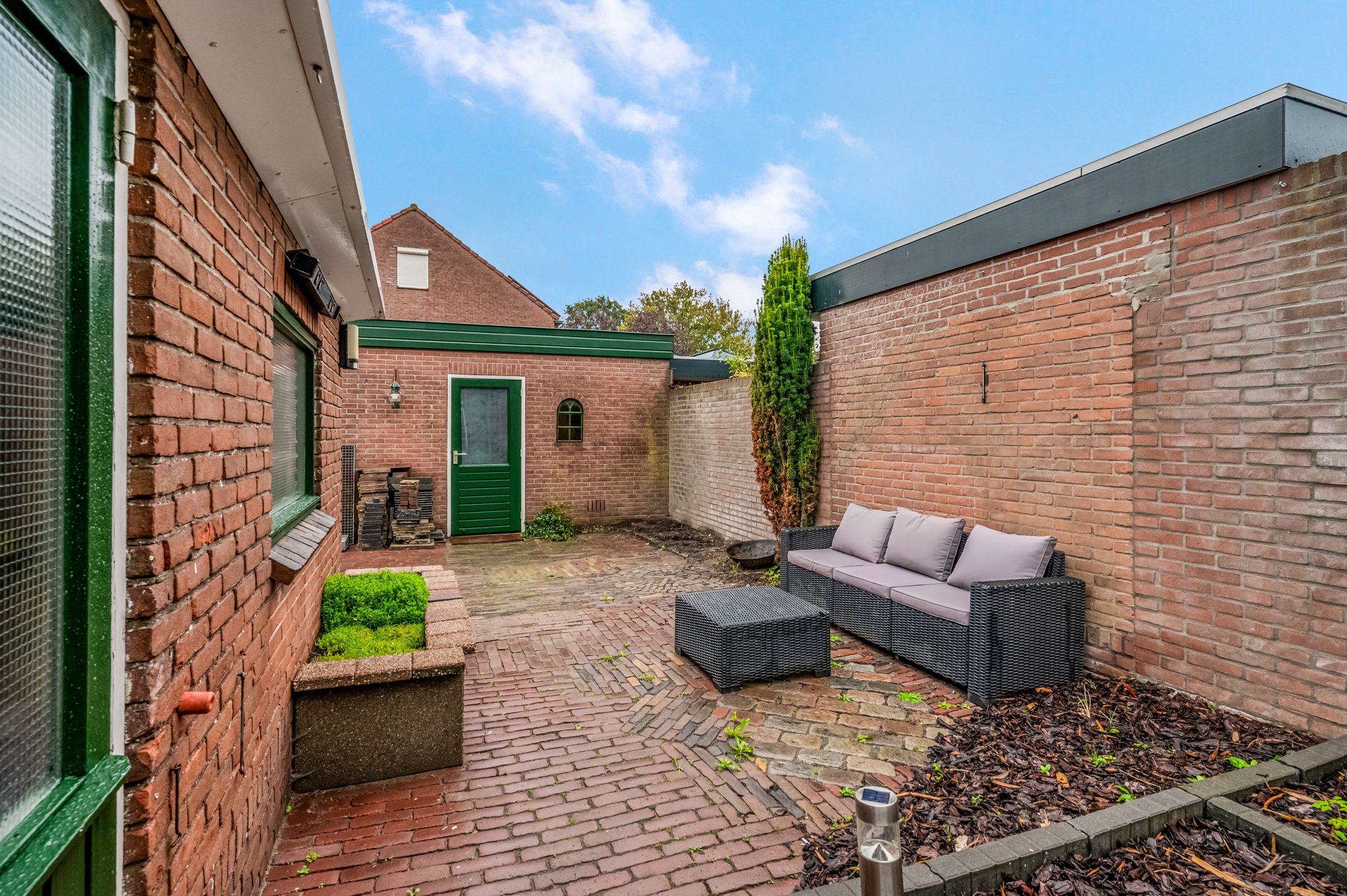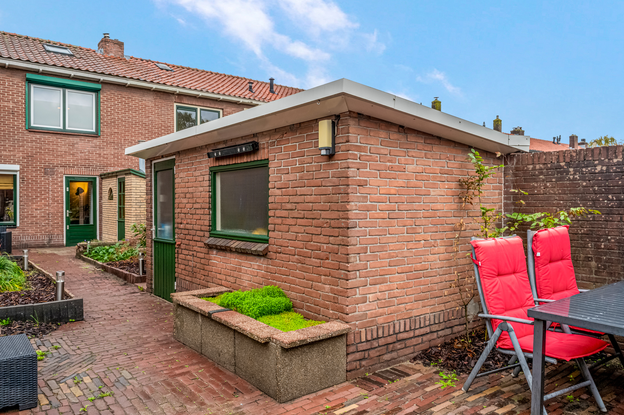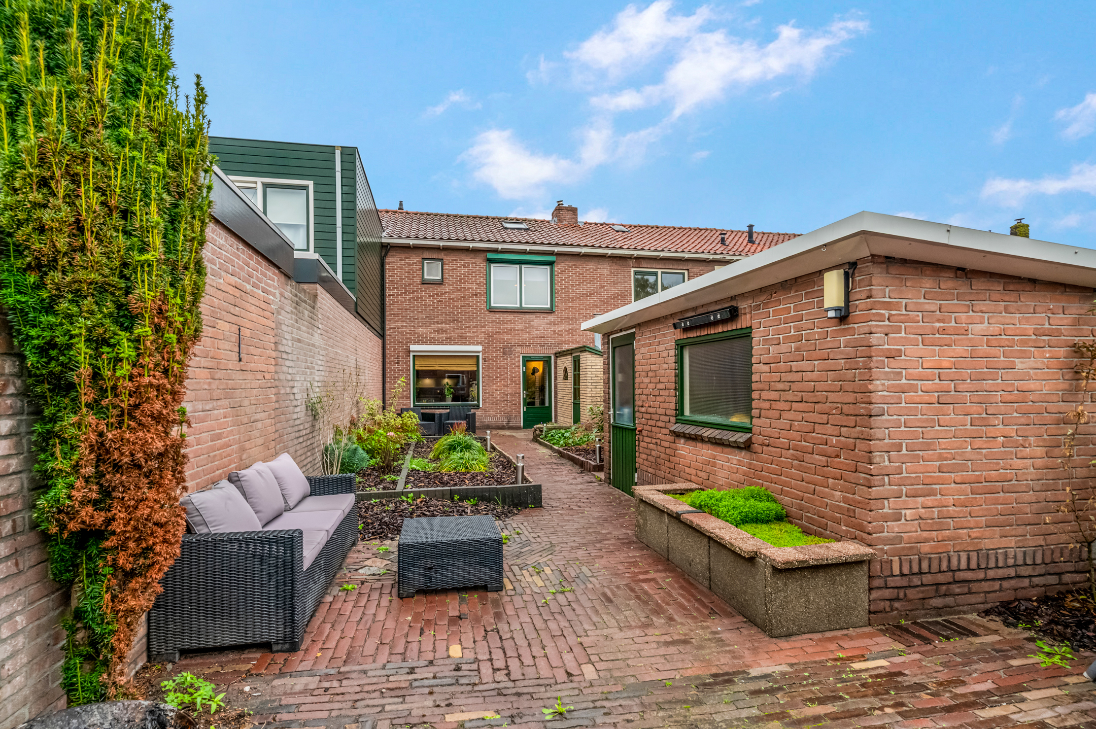 De achtertuin ligt op het zuidoosten en is ingericht met sierbestrating en diverse borders. De tuin is bereikbaar via een poort of via de dubbele garage. Achterin de tuin staat de vrijstaande dubbele garage met elektrische deur, geschikt voor twee auto’s. Tevens is er een extra berging aanwezig voor tuingereedschap of fietsen.