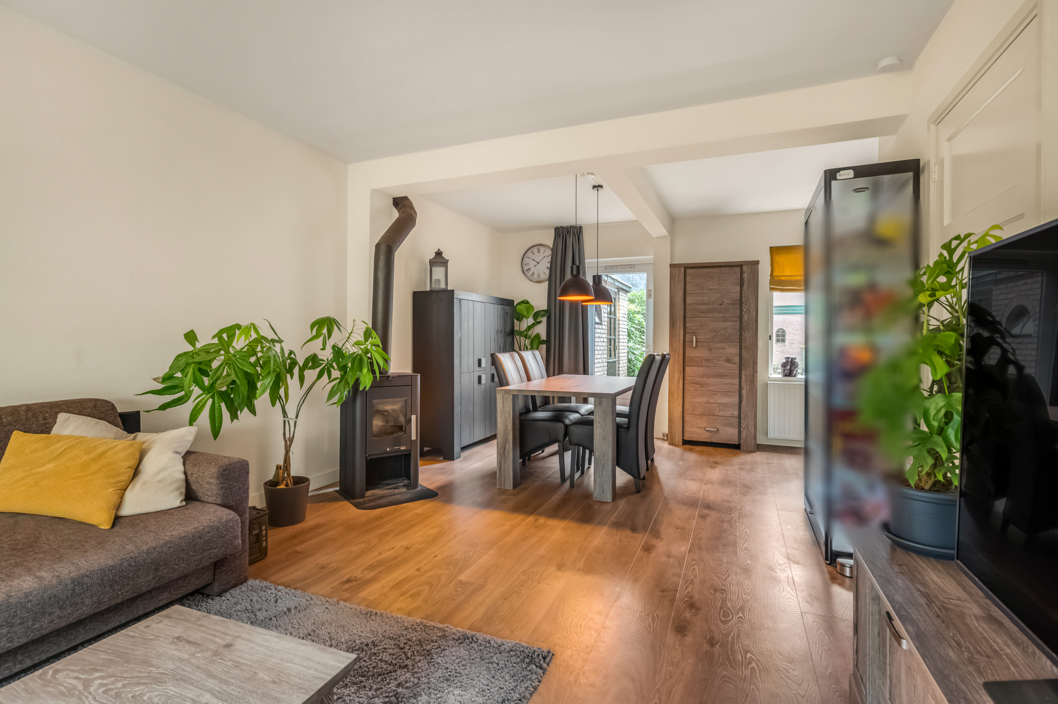 Via de entree bereik je de hal met toiletruimte, trapkast en meterkast. Vanuit de hal kom je in de gezellige woonkamer met een prettig zitgedeelte en een eetgedeelte. De woonkamer is voorzien van een houthaard, wat bijdraagt aan de warme en sfeervolle uitstraling.
