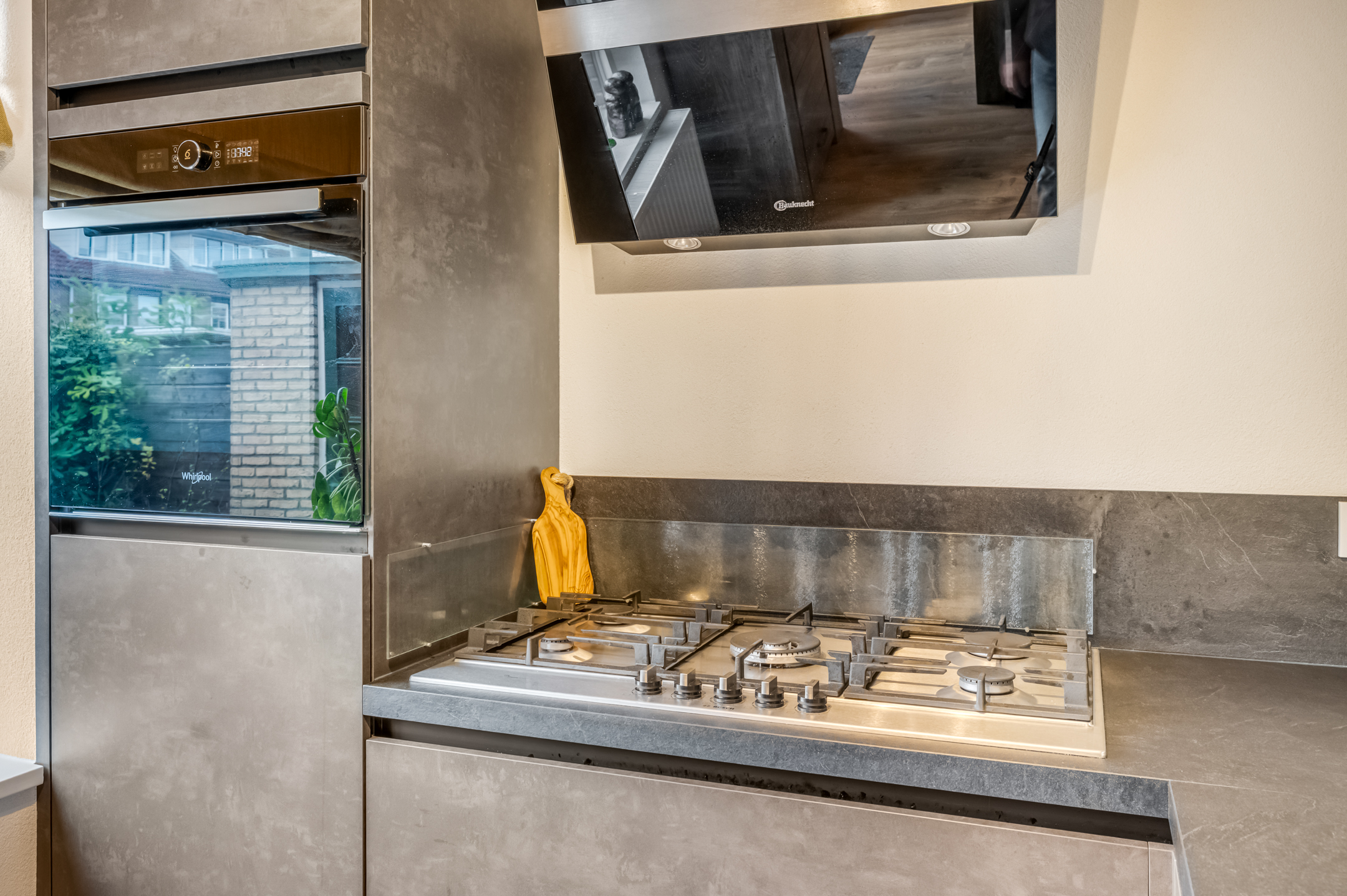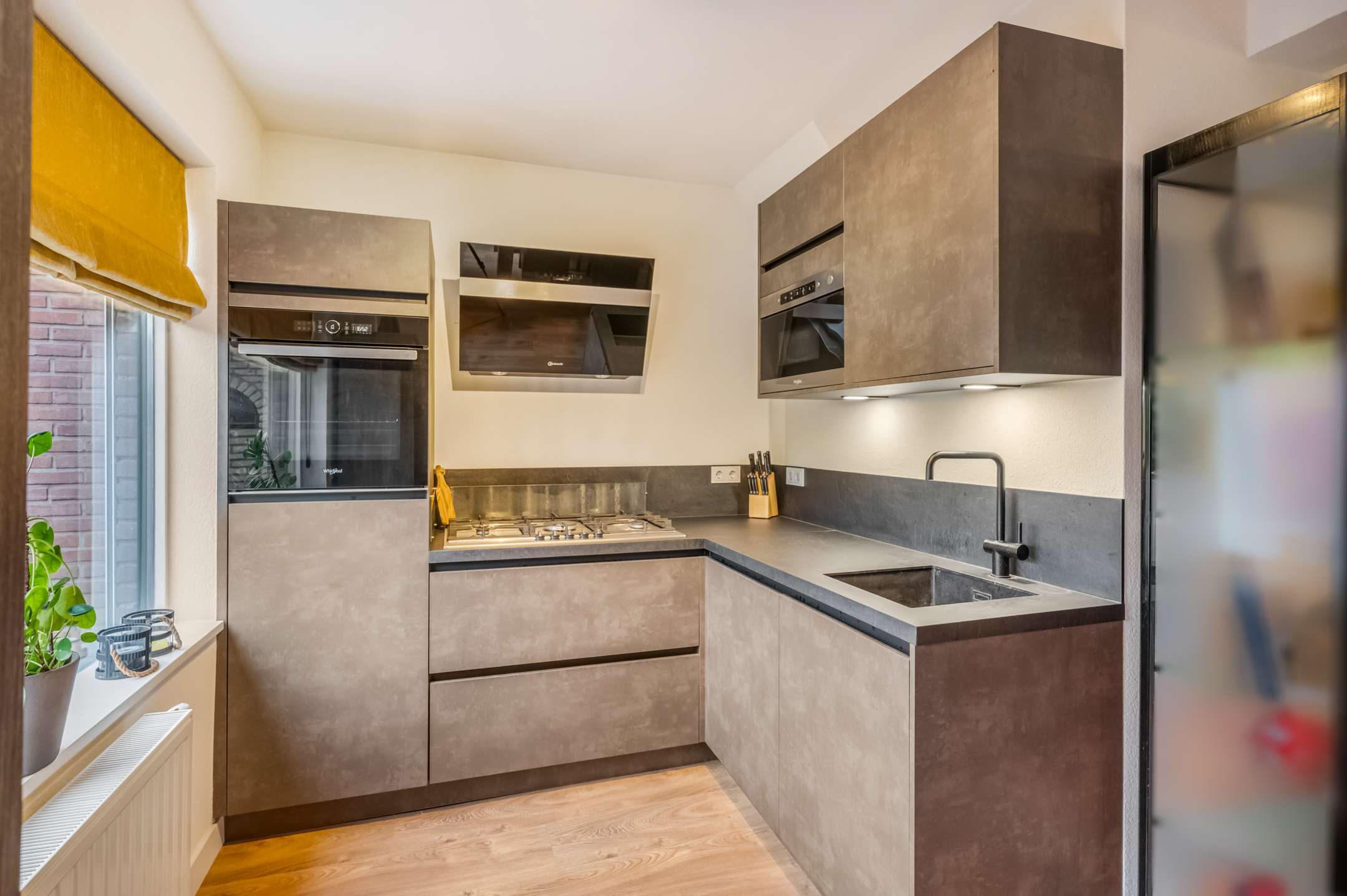 Aansluitend vind je de L-vormige keuken, voorzien van onder- en bovenkasten, koelkast, combimagnetron, gaskookplaat en afzuigkap. De keuken is keurig onderhouden en biedt voldoende werkruimte. Buitenom is de aangebouwde bijkeuken bereikbaar met wasmachine- en drogeraansluiting. Deze ruimte is ook ideaal voor de opslag van voorraad of tuingereedschap.