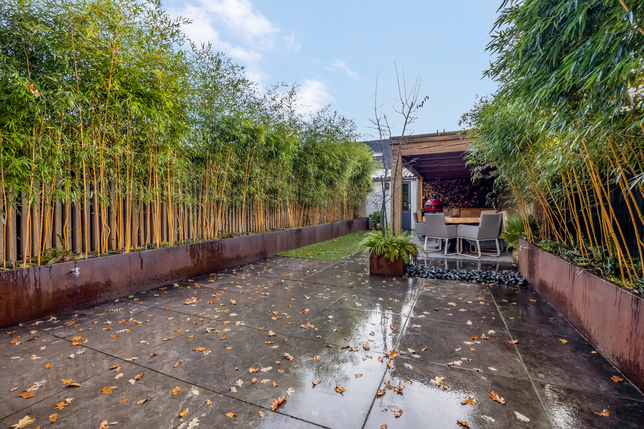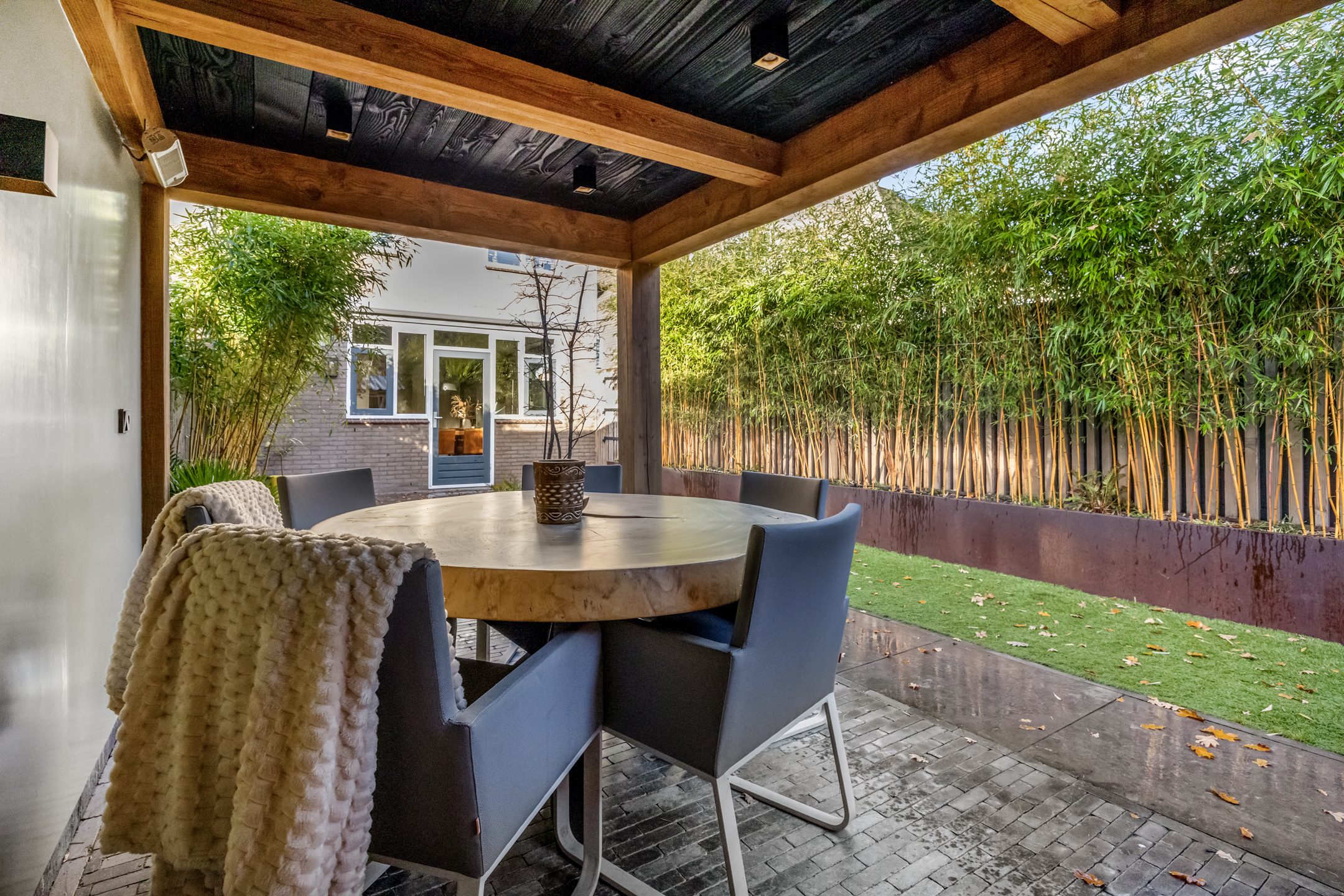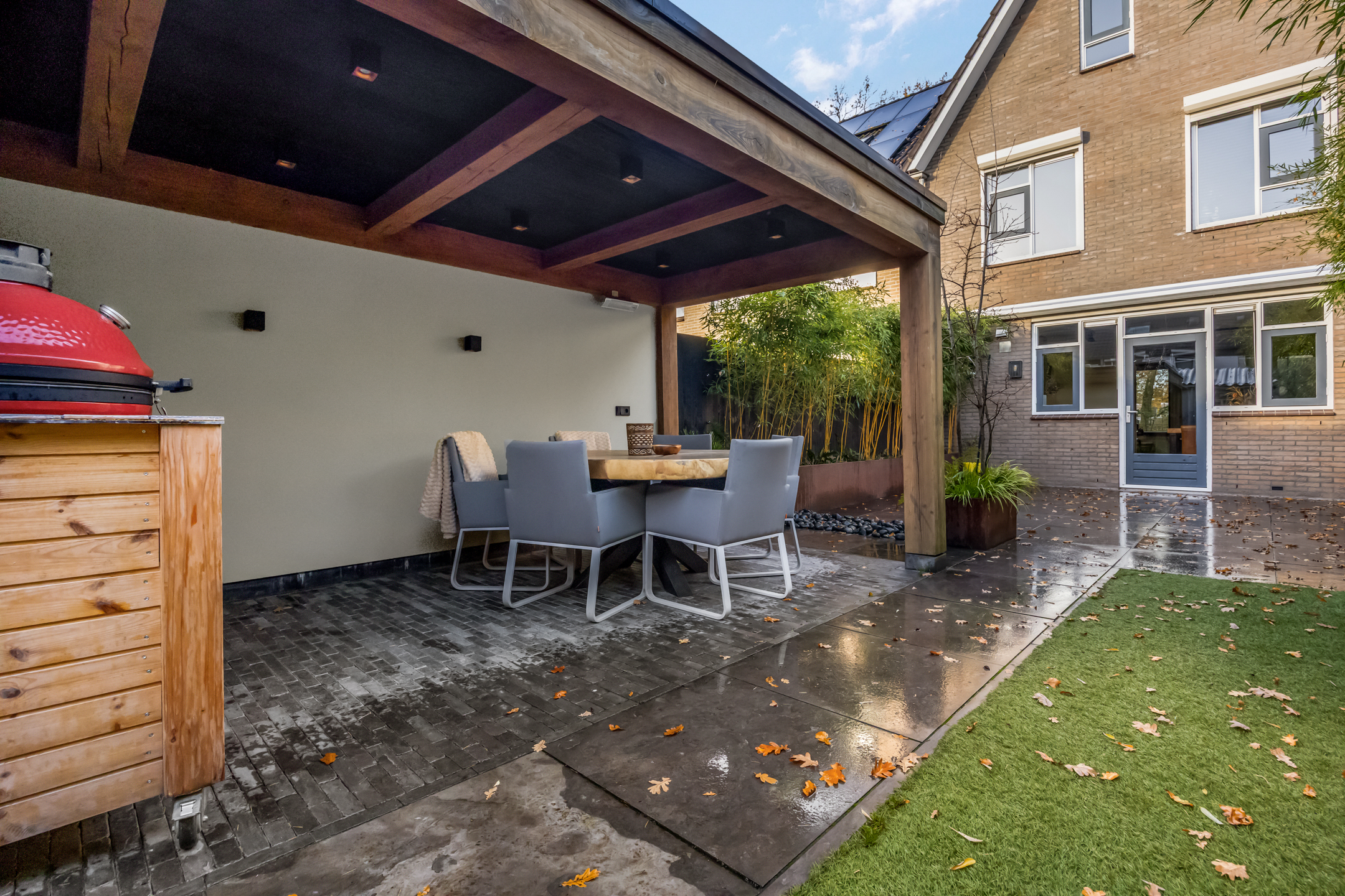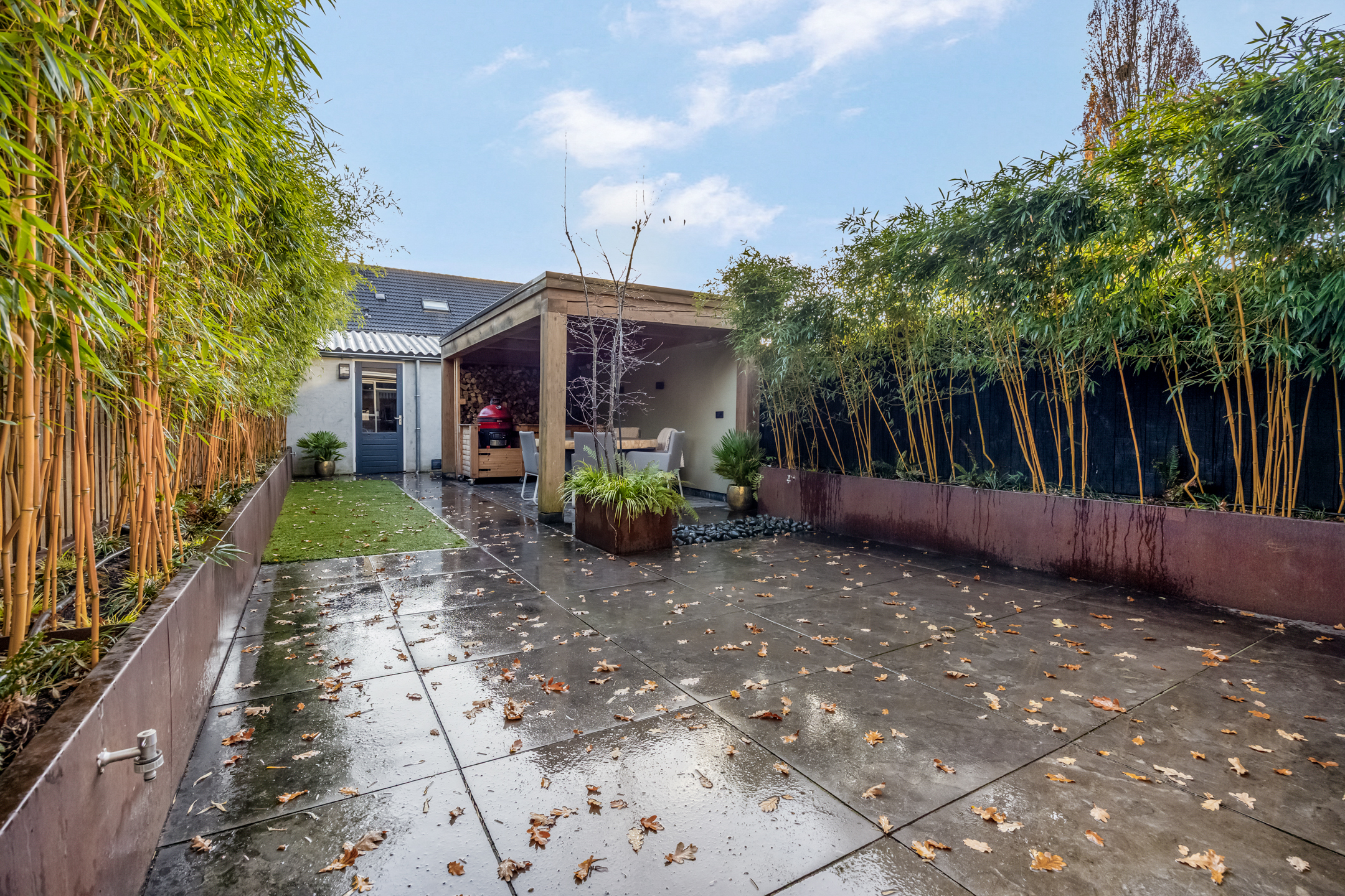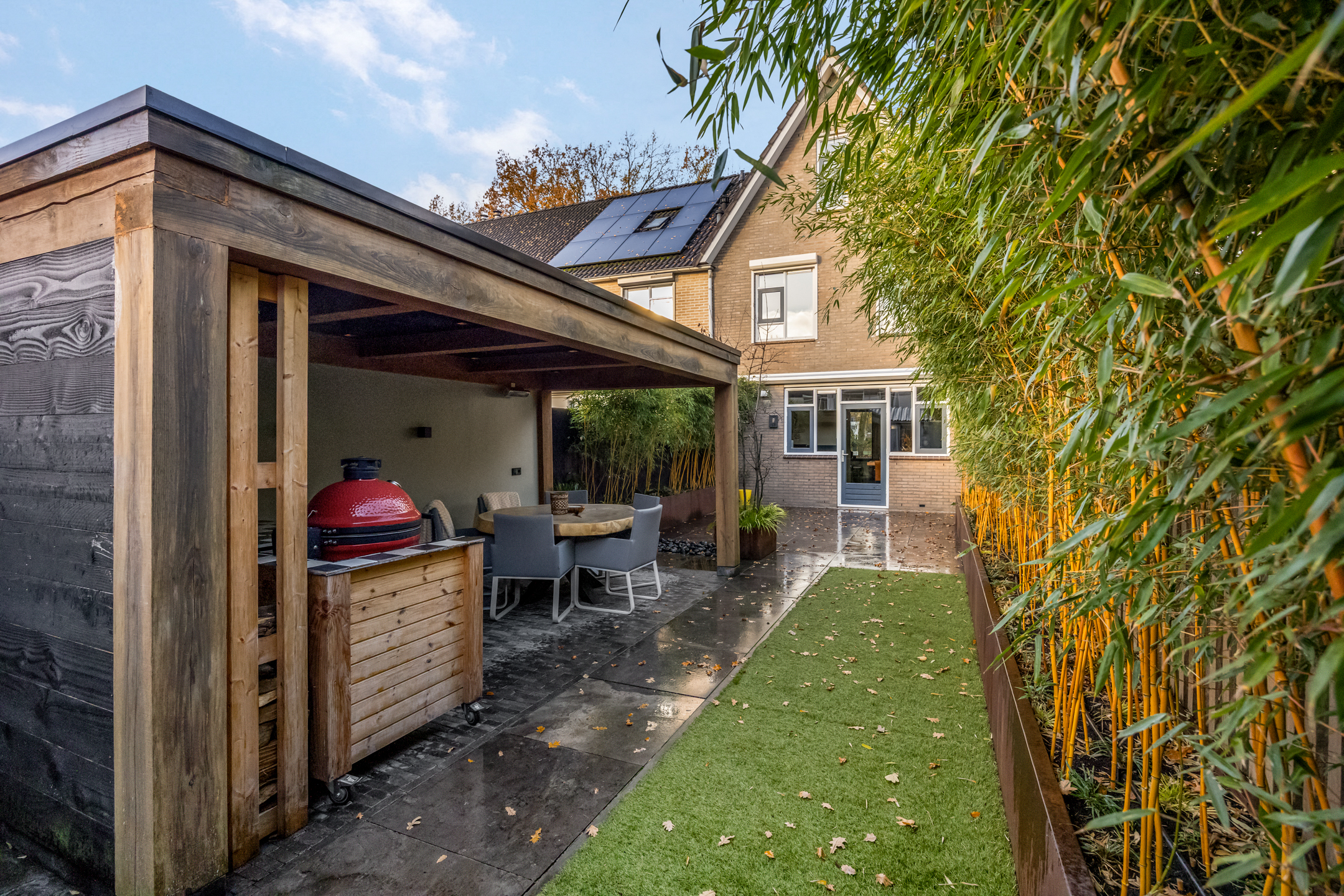 De achtertuin is zowel bereikbaar via de achterom als via de deur in het tussenportaal. De tuin is gelegen op het zuidoosten en biedt een aangename plek om te ontspannen en te genieten van de zon. In de tuin is er voldoende ruimte voor een fijne zithoek wat ideaal is om lekker te ontspannen. Aan de achterzijde van de tuin bevindt zich over de volle breedte een vrijstaande stenen berging, perfect voor het opslaan voor gereedschap, fietsen, of andere opbergspullen. In de achtertuin vind je ook nog een veranda, waar je kan genieten in de warme zomeravonden.