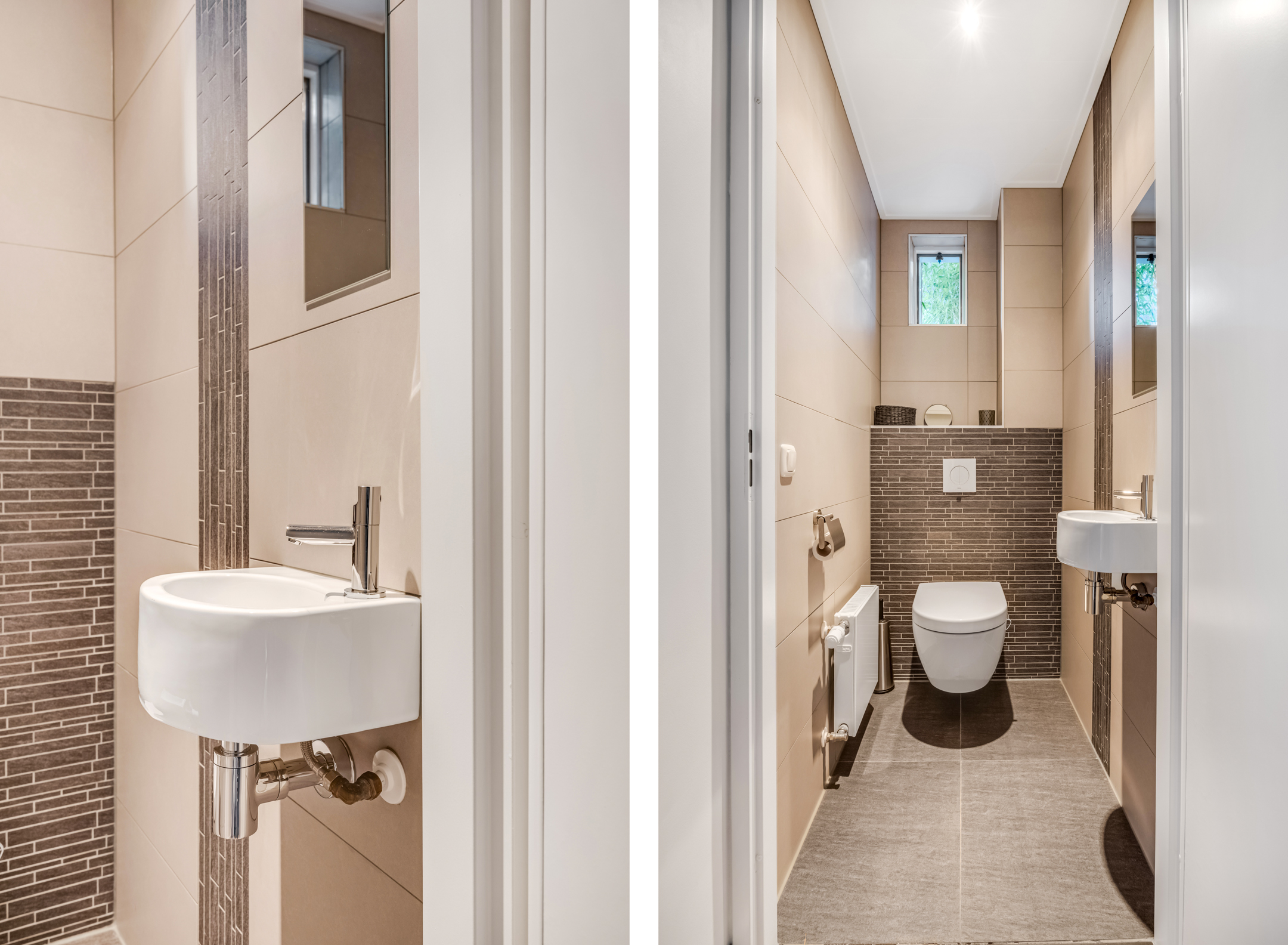 Via de keuken bereik je de tweede hal met de trapopgang naar boven en een modern zwevend toilet met fontein.