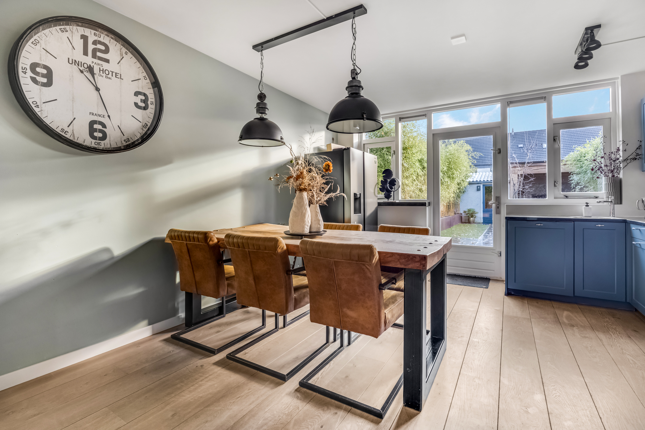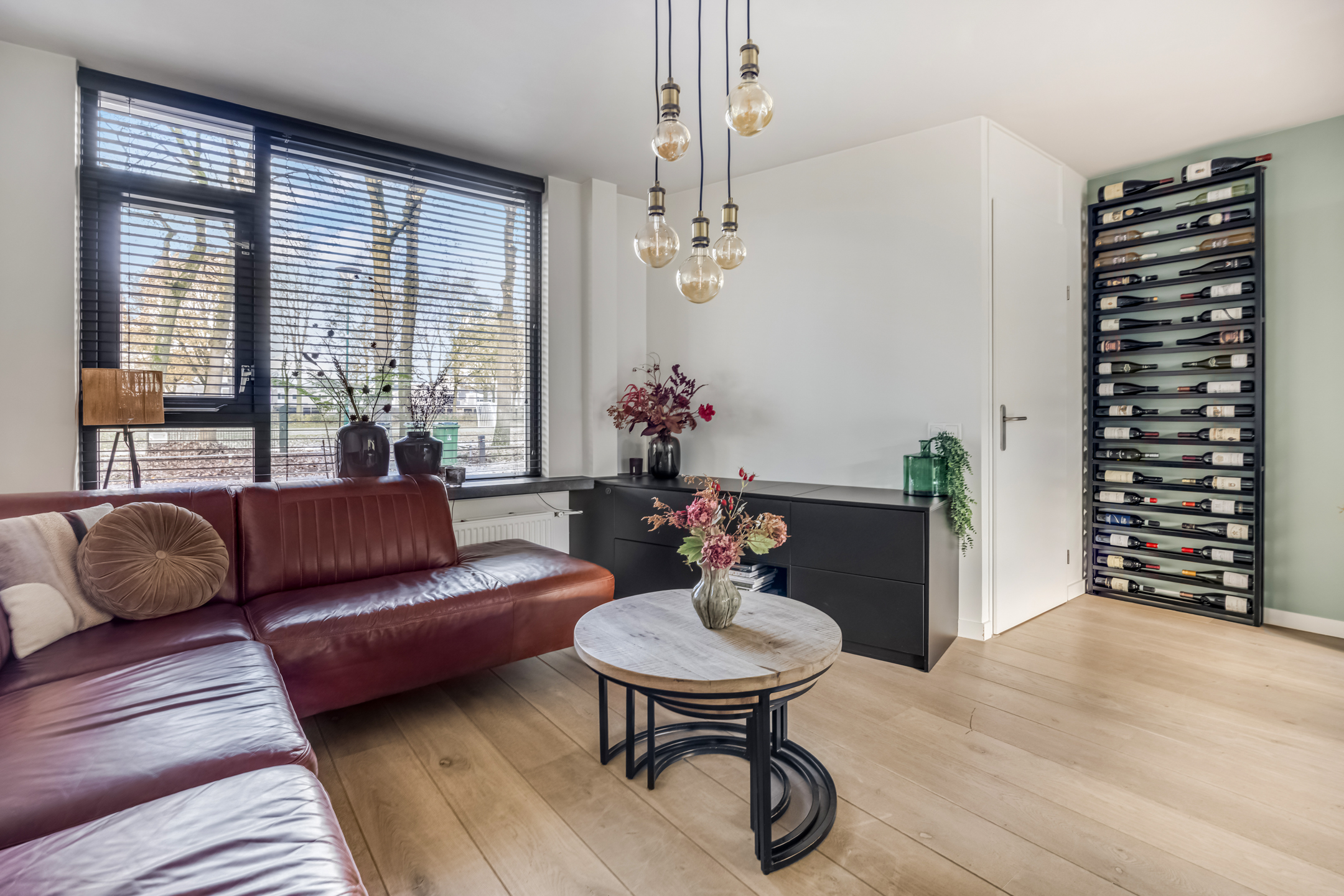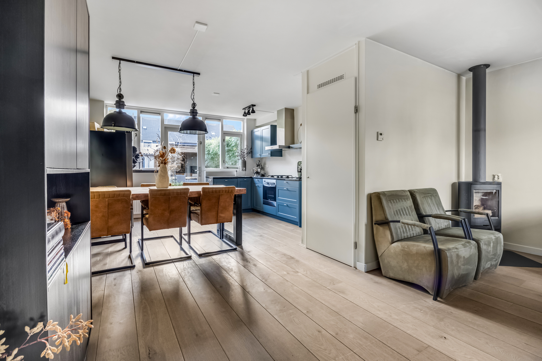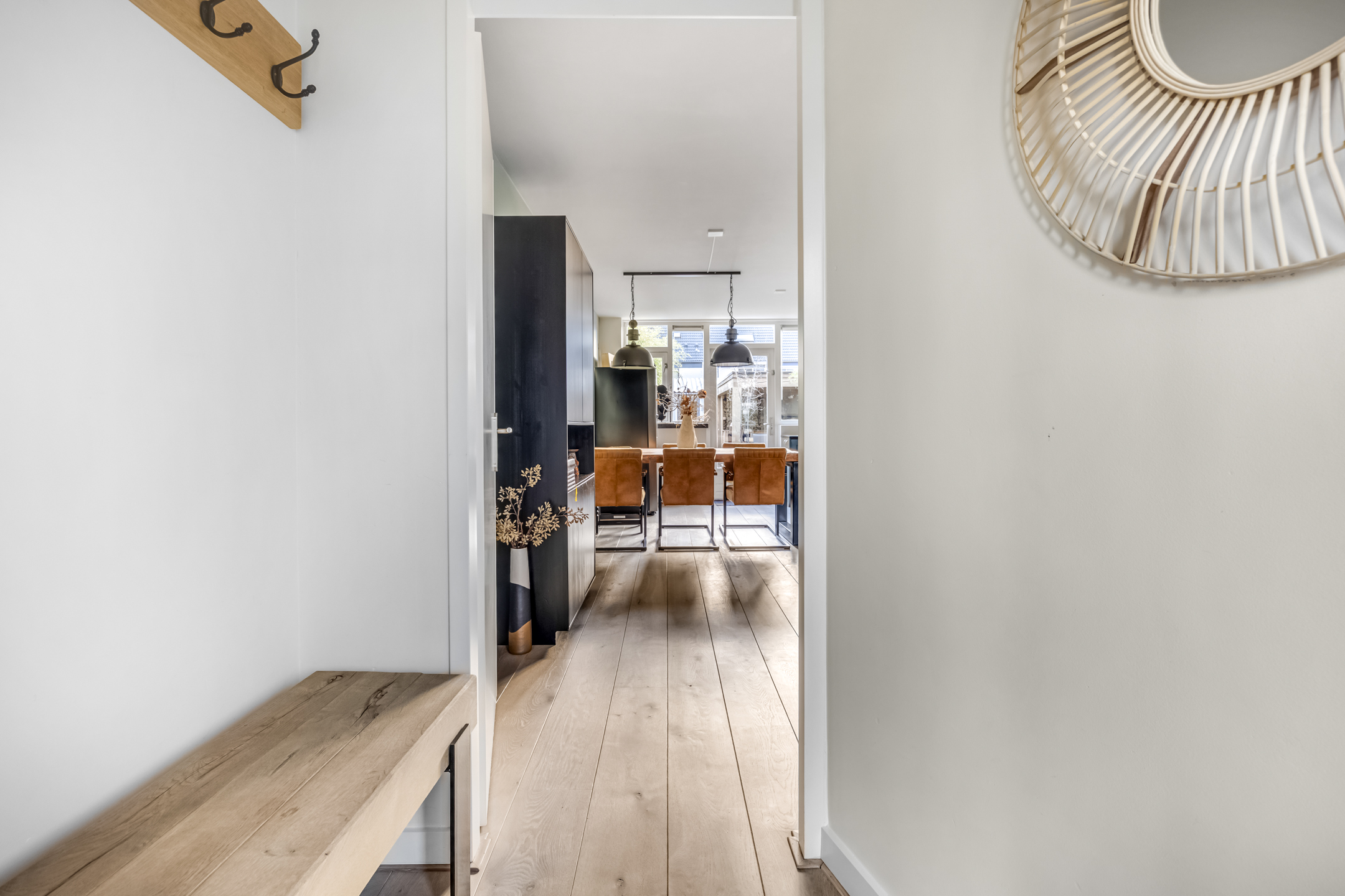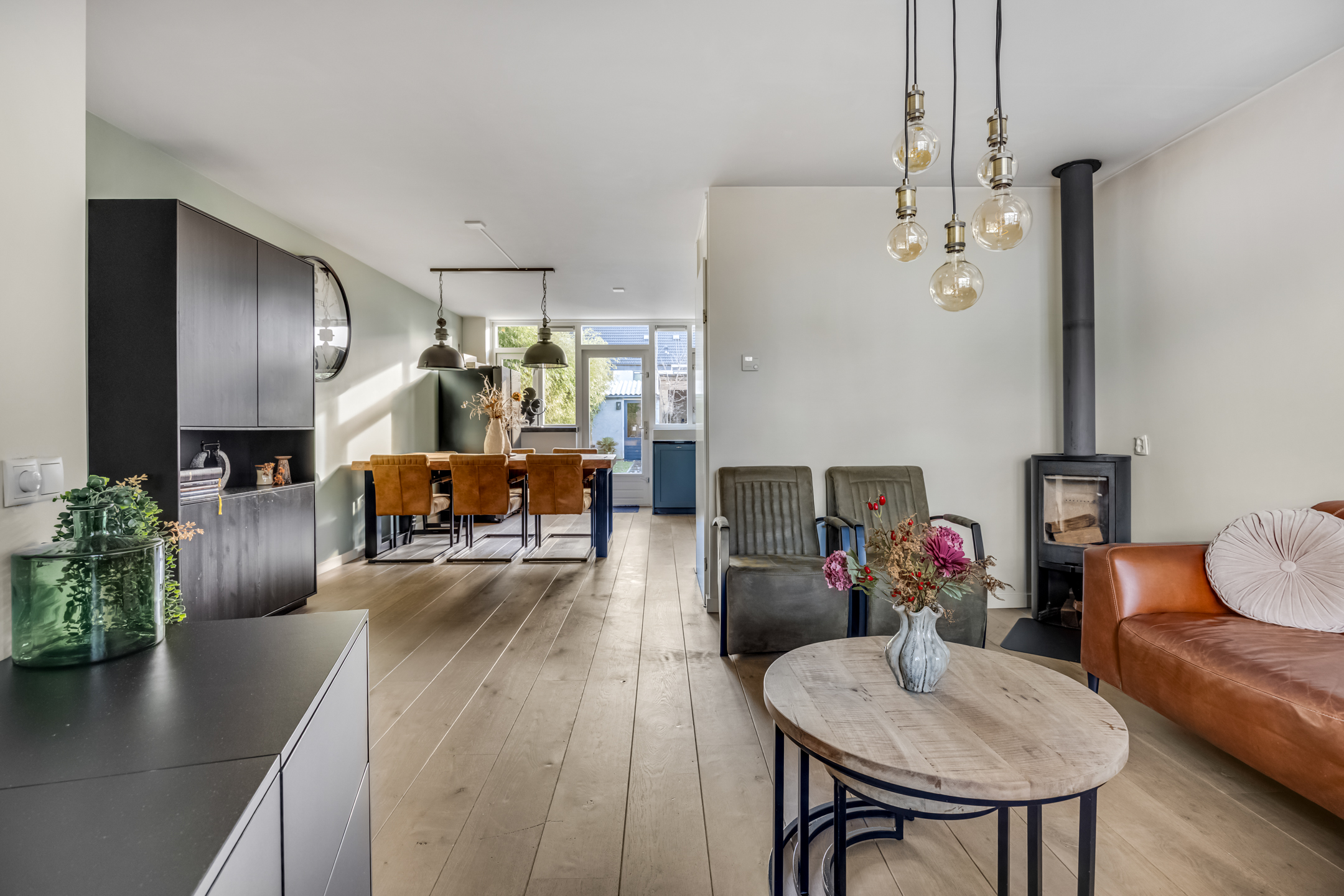 Als je via de voortuin de woning binnenstapt, kom je direct in de hal. In de hal vind je de meterkast, een garderobekast en de toegangsdeur naar de woonkamer. De lichte woonkamer biedt ruimte voor een gezellige zithoek aan de voorzijde en een eethoek aan de achterzijde. Dankzij de grote raampartijen over de gehele breedte van de woning, geniet je zo de hele dag van het natuurlijke licht en uitzicht op het groen aan de voorzijde. De massief houten vloer en nette afwerking zorgen voor een warme, huiselijke sfeer. Onder de trap bevindt zich een praktische trapkast met extra opbergruimte.