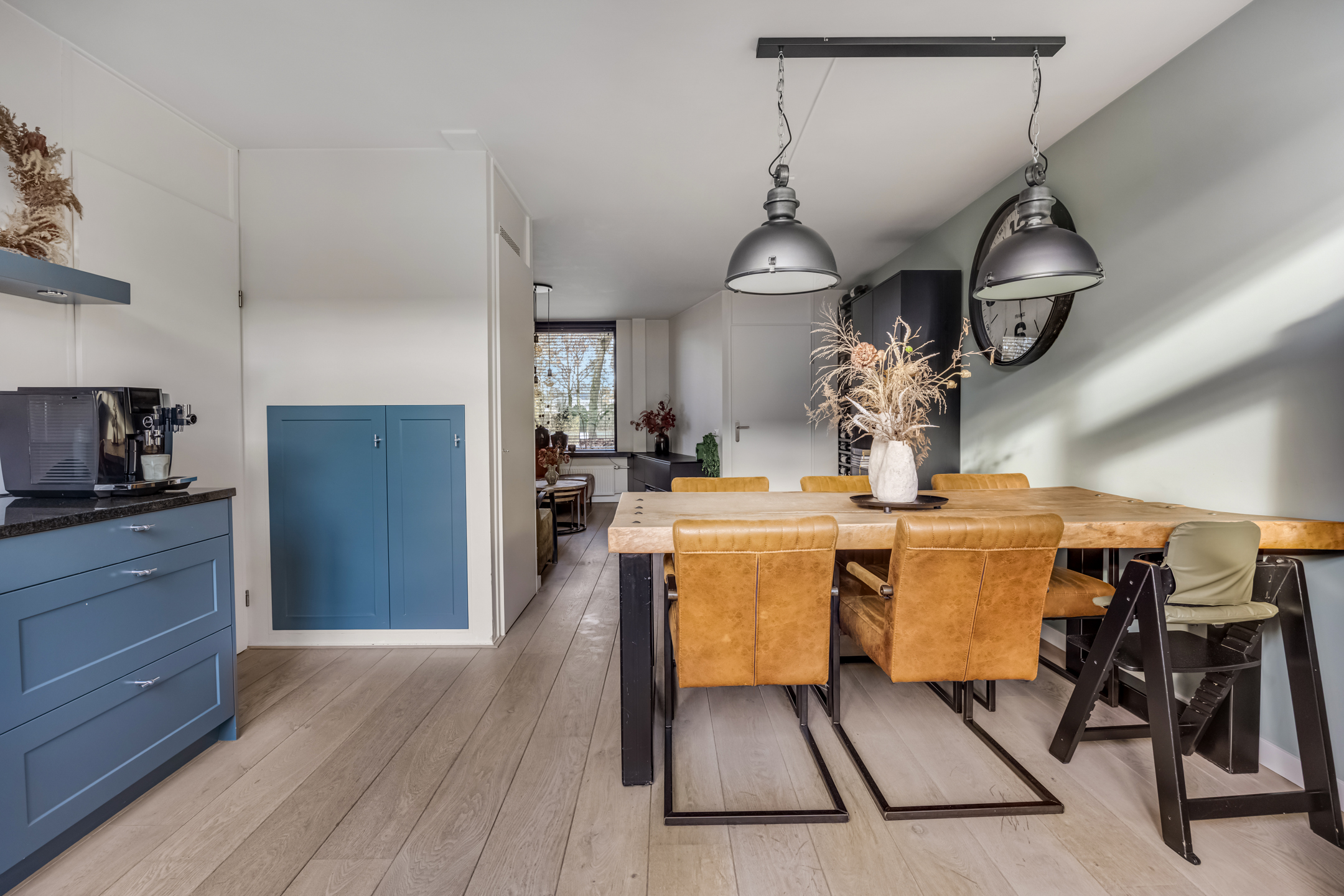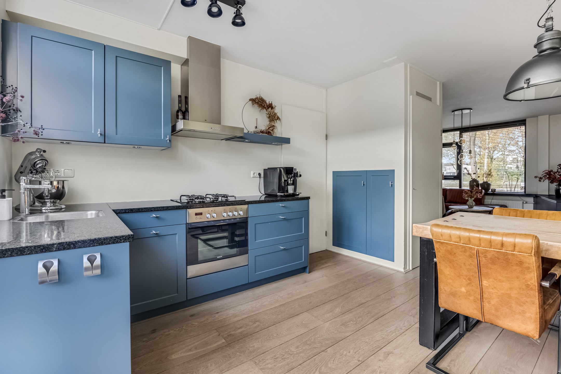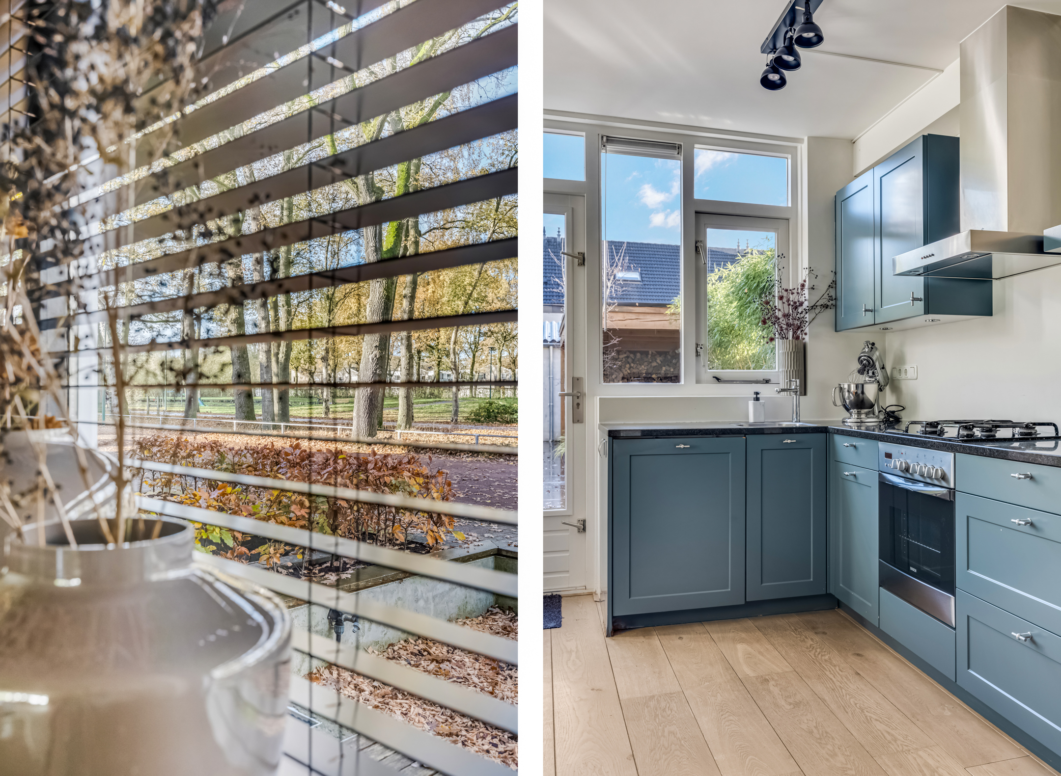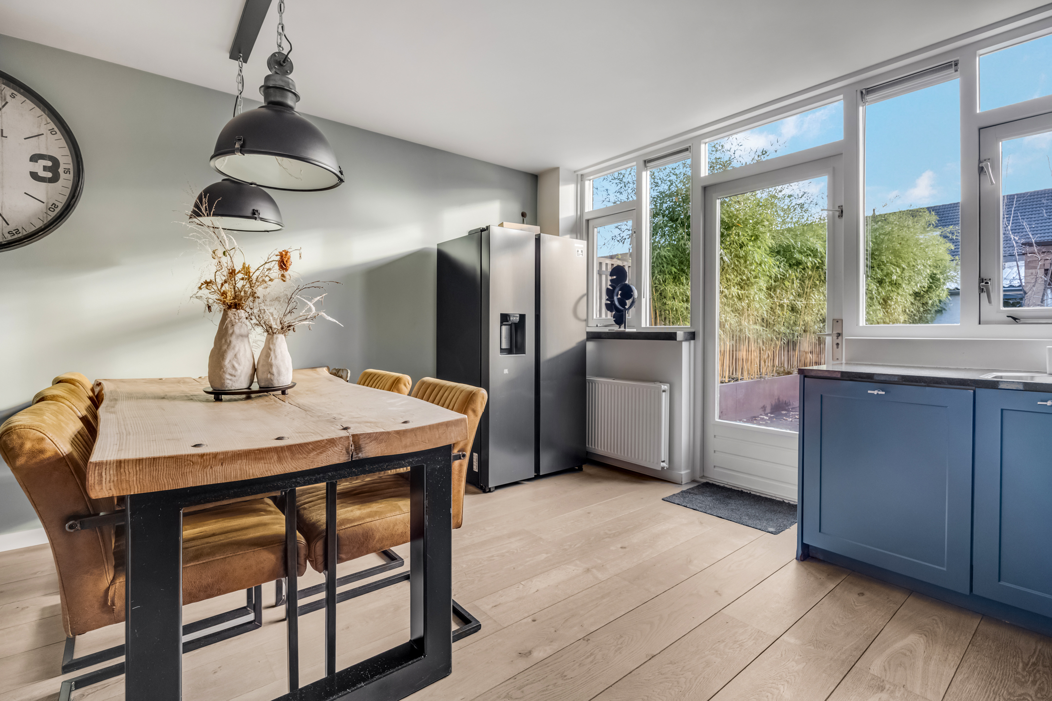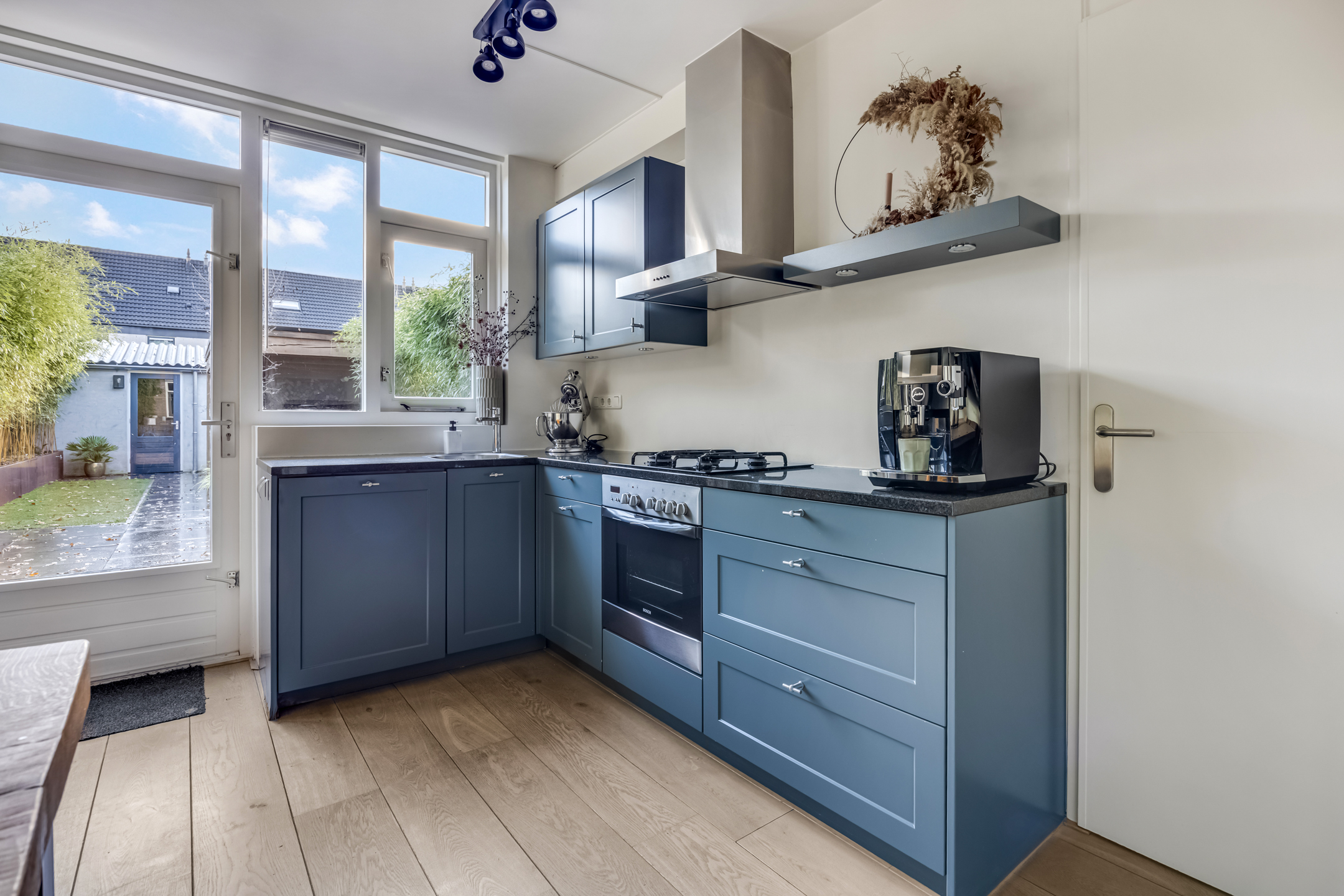 In de keuken, welke aan de achterzijde van de woning is gesitueerd, komen plezier in koken en gebruiksgemak perfect samen. De keuken is in een L-opstelling geplaatst en is afgewerkt in een zwarte kleur. Daarnaast is de keuken van alle benodigde apparatuur voorzien. Zo heb je een oven, een vaatwasser, een 4-pits gaskookplaat met afzuigkap en genoeg kastruimte voor al je keukengerei en voorraad. Kortom, een keuken die uitnodigt tot koken en genieten!