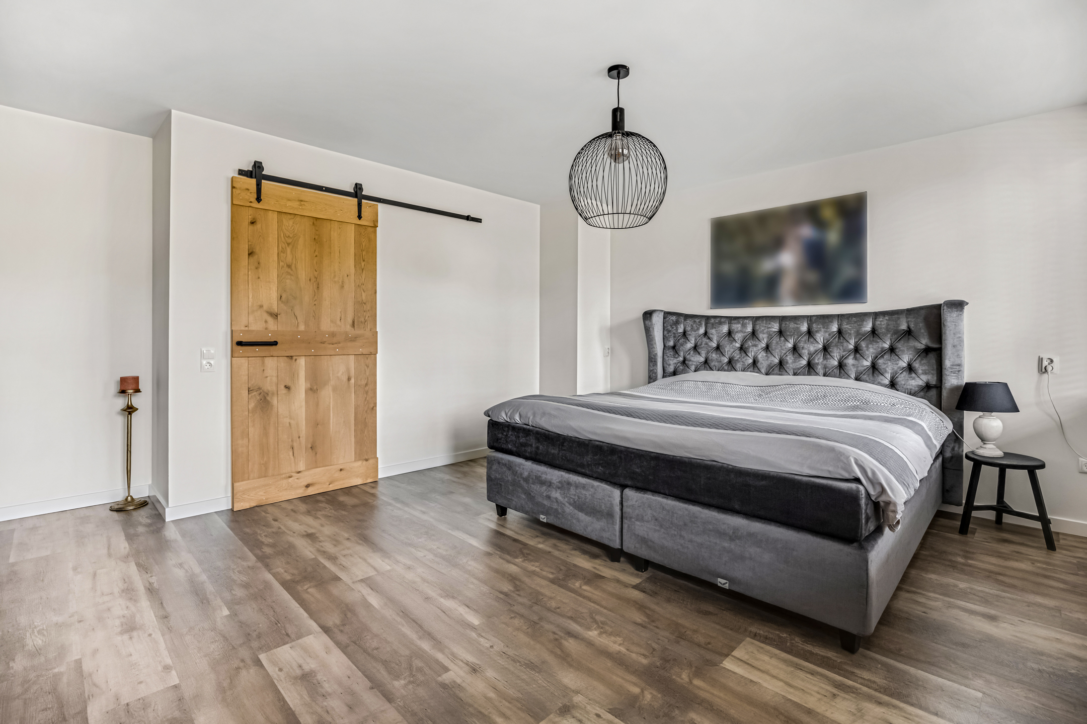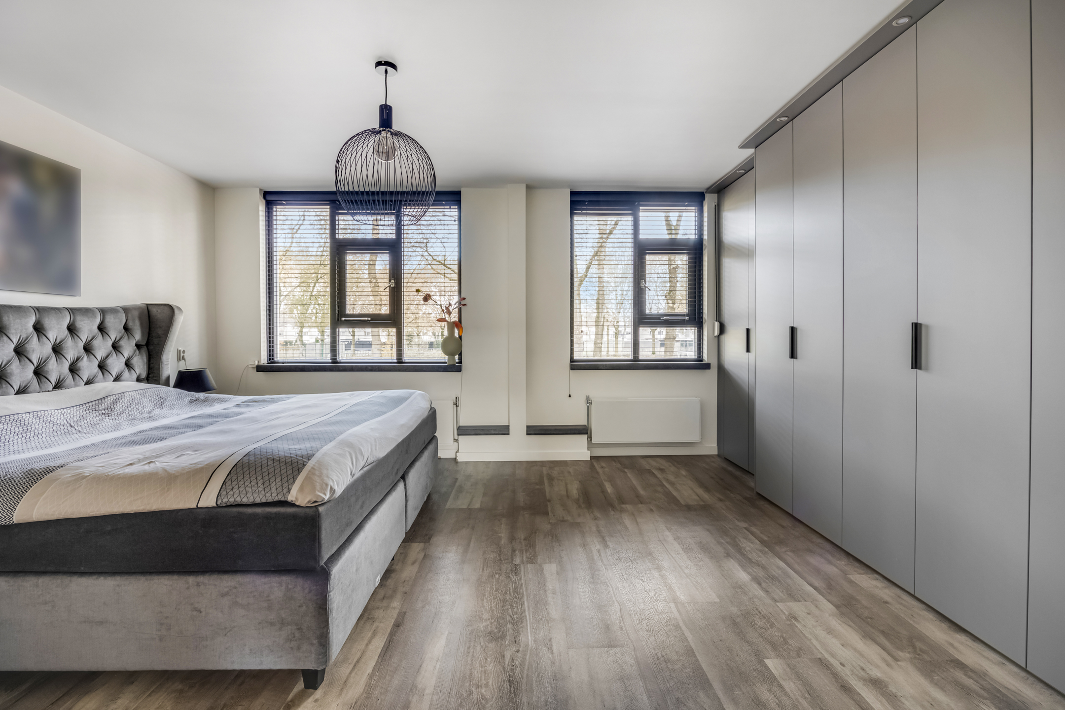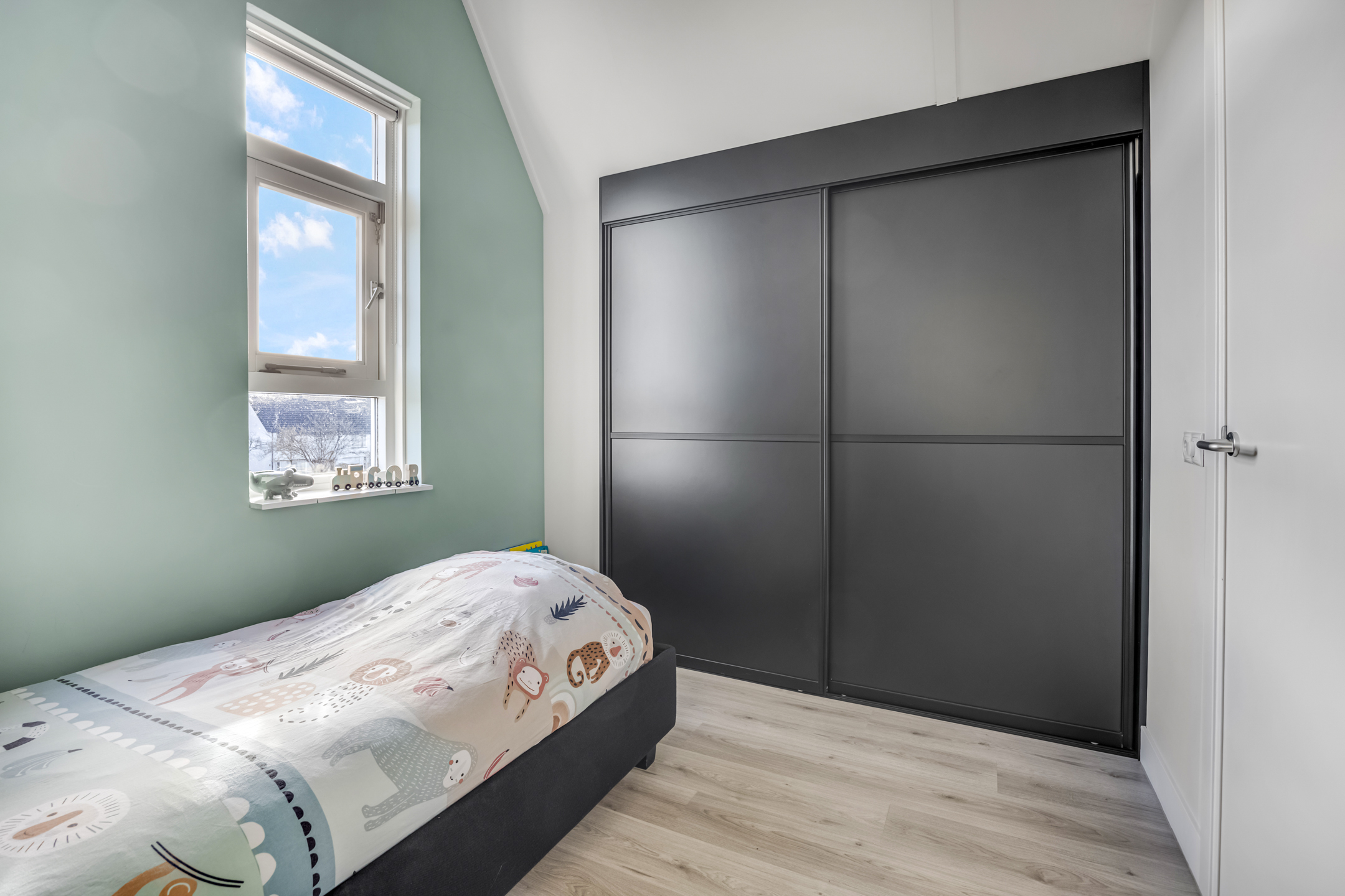 Vanaf de vaste trapopgang op de begane grond, kom je op de overloop van de eerste verdieping. De overloop geeft je toegang tot twee slaapkamers, de badkamer en de vaste trapopgang naar de tweede verdieping. De masterbedroom bevindt zich aan de voorzijde van de woning. Deze kamer is erg ruim en over de gehele breedte van de woning gelegen. In de masterbedroom is er meer dan genoeg ruimte voor een kingsize bed en een grote kledingkast. Aan de achterzijde van de woning vind je nog een slaapkamer welke ook goed te gebruiken is als werk- of studeerkamer.