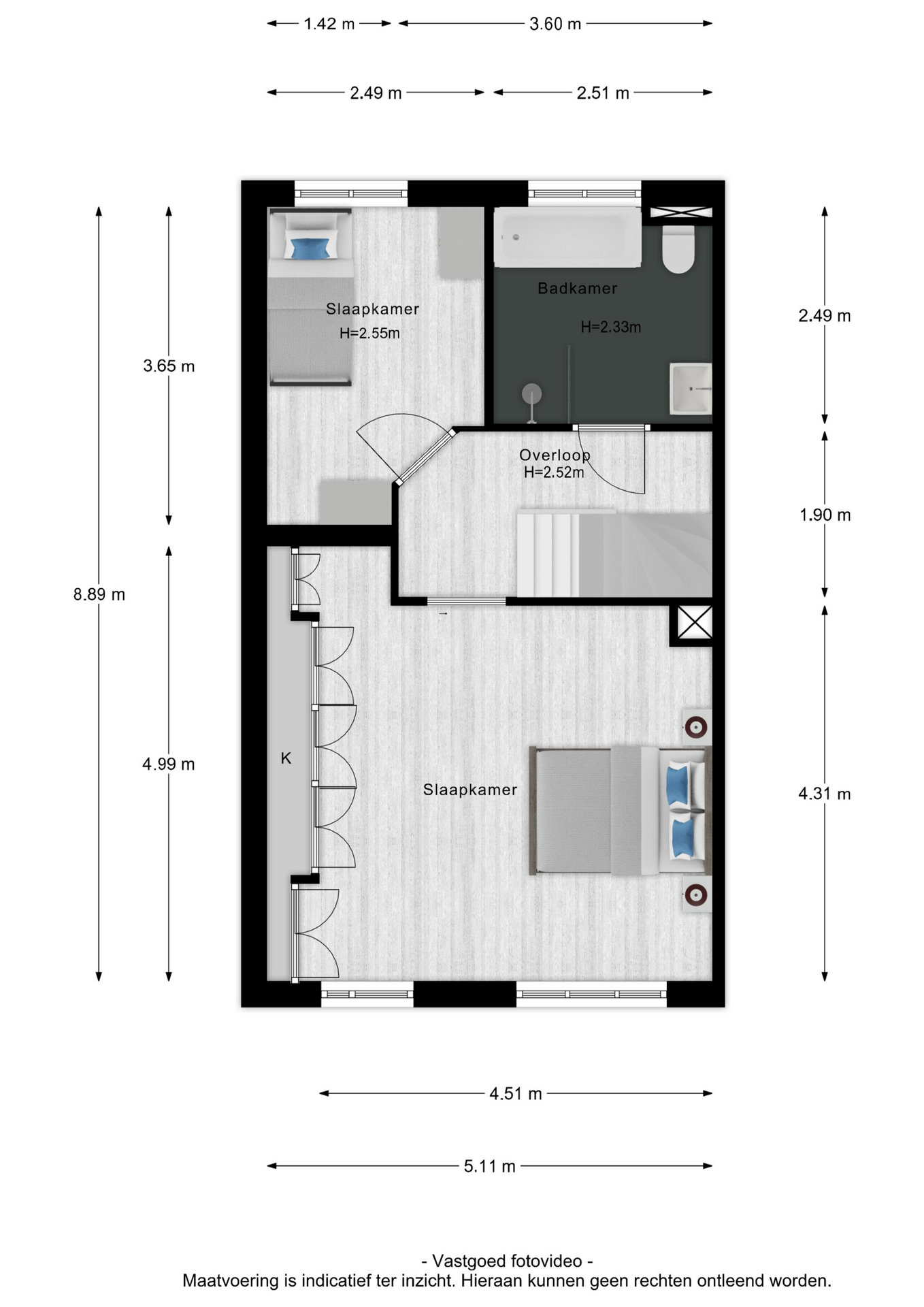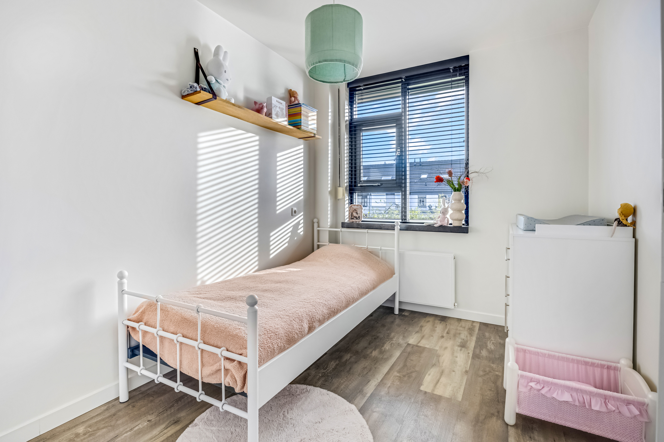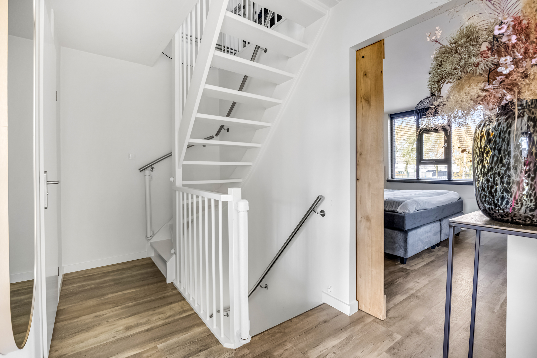 Vanaf de vaste trapopgang op de begane grond, kom je op de overloop van de eerste verdieping. De overloop geeft je toegang tot twee slaapkamers, de badkamer en de vaste trapopgang naar de tweede verdieping. De masterbedroom bevindt zich aan de voorzijde van de woning. Deze kamer is erg ruim en over de gehele breedte van de woning gelegen. In de masterbedroom is er meer dan genoeg ruimte voor een kingsize bed en een grote kledingkast. Aan de achterzijde van de woning vind je nog een slaapkamer welke ook goed te gebruiken is als werk- of studeerkamer.
