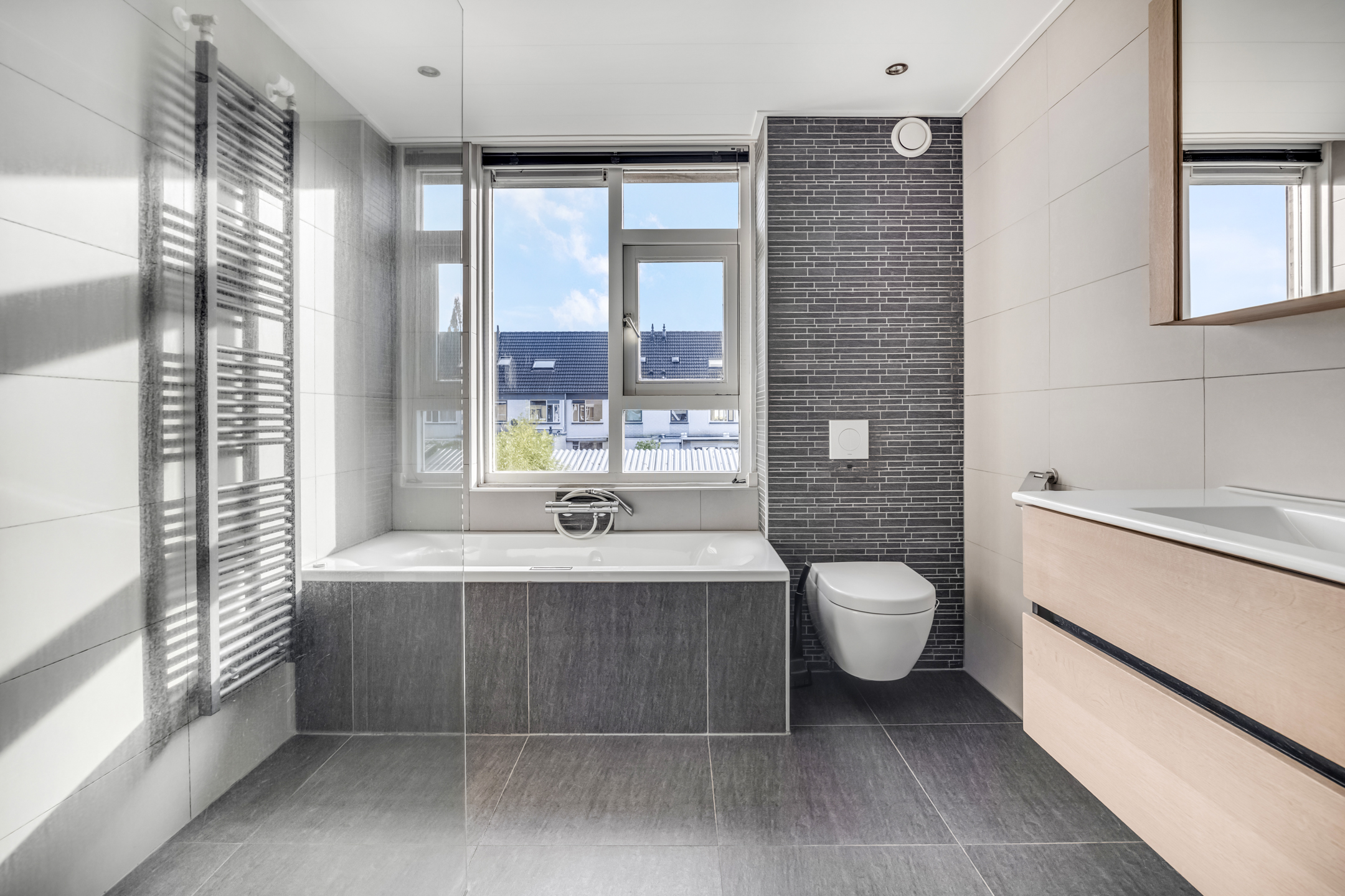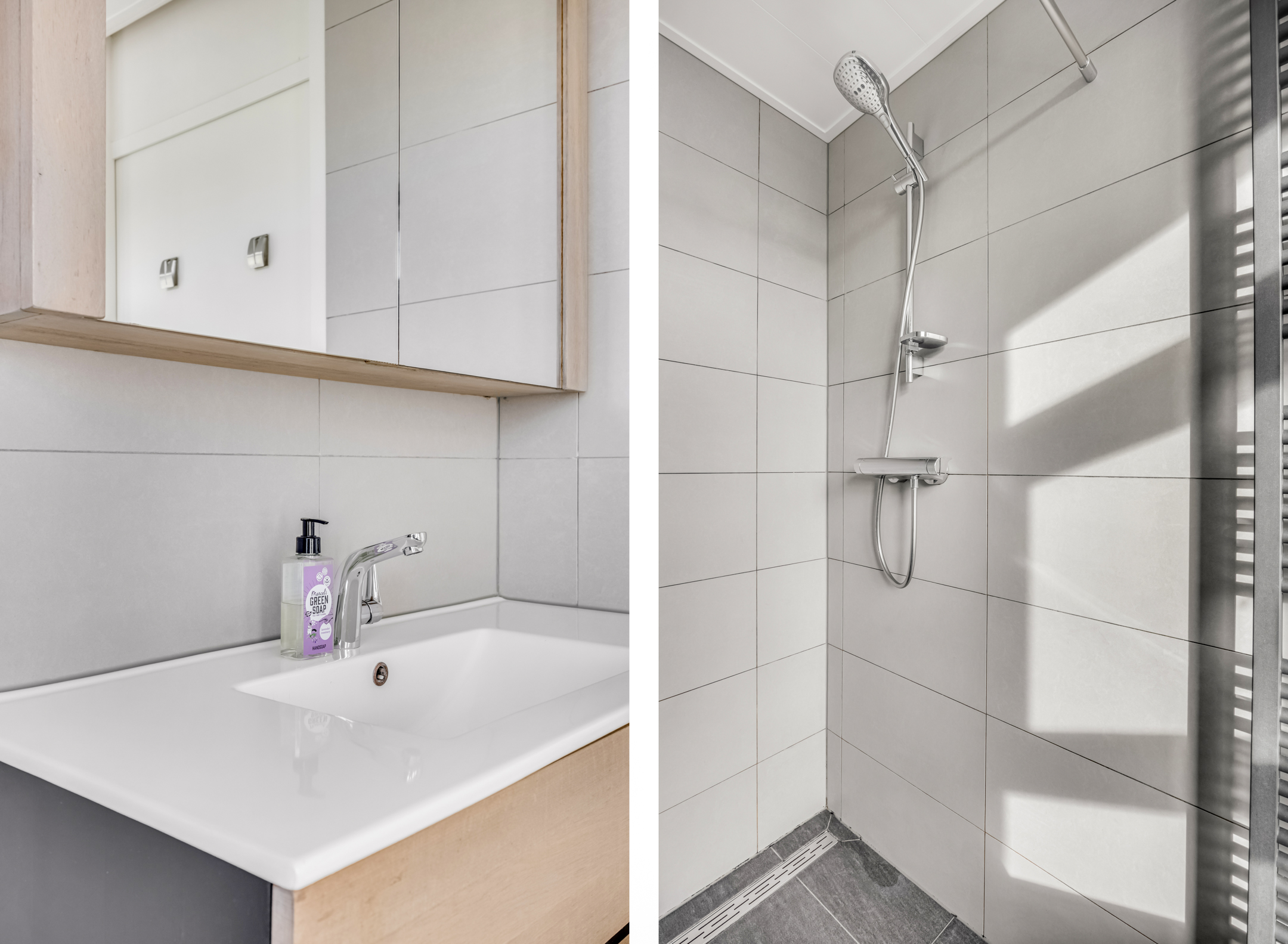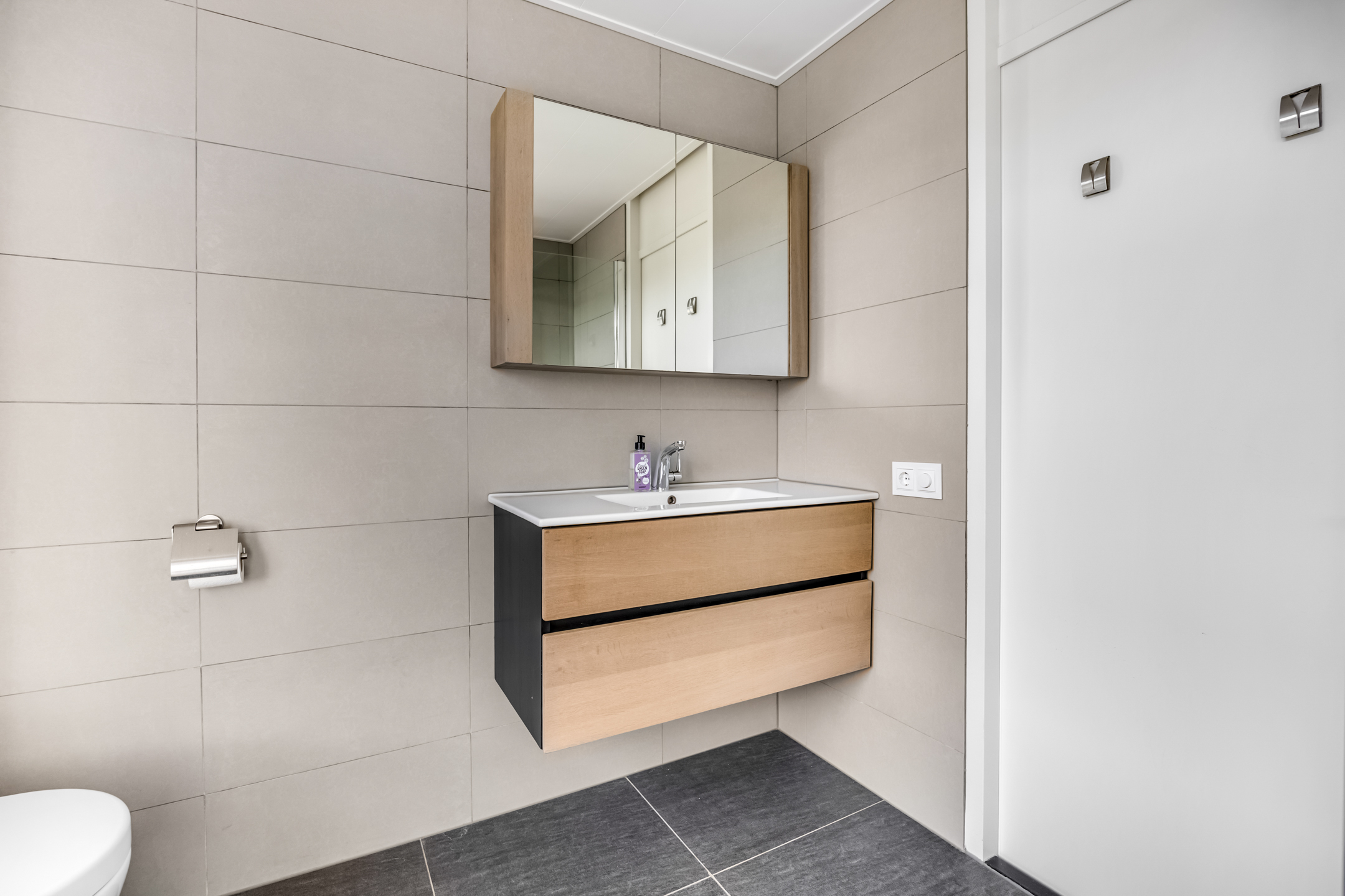 De moderne betegelde badkamer is voorzien van een ruime inloopdouche, een dubbel wastafelmeubel, een designradiator en een tweede toilet. Met een krachtige regendouche kan je hier heerlijk een ontspannen douche nemen na een lange en drukke (werk)dag.