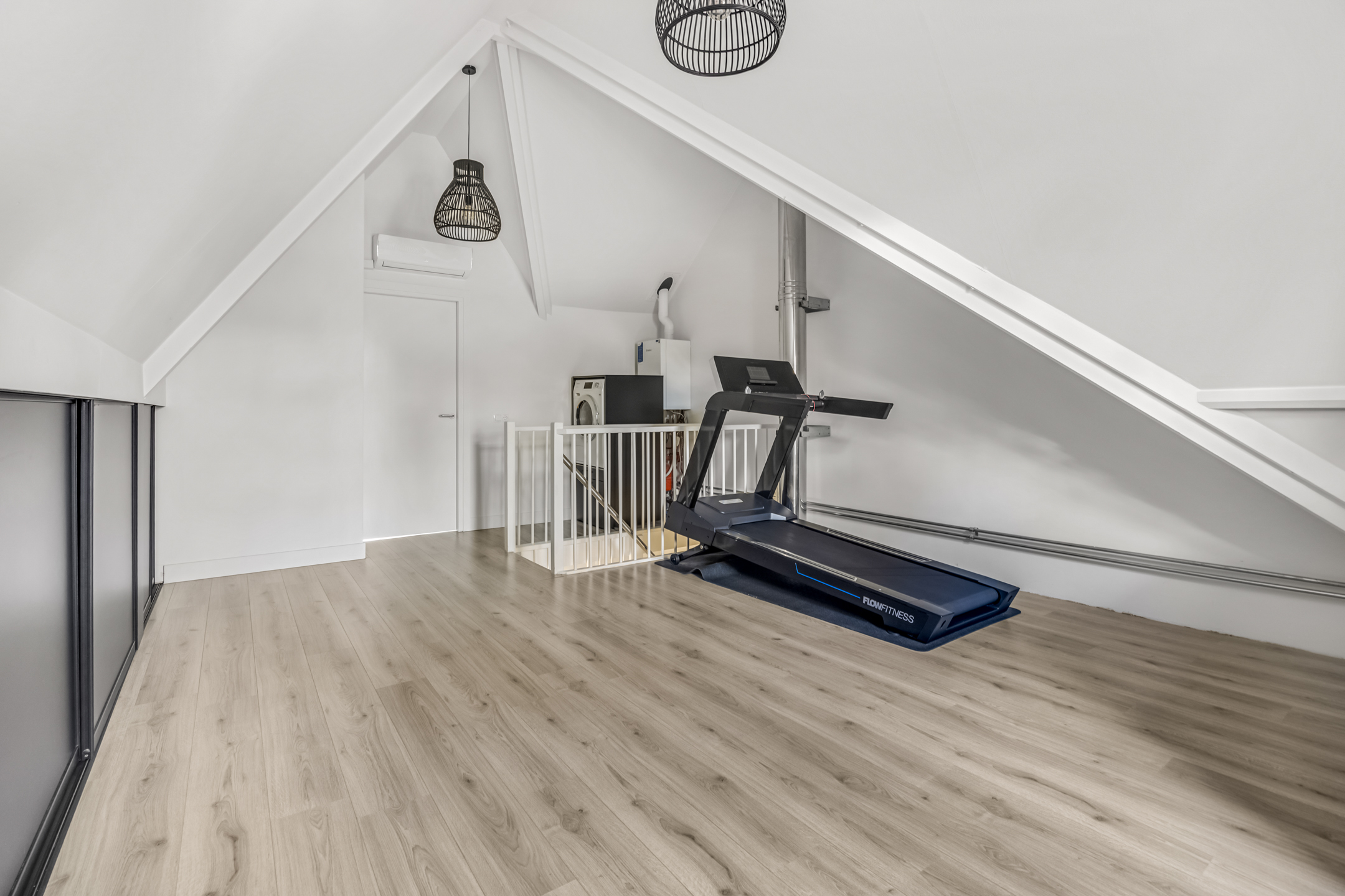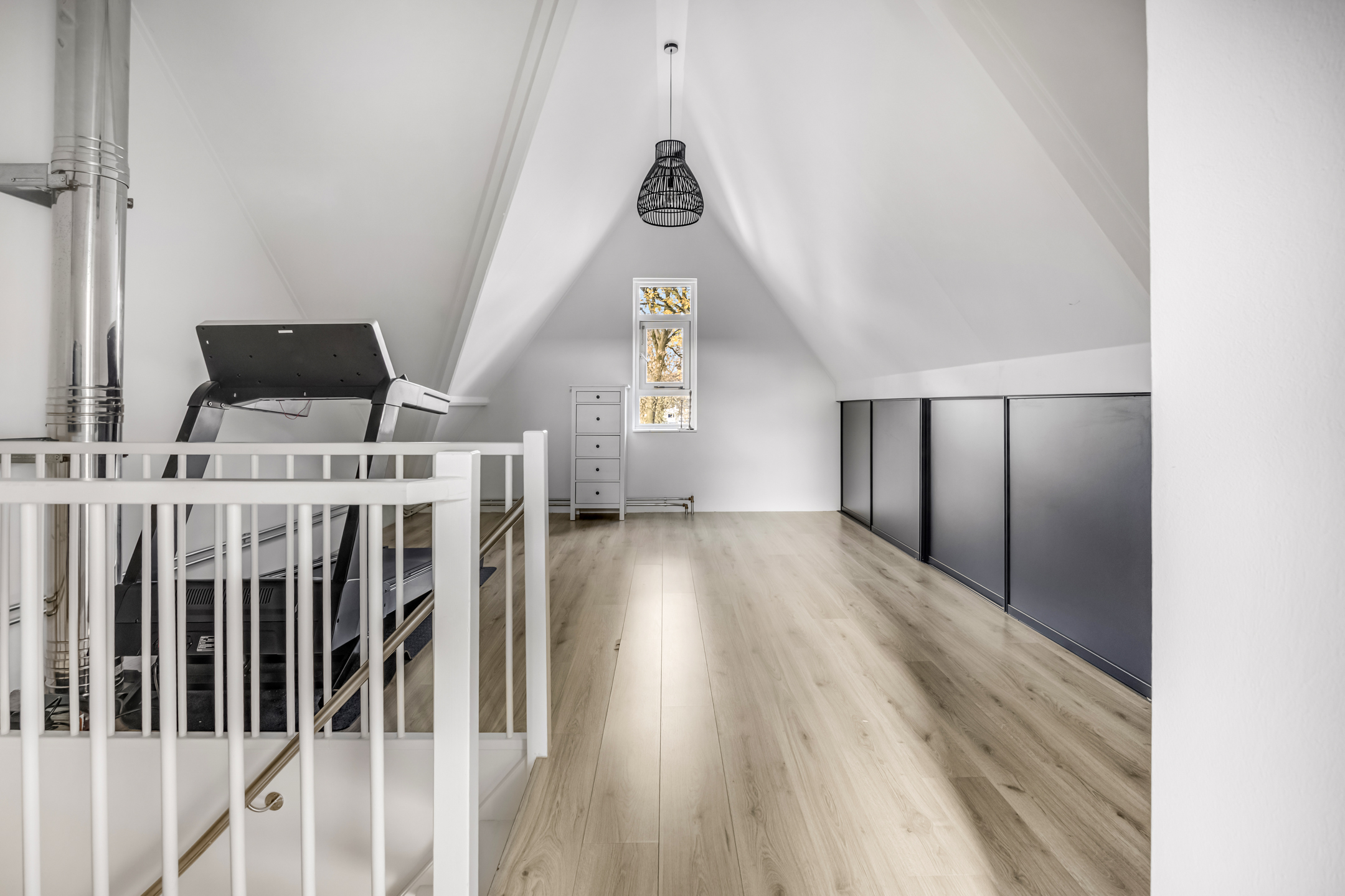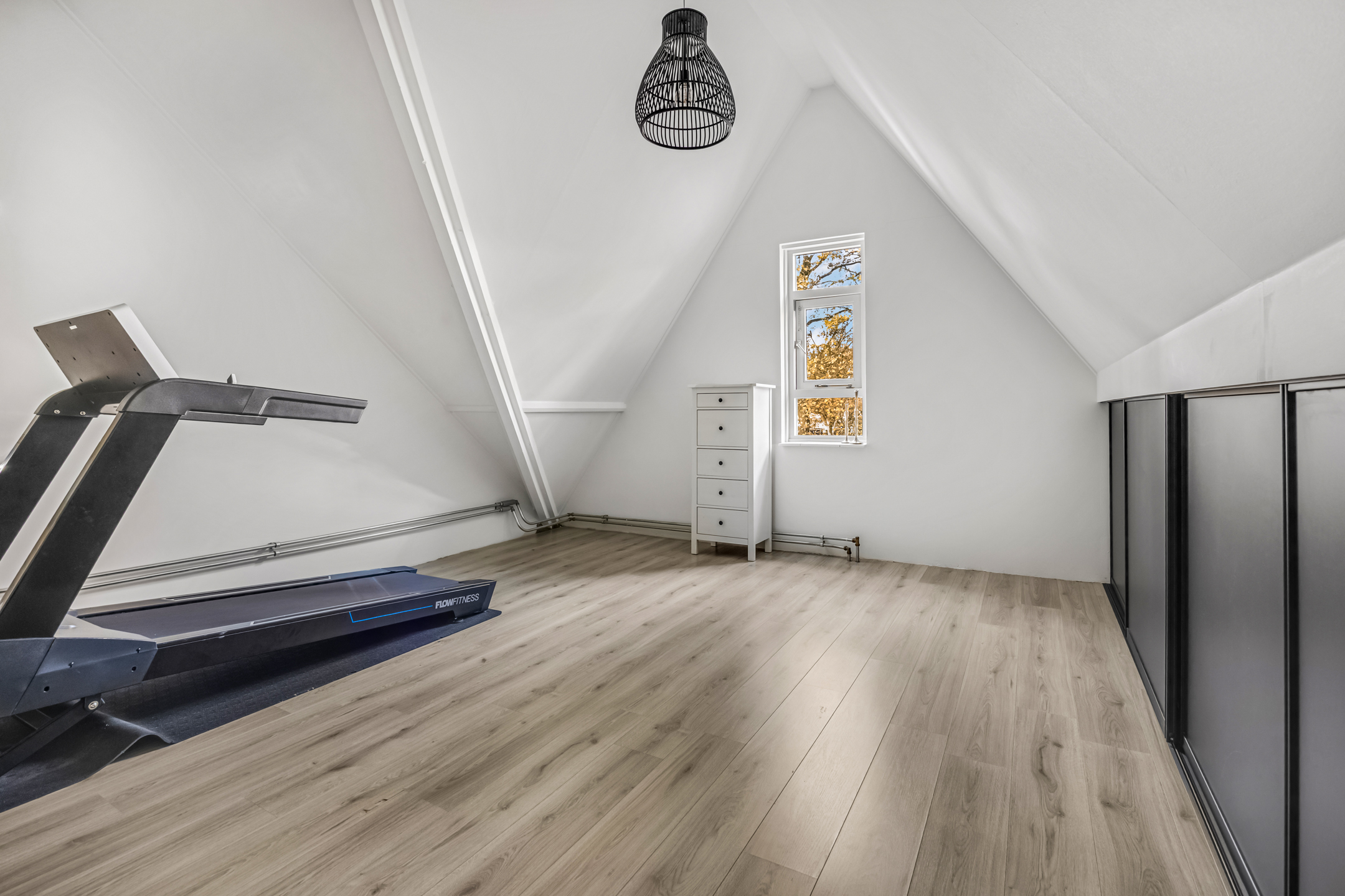 Vanaf de overloop op de eerste verdieping hebben we via de vaste trapopgang toegang tot de tweede verdieping. Op deze verdieping vind je een grote open ruimte met knieschotten en de aansluitingen van de wasapparatuur en de cv-ketelg, hier zou je met gemak nog een slaapkamer van kunnen maken. Ook vind je op deze verdieping nog een extra kamer. Deze kamer is erg ruim en voorzien van knieschotten en twee ingebouwde kasten. Ook is hier extra opbergruimte voor bijvoorbeeld huishoudelijke en seizoensgebonden spullen.