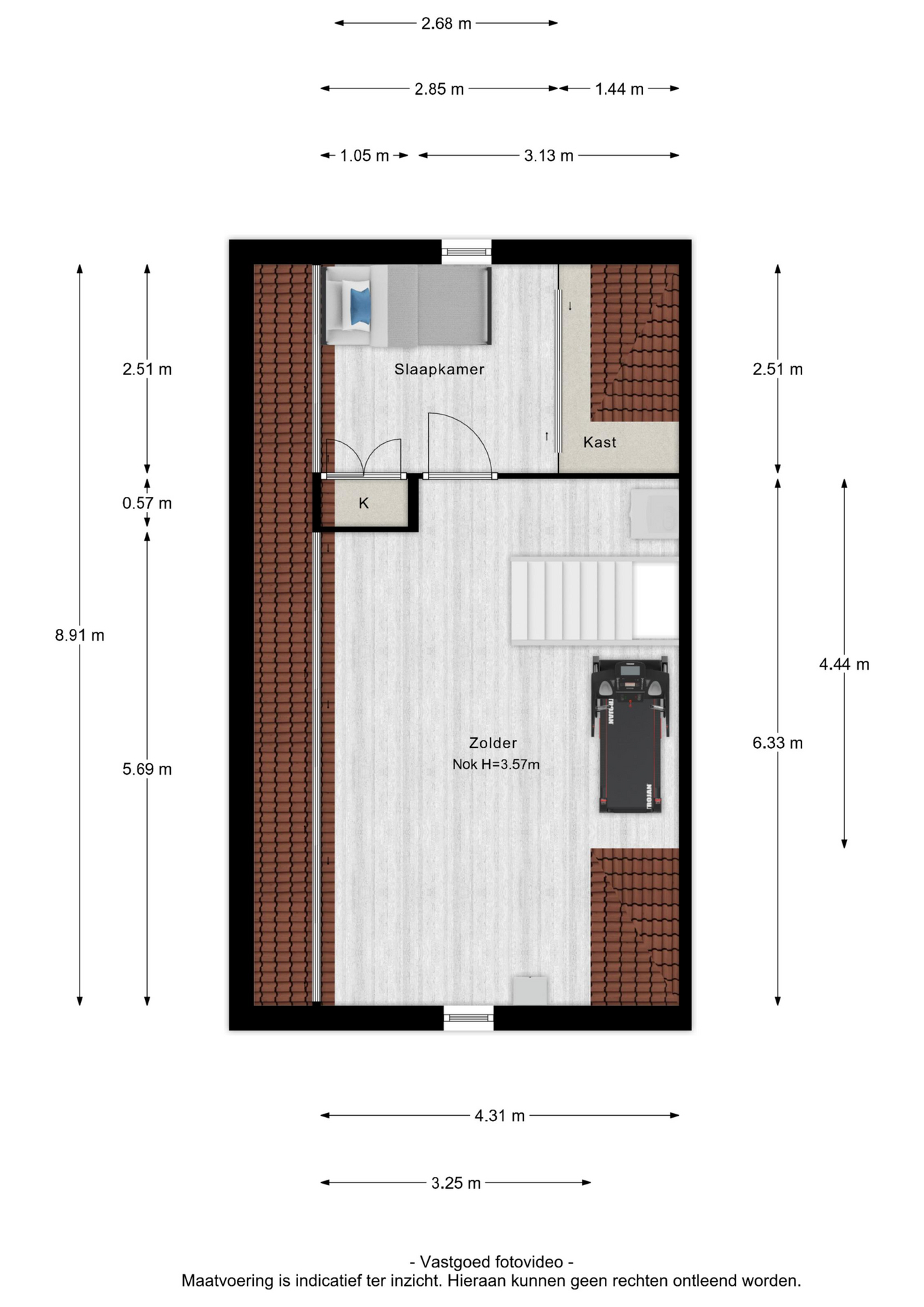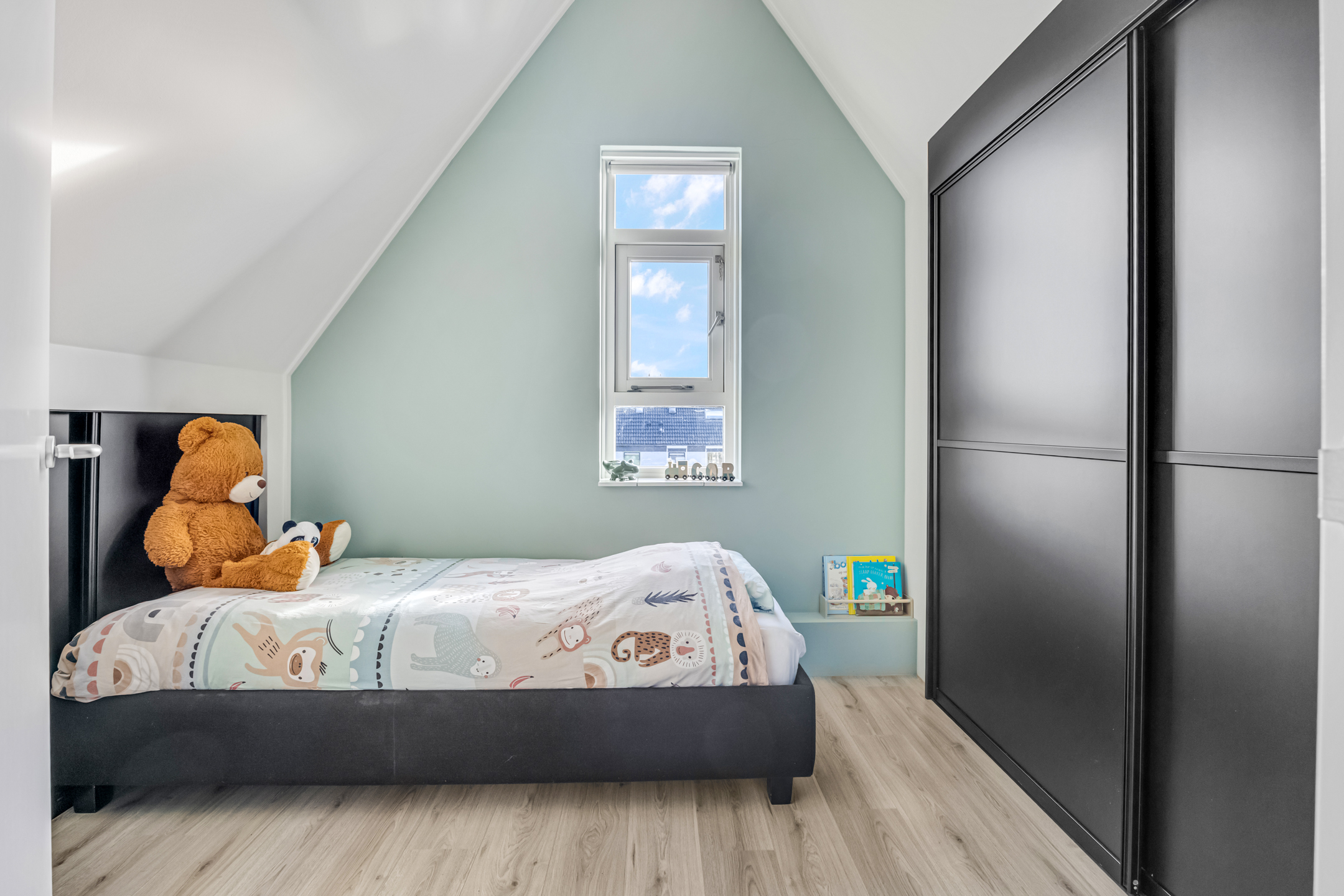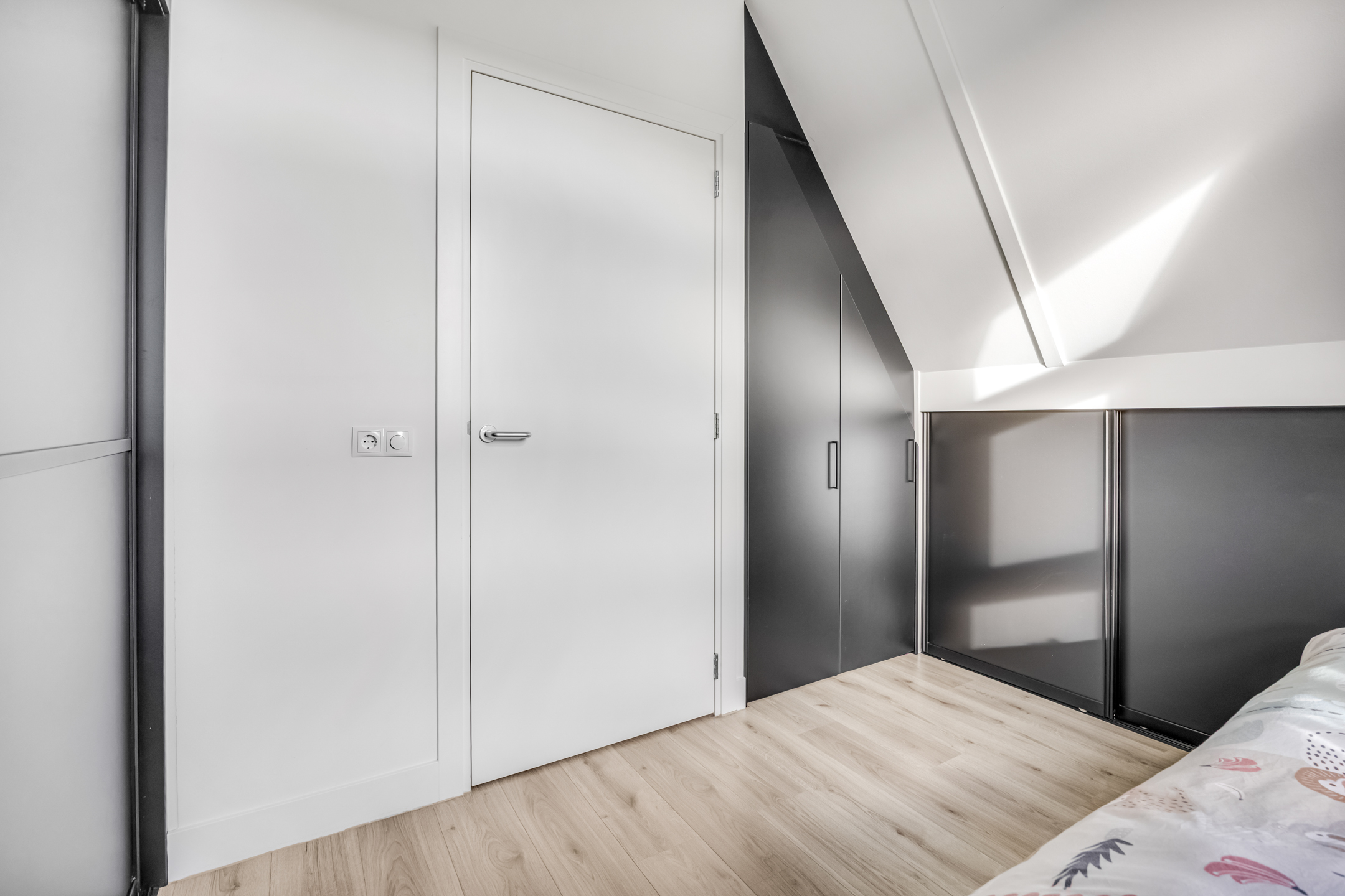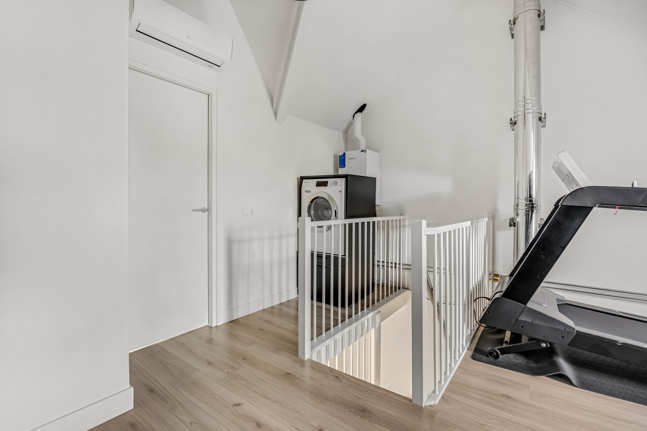 Vanaf de overloop op de eerste verdieping hebben we via de vaste trapopgang toegang tot de tweede verdieping. Op deze verdieping vind je een grote open ruimte met knieschotten en de aansluitingen van de wasapparatuur en de cv-ketelg, hier zou je met gemak nog een slaapkamer van kunnen maken. Ook vind je op deze verdieping nog een extra kamer. Deze kamer is erg ruim en voorzien van knieschotten en twee ingebouwde kasten. Ook is hier extra opbergruimte voor bijvoorbeeld huishoudelijke en seizoensgebonden spullen.