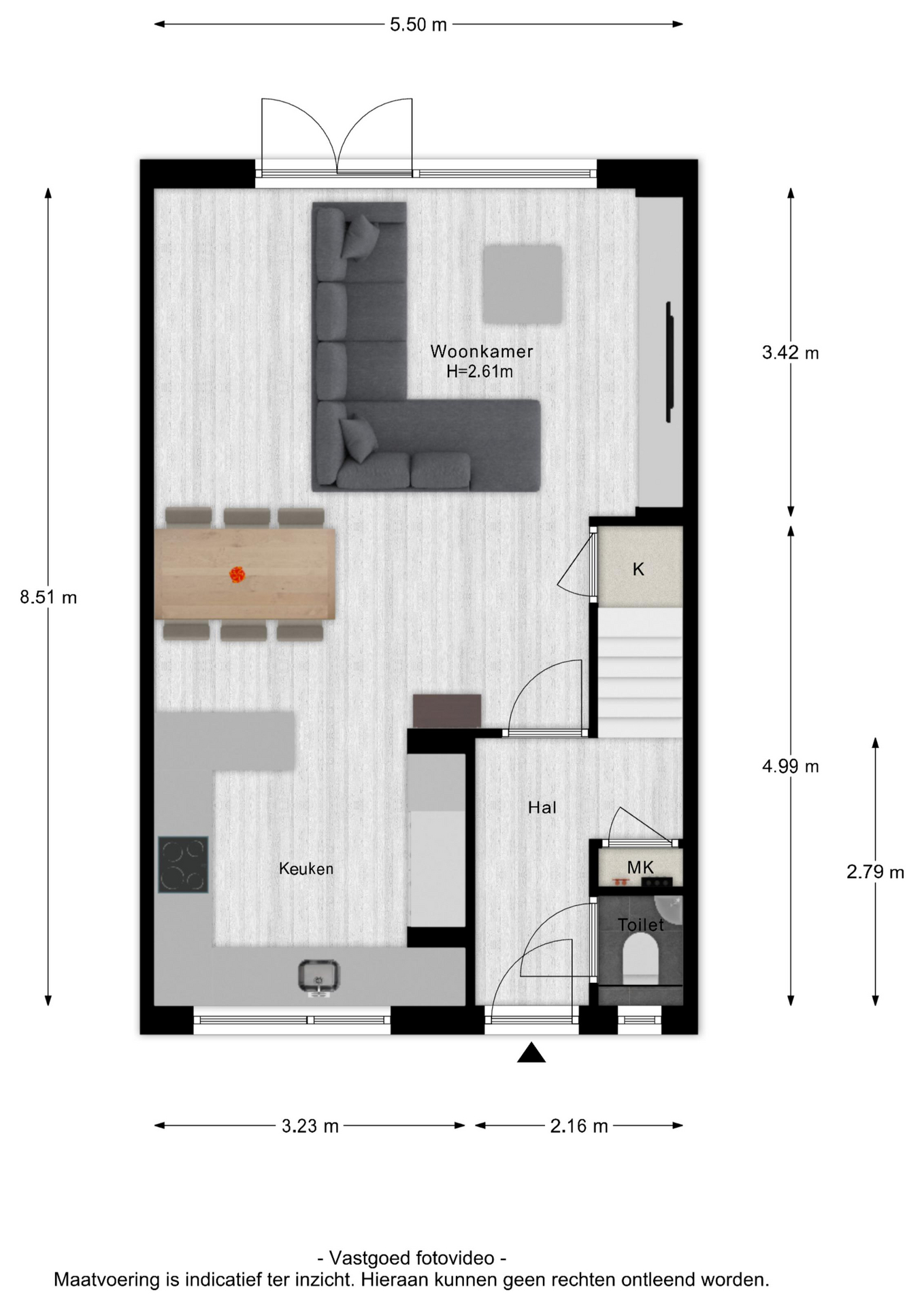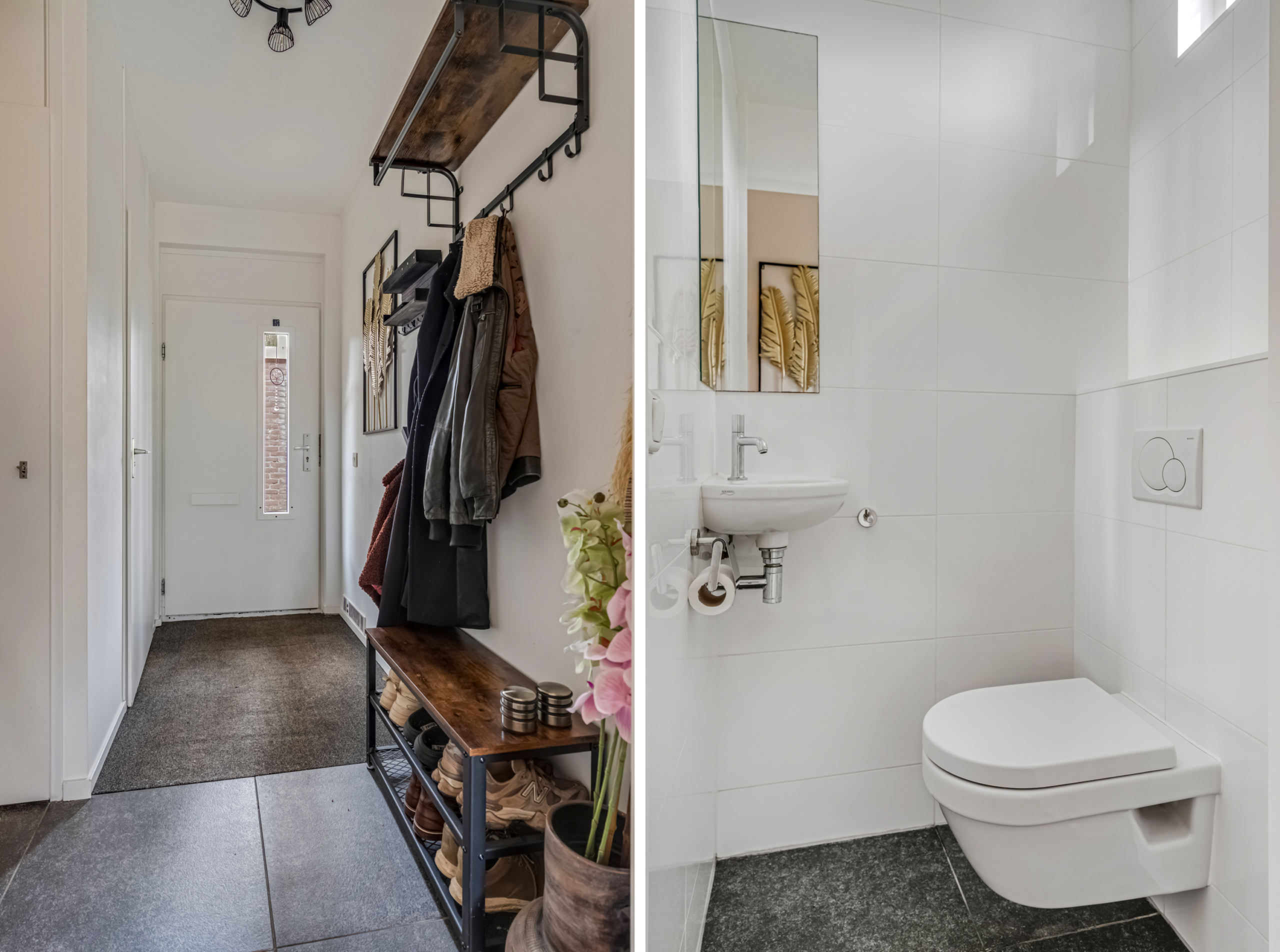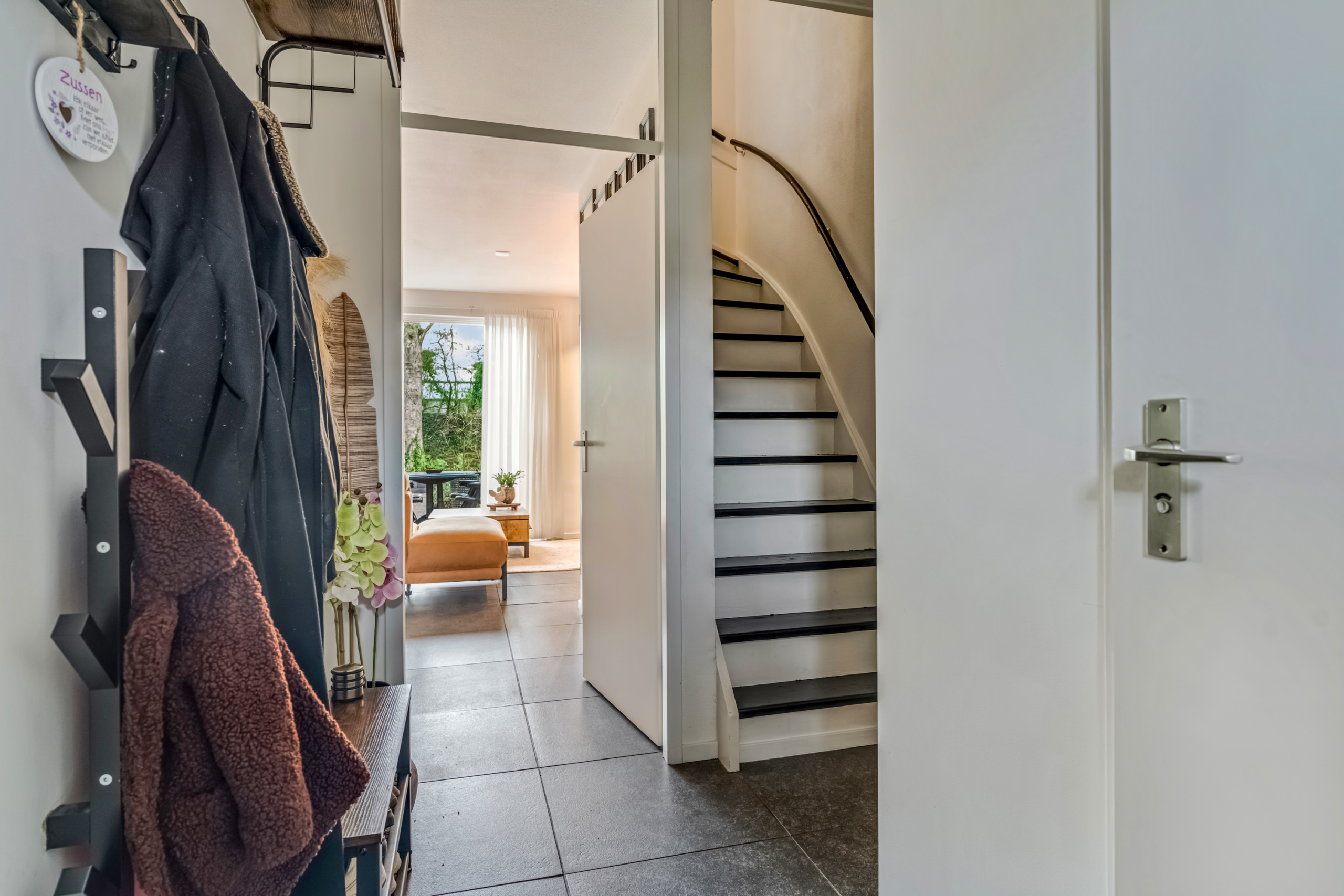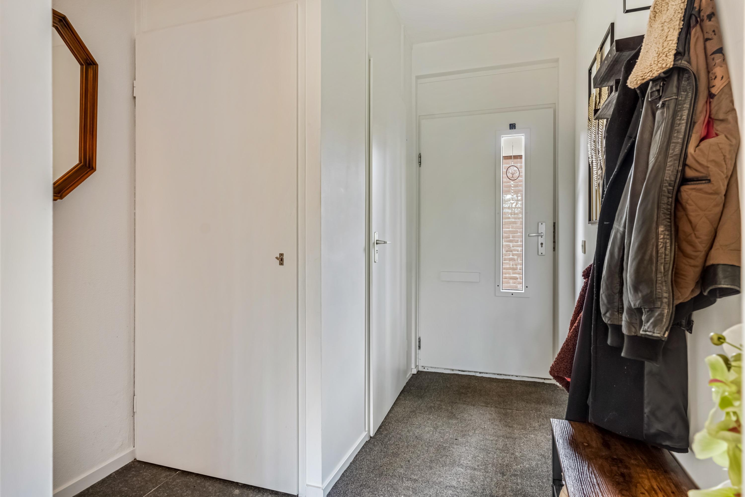 Via de ruime voortuin bereik je de entree van de woning. In de hal vind je de meterkast, de volledig betegelde toiletruimte met fonteintje, de trap naar de eerste verdieping en de toegangsdeur naar de woonkamer.