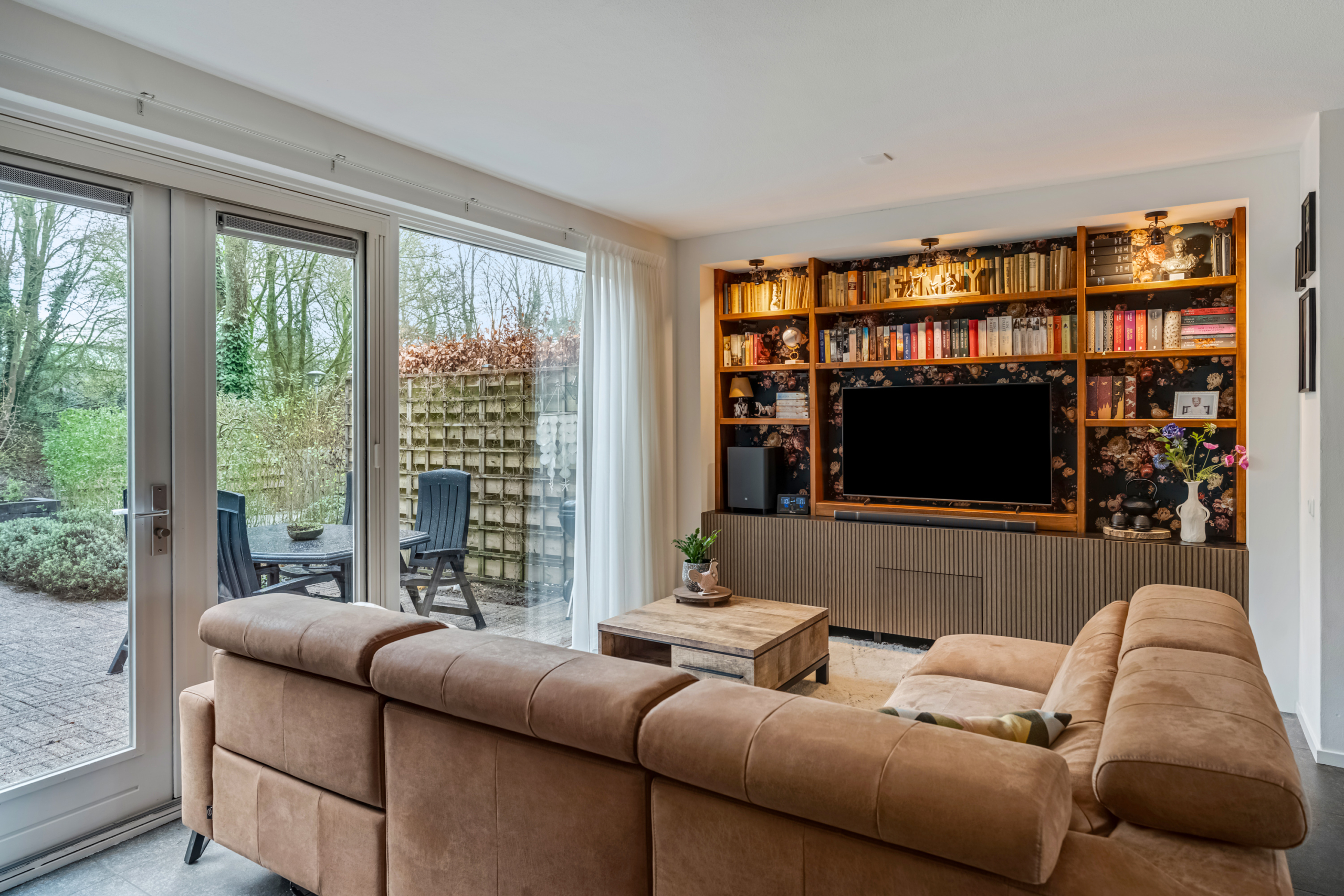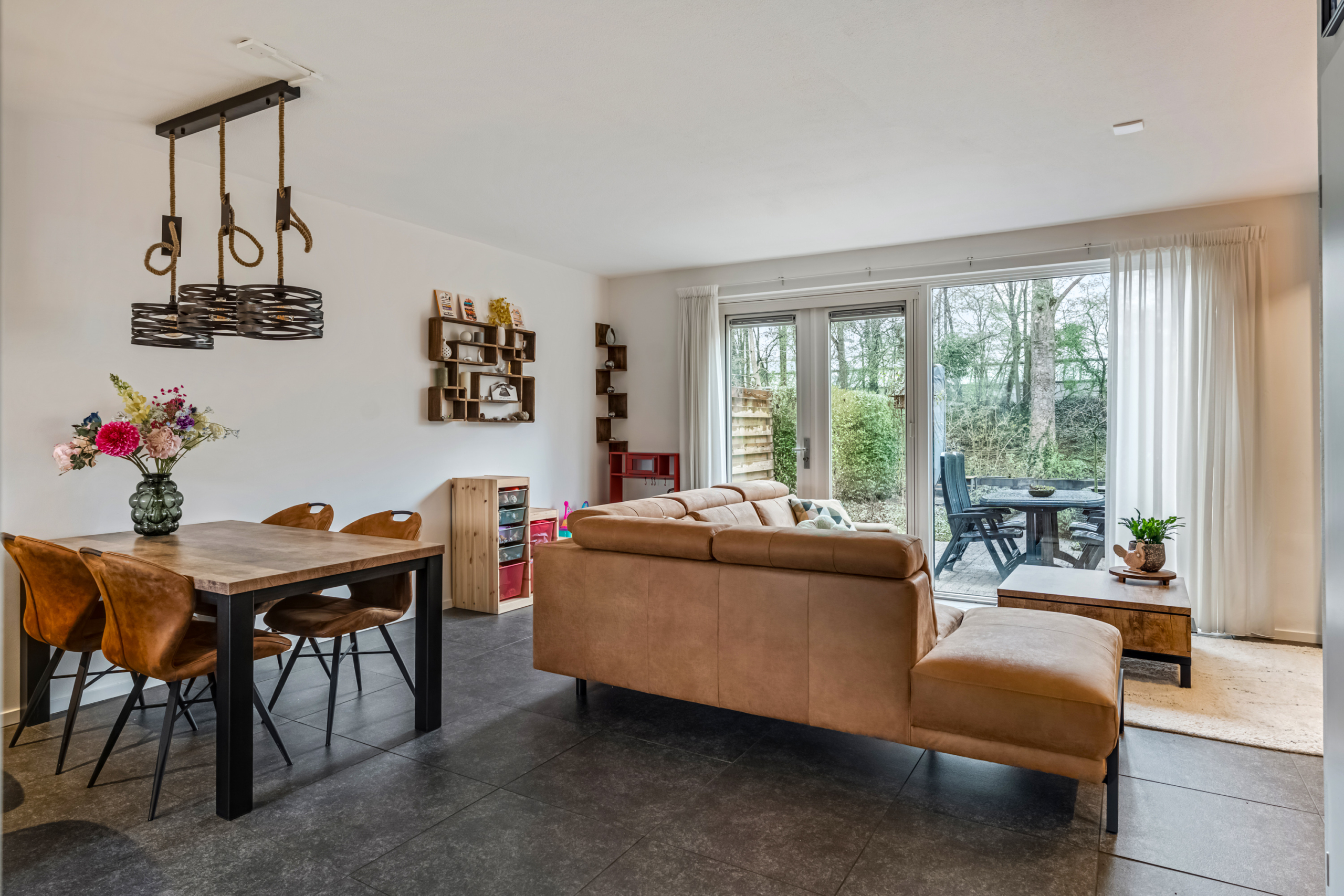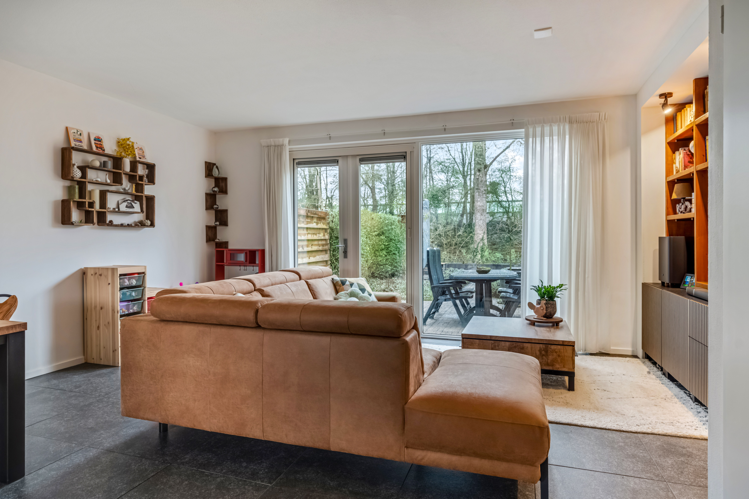 Bij binnenkomst in de woonkamer valt direct de prettige lichtinval op. De grote raampartijen en de openslaande deuren naar de achtertuin zorgen niet alleen voor veel daglicht, maar geven de ruimte ook een open en ruimtelijk karakter. De woonkamer biedt voldoende plek voor een royale zithoek waar je heerlijk kunt ontspannen en een gezellige eethoek om samen te komen met familie en vrienden. De praktische trapkast zorgt voor extra bergruimte, waardoor de woonkamer netjes en overzichtelijk blijft.