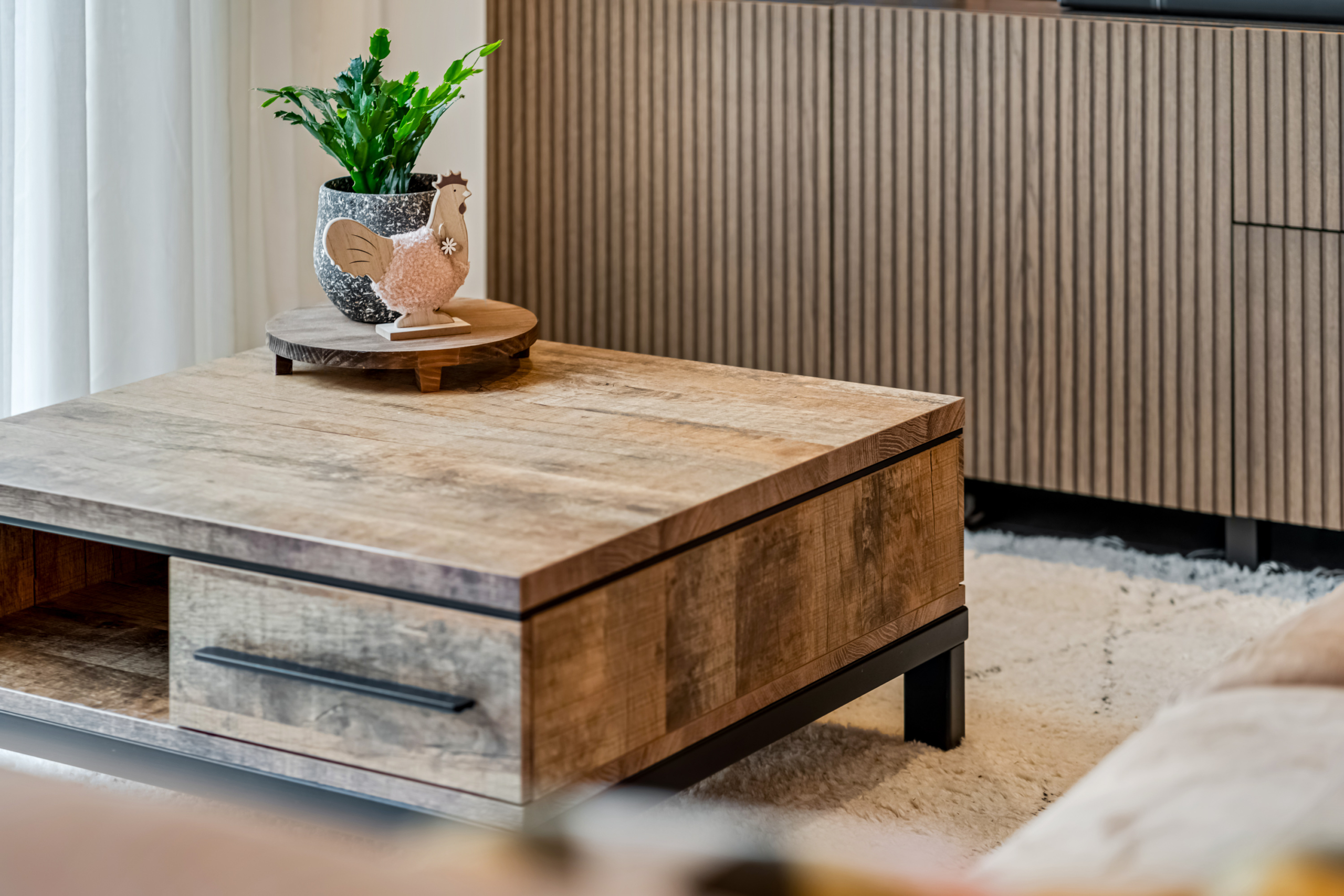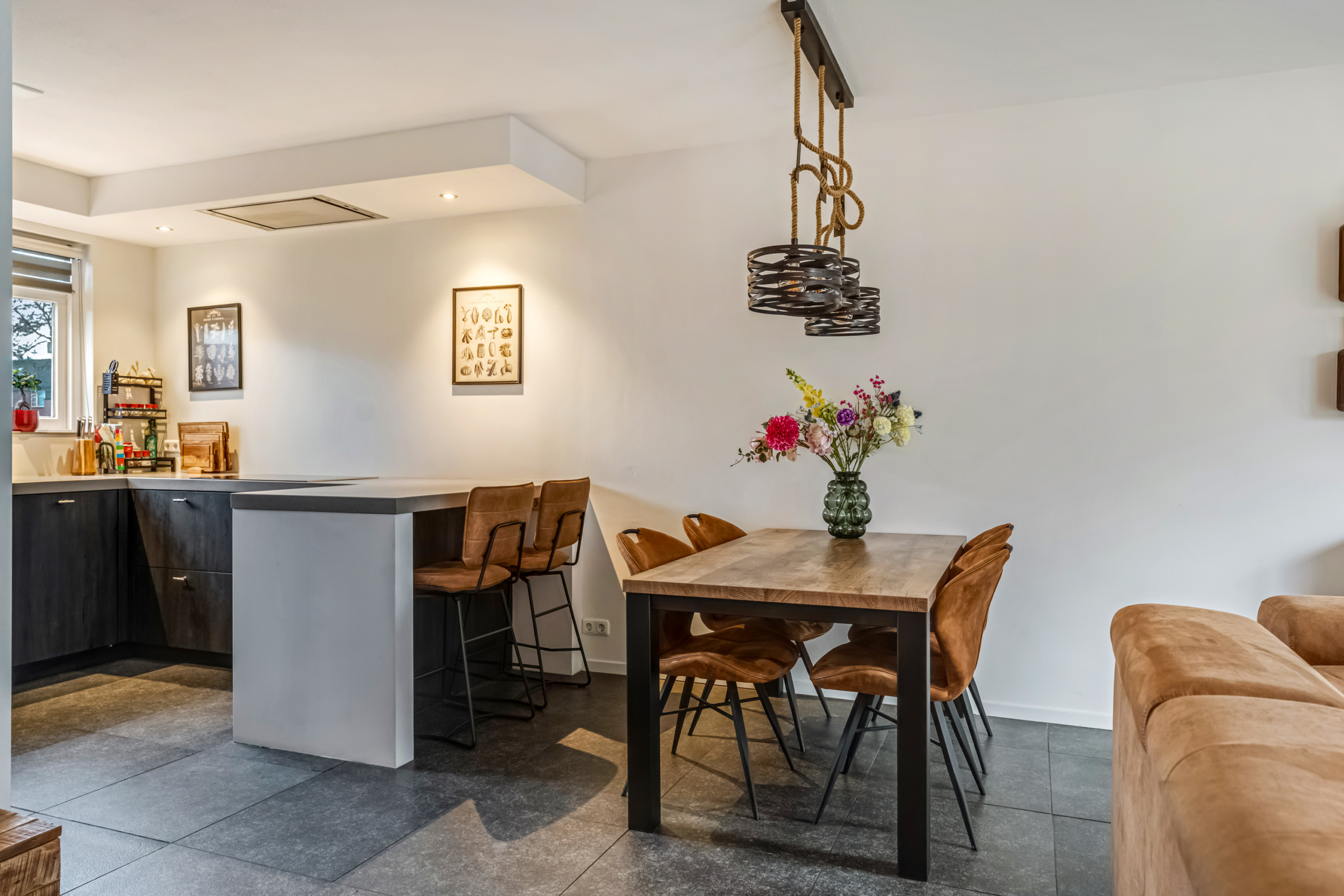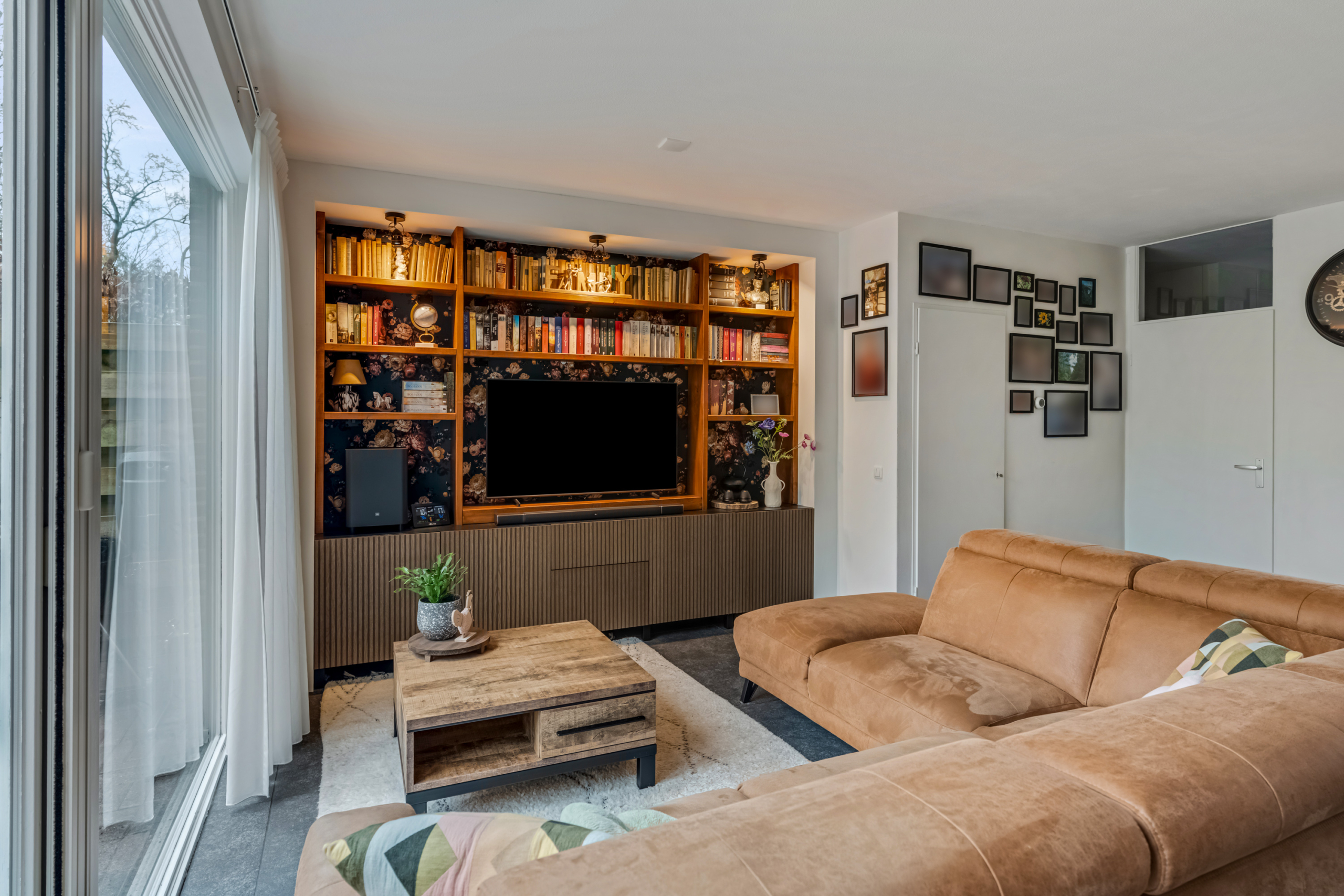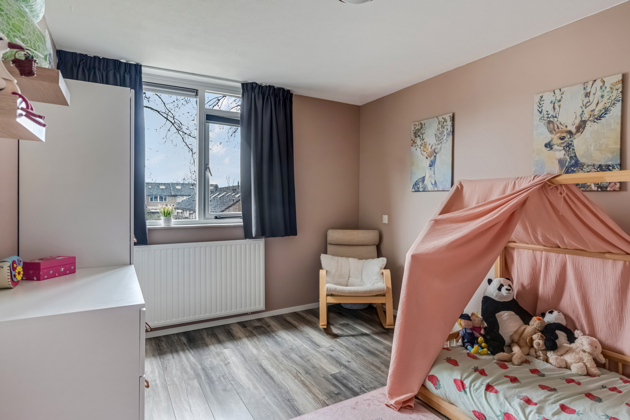 Bij binnenkomst in de woonkamer valt direct de prettige lichtinval op. De grote raampartijen en de openslaande deuren naar de achtertuin zorgen niet alleen voor veel daglicht, maar geven de ruimte ook een open en ruimtelijk karakter. De woonkamer biedt voldoende plek voor een royale zithoek waar je heerlijk kunt ontspannen en een gezellige eethoek om samen te komen met familie en vrienden. De praktische trapkast zorgt voor extra bergruimte, waardoor de woonkamer netjes en overzichtelijk blijft.
