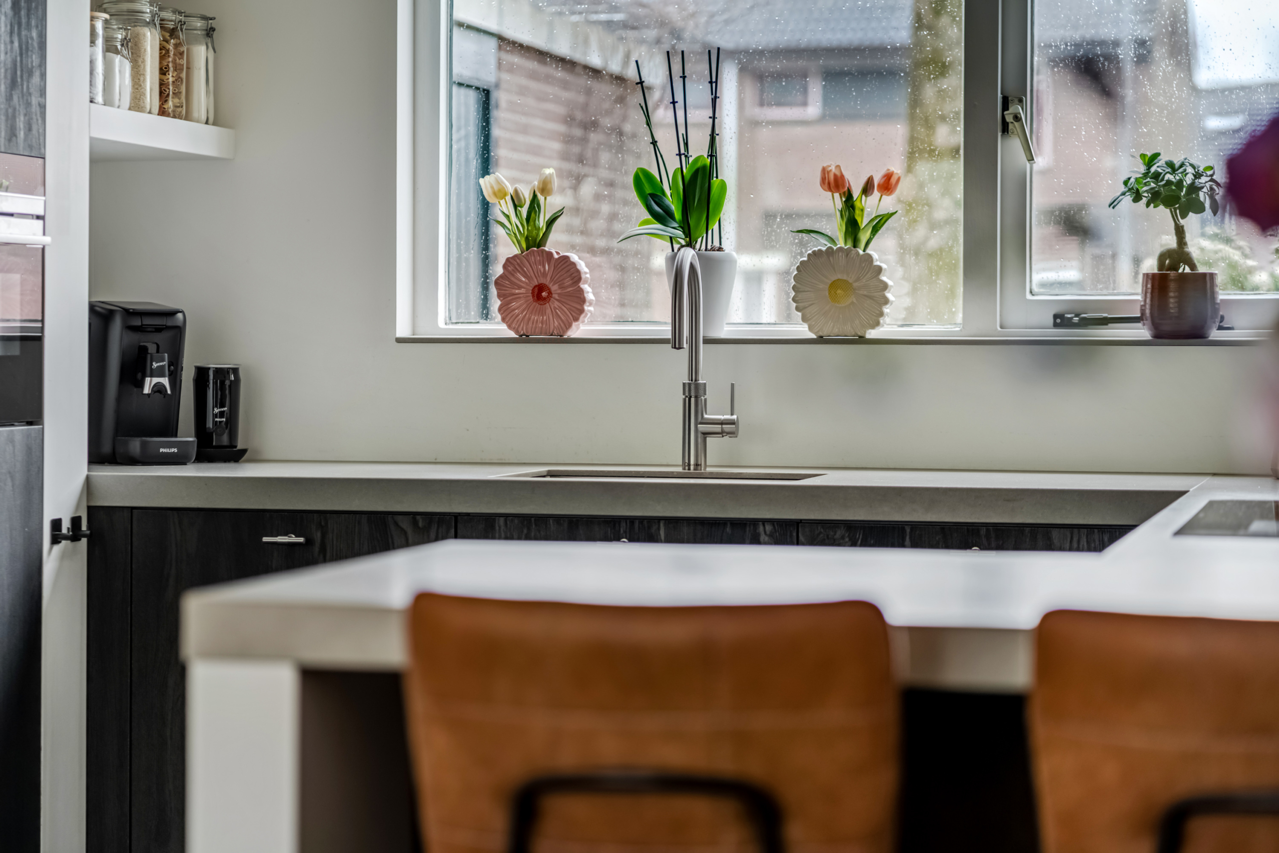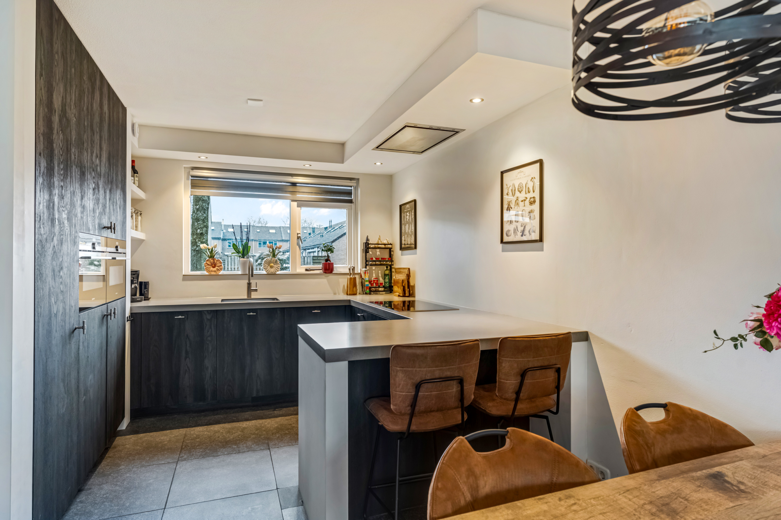 De moderne keuken bevindt zich aan de voorzijde van de woning en is een prettige plek voor kookliefhebbers. De keuken is uitgerust met diverse inbouwapparatuur, waaronder een koelkast, vriezer, oven, quooker kraan, magnetron en vaatwasser, waardoor je hier van alle gemakken bent voorzien. Daarnaast beschikt de keuken over veel kastruimte, zodat alles netjes en overzichtelijk kan worden opgeborgen.