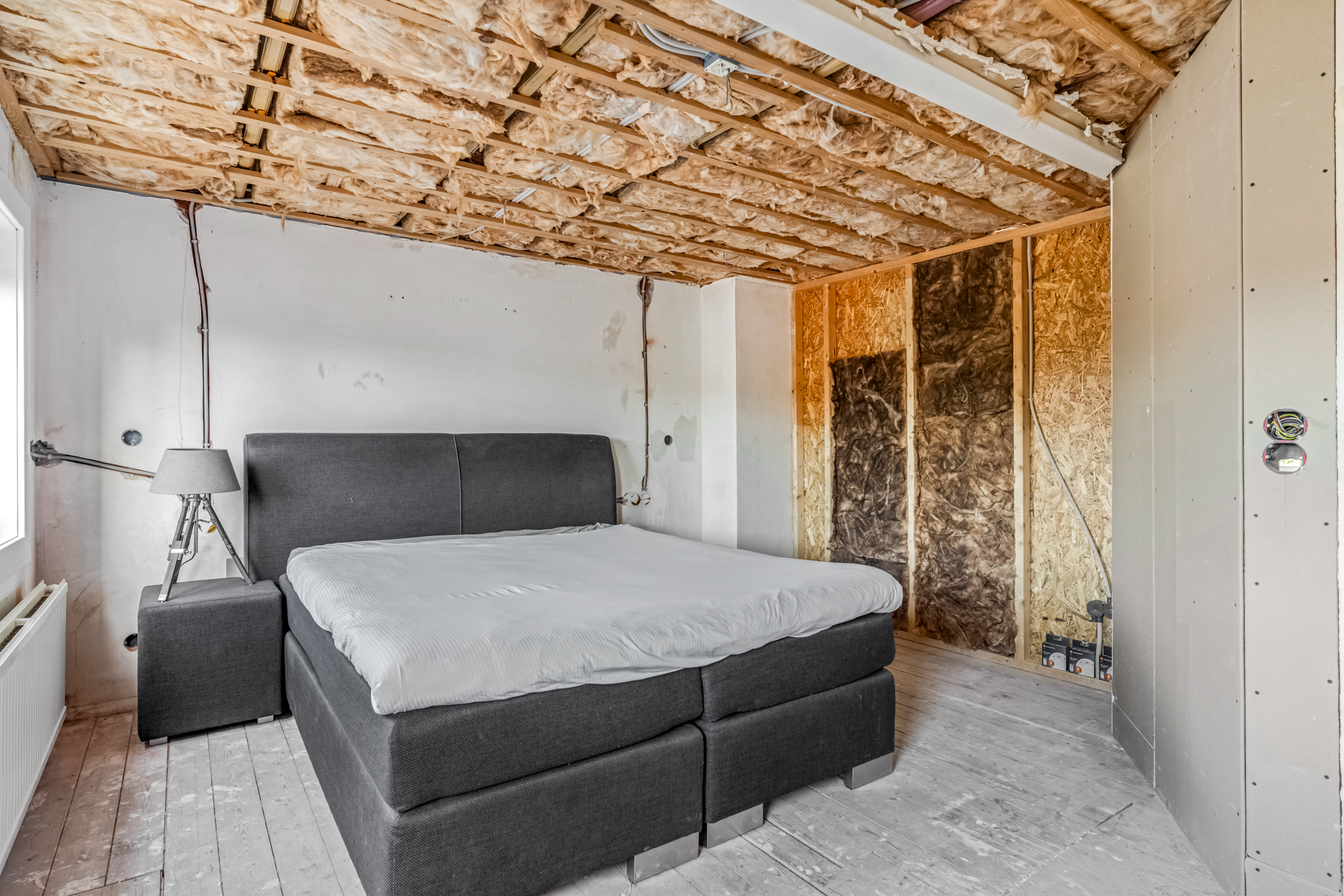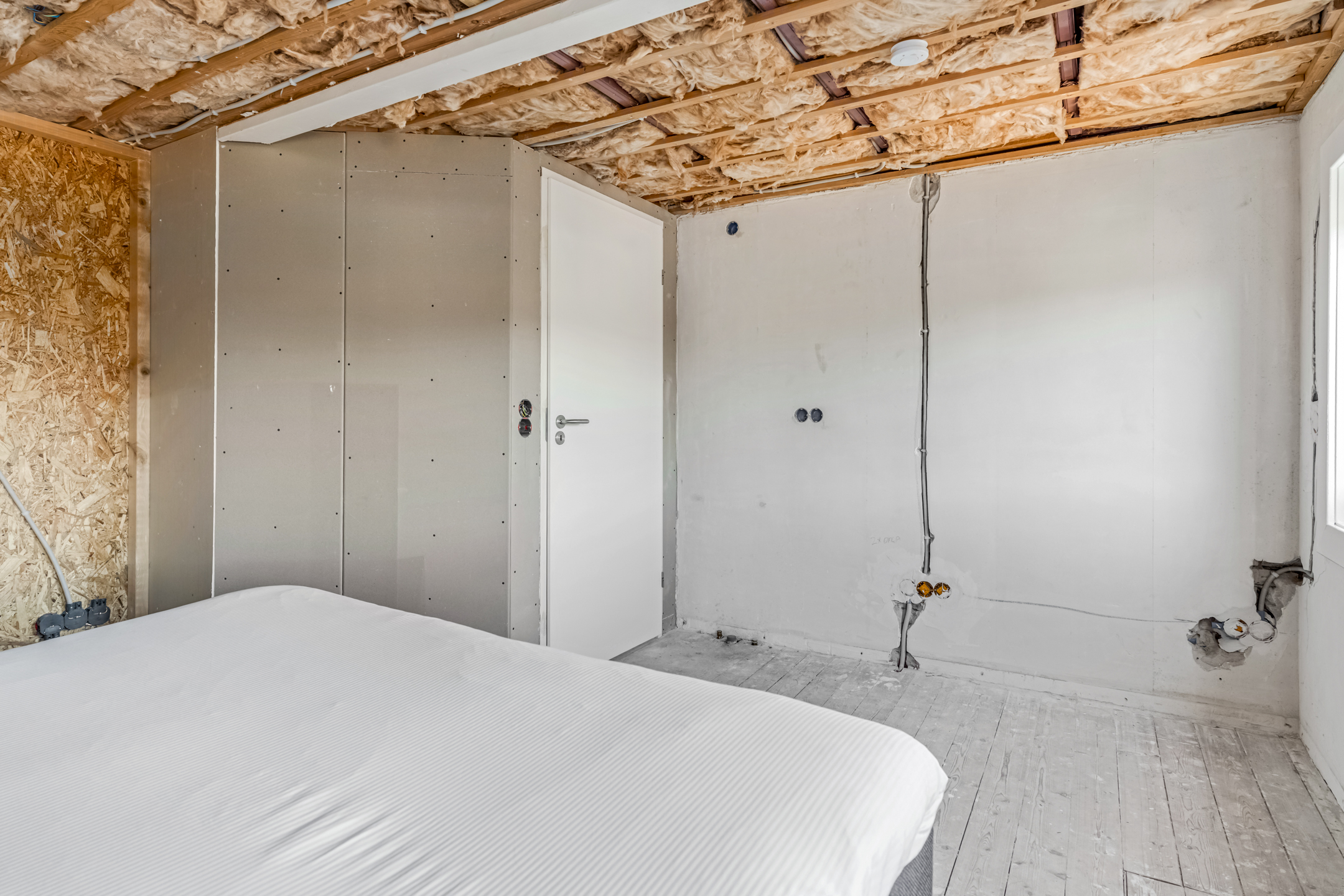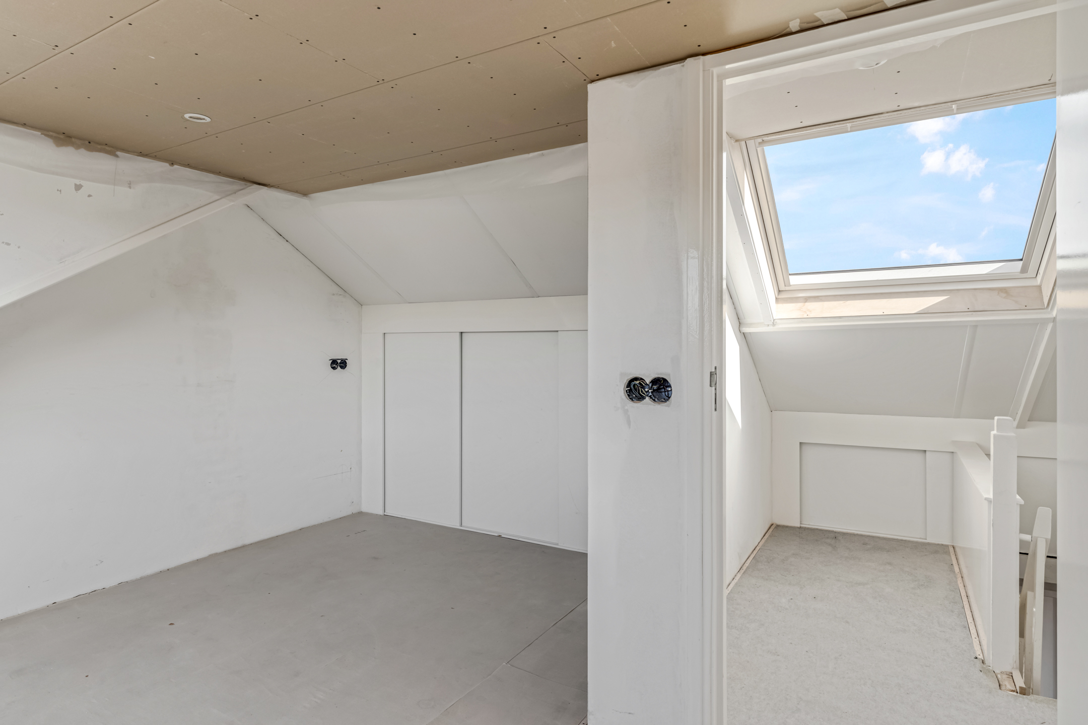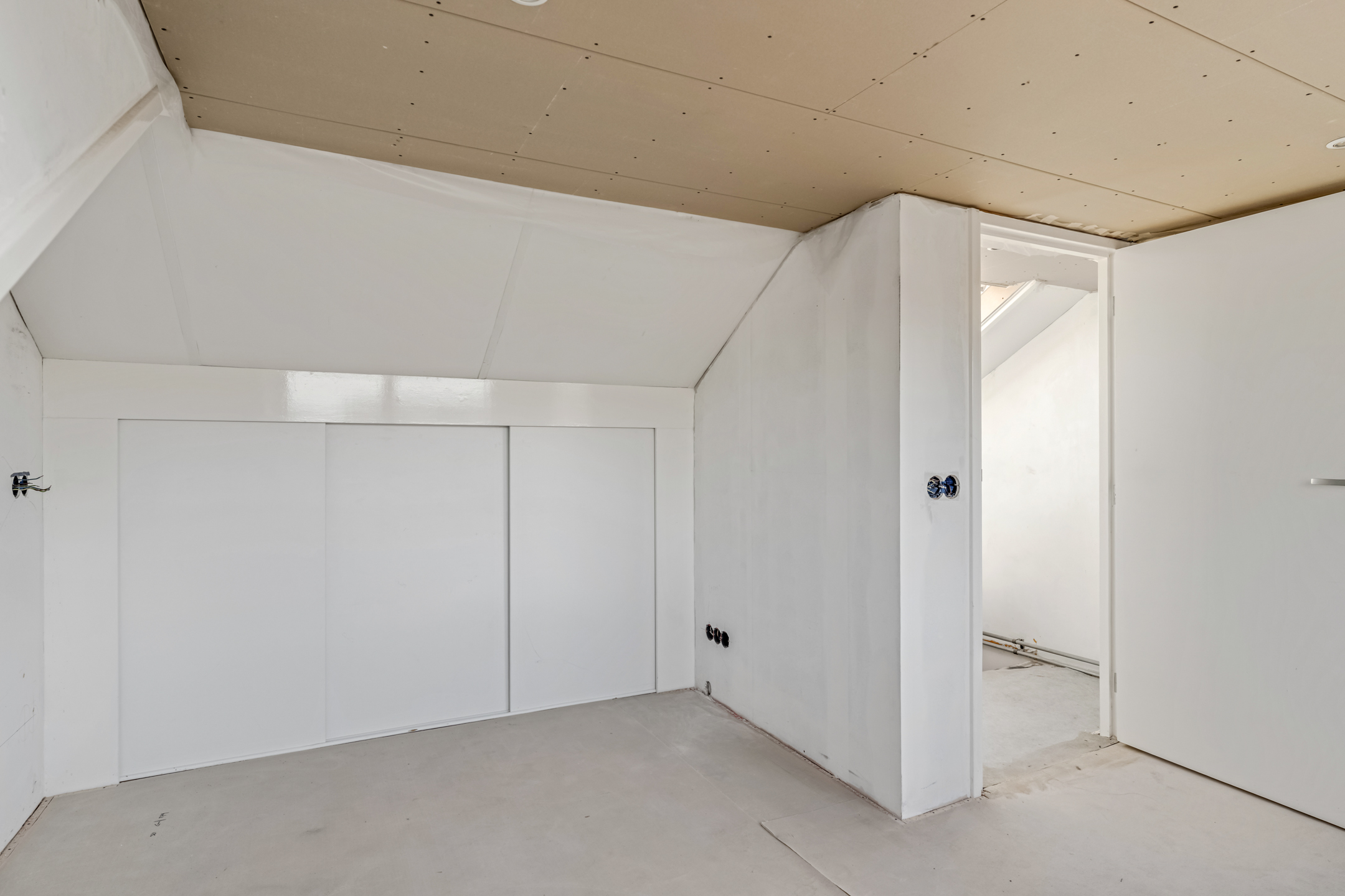 De vaste trap naar de tweede verdieping brengt je bij nóg meer ruimte. Vanaf de overloop kom je in de slaapkamer terecht. In deze kamer vind je knieschotten en een deur naar de cv-ketel die uit het zicht is opgesteld. Deze kamer is ook te gebruiken als bergruimte of werkplek.