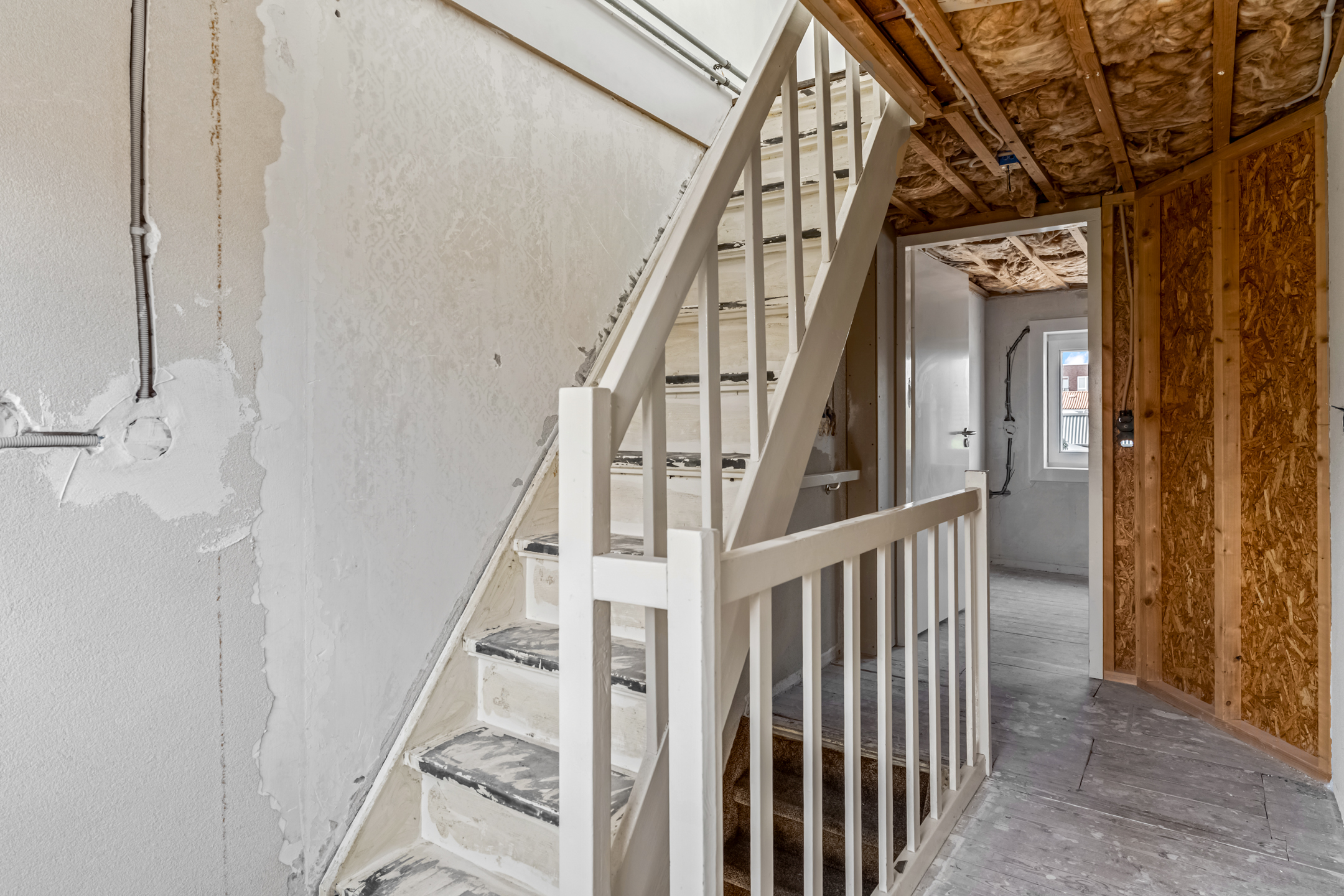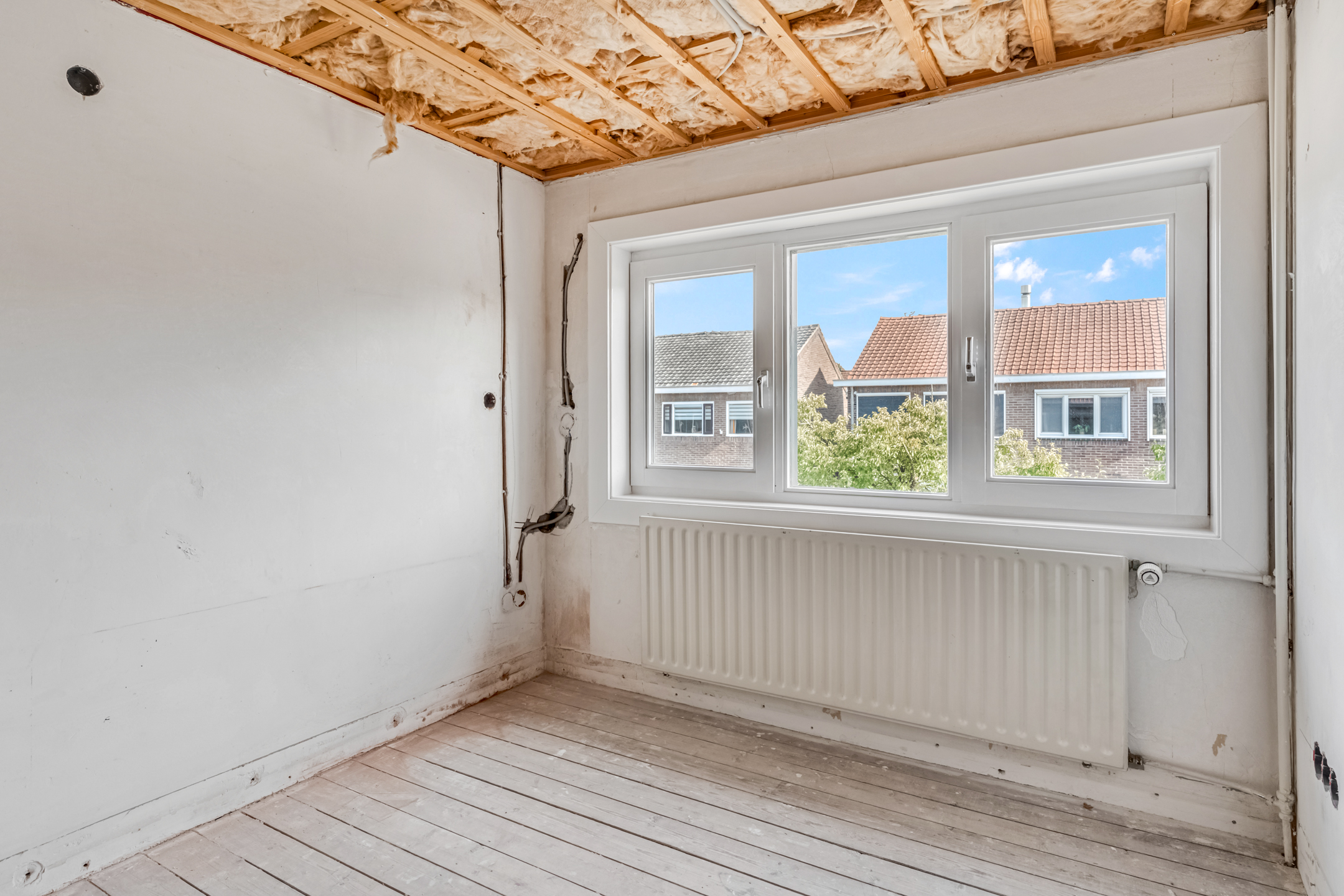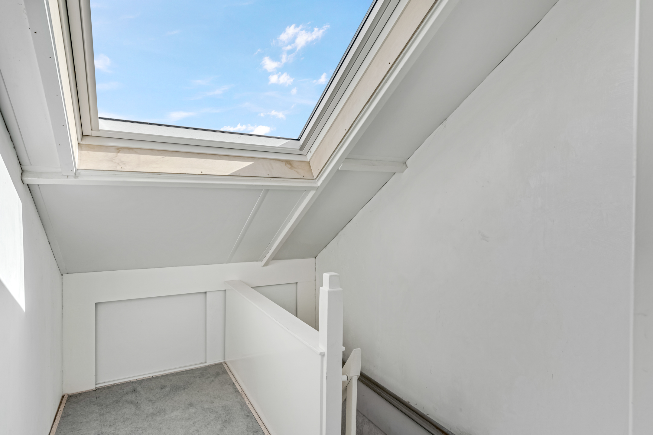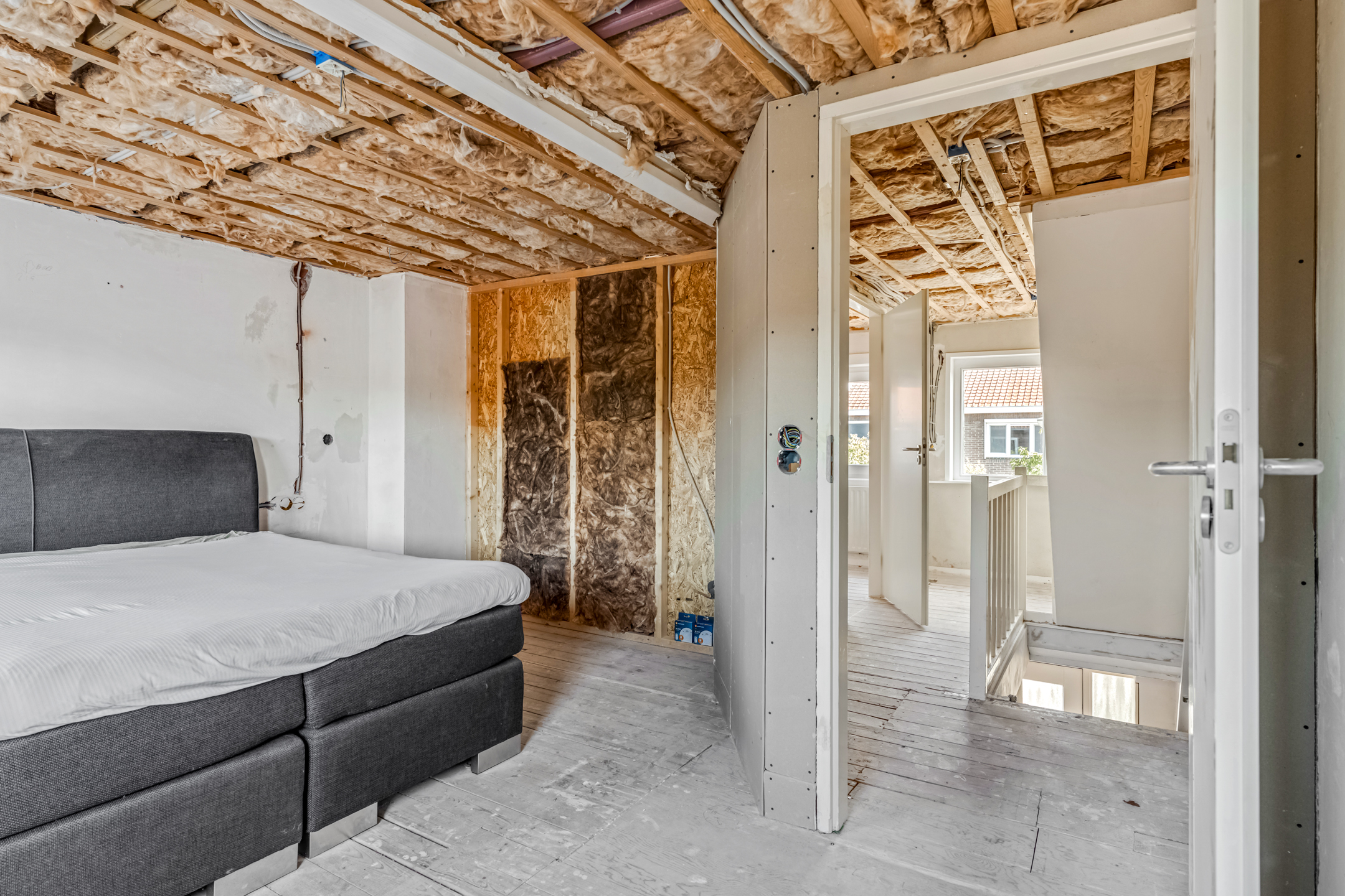 De vaste trap naar de tweede verdieping brengt je bij nóg meer ruimte. Vanaf de overloop kom je in de slaapkamer terecht. In deze kamer vind je knieschotten en een deur naar de cv-ketel die uit het zicht is opgesteld. Deze kamer is ook te gebruiken als bergruimte of werkplek.