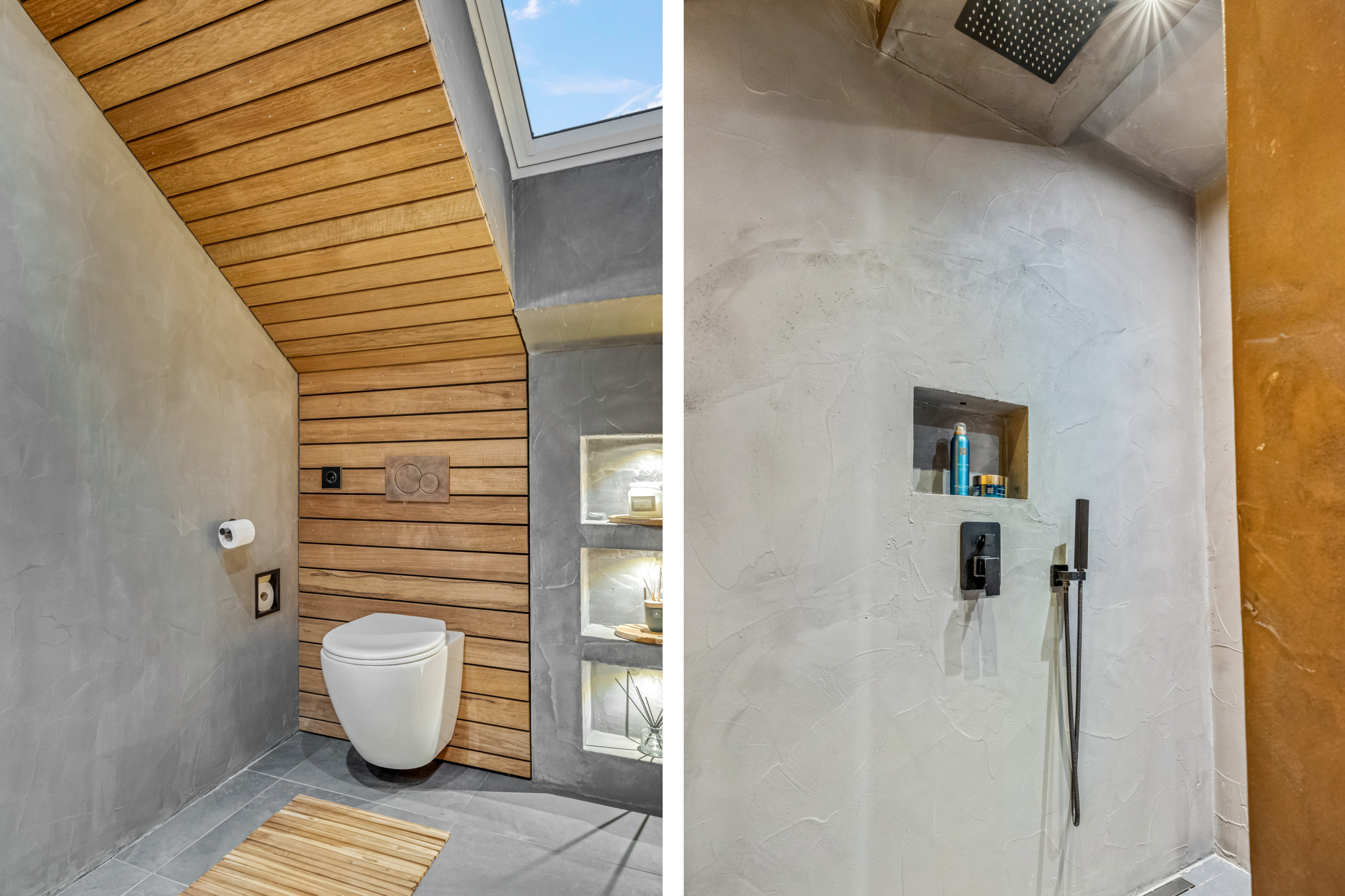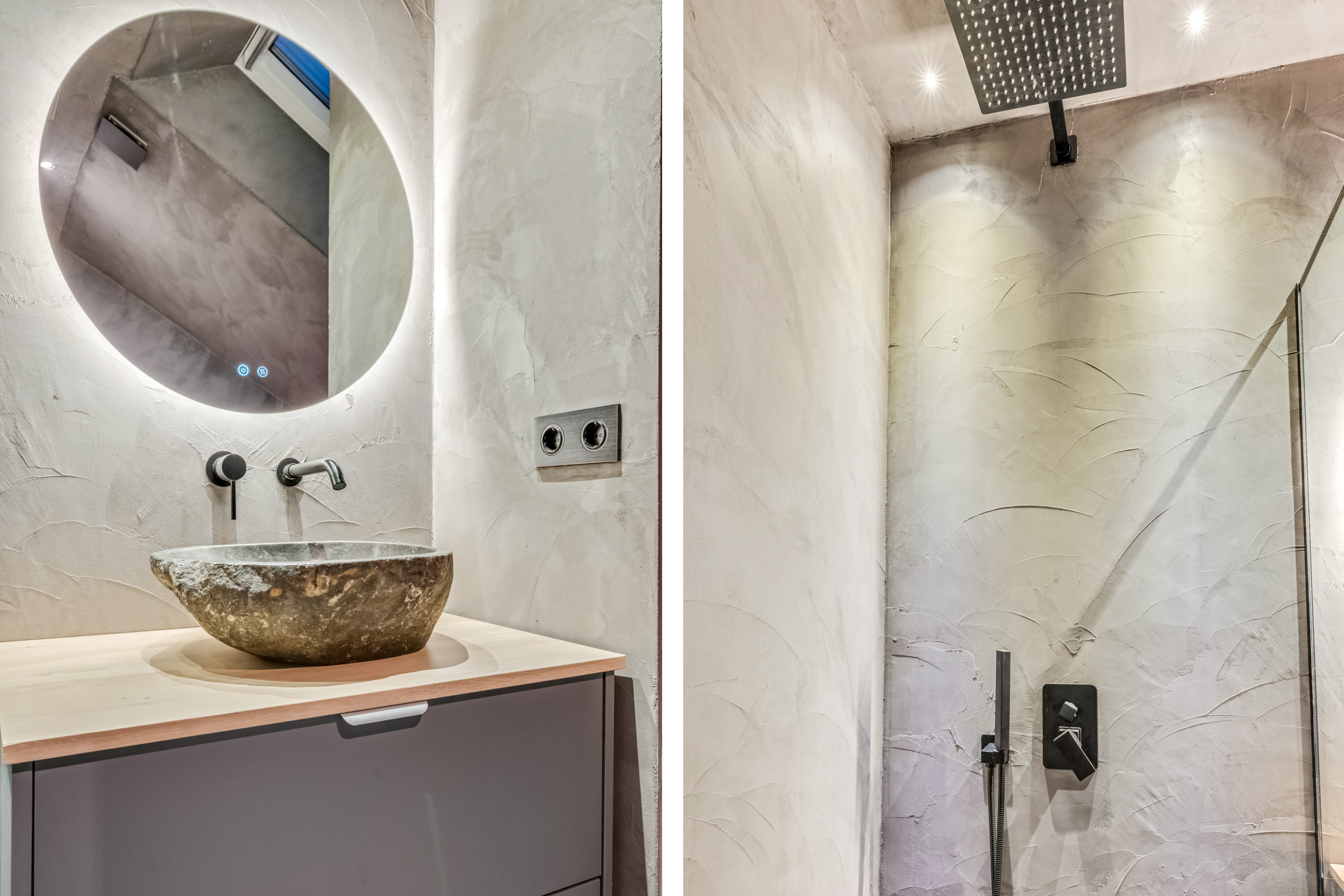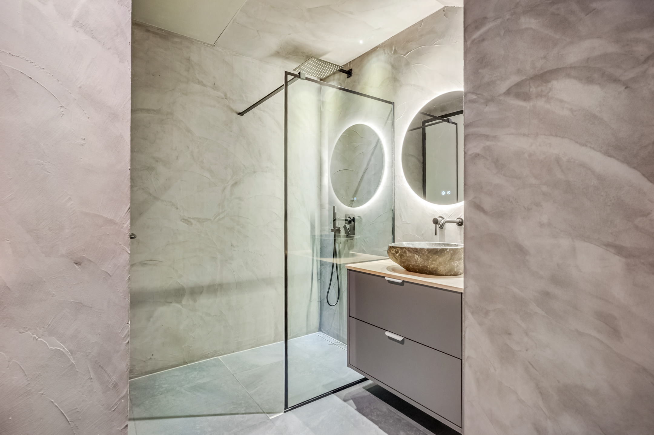 – Hoog afwerkingsniveau: Wanden afgewerkt met exclusieve Beal Mortex, luxe wellness-badkamer;