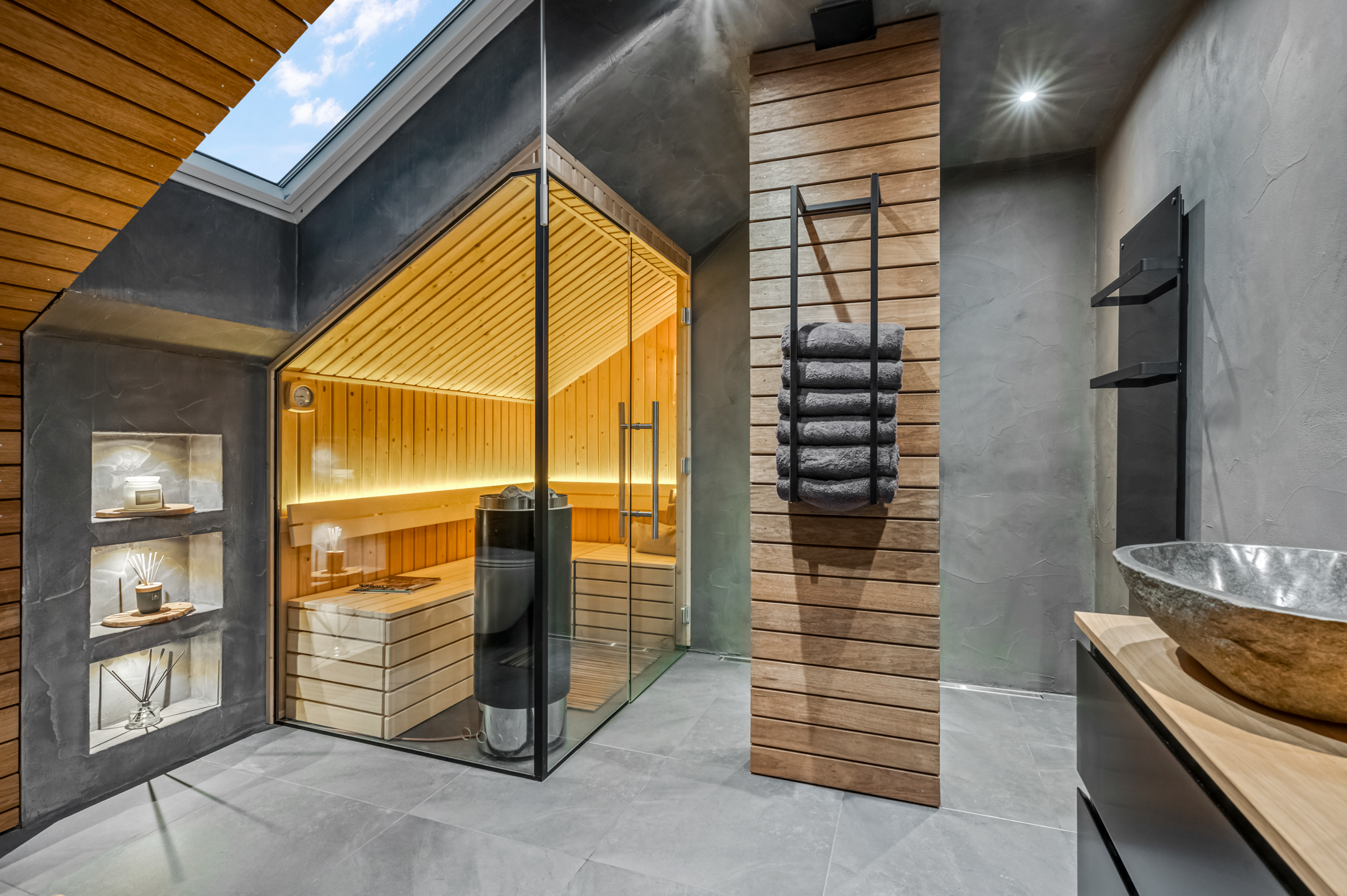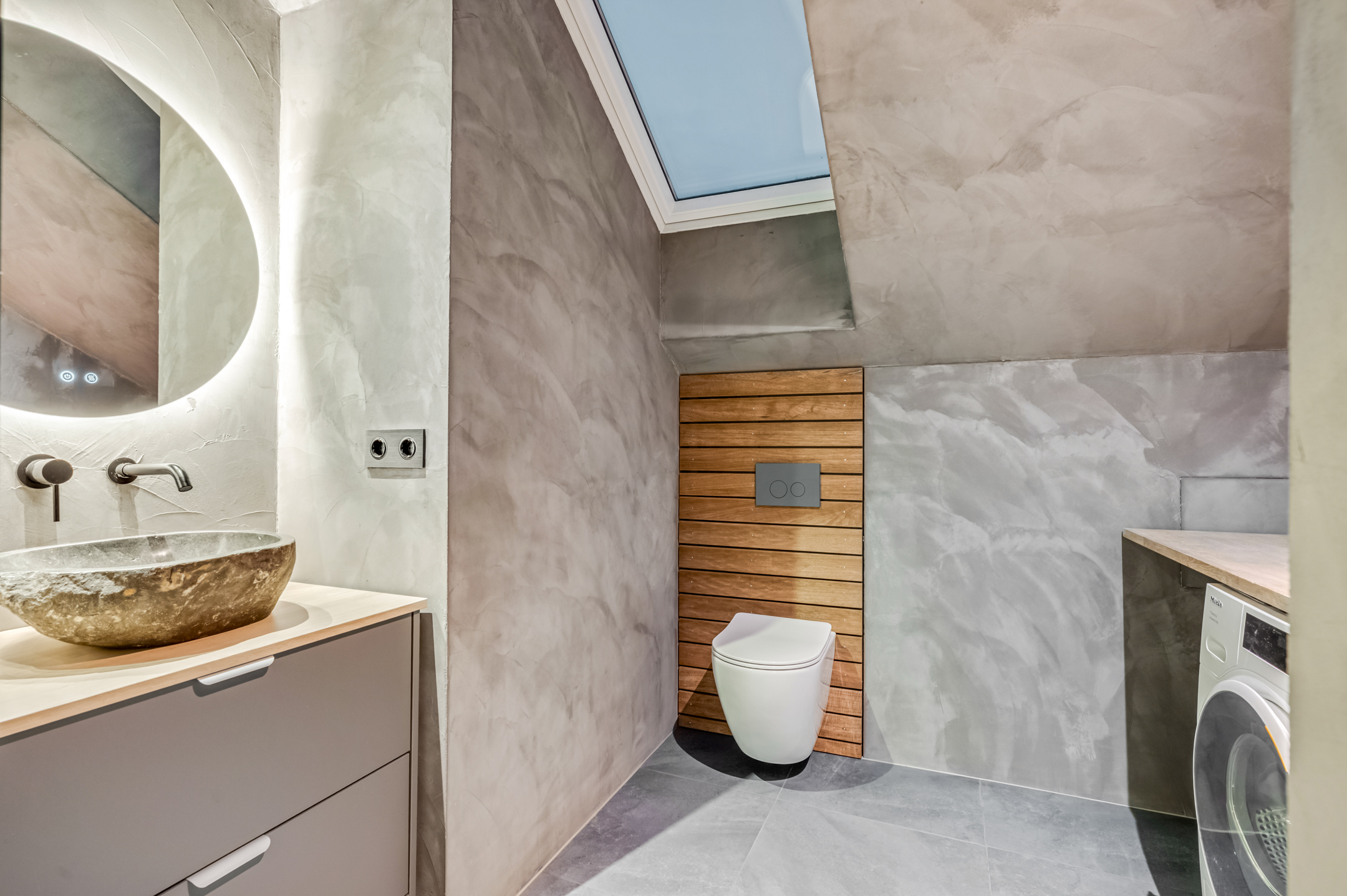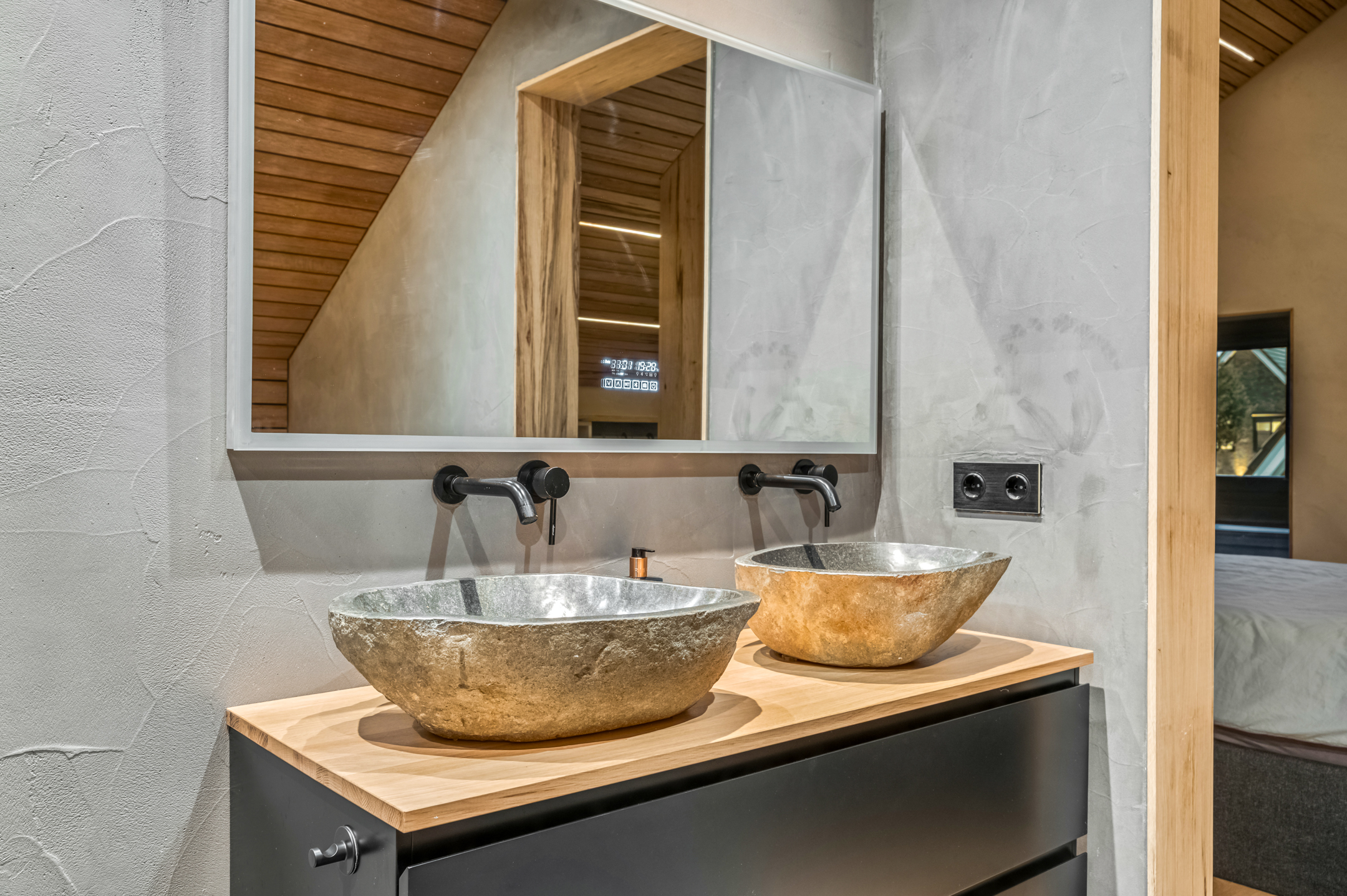 – Hoog afwerkingsniveau: Wanden afgewerkt met exclusieve Beal Mortex, luxe wellness-badkamer;