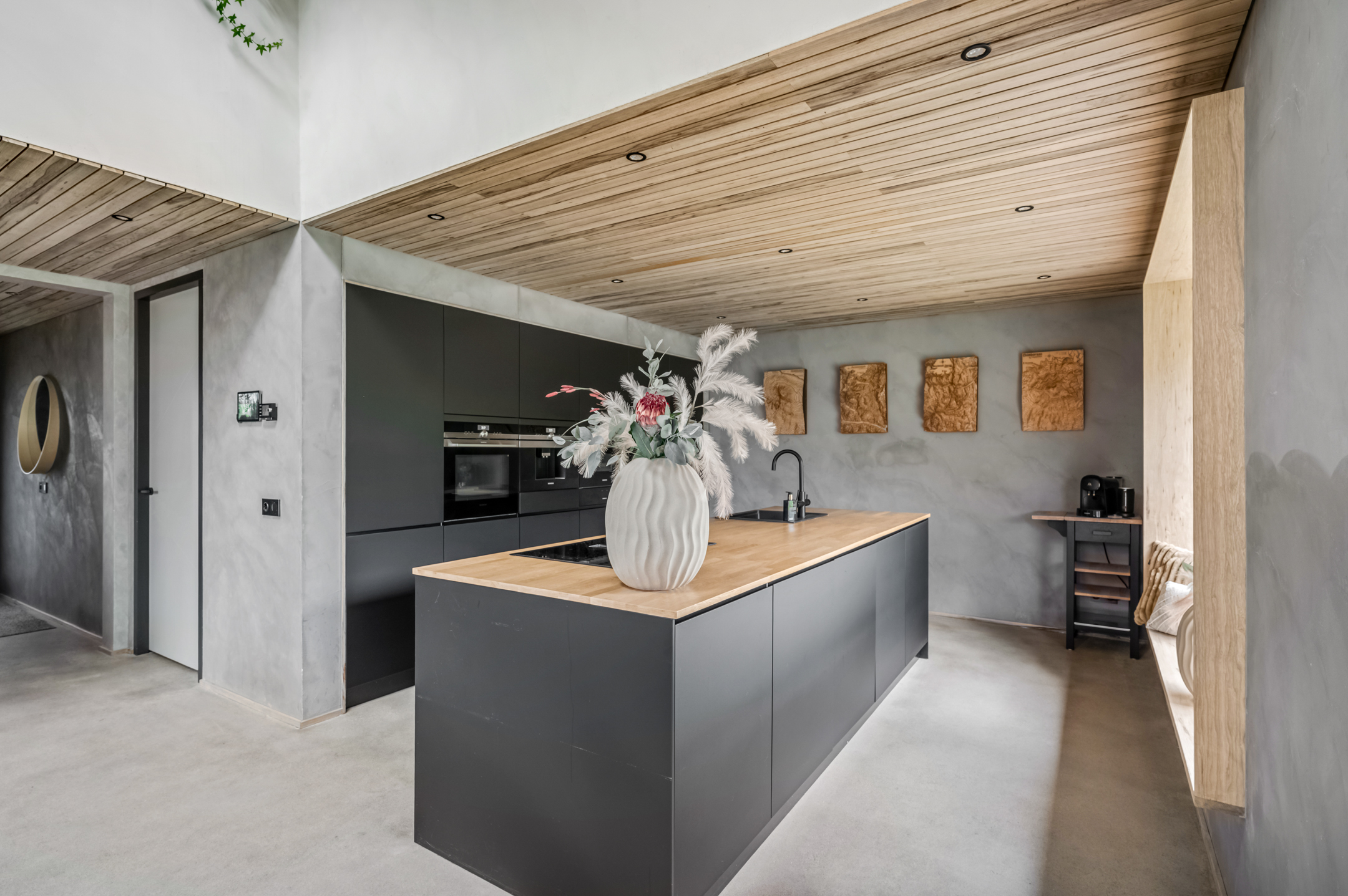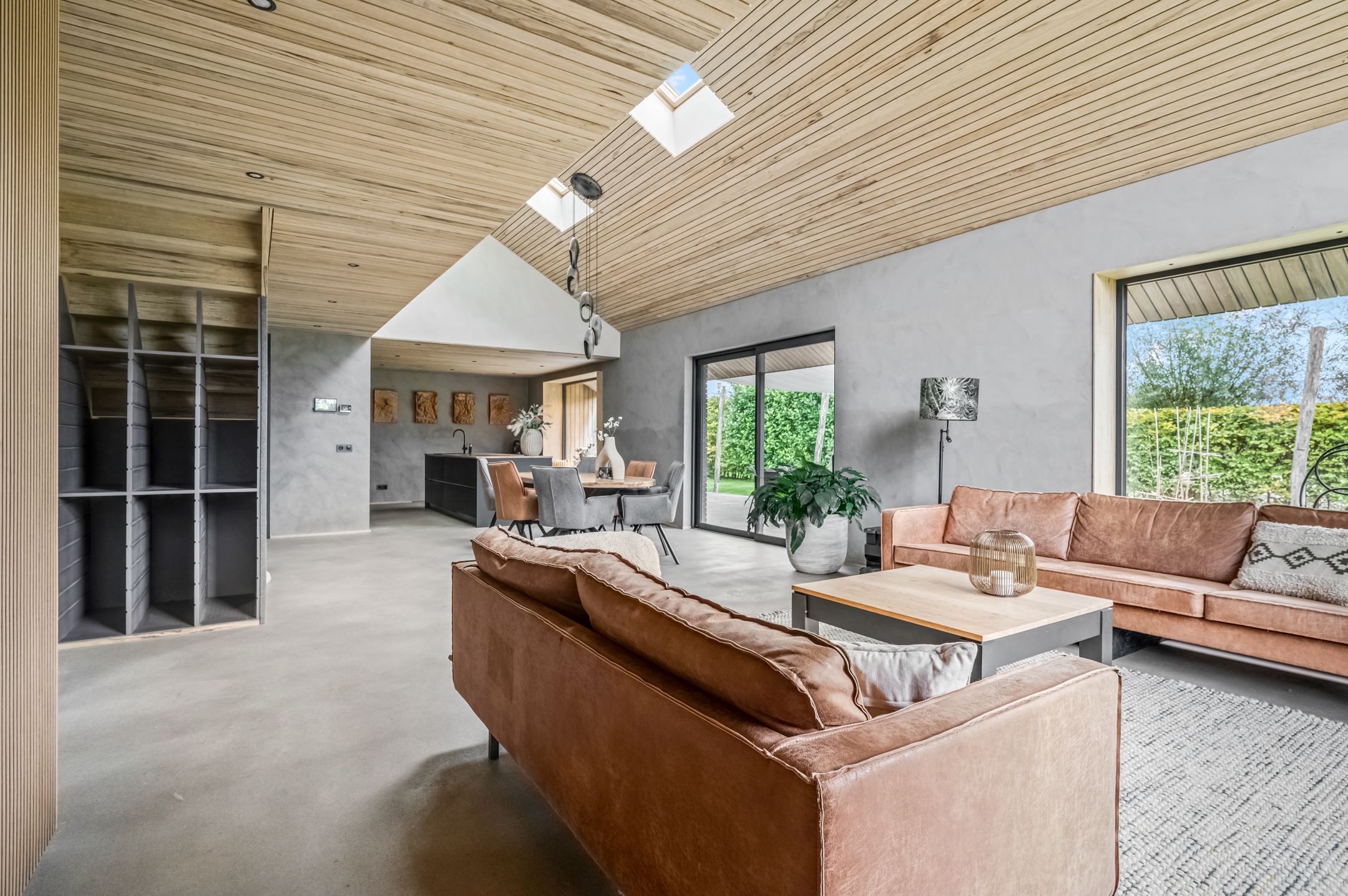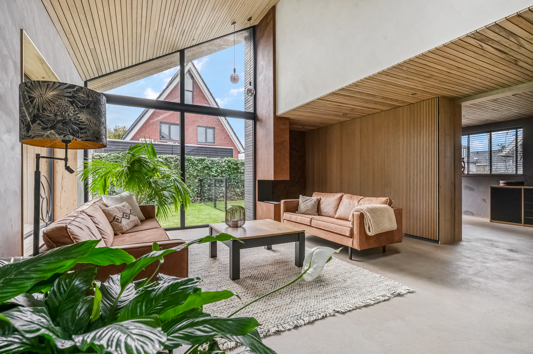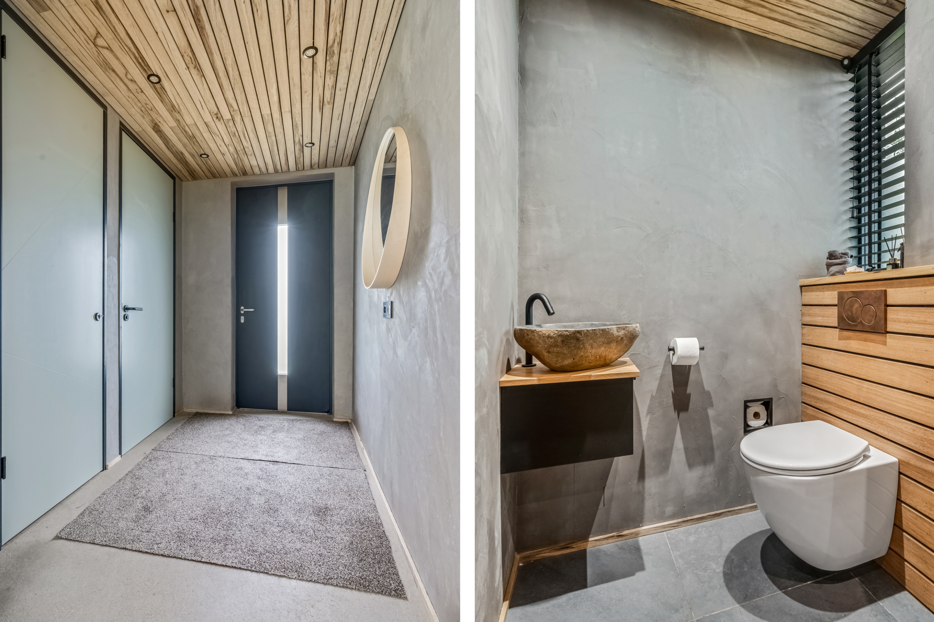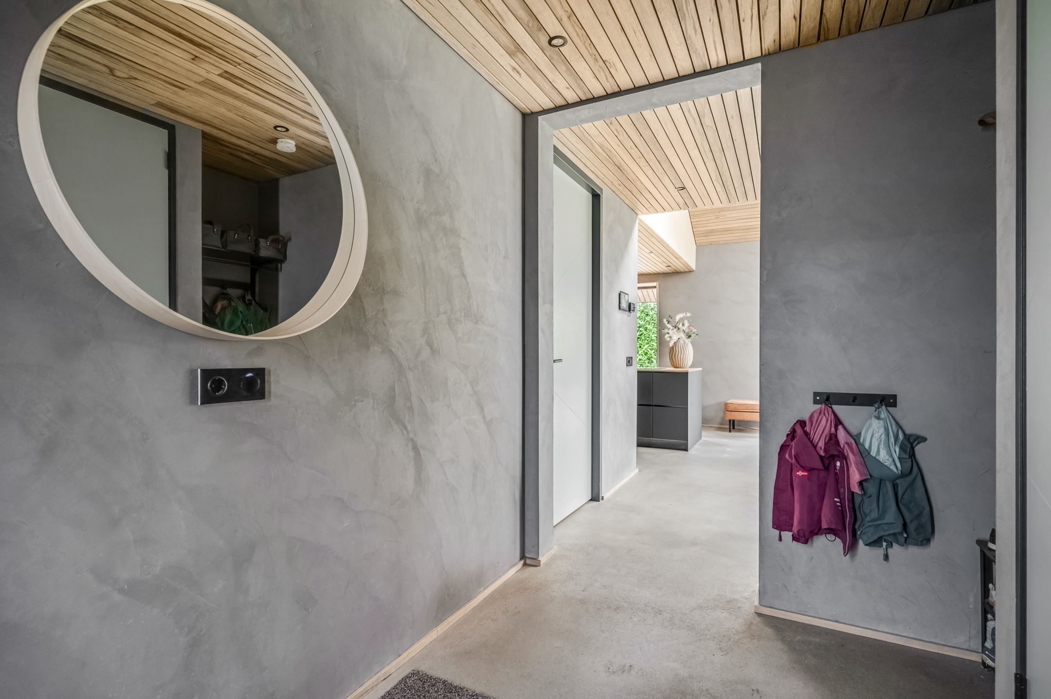 Via de royale oprit, met ruimte voor meerdere auto’s, bereik je de voordeur. Bij binnenkomst in de hal vind je de toiletruimte, meterkast (incl. waterontharder en krachtstroomaansluiting), garderobe en de deur naar de living. Dankzij de grote raampartijen en twee dakramen met geautomatiseerde Velux screens is de woonkamer licht, open en sfeervol. De bio-ethanolhaard zorgt voor extra warmte en ambiance, terwijl de betonlook vloer een moderne, stijlvolle basis vormt. De wanden, afgewerkt met exclusieve Beal Mortex, bieden een strakke, luxe uitstraling en zijn zeer onderhoudsvriendelijk. De ruime opzet biedt volop mogelijkheden voor verschillende meubelopstellingen.