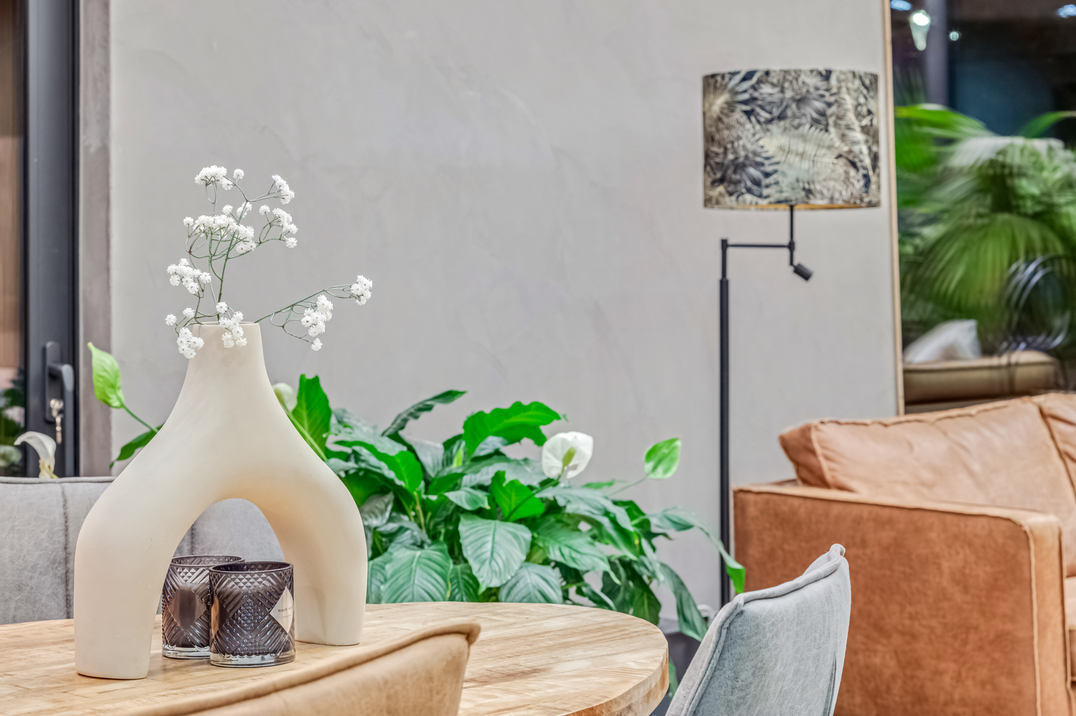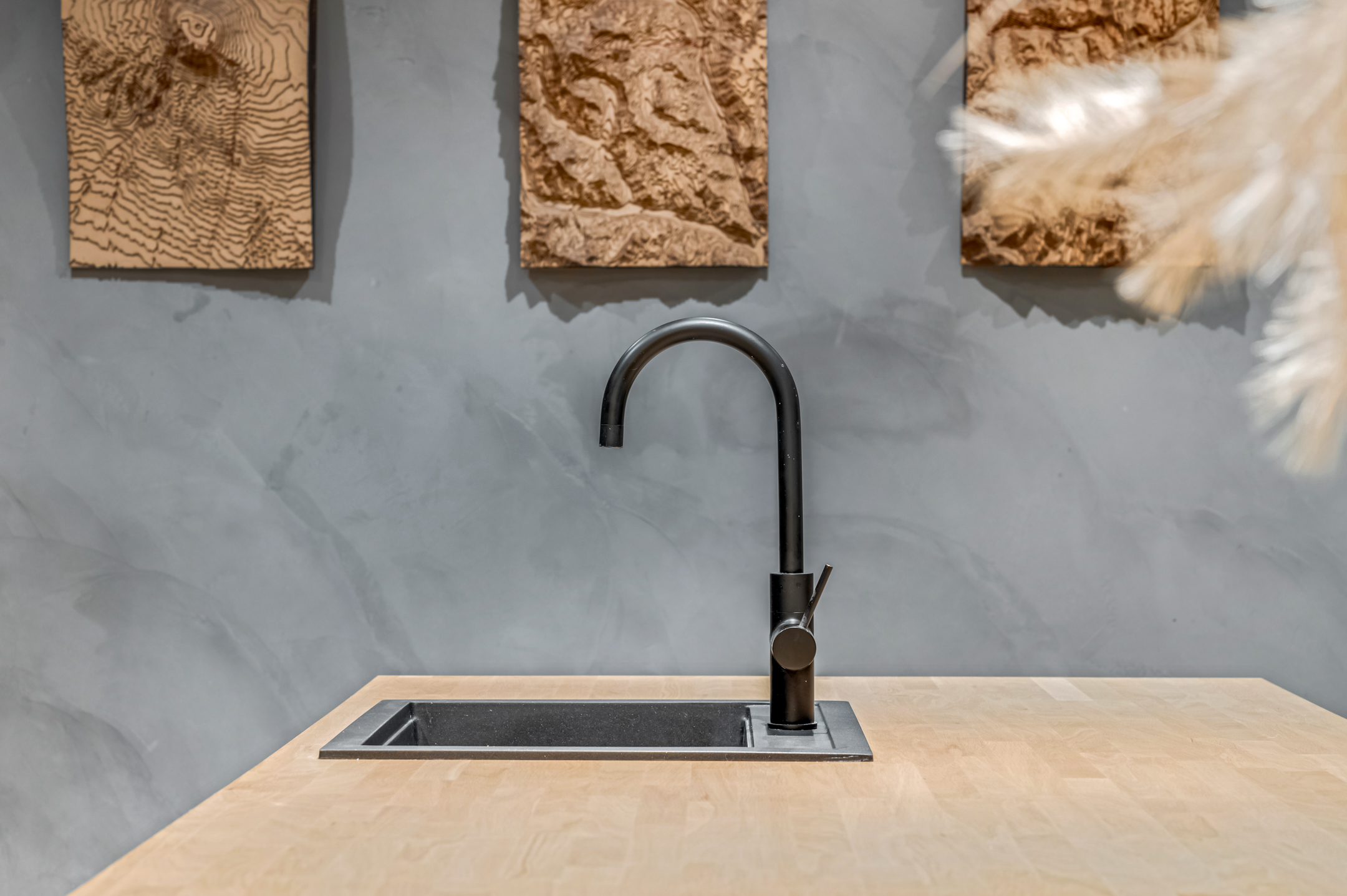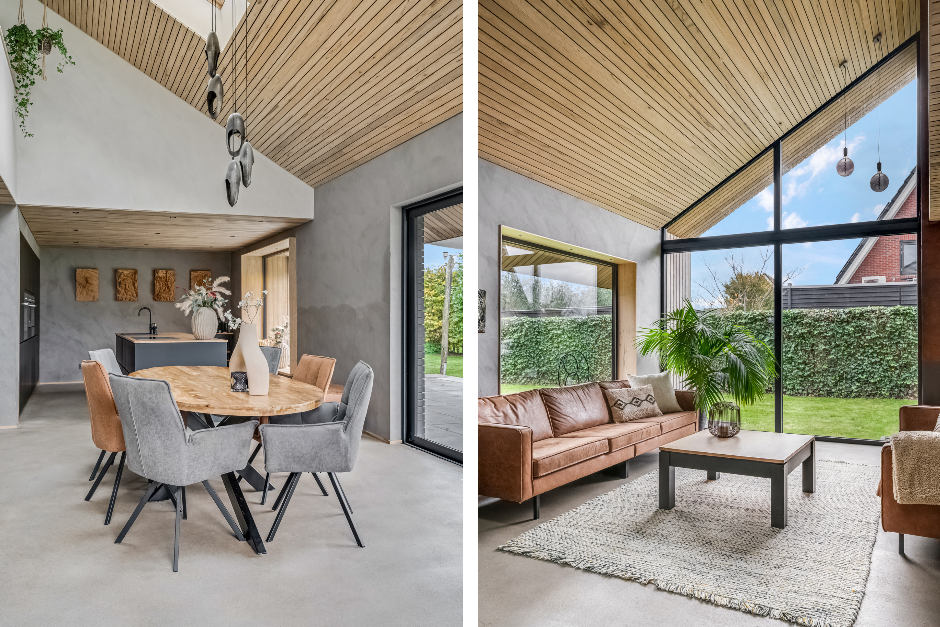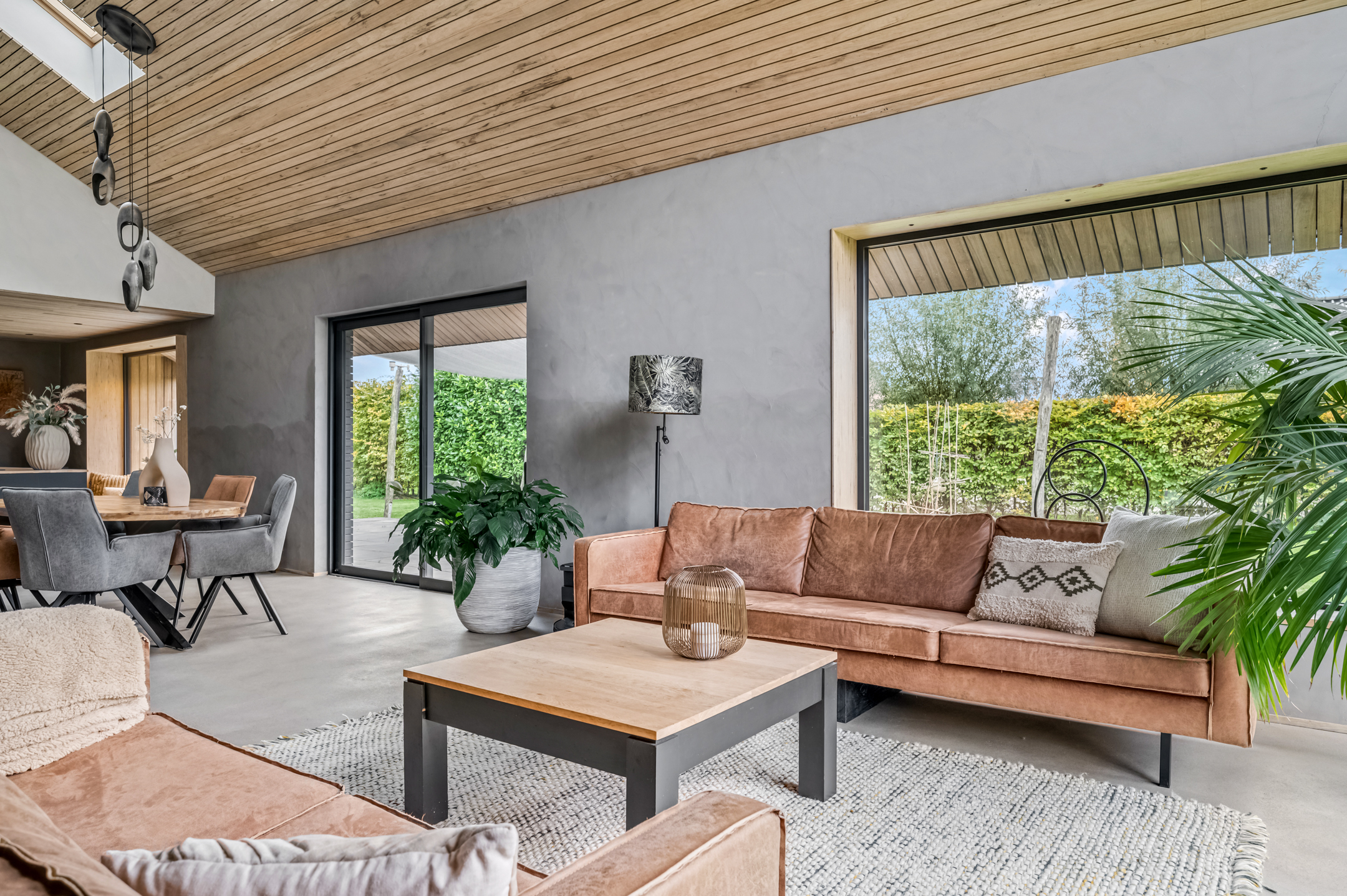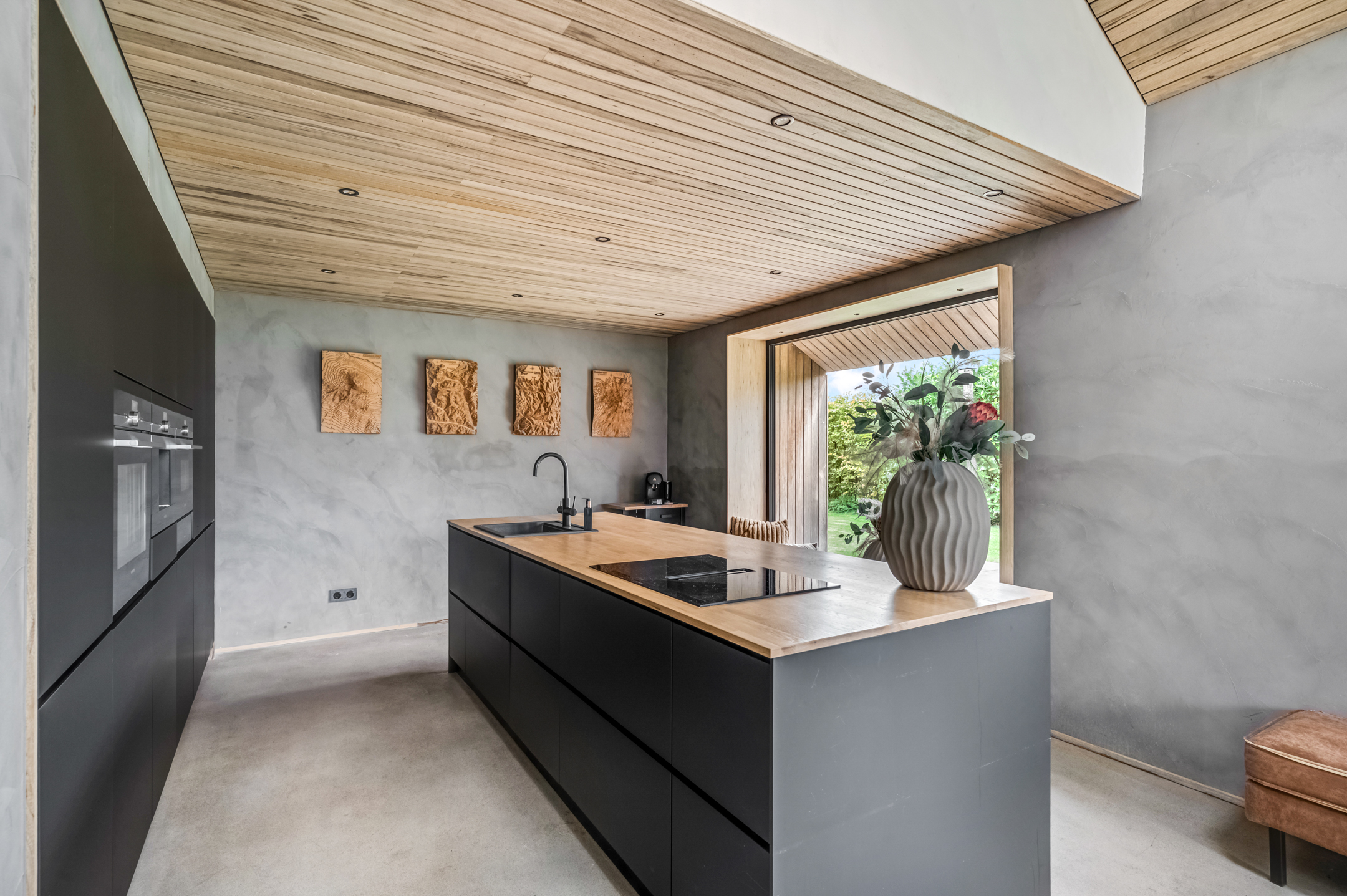 Via de royale oprit, met ruimte voor meerdere auto’s, bereik je de voordeur. Bij binnenkomst in de hal vind je de toiletruimte, meterkast (incl. waterontharder en krachtstroomaansluiting), garderobe en de deur naar de living. Dankzij de grote raampartijen en twee dakramen met geautomatiseerde Velux screens is de woonkamer licht, open en sfeervol. De bio-ethanolhaard zorgt voor extra warmte en ambiance, terwijl de betonlook vloer een moderne, stijlvolle basis vormt. De wanden, afgewerkt met exclusieve Beal Mortex, bieden een strakke, luxe uitstraling en zijn zeer onderhoudsvriendelijk. De ruime opzet biedt volop mogelijkheden voor verschillende meubelopstellingen.