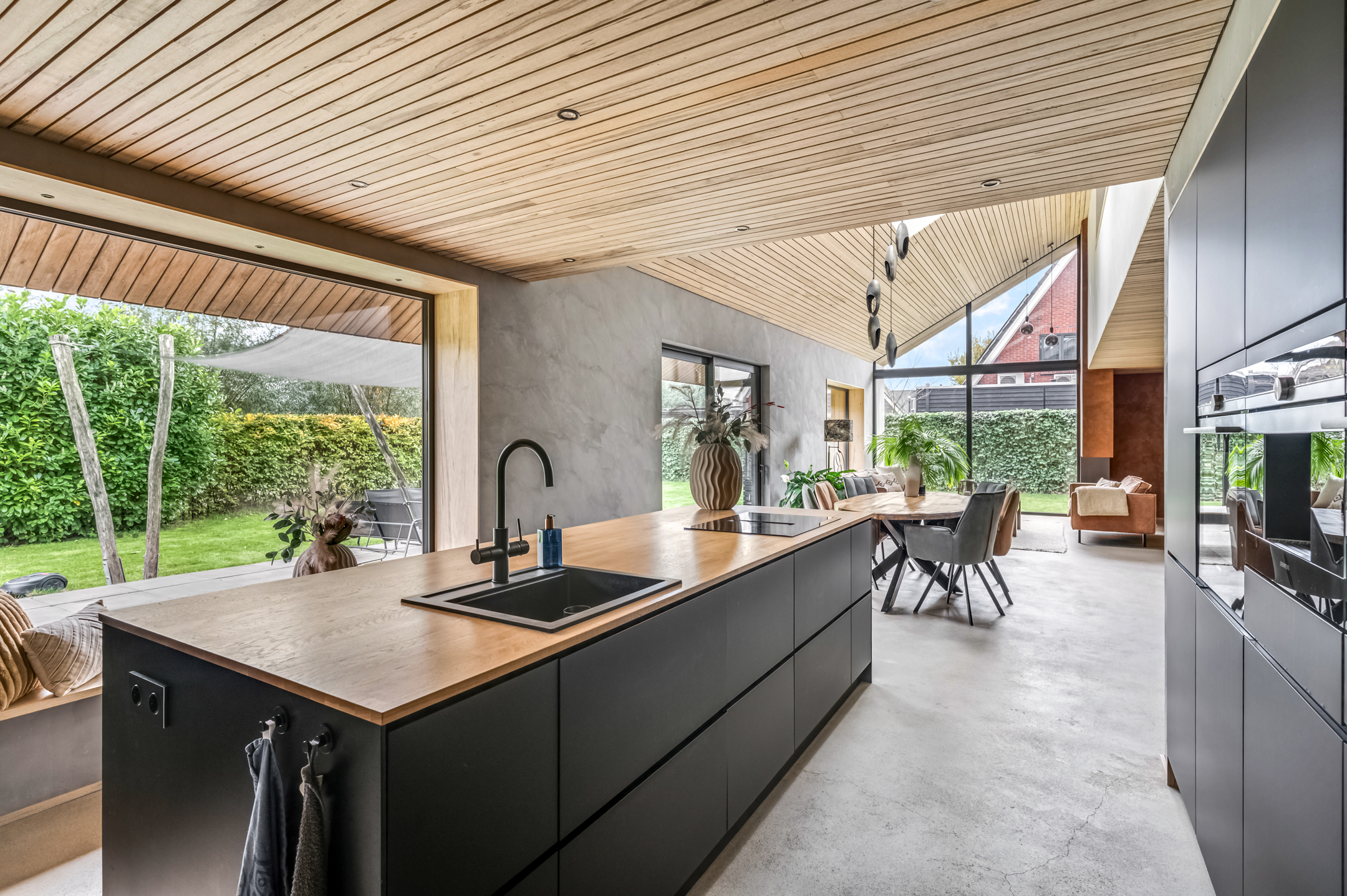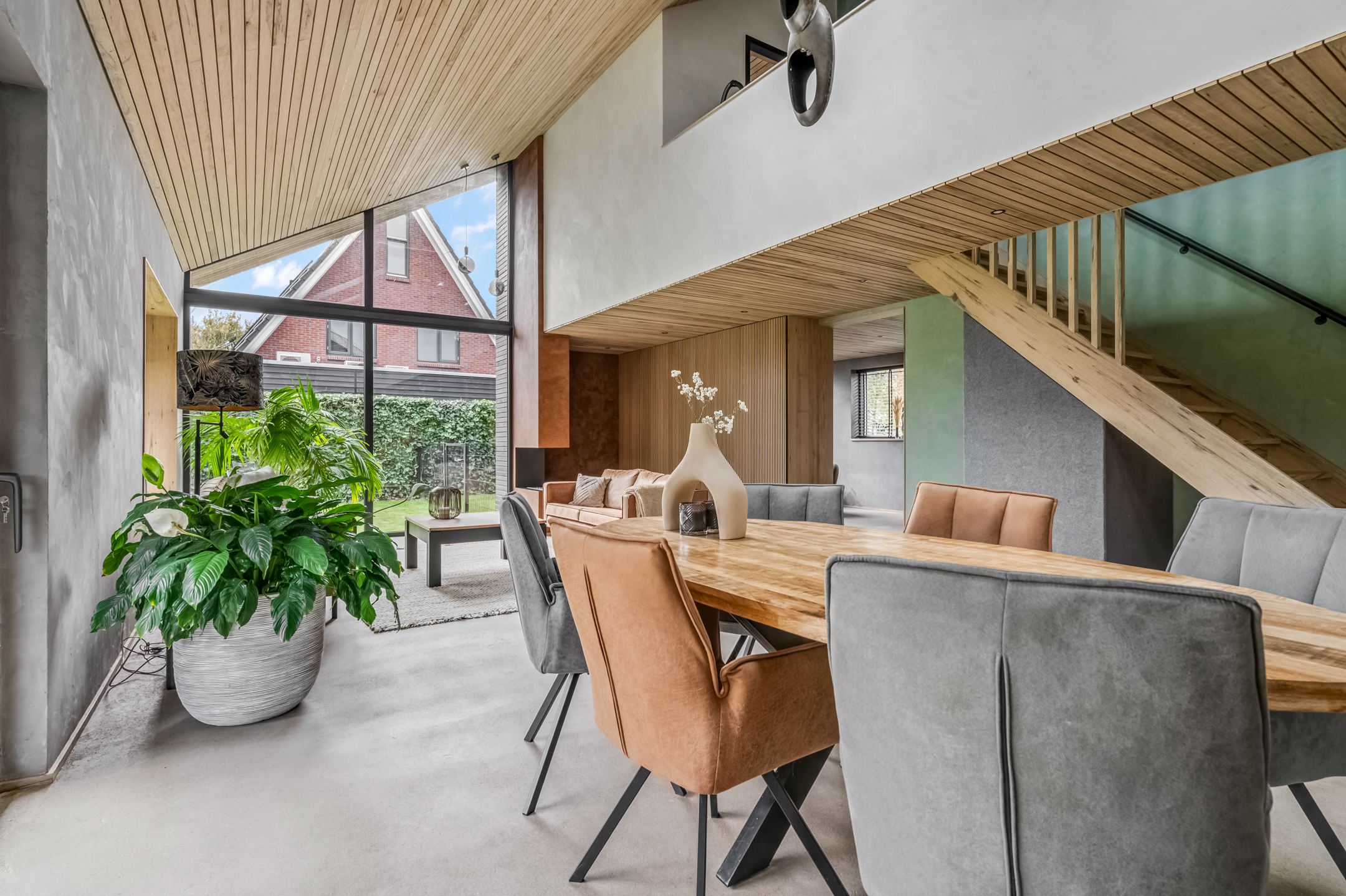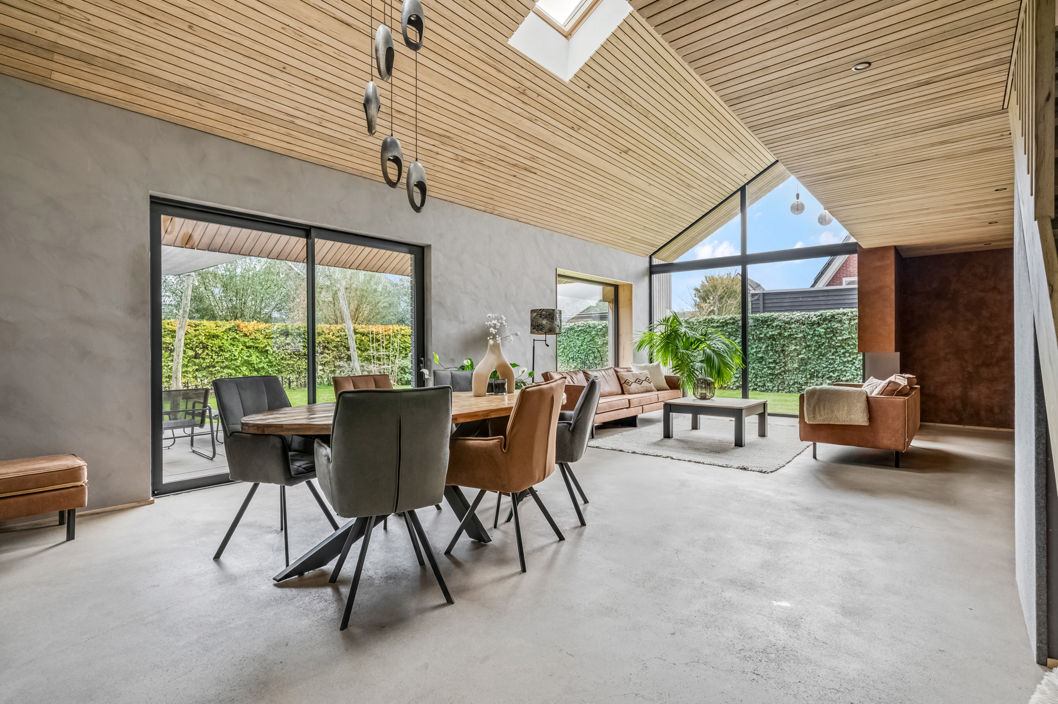 Centraal in de woning bevindt zich de eetkamer, met voldoende ruimte voor een grote eettafel. Dankzij de schuifpui naar de tuin geniet je hier optimaal van de zonnige ligging en het buitenleven.