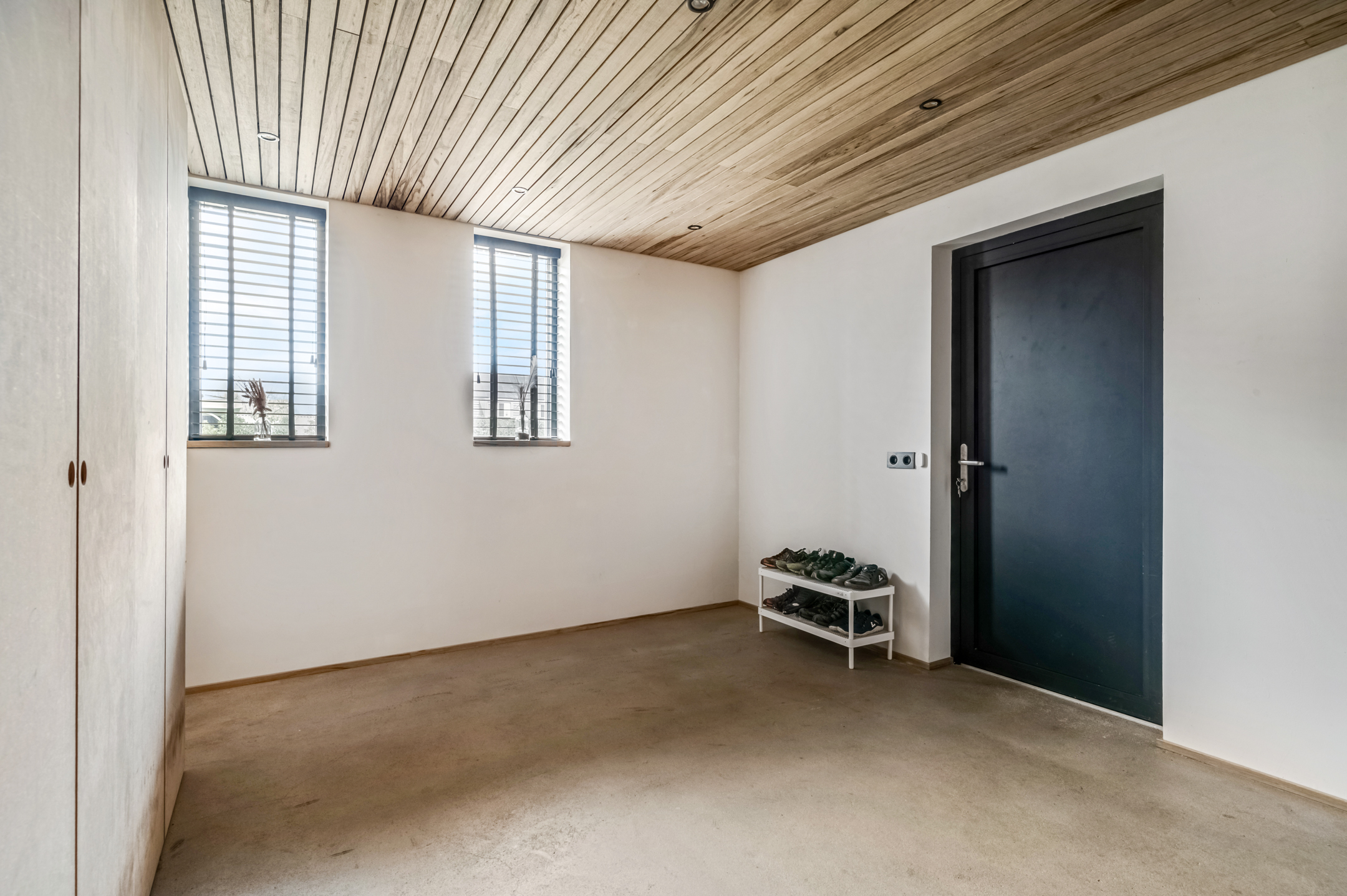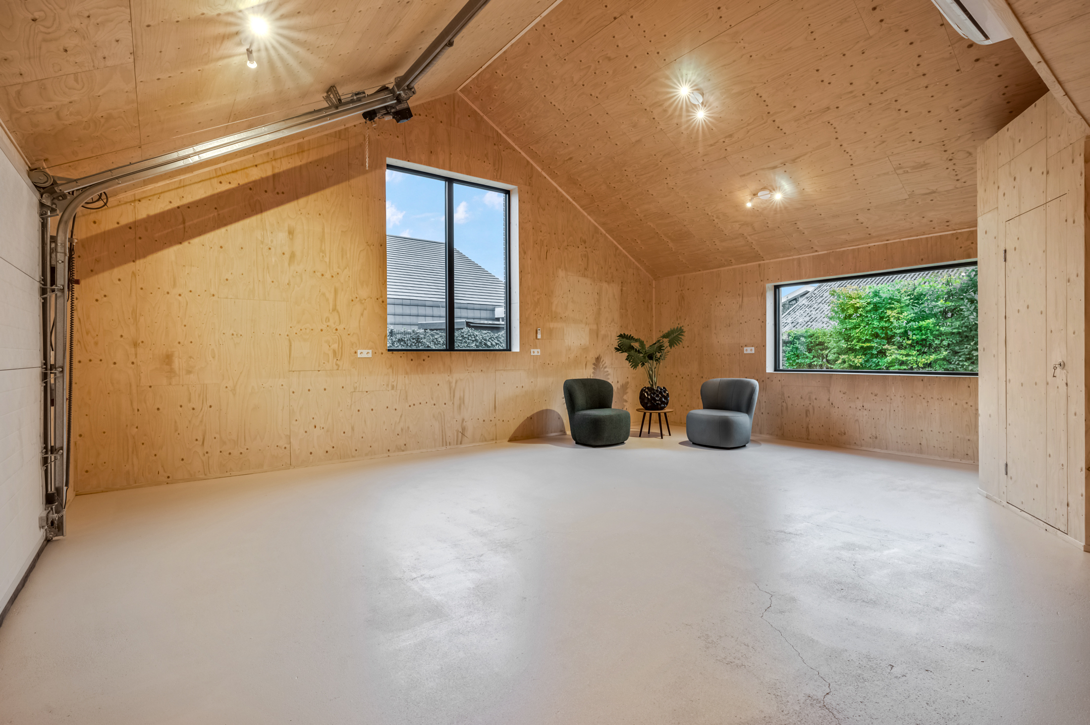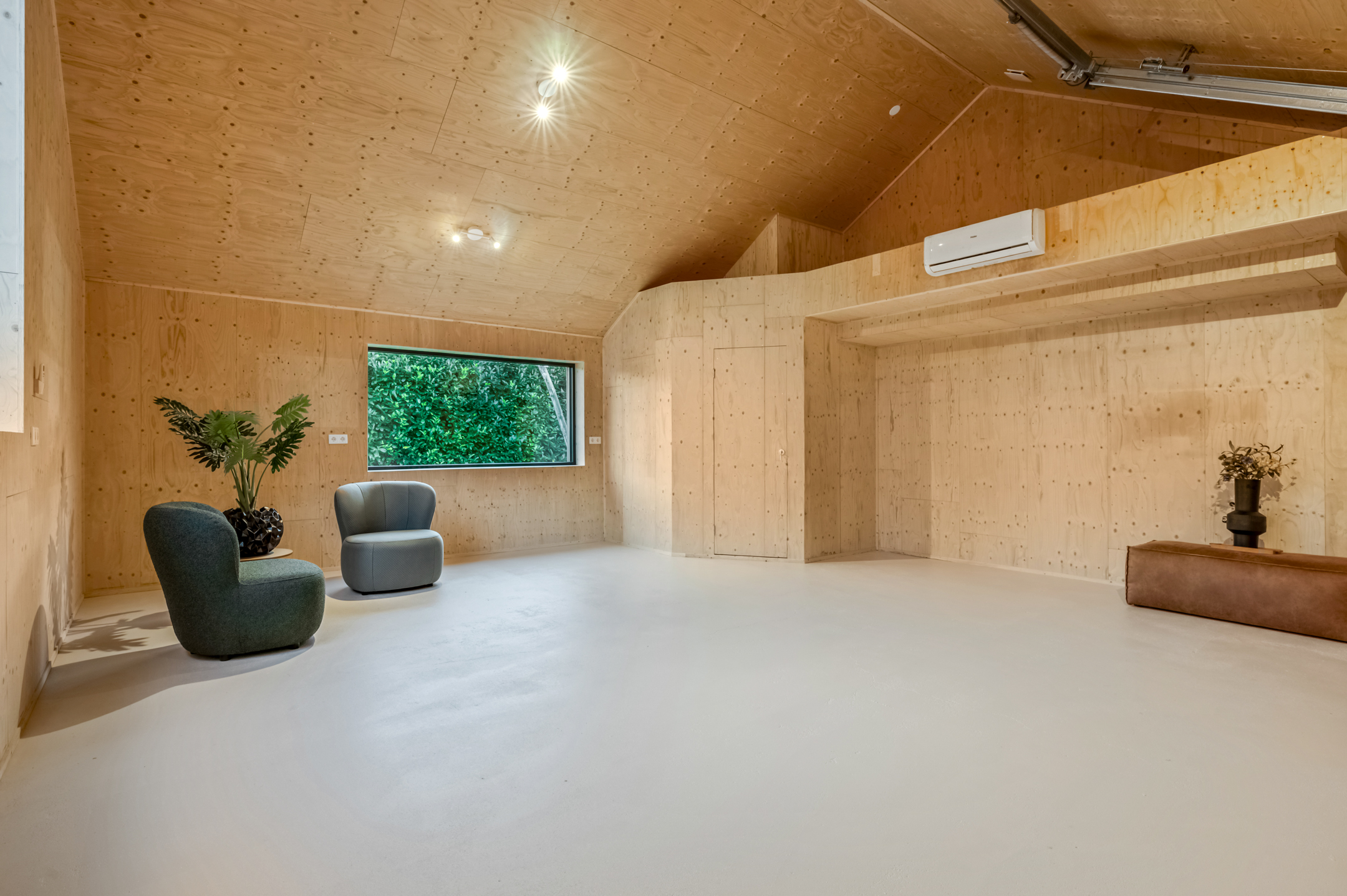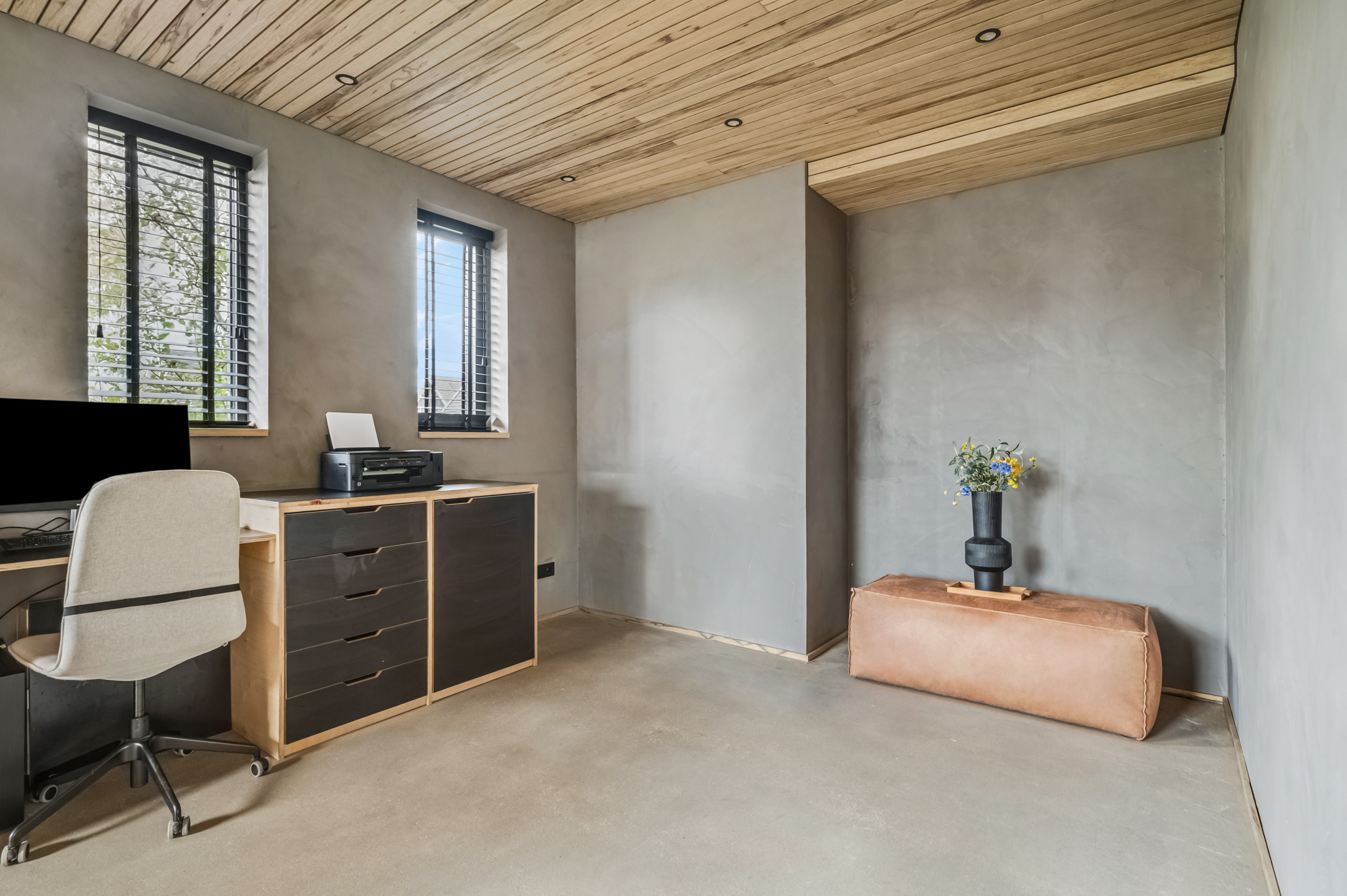 Aan de voorzijde van de woning bevindt zich een extra ruimte. Deze royale kamer wordt momenteel gebruikt als kantoor- en sportruimte, maar is dusdanig voorbereid dat je er eenvoudig een extra slaapkamer met badkamer van kunt maken (ideaal voor levensloopbestendig wonen). Via de living bereik je de bijkeuken, een ruime plek voor al je opbergspullen. Vanuit de bijkeuken is tevens de multifunctionele werkruimte toegankelijk. Deze ruimte is voorzien van dezelfde hoogwaardige isolatie en ventilatie als de woning, is bereikbaar via de berging of een aparte buitendeur, en blijft met een oppervlakte van net onder de 50 m² binnen de gemeentelijke vergunningsvrije norm voor een aan huis gebonden beroep of kleinschalige bedrijvigheid. Dit maakt het een ideale locatie voor de zelfstandige professional of ondernemer. Plaats je hier een mooie glazen pui, dan is dit de extra werkruimte, atelier, tweede woonunit of speelkamer met volop daglicht die je zoekt!
