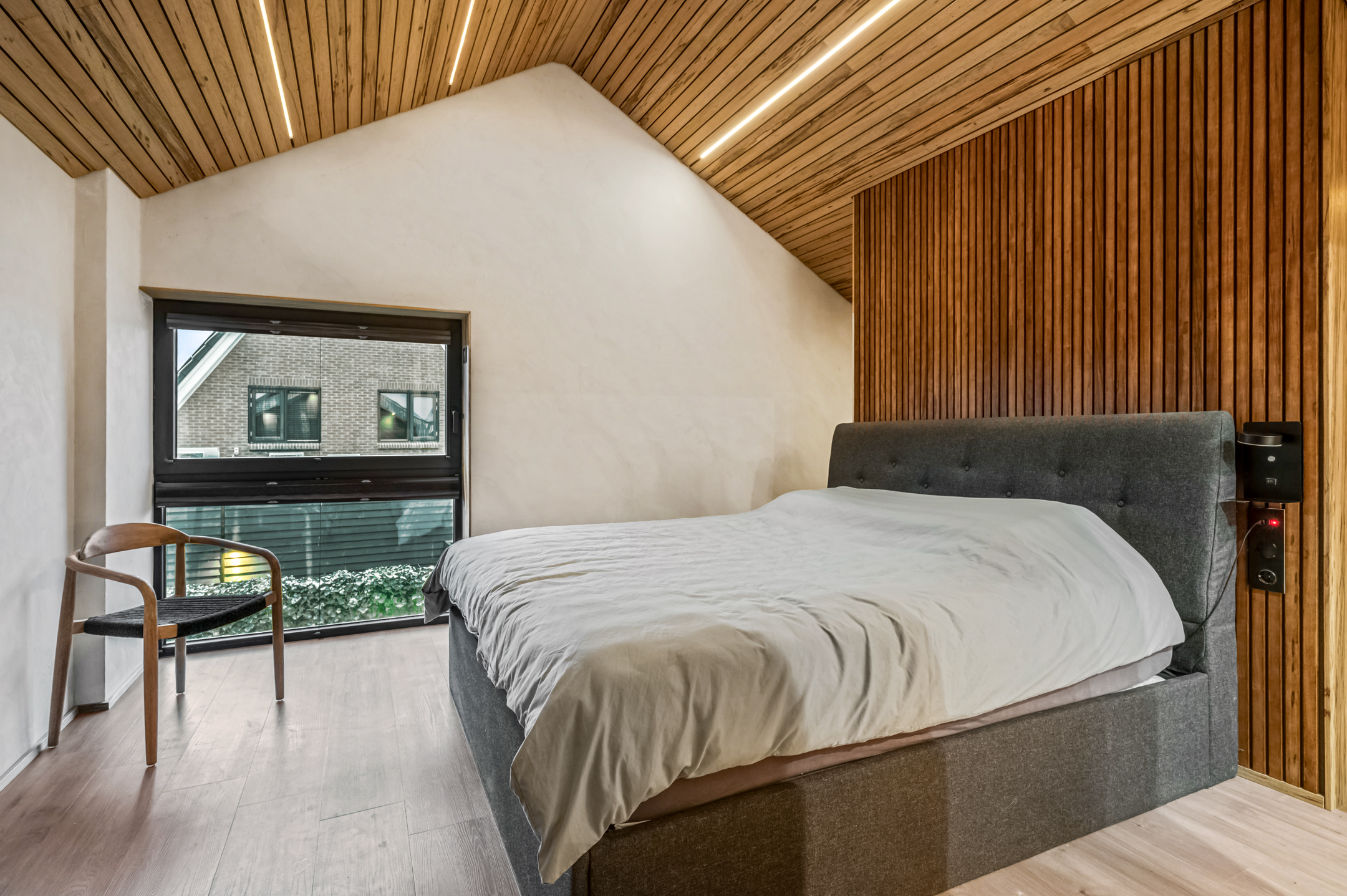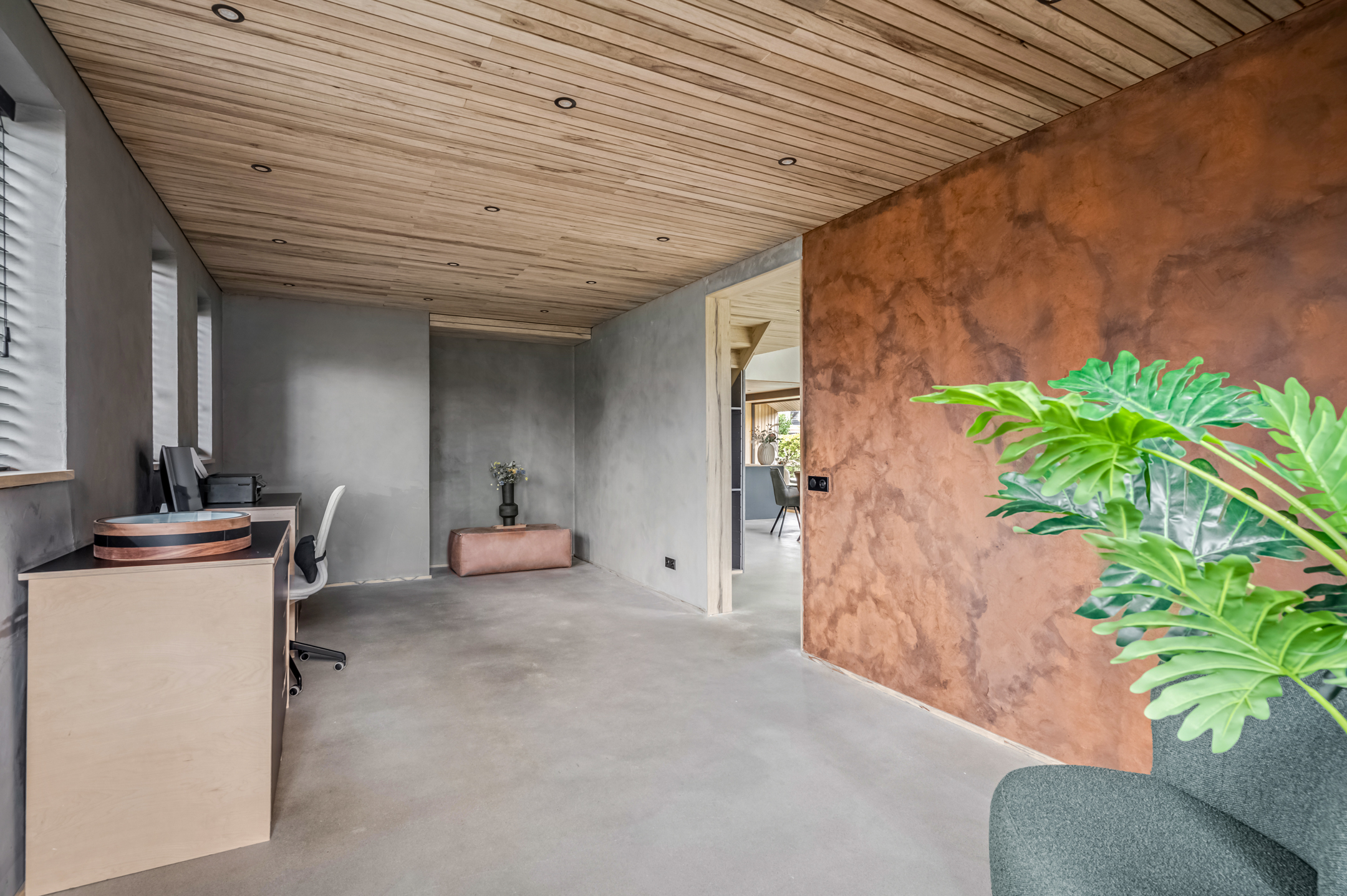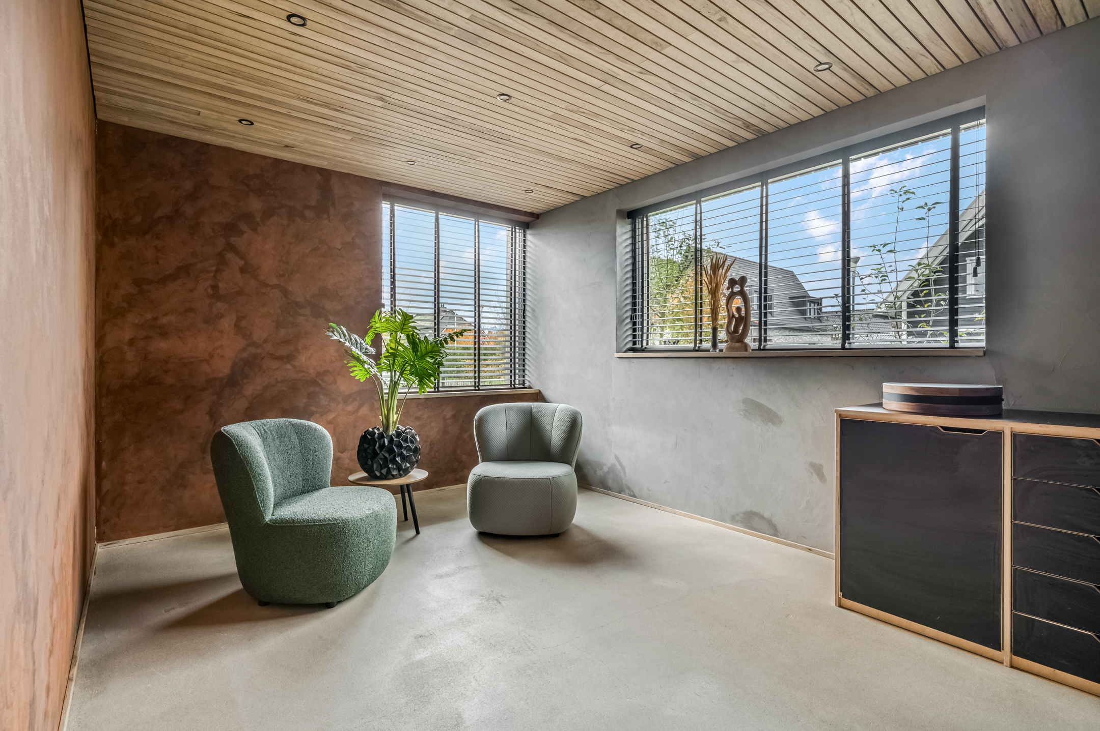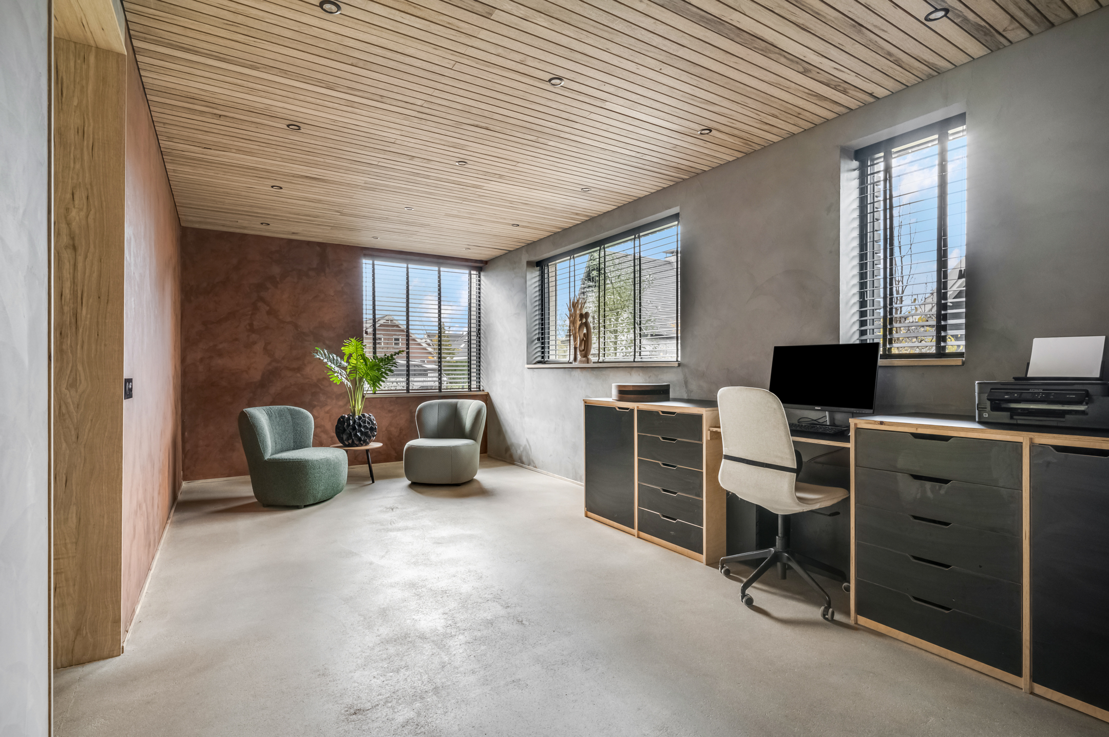 Aan de voorzijde van de woning bevindt zich een extra ruimte. Deze royale kamer wordt momenteel gebruikt als kantoor- en sportruimte, maar is dusdanig voorbereid dat je er eenvoudig een extra slaapkamer met badkamer van kunt maken (ideaal voor levensloopbestendig wonen). Via de living bereik je de bijkeuken, een ruime plek voor al je opbergspullen. Vanuit de bijkeuken is tevens de multifunctionele werkruimte toegankelijk. Deze ruimte is voorzien van dezelfde hoogwaardige isolatie en ventilatie als de woning, is bereikbaar via de berging of een aparte buitendeur, en blijft met een oppervlakte van net onder de 50 m² binnen de gemeentelijke vergunningsvrije norm voor een aan huis gebonden beroep of kleinschalige bedrijvigheid. Dit maakt het een ideale locatie voor de zelfstandige professional of ondernemer. Plaats je hier een mooie glazen pui, dan is dit de extra werkruimte, atelier, tweede woonunit of speelkamer met volop daglicht die je zoekt!