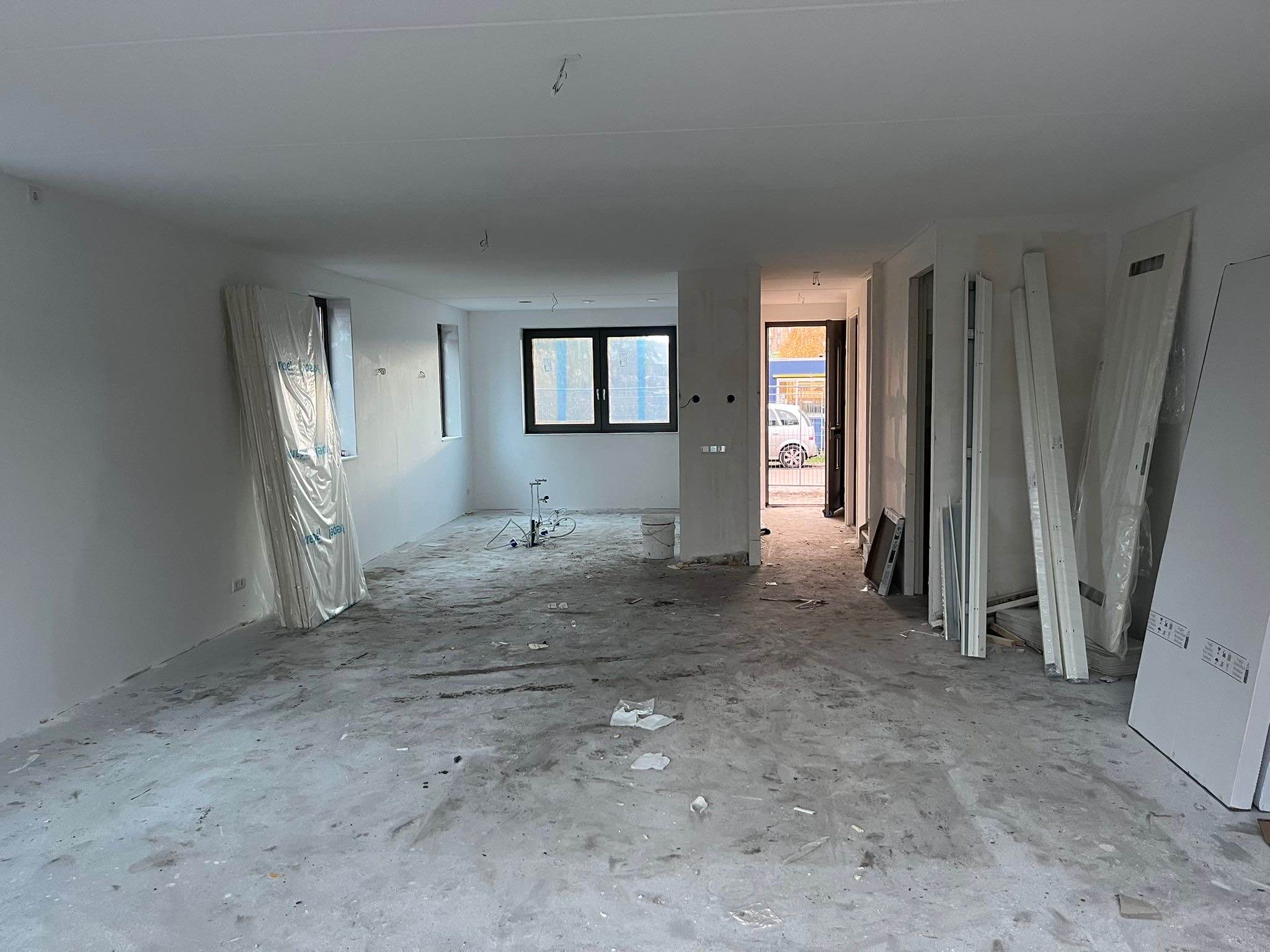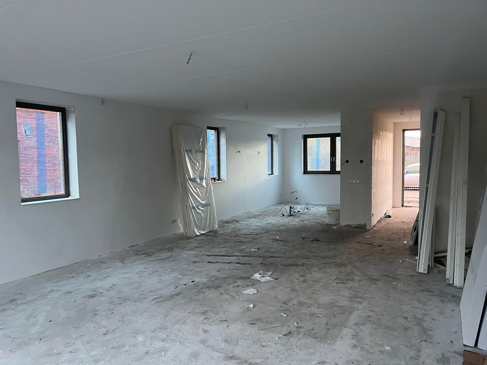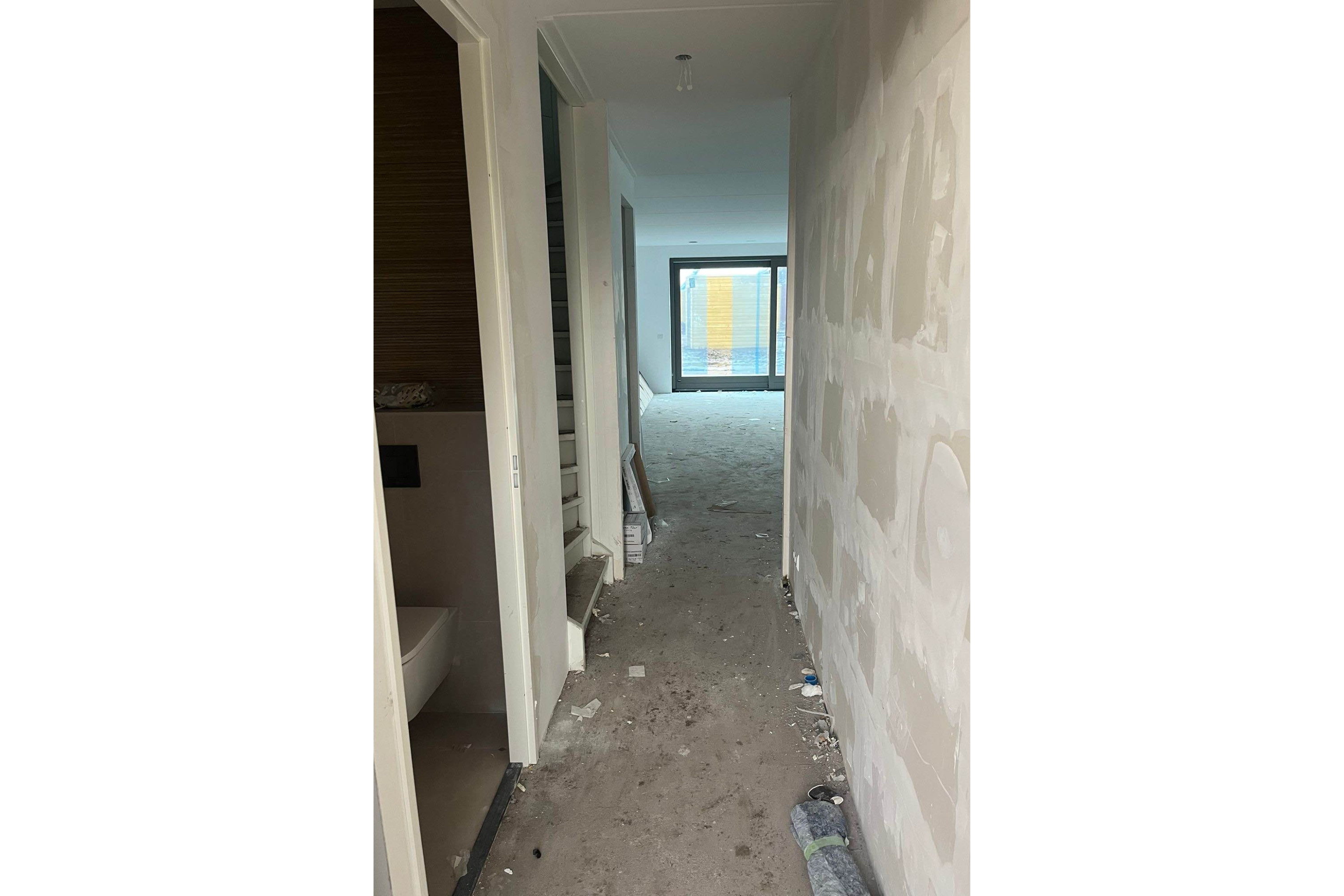 Binnen geniet je van een ruime woonkamer, een moderne keuken, vier slaapkamers, een complete badkamer en een grote zolder met extra ramen en vloerverwarming. Alles wordt strak afgewerkt: renovliesbehang, PVC-vloeren (kleur Sisal) inclusief plinten en witte zolderplaten zijn al geregeld. Op de begane grond is gekozen voor een visgraatpatroon, wat zorgt voor een luxe uitstraling. De verdiepingen krijgen een rechte plankvloer in dezelfde kleur, wat zorgt voor een rustig en stijlvol geheel. De keuken, badkamer en toiletten zijn uitgezocht bij Huysinc. Kwaliteit en stijl in één.