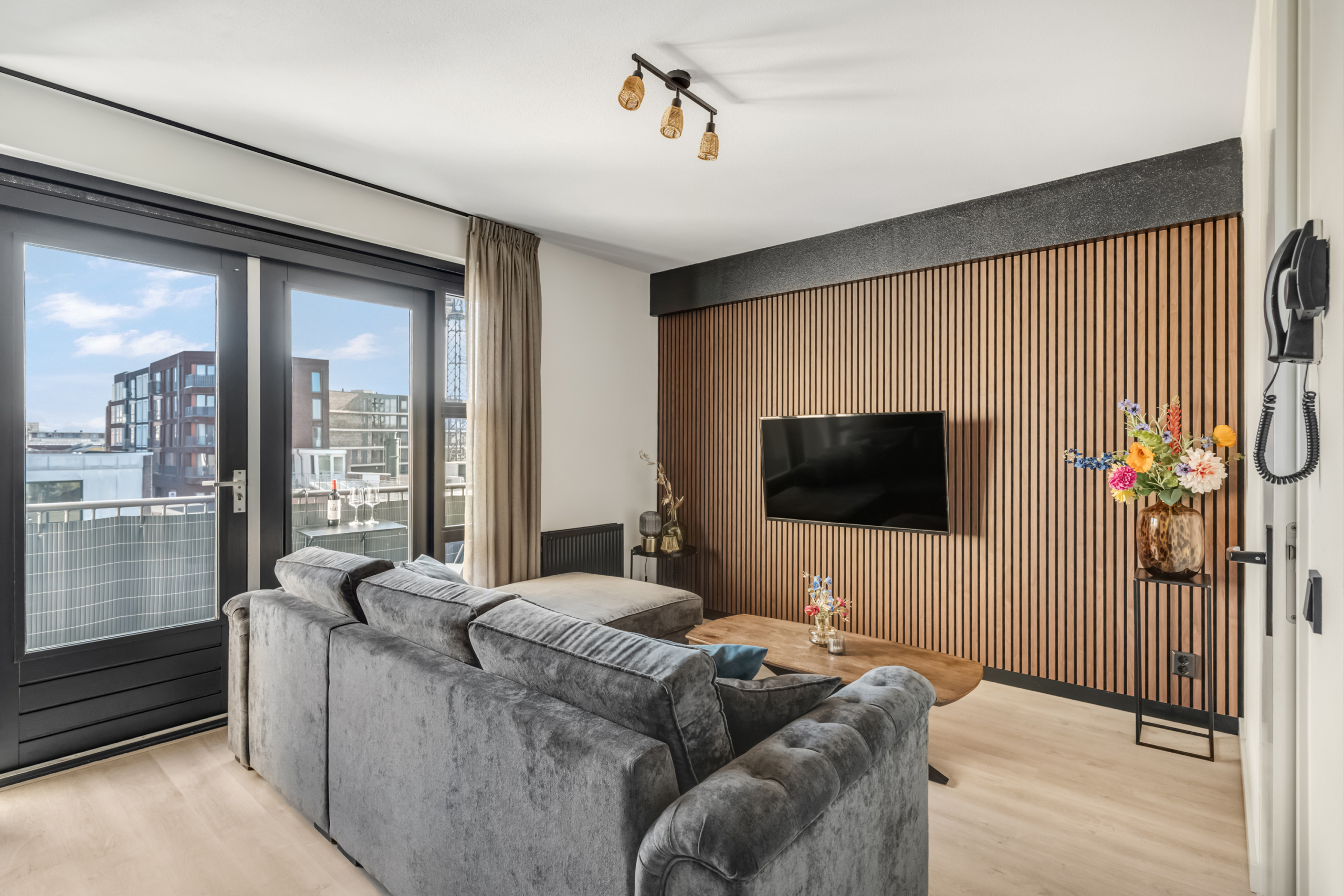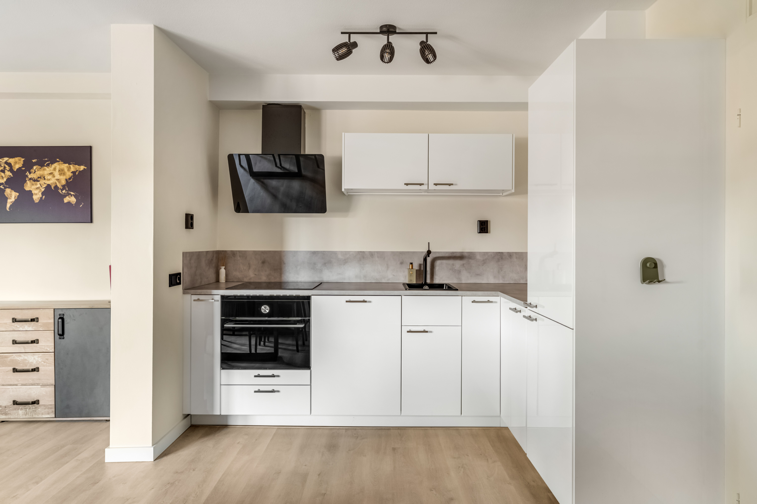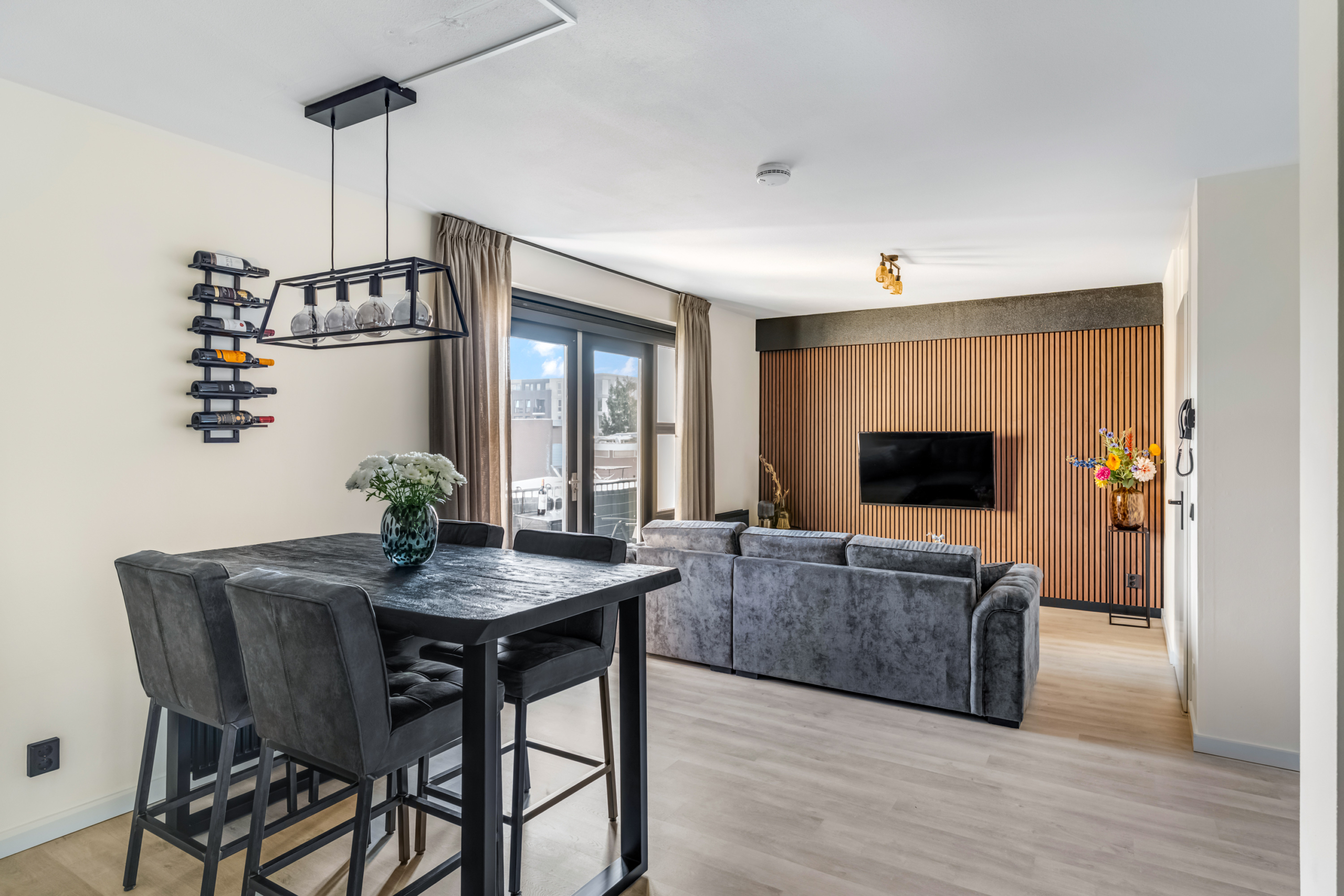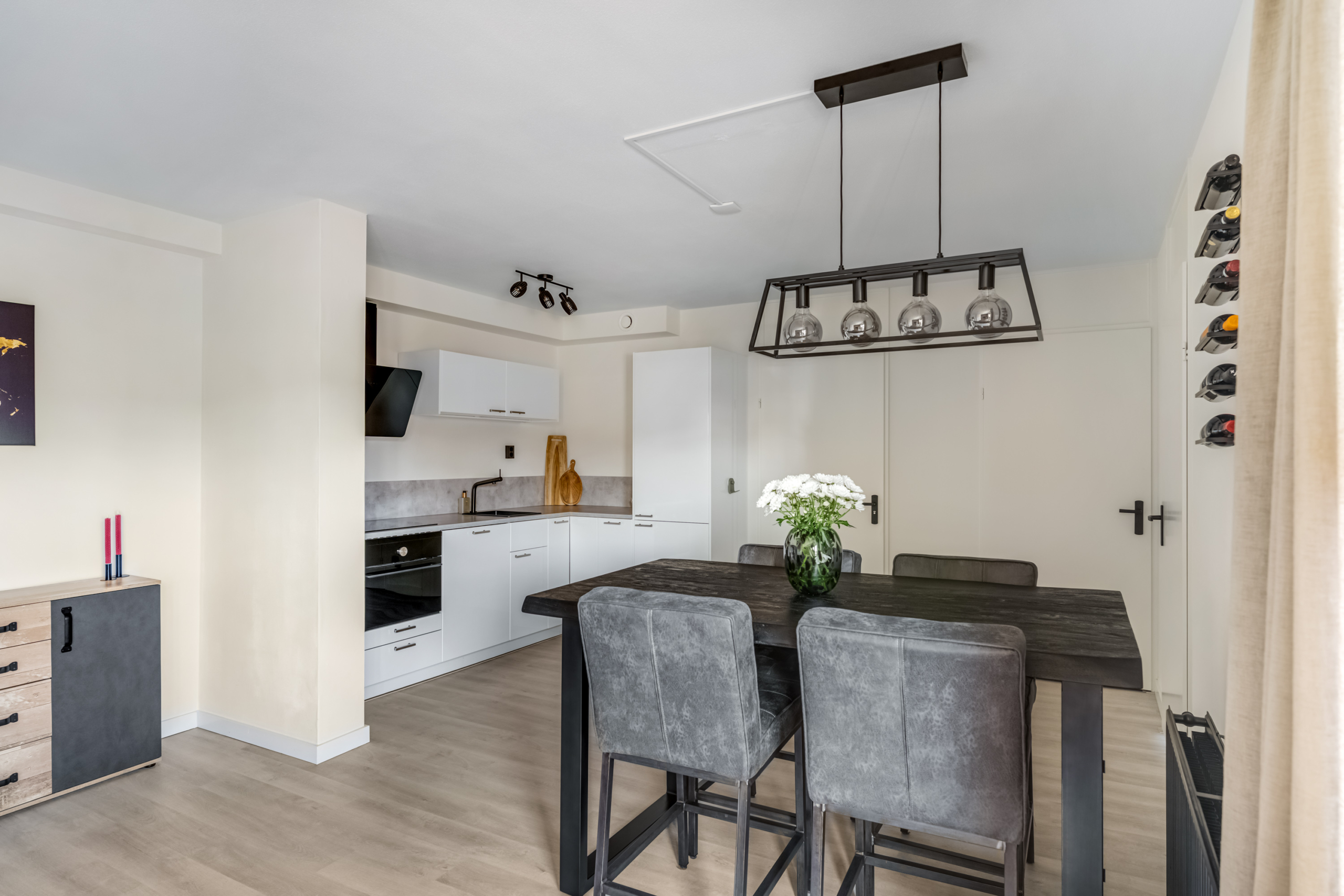 De lichte woonkamer vormt het hart van de woning. Dankzij de grote raampartijen geniet je hier van een prettige lichtinval en een fijne sfeer. De woonkamer staat in directe verbinding met de luxe open keuken, wat zorgt voor een ruimtelijk en modern geheel. De keuken is uitgevoerd in een eigentijdse stijl en voorzien van diverse inbouwapparatuur, waardoor koken hier een waar plezier wordt. Er is voldoende ruimte voor het plaatsen van een gezellige zithoek én een eethoek, perfect voor zowel ontspannen avonden als het ontvangen van gasten. Vanuit de woonkamer heb je direct toegang tot het balkon welke is gelegen op het zuidoosten, waardoor je hier heerlijk kunt genieten van de ochtend- en middagzon. Een fijne plek om de dag te beginnen met een kop koffie of om na het werk nog even buiten te ontspannen.