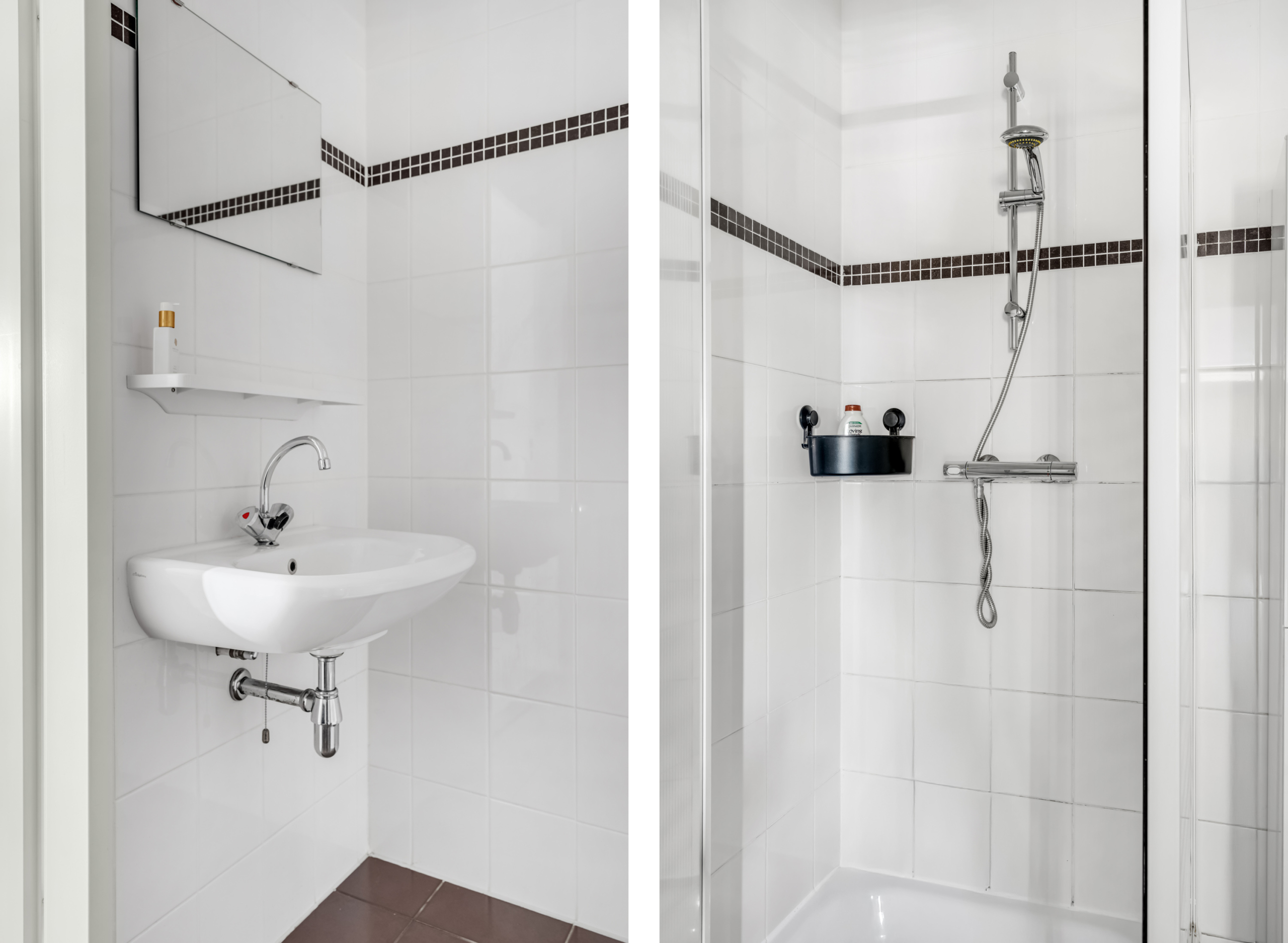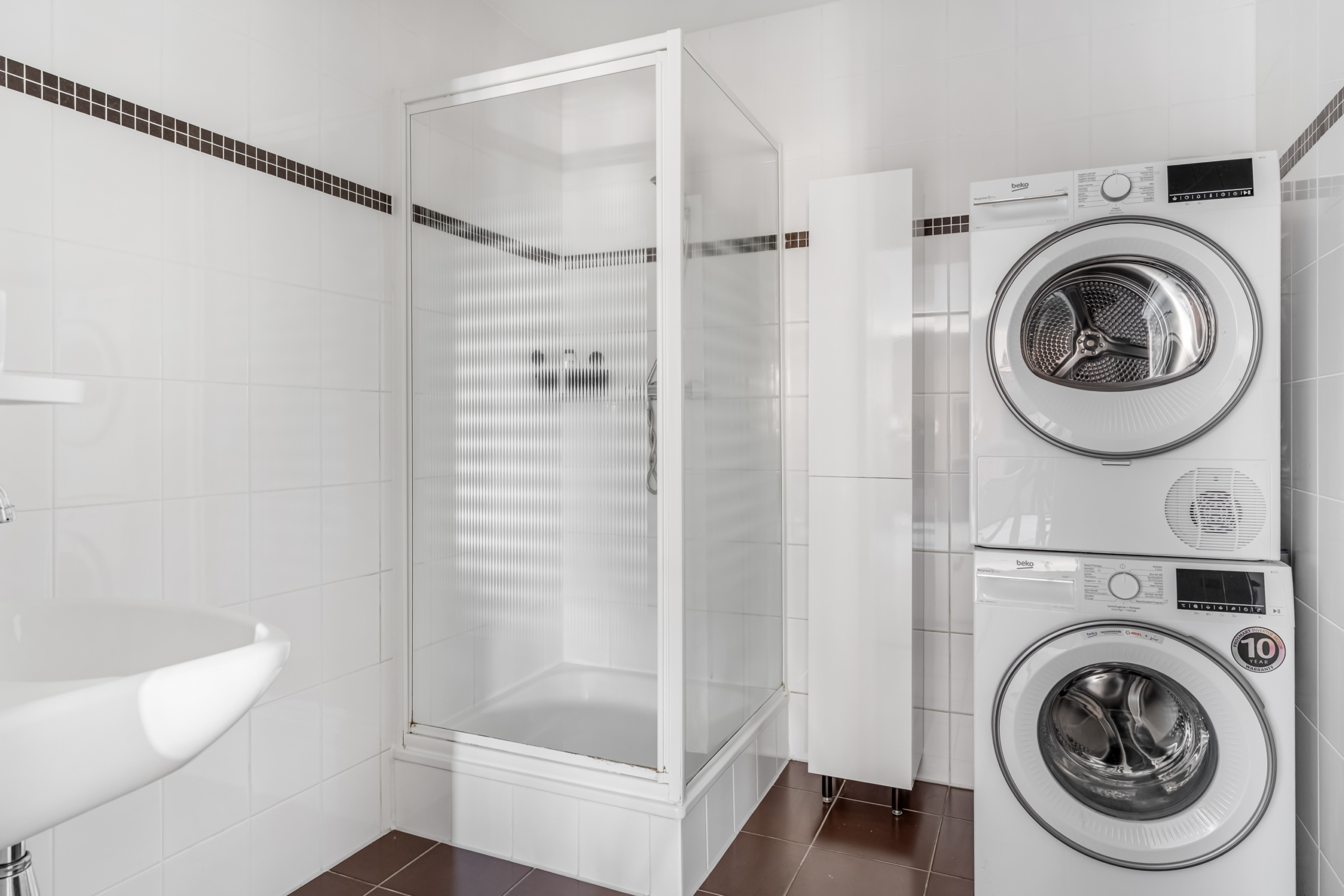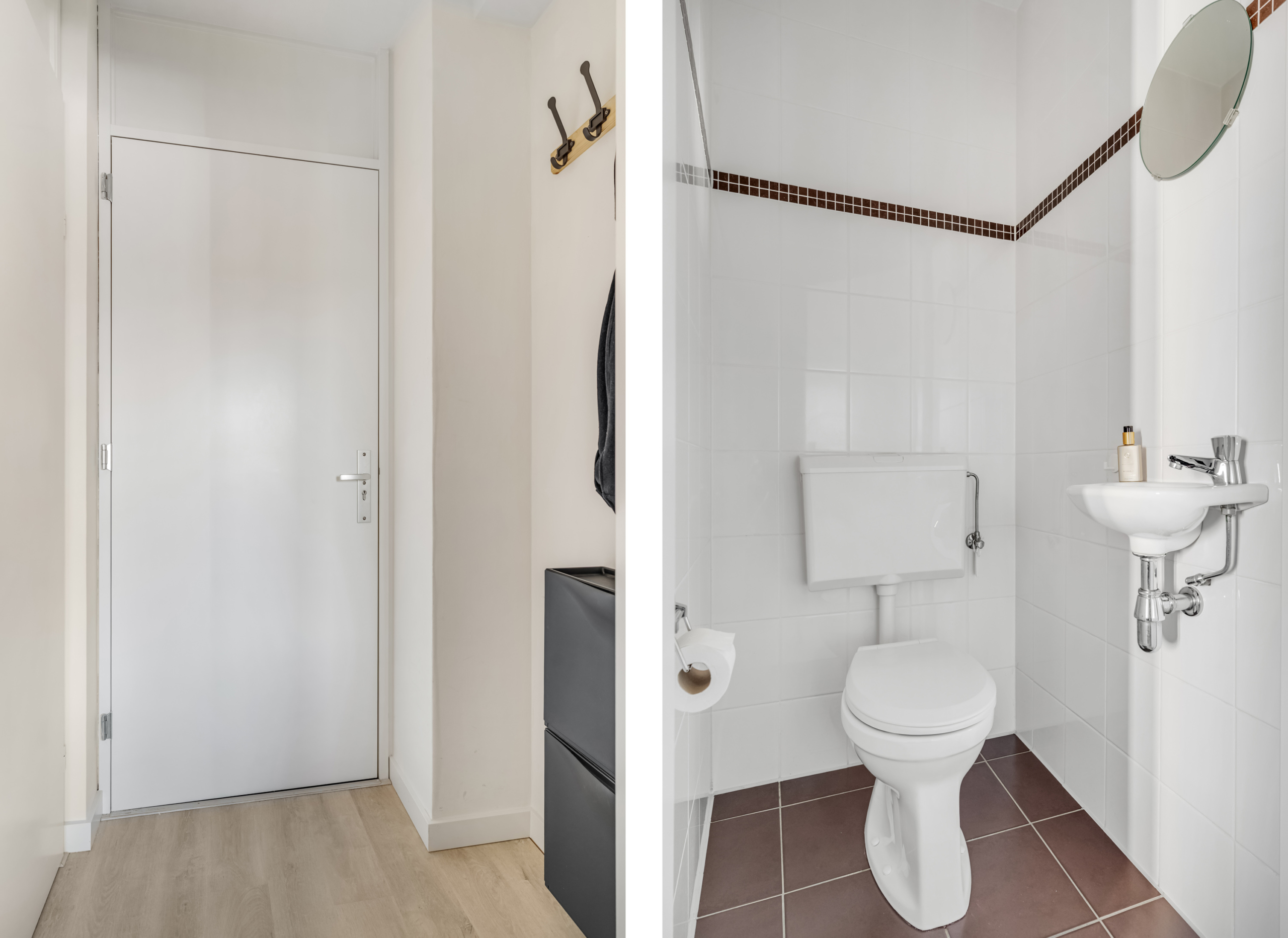 Bij binnenkomst in het appartement kom je in de hal, die toegang biedt tot de diverse vertrekken. Hier bevinden zich het separate toilet met fonteintje en de royale, modern uitgevoerde badkamer. De badkamer is ruim opgezet en compleet ingericht met een comfortabele douche, een stijlvol wastafelmeubel en de aansluitingen voor wasmachine en droger. Alles is praktisch en verzorgd afgewerkt.