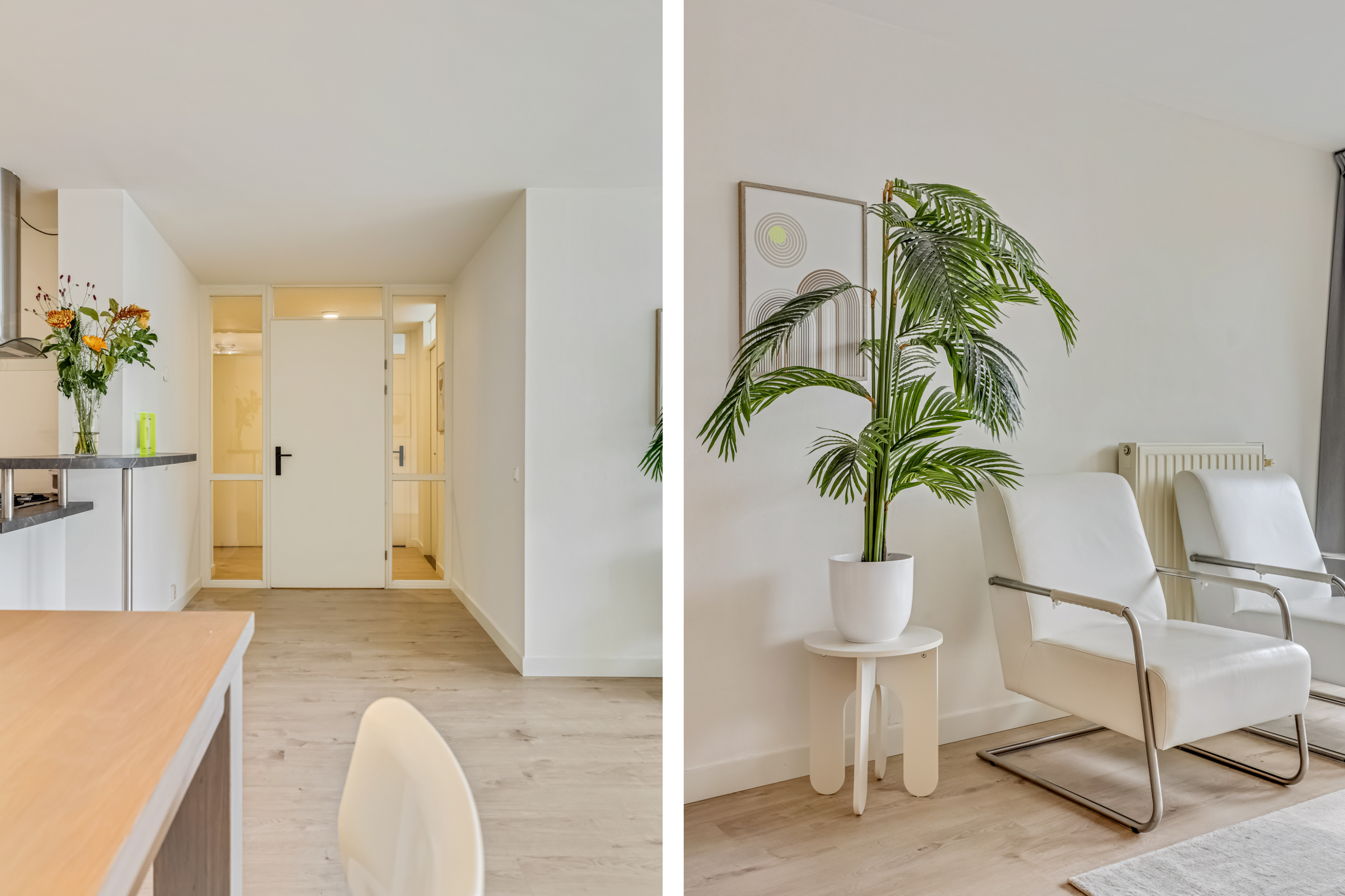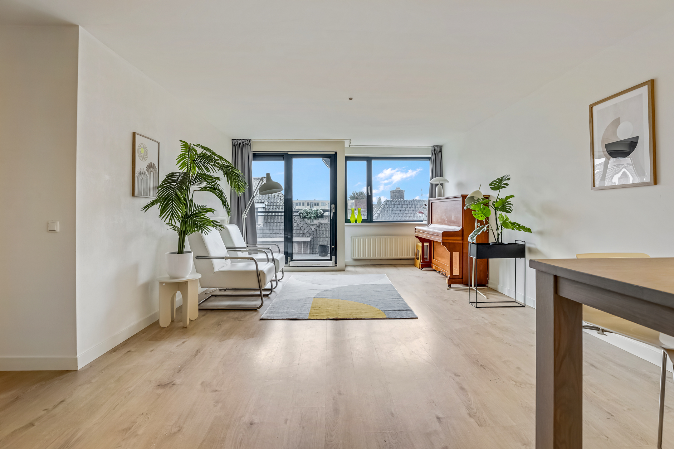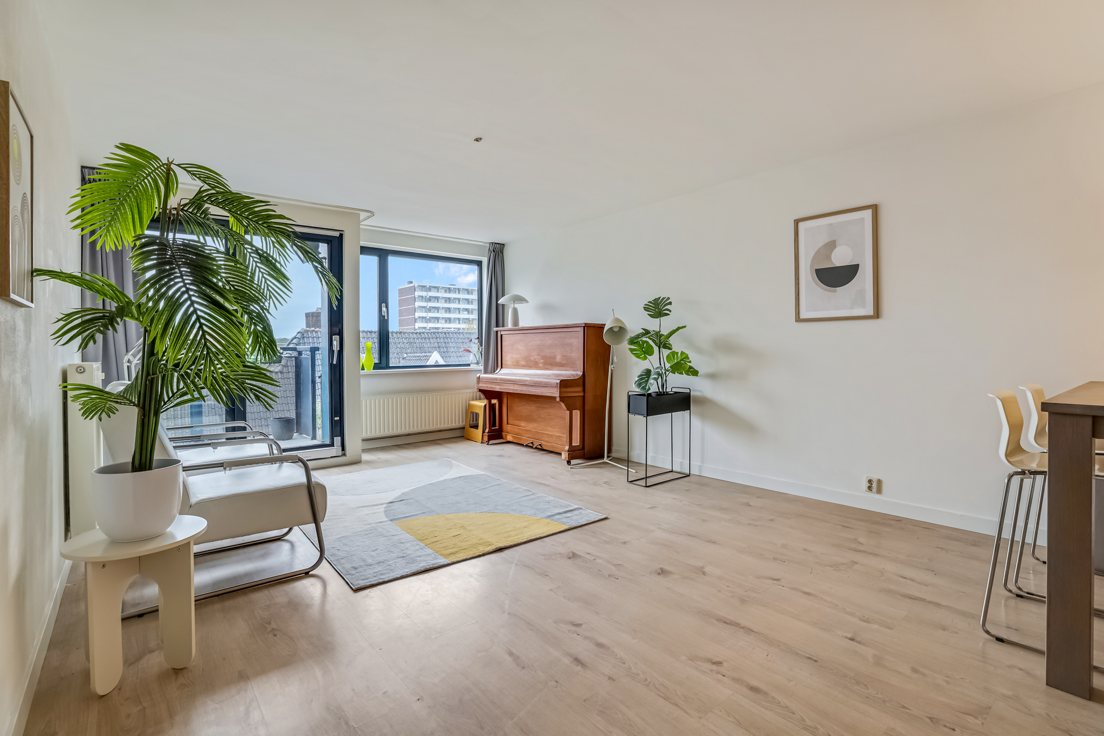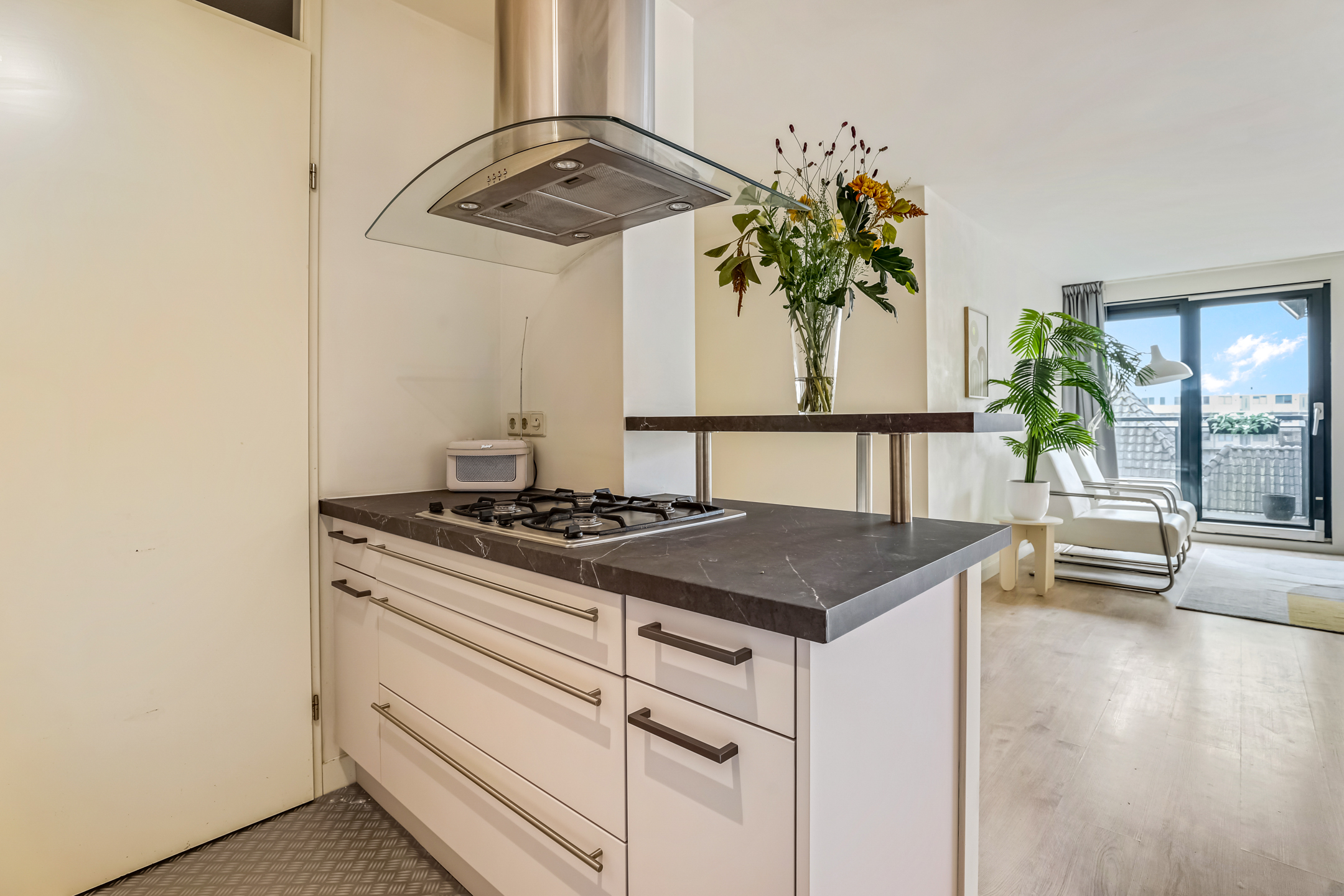 De laatste toegangsdeur in de hal brengt je naar de living. De lichte woonkamer met laminaatvloer en grote raampartijen voelt warm en uitnodigend aan. Hier is plek voor een heerlijk zit- en eethoek terwijl je wegkijkt over het centrum van Veenendaal. Vanuit de zithoek kom je via de schuifpui ook het balkon op. In de woonkamer is ook de keuken gesitueerd.