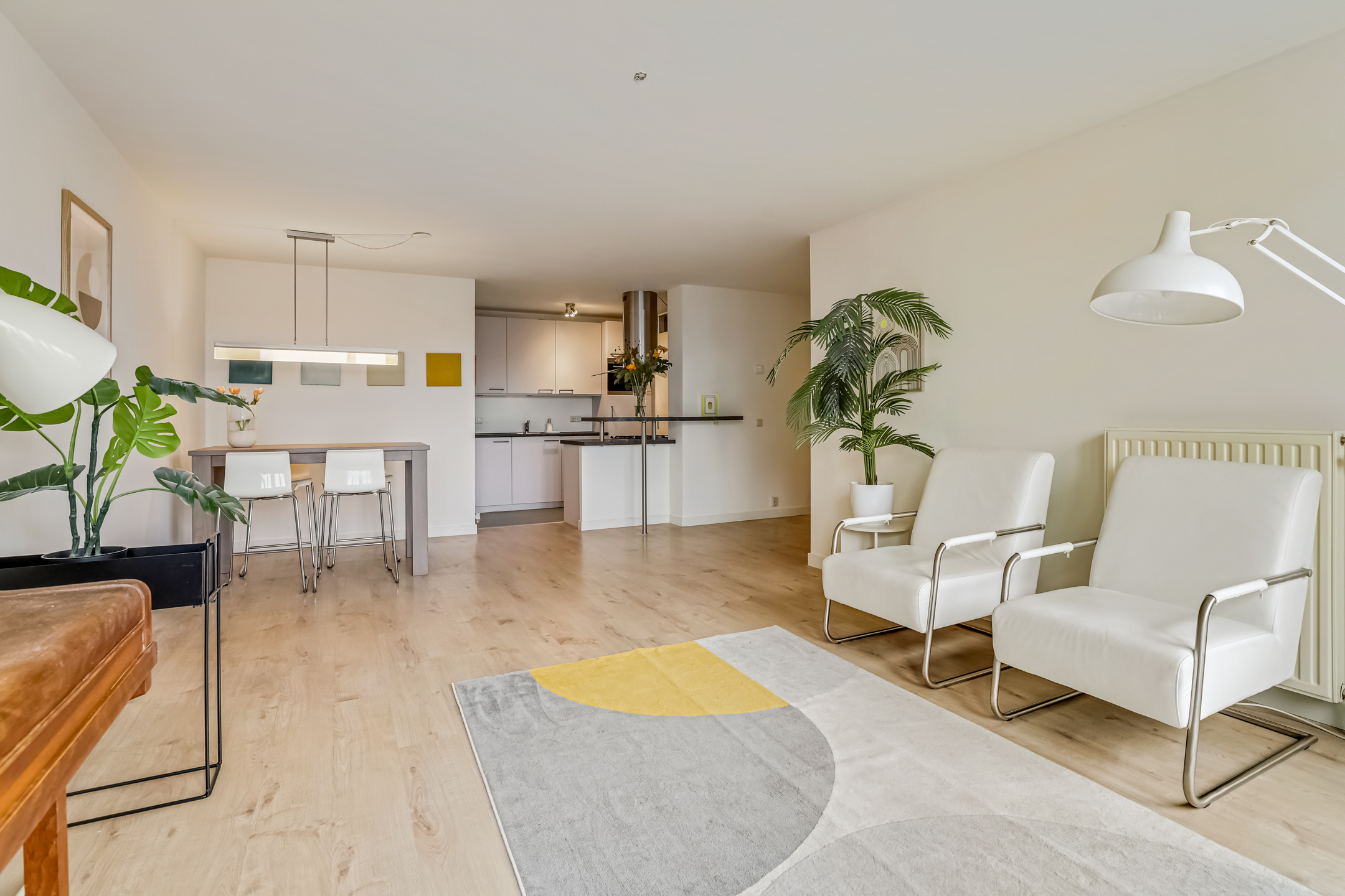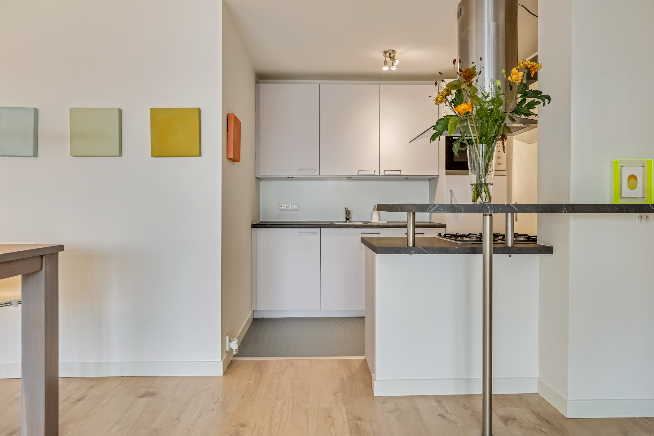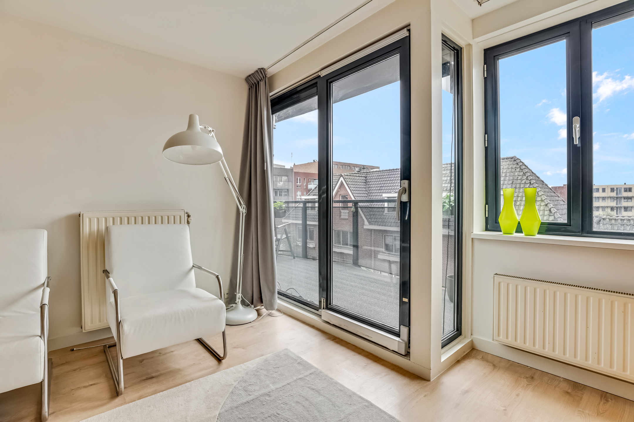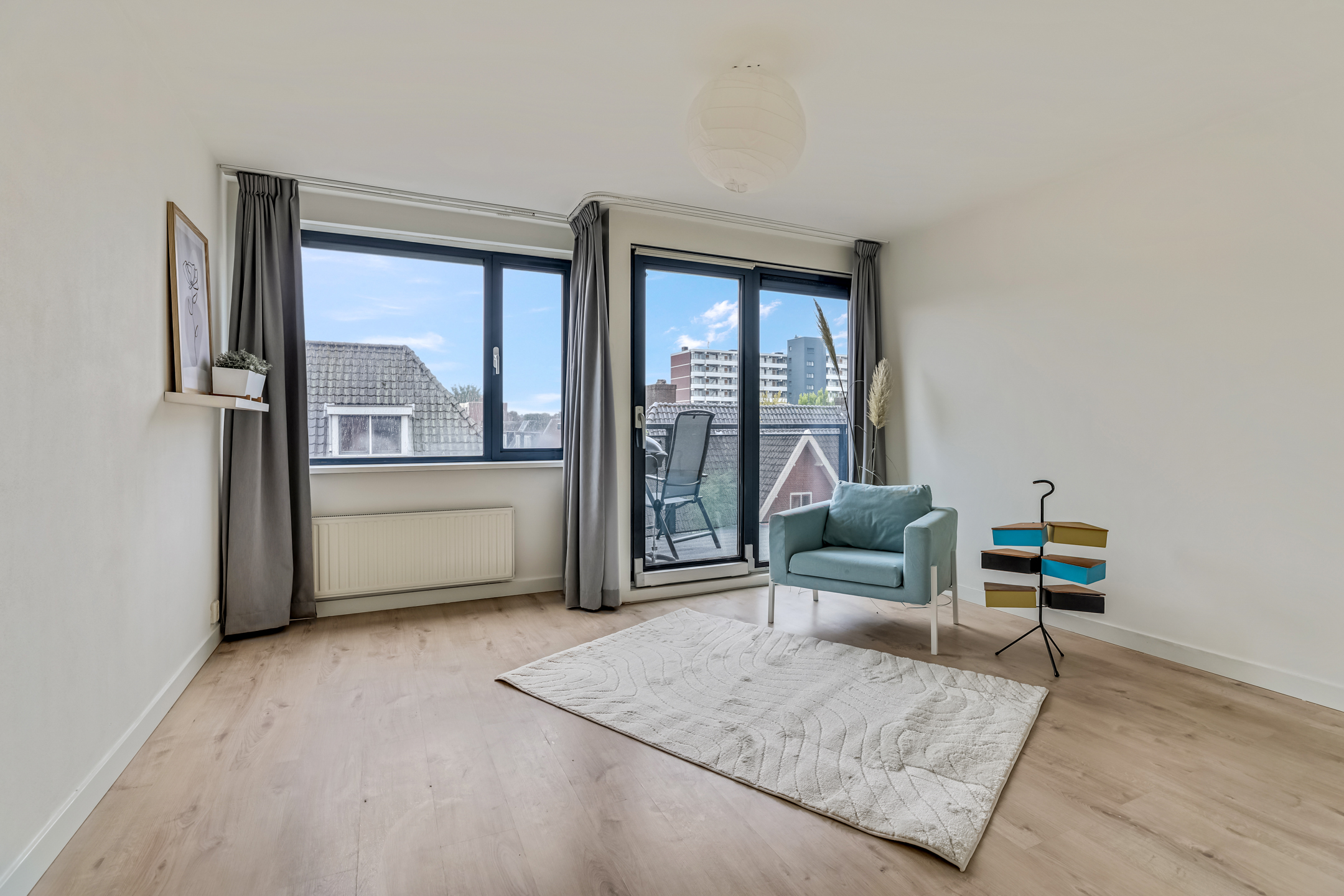 De laatste toegangsdeur in de hal brengt je naar de living. De lichte woonkamer met laminaatvloer en grote raampartijen voelt warm en uitnodigend aan. Hier is plek voor een heerlijk zit- en eethoek terwijl je wegkijkt over het centrum van Veenendaal. Vanuit de zithoek kom je via de schuifpui ook het balkon op. In de woonkamer is ook de keuken gesitueerd.