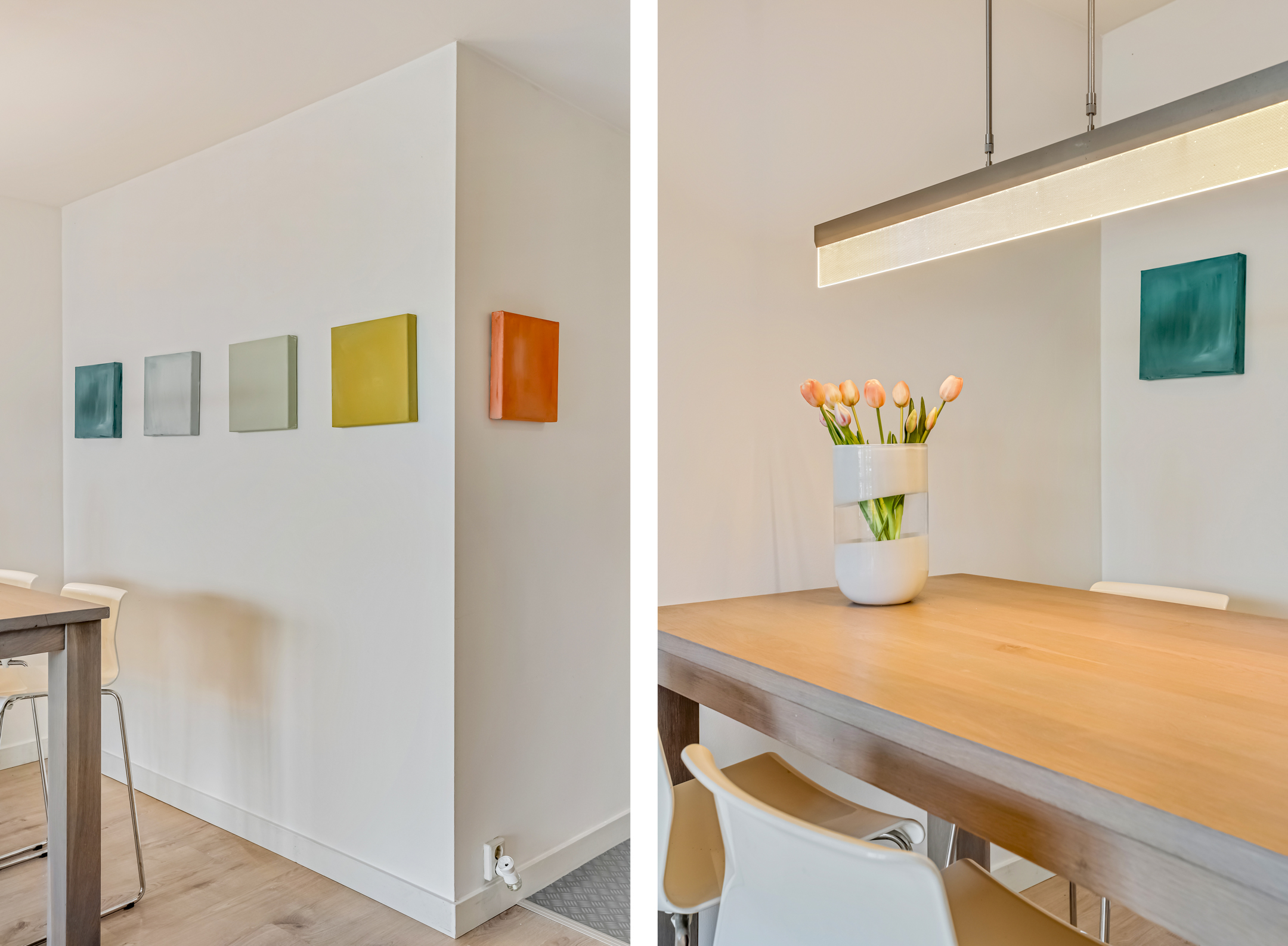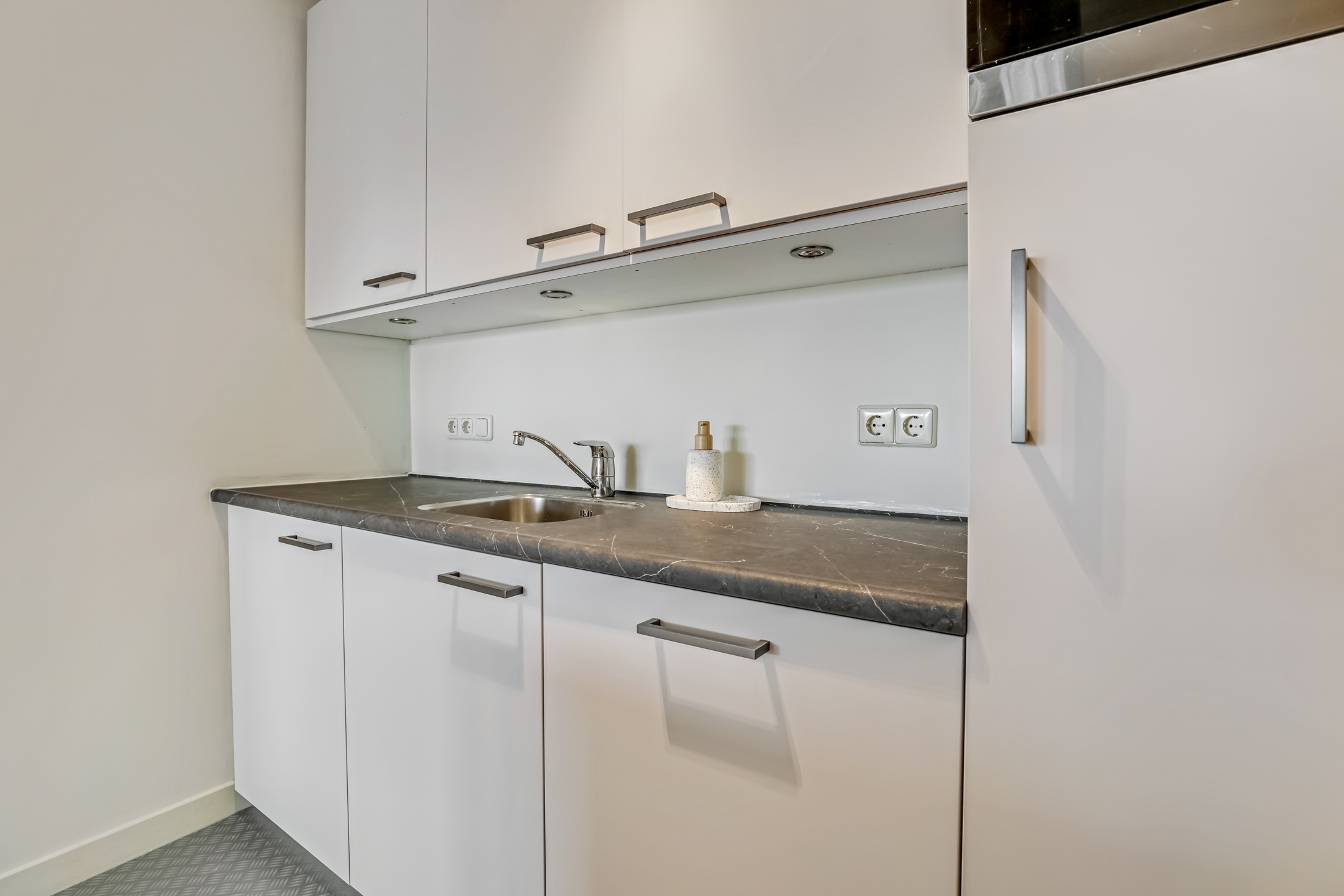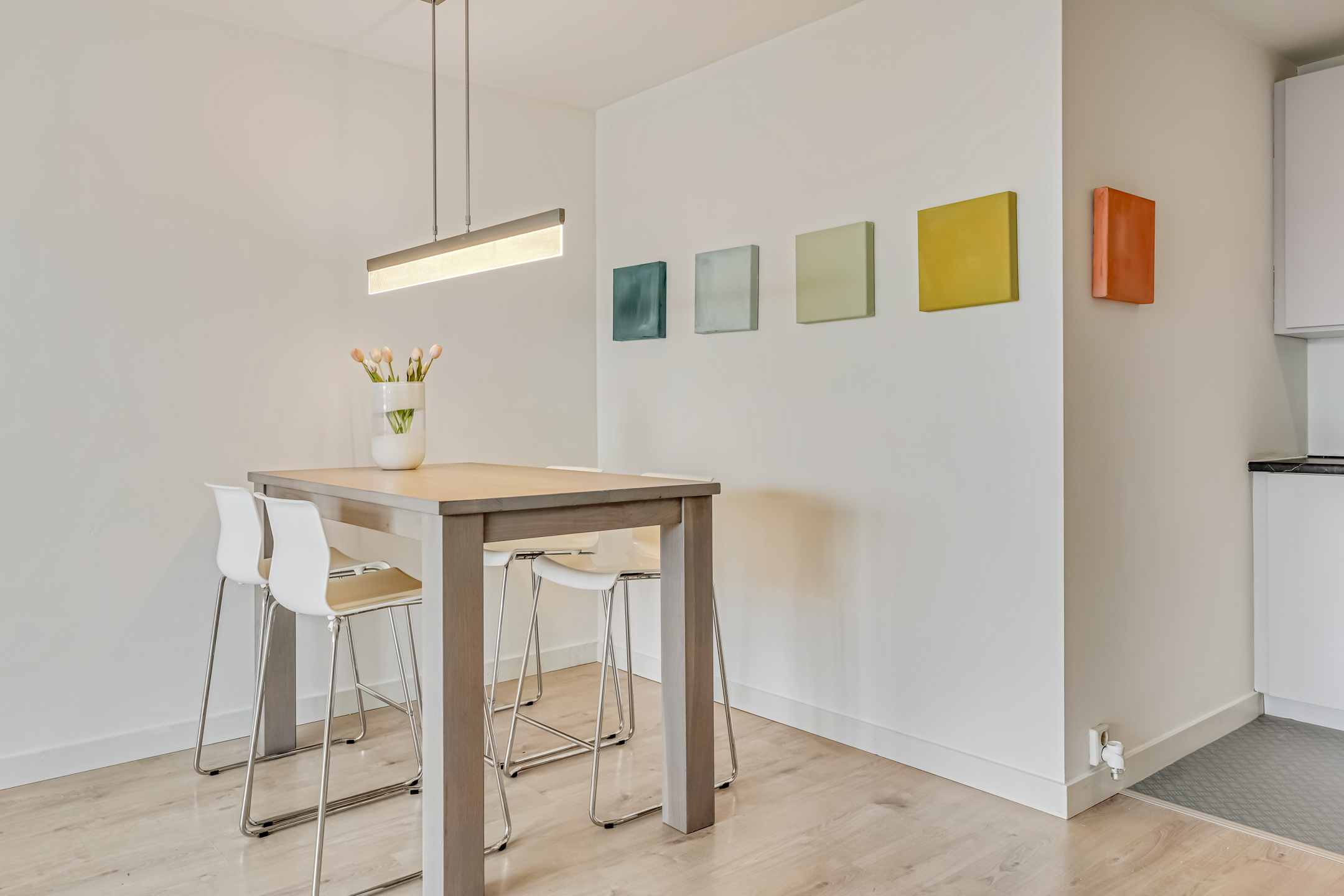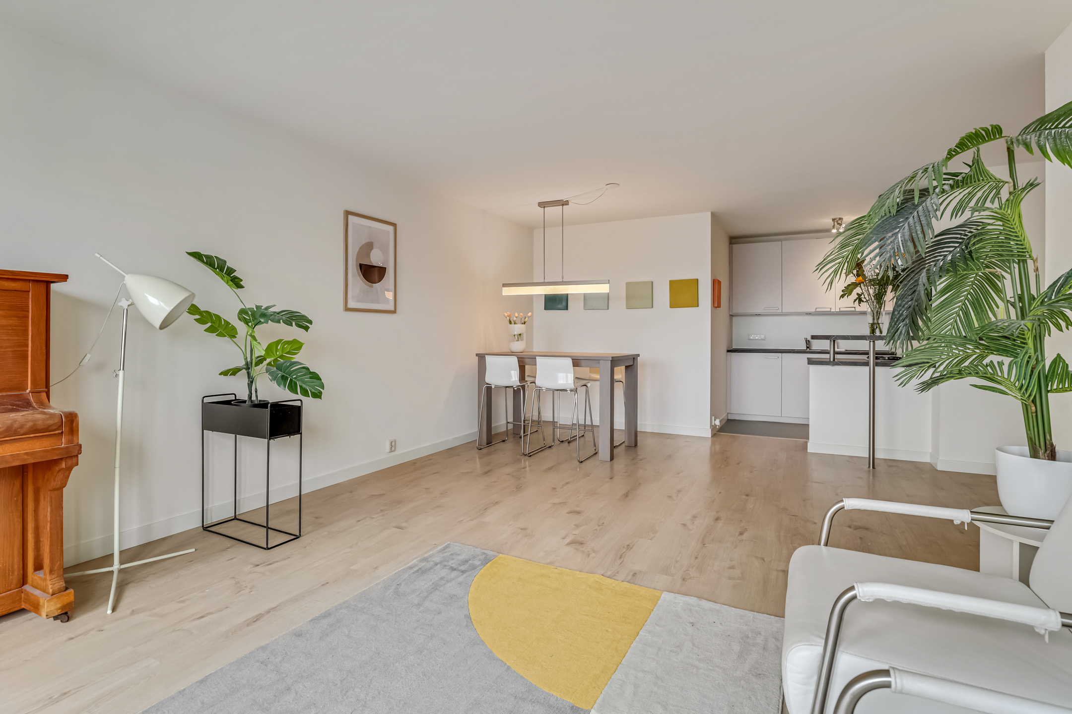 De laatste toegangsdeur in de hal brengt je naar de living. De lichte woonkamer met laminaatvloer en grote raampartijen voelt warm en uitnodigend aan. Hier is plek voor een heerlijk zit- en eethoek terwijl je wegkijkt over het centrum van Veenendaal. Vanuit de zithoek kom je via de schuifpui ook het balkon op. In de woonkamer is ook de keuken gesitueerd.