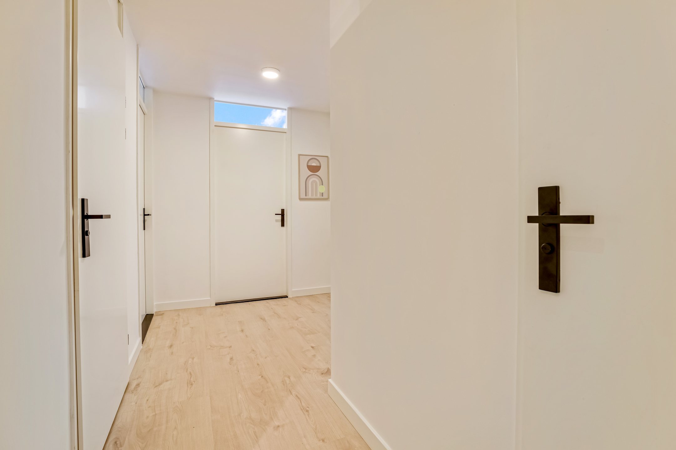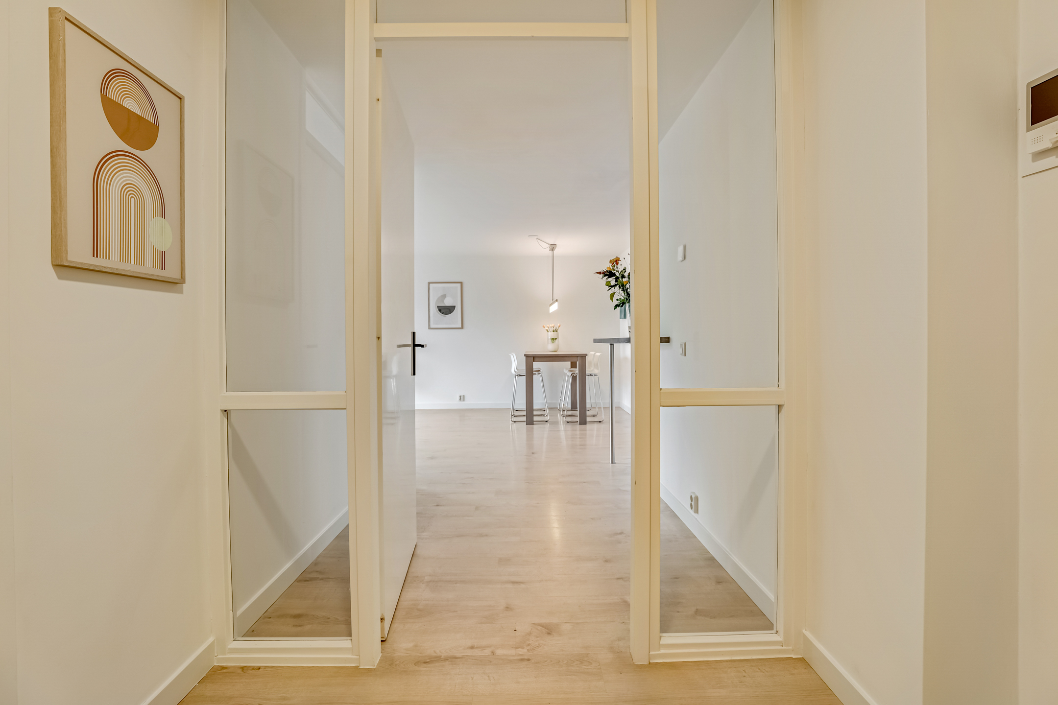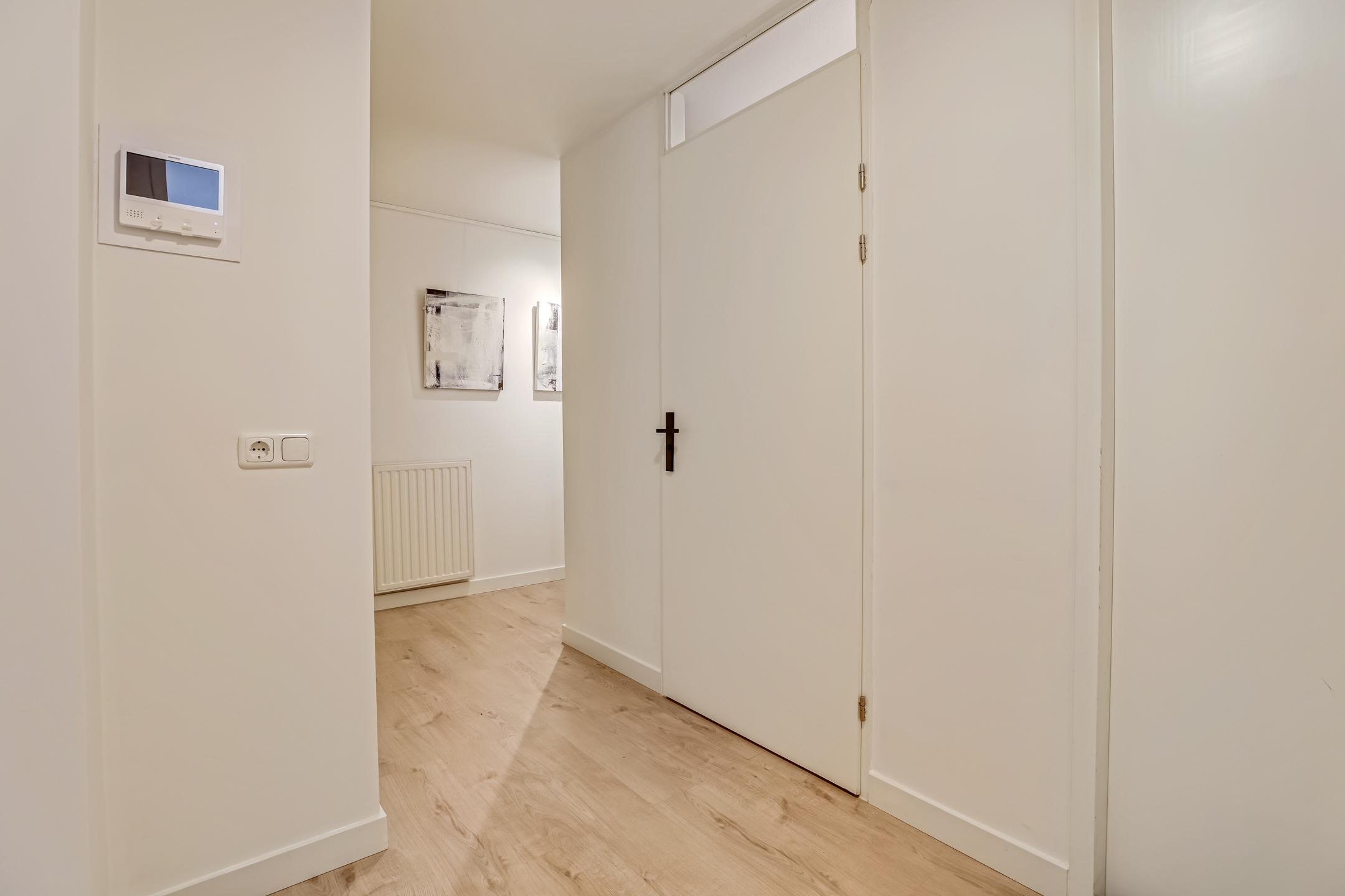 Als je de galerij afloopt kom je bij nummer 1 11. Je stapt de woning binnen in de ruime hal. Deze hal biedt voldoende plek voor een kapstok of opbergmeubel. Daarnaast bevindt zich hier ook de meterkast.