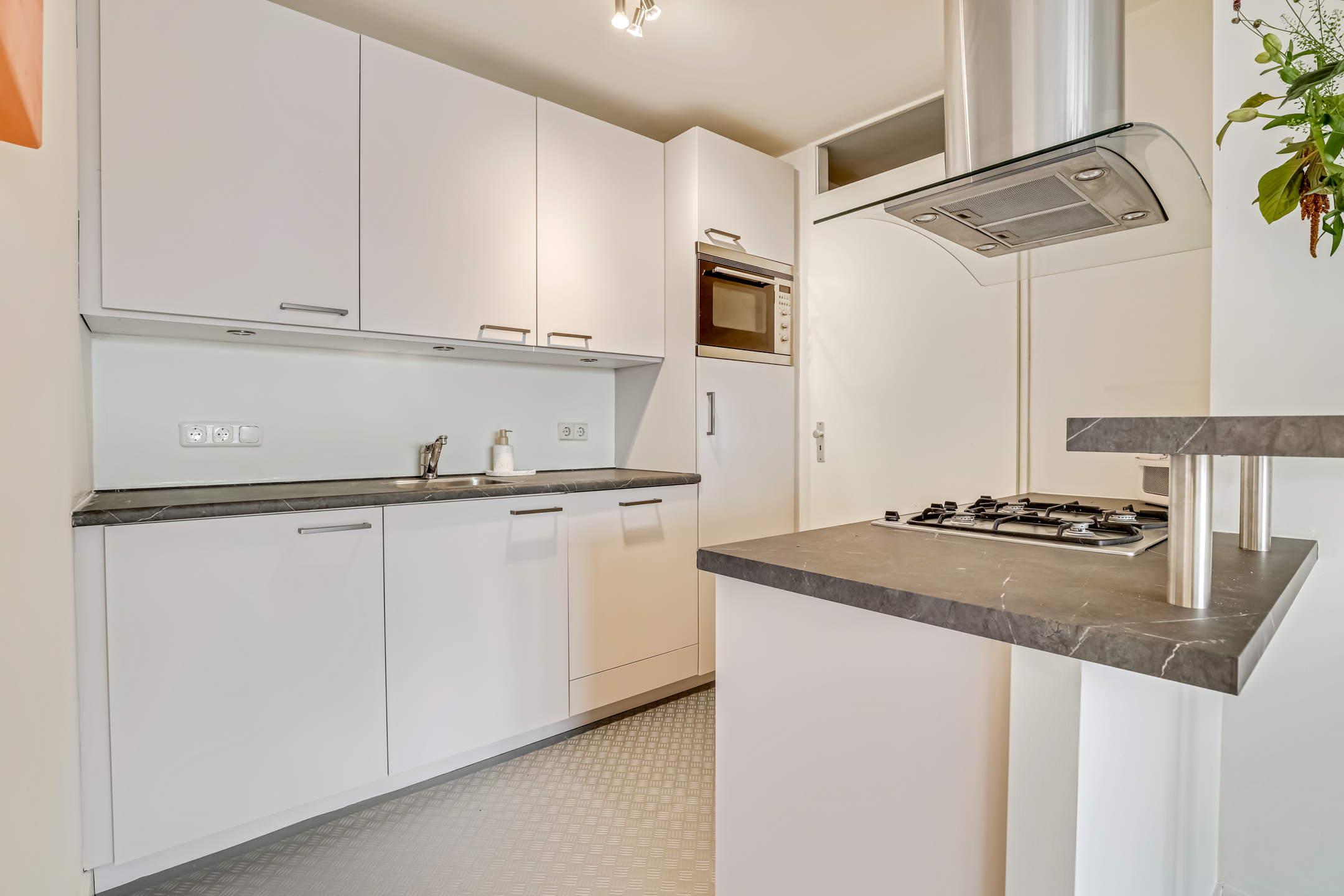 De keuken is praktisch ingedeeld en beschikt over diverse inbouwapparatuur zoals een 4-pits gasfornuis, afzuigkap, oven, koelkast, praktische lades, spoelbak en vaatwasser. Aangrenzend aan de keuken bevindt zich de berging met wasmachineaansluiting en cv-ketel, ideaal voor extra opbergruimte.