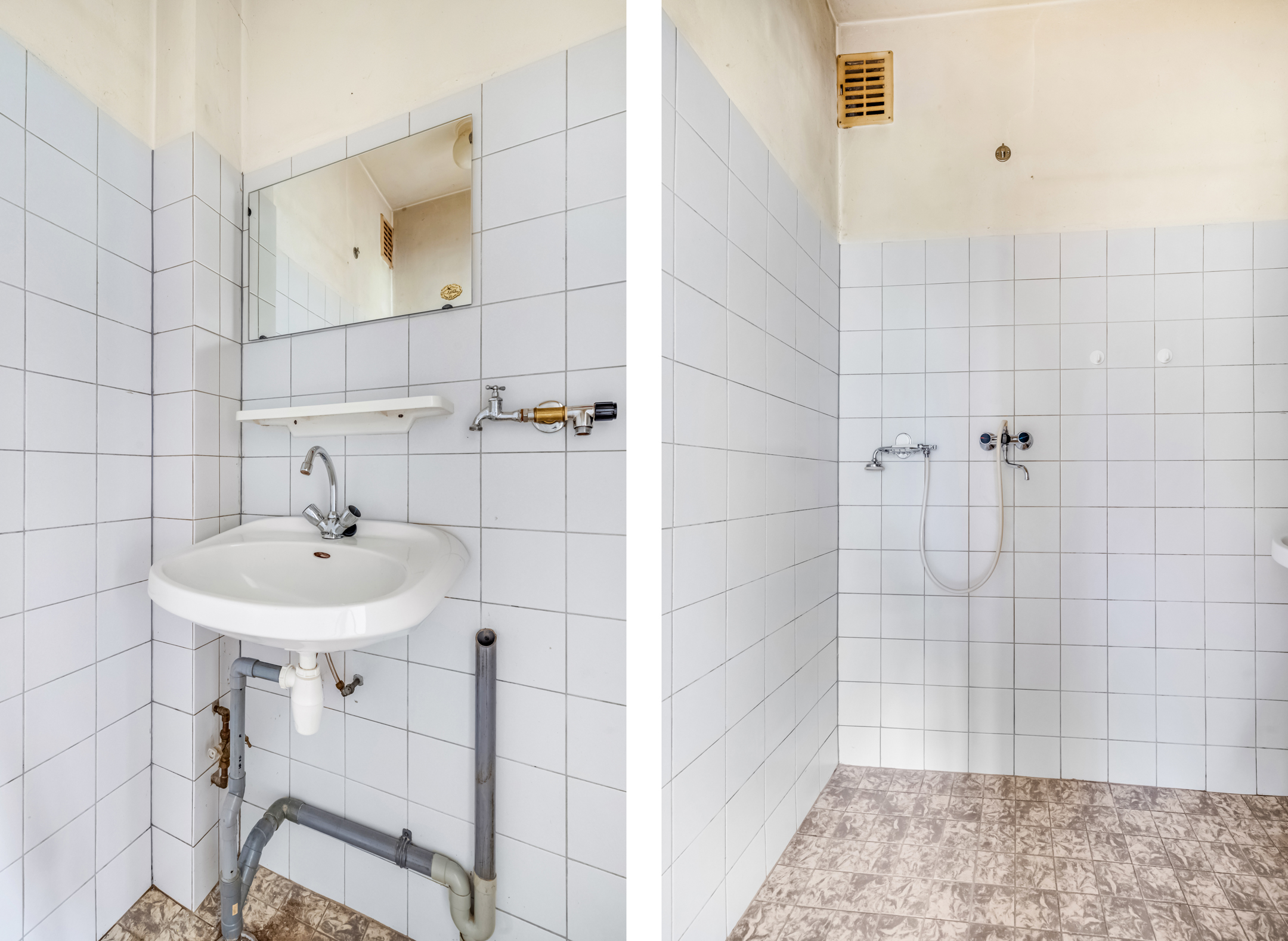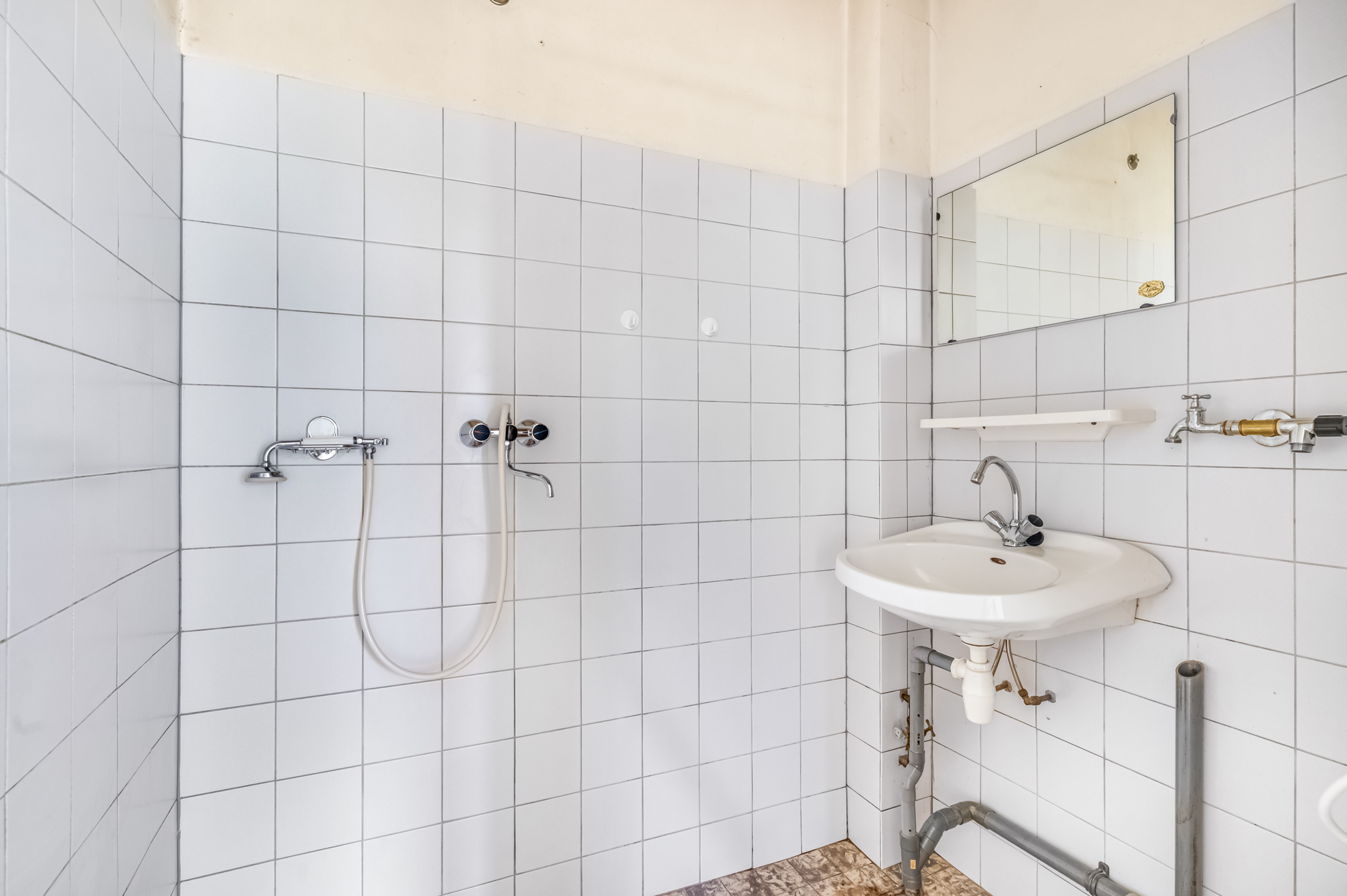 De badkamer is eenvoudig en voorzien van een douchehoek, wastafel en de wasmachineaansluiting. Alles wat je nodig hebt, overzichtelijk bij elkaar.
