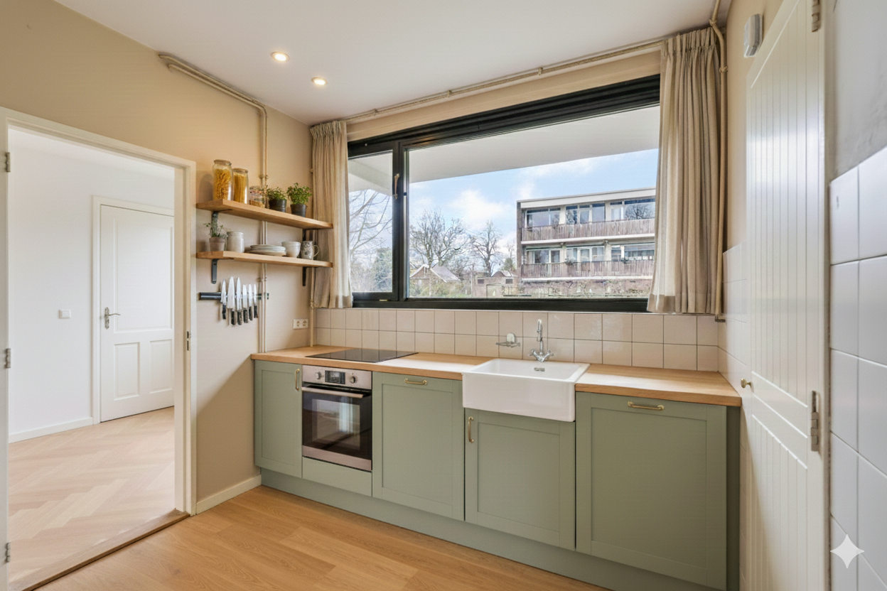 De keuken is eveneens licht, met een praktische opstelling en ruimte om alles naar eigen smaak in te richten. Naast de keuken vind je een praktische berging. Super handig voor spullen die je graag dichtbij houdt.