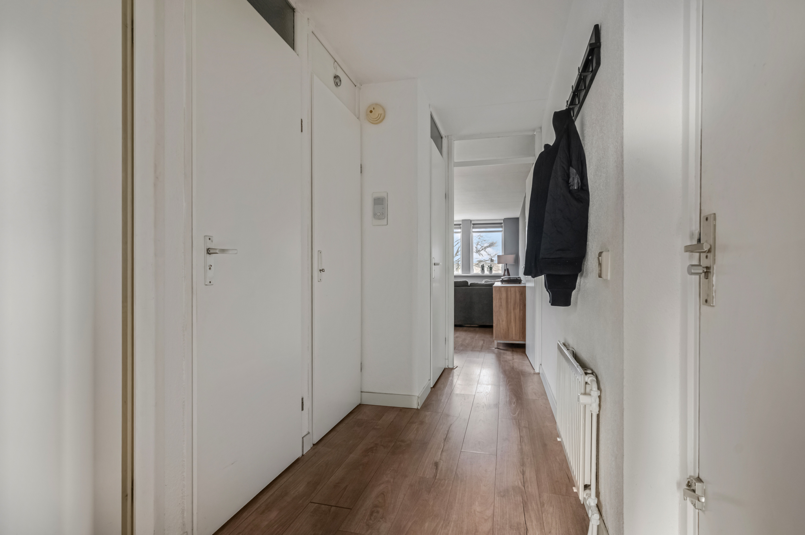 Middels het trappenhuis kom je bij de entree van de woning. Bij binnenkomst in het appartement kom je in de hal, die toegang biedt tot de verschillende vertrekken.