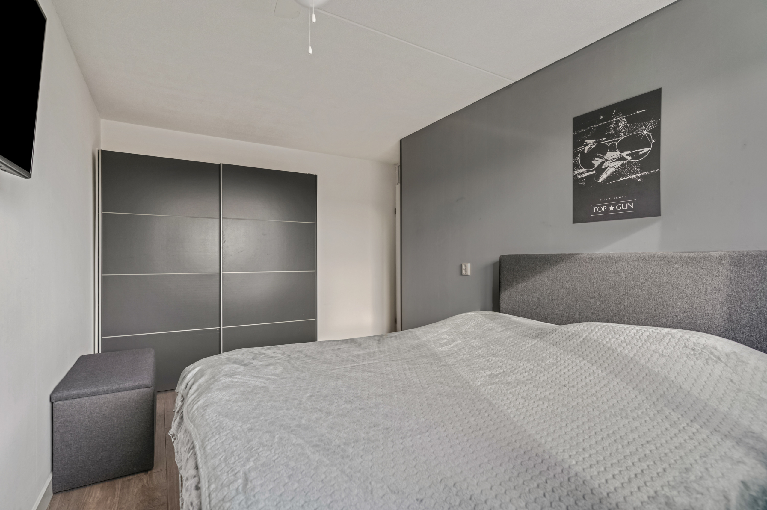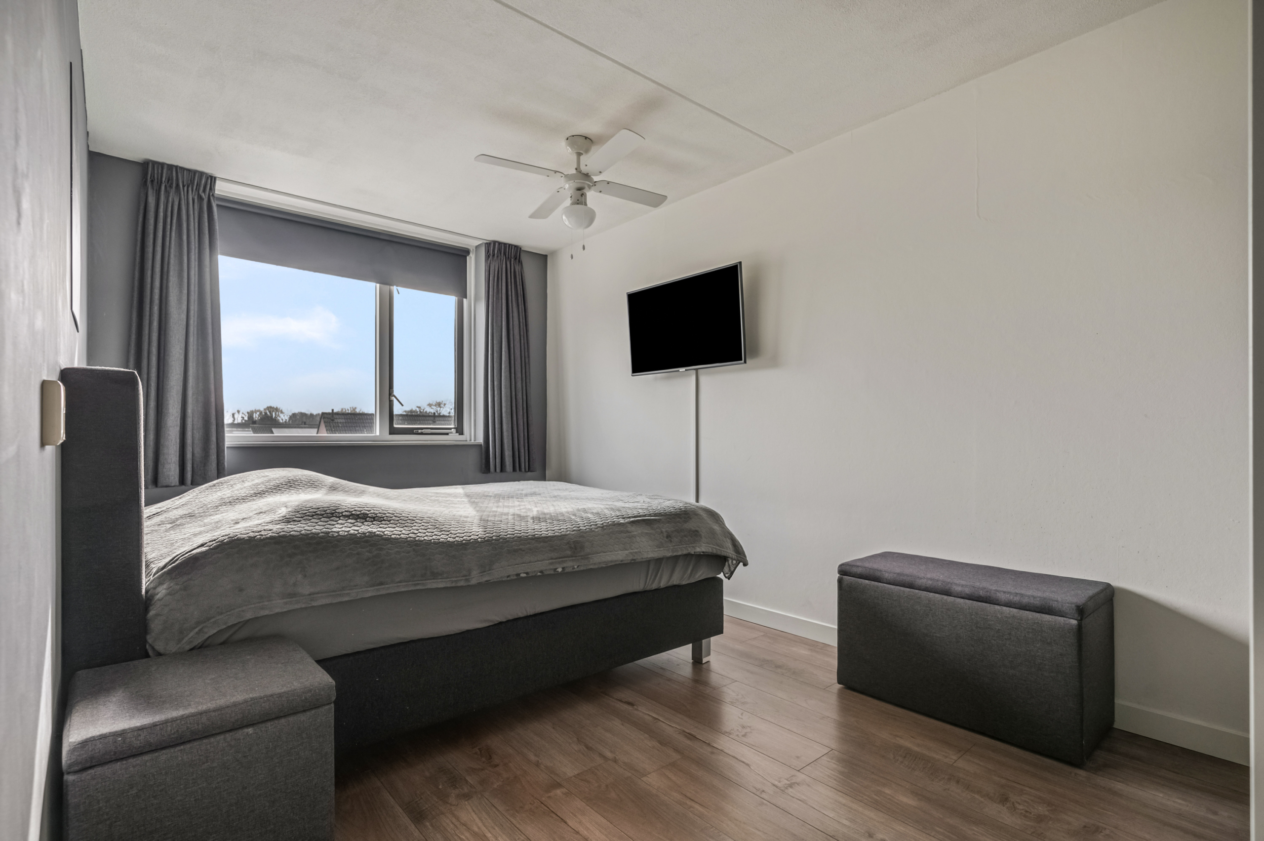Aan de linkerzijde bevinden zich de twee slaapkamers. De eerste kamer is multifunctioneel en ideaal als werkplek, hobbyruimte of logeerkamer. De royale masterbedroom biedt voldoende ruimte voor een tweepersoonsbed en een grote kledingkast. Dit is een fijne, rustige plek om de dag af te sluiten.