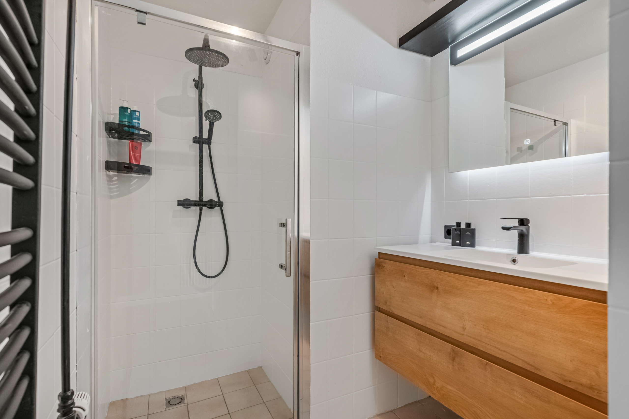 De moderne badkamer is strak afgewerkt en voorzien van een douche, stijlvol wastafelmeubel en designradiator. Een frisse en comfortabele start van iedere dag.