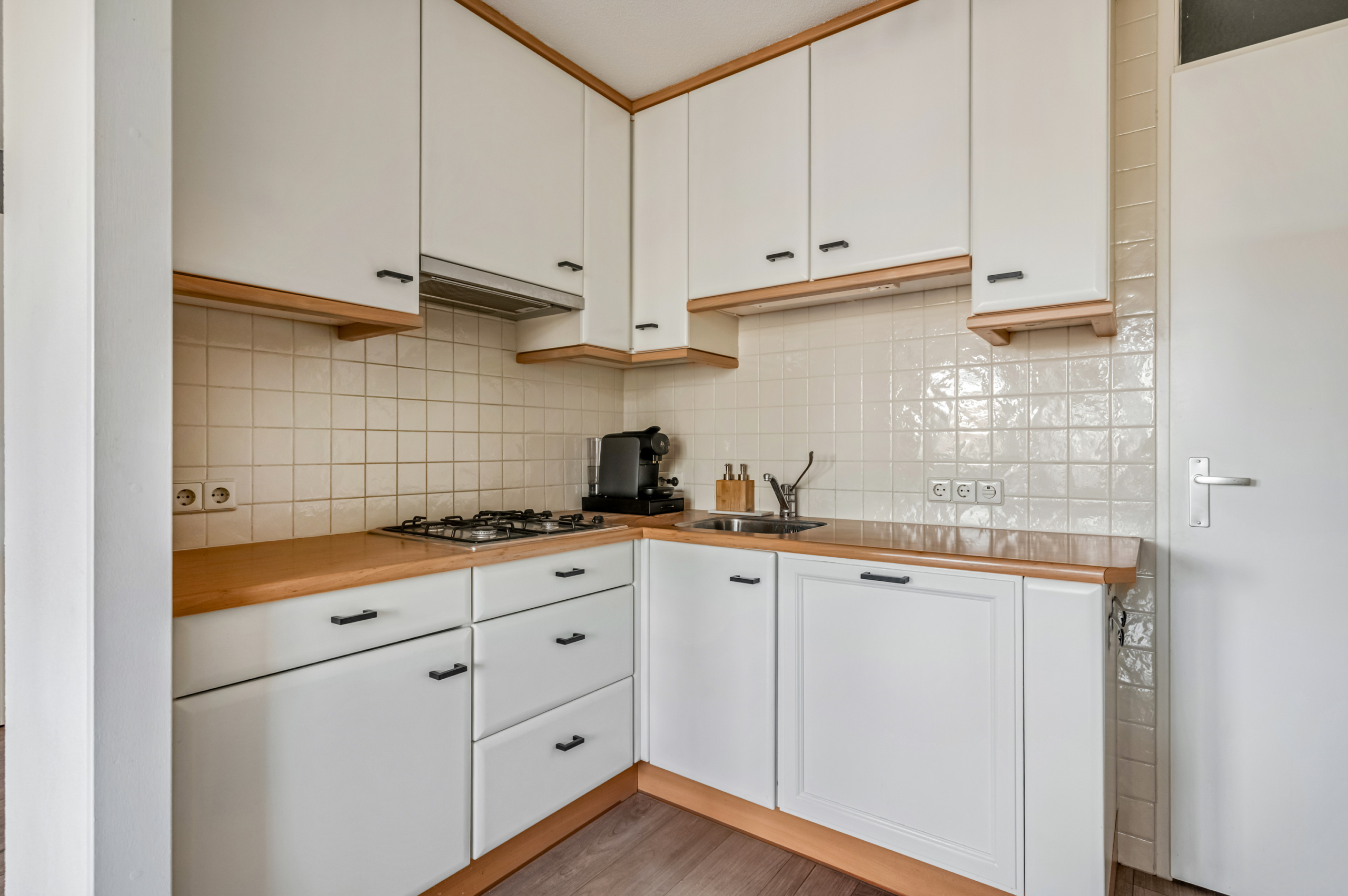 De eigentijdse keuken is praktisch ingericht en voorzien van een 4-pits gasfornuis en een vaatwasser. Daarnaast is er voldoende kastruimte aanwezig. Vanuit de keuken bereik je de inpandige berging met wasmachineaansluitingen en de CV-ketel. Deze praktische ruimte is fijn en zorgt voor extra bergruimte.