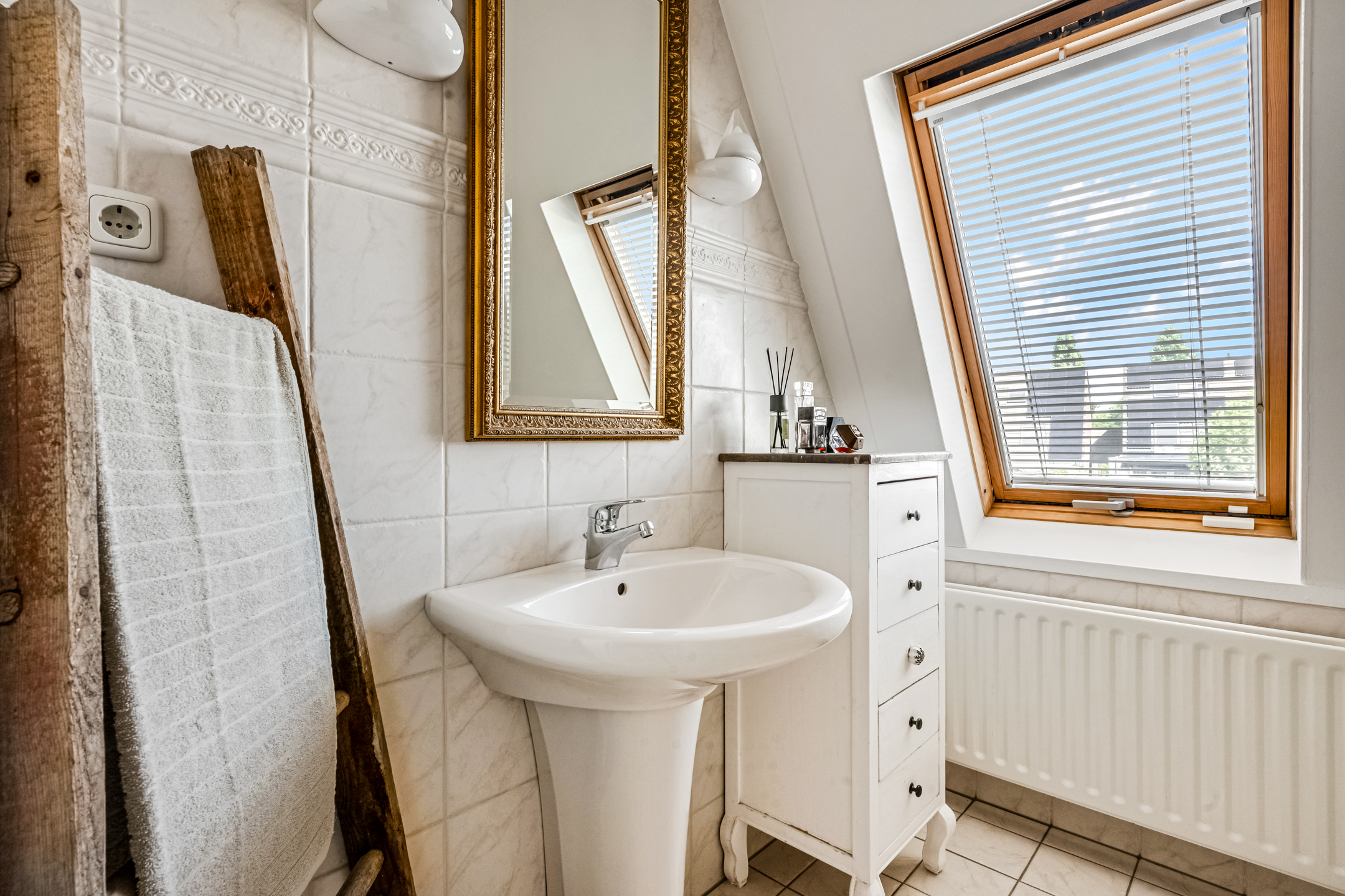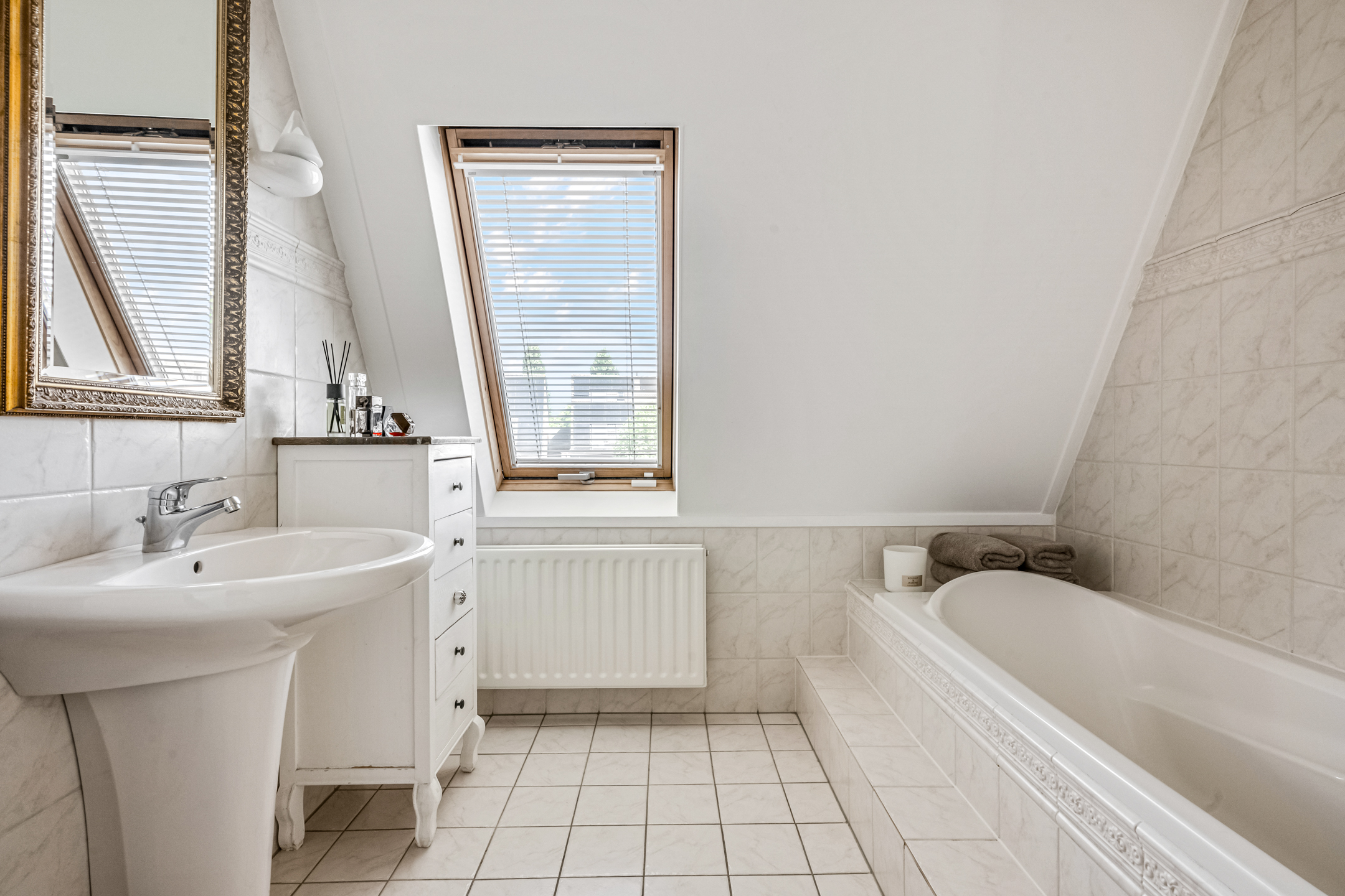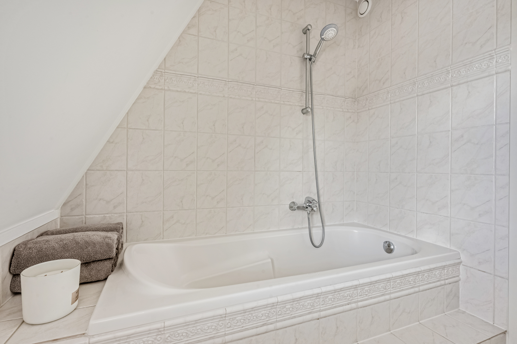 De badkamer, gelegen aan de achterzijde van de woning, is volledig betegeld en keurig afgewerkt. Hier vind je een wastafel en een comfortabele bad-/douchecombinatie, ideaal voor zowel een snelle douche in de ochtend als een ontspannend bad aan het einde van de dag. Het aanwezige raam zorgt voor een prettige lichtinval en natuurlijke ventilatie, waardoor de ruimte altijd fris en aangenaam aanvoelt.
