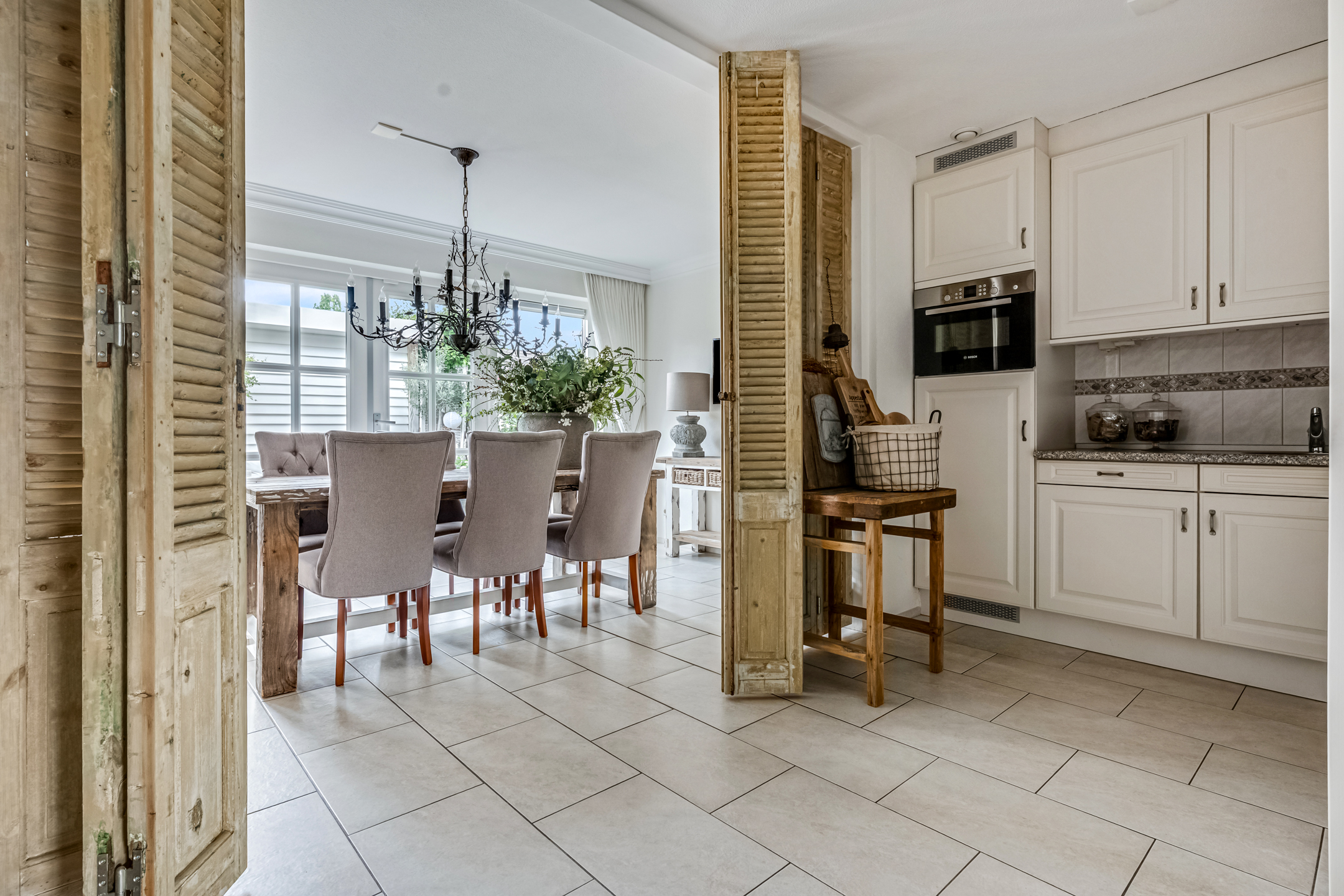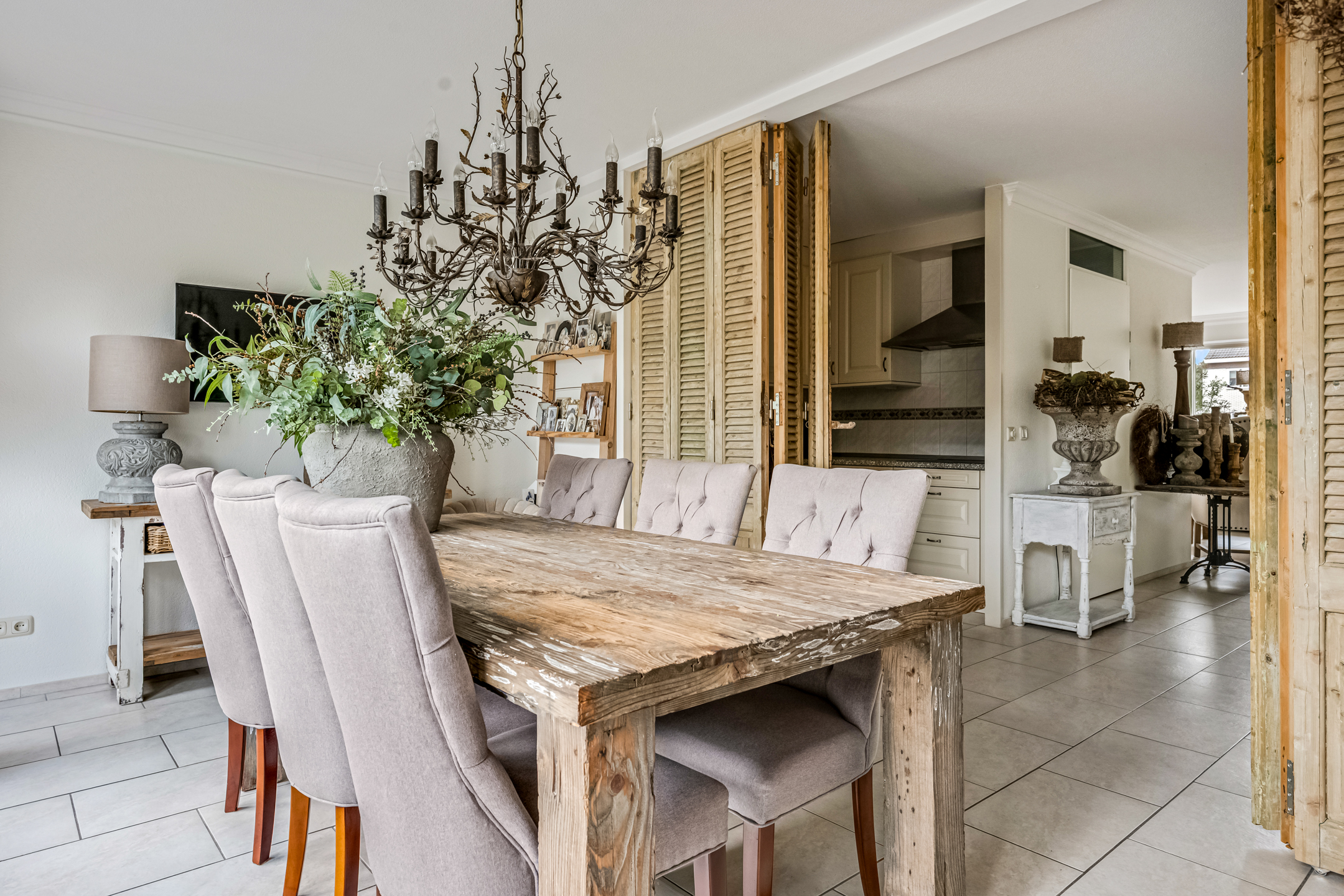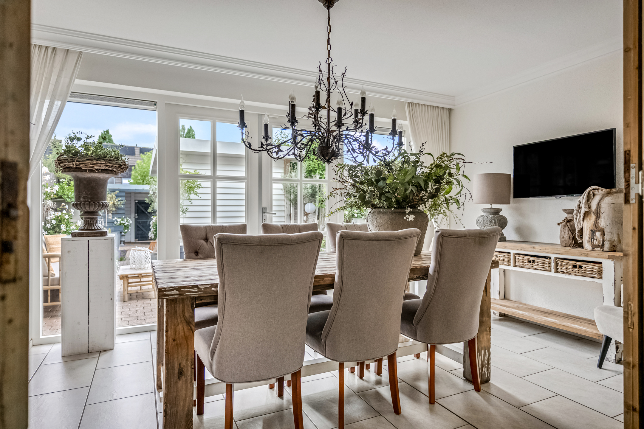 Als je verder doorloopt naar de achterzijde kom je middels de schuifdeuren in het eetgedeelte. Hier kan je heerlijk genieten van jouw net gekookte maaltijd of gezellig borrelen met vrienden of familie. Door de openslaande deuren krijgt deze ruimte nog meer sfeer en staat deze in verbinding met de tuin.