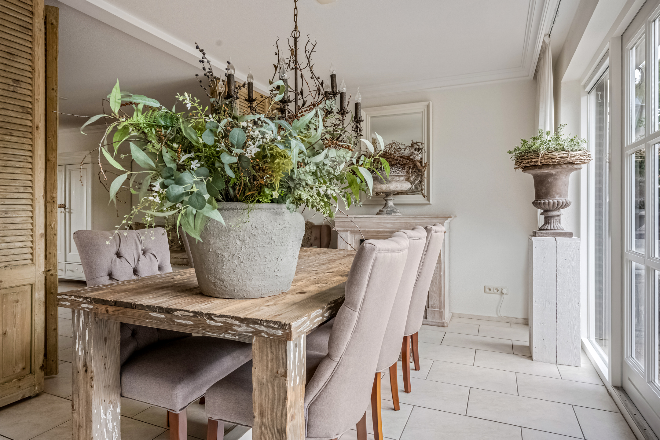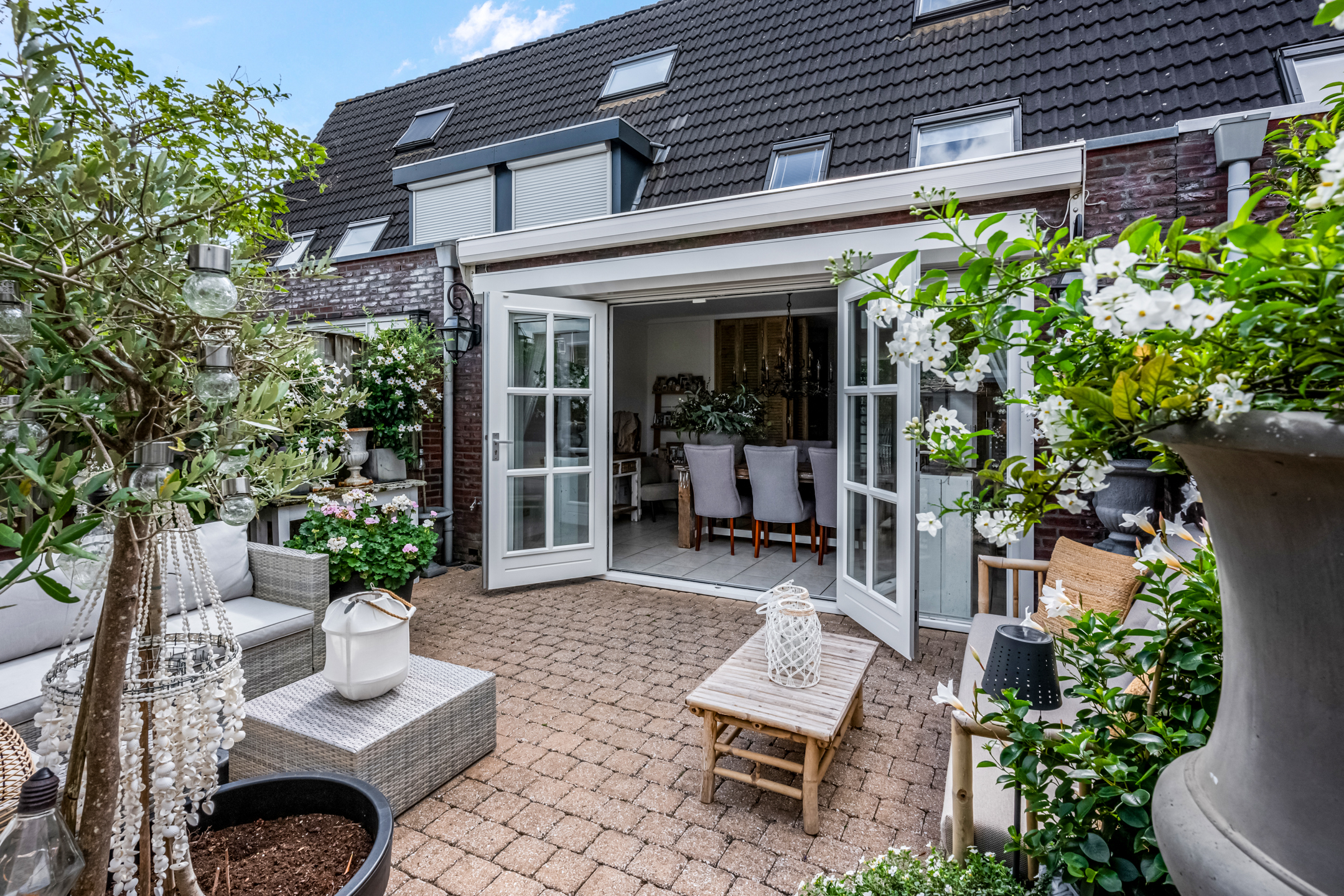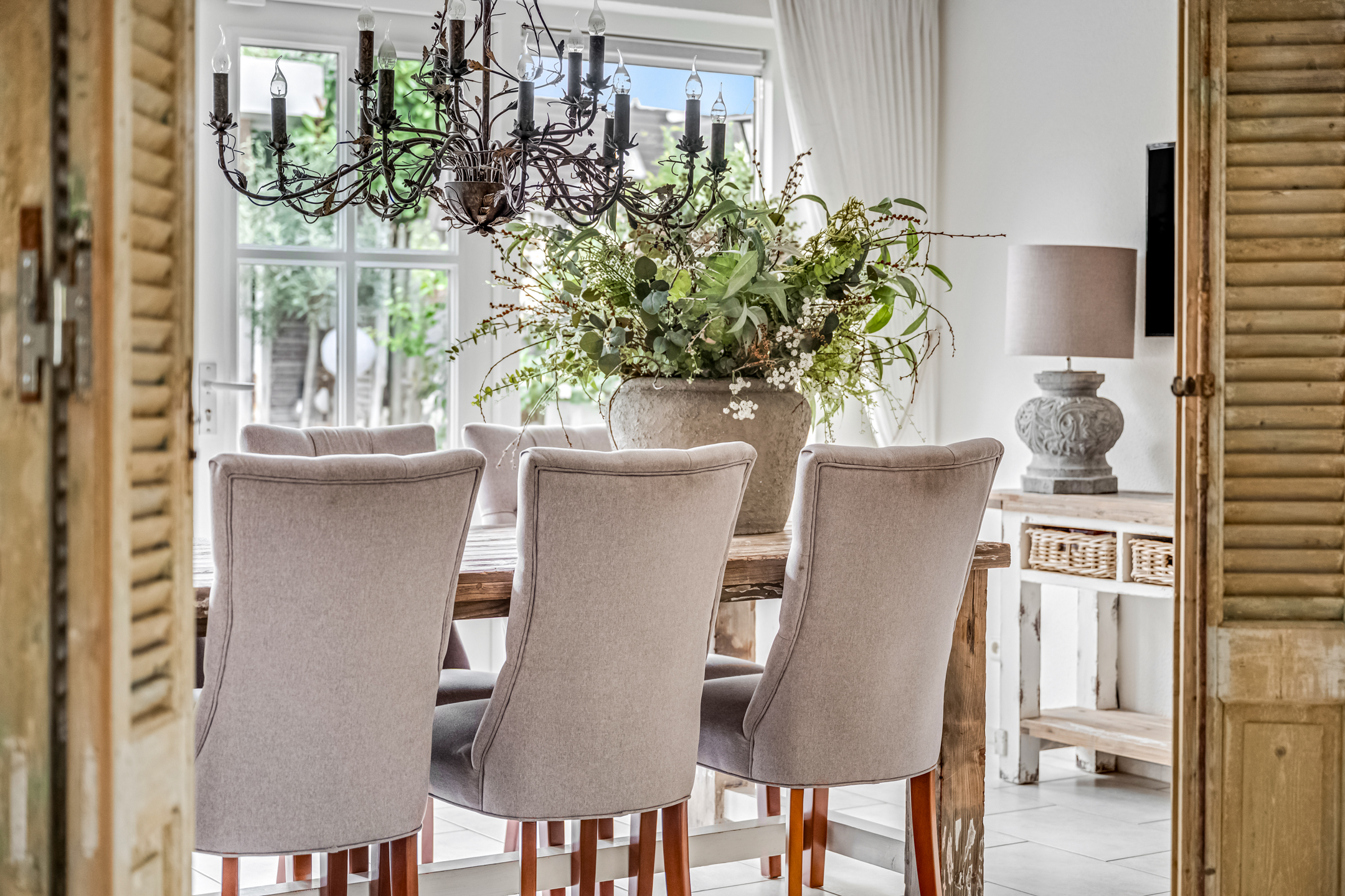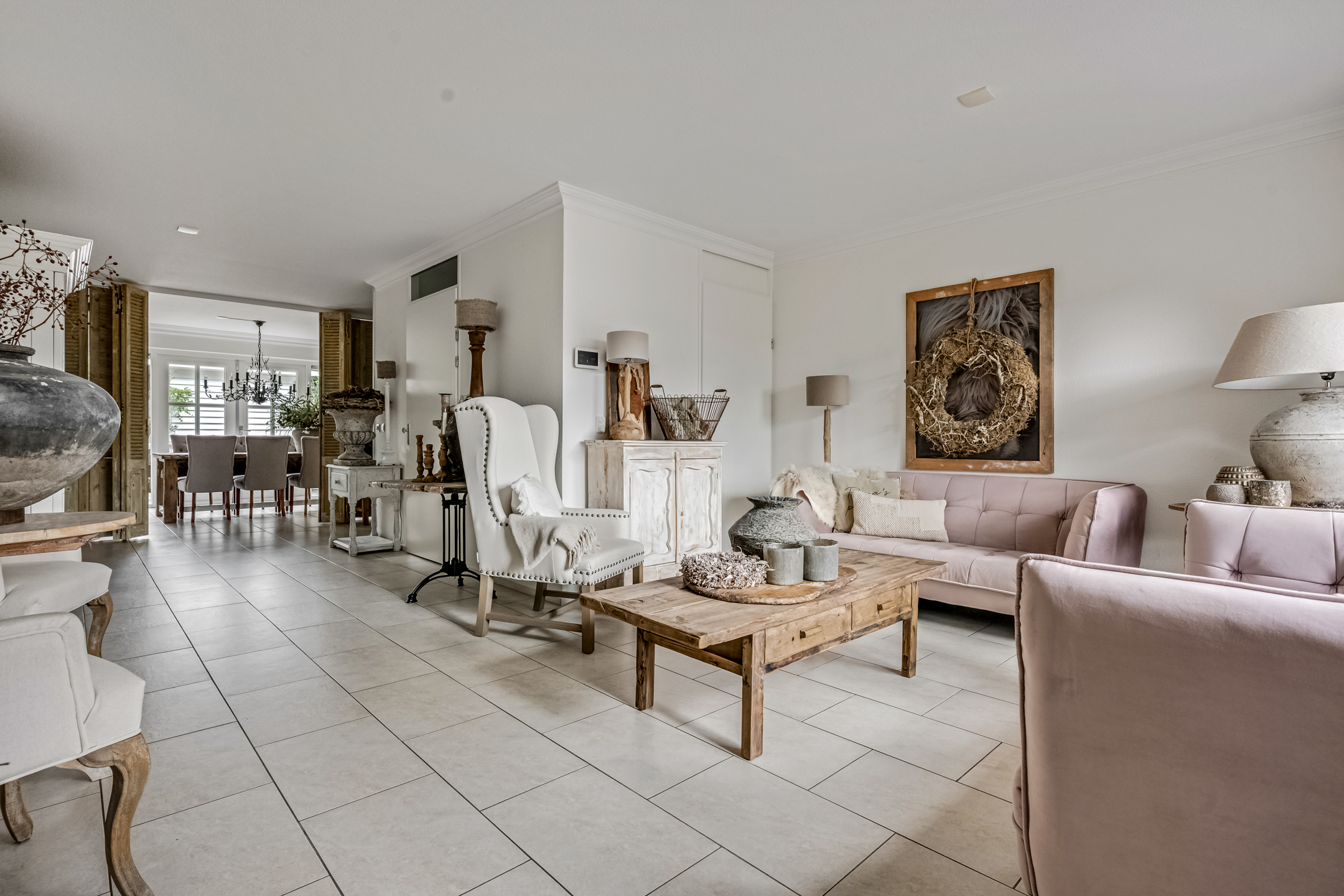 Als je verder doorloopt naar de achterzijde kom je middels de schuifdeuren in het eetgedeelte. Hier kan je heerlijk genieten van jouw net gekookte maaltijd of gezellig borrelen met vrienden of familie. Door de openslaande deuren krijgt deze ruimte nog meer sfeer en staat deze in verbinding met de tuin.