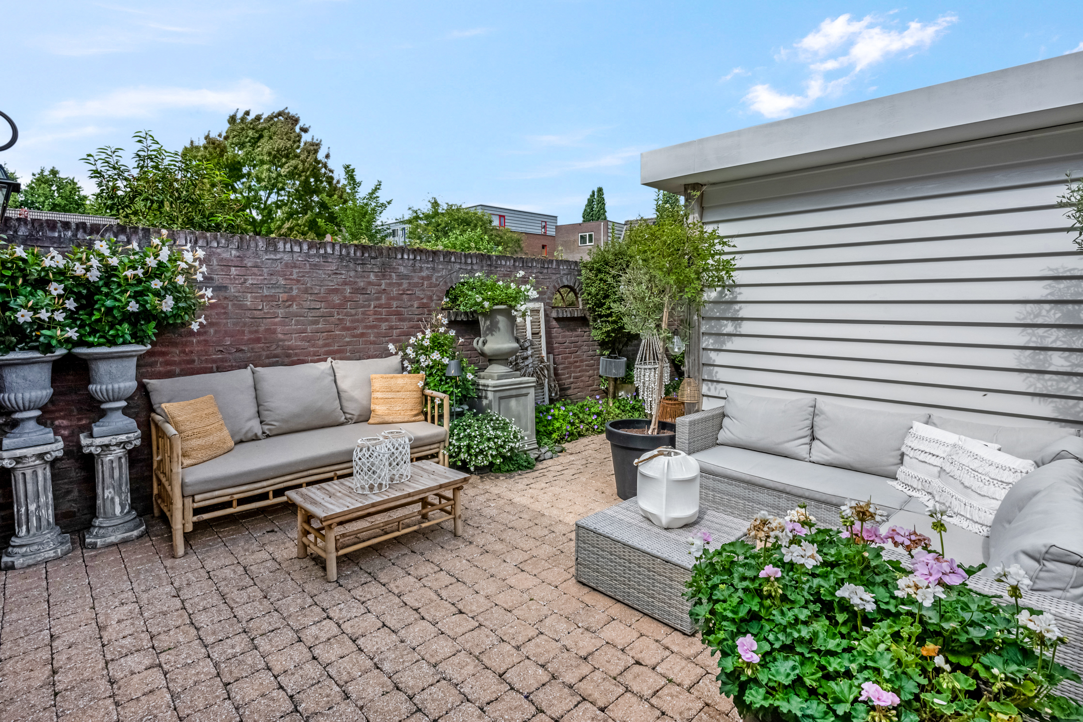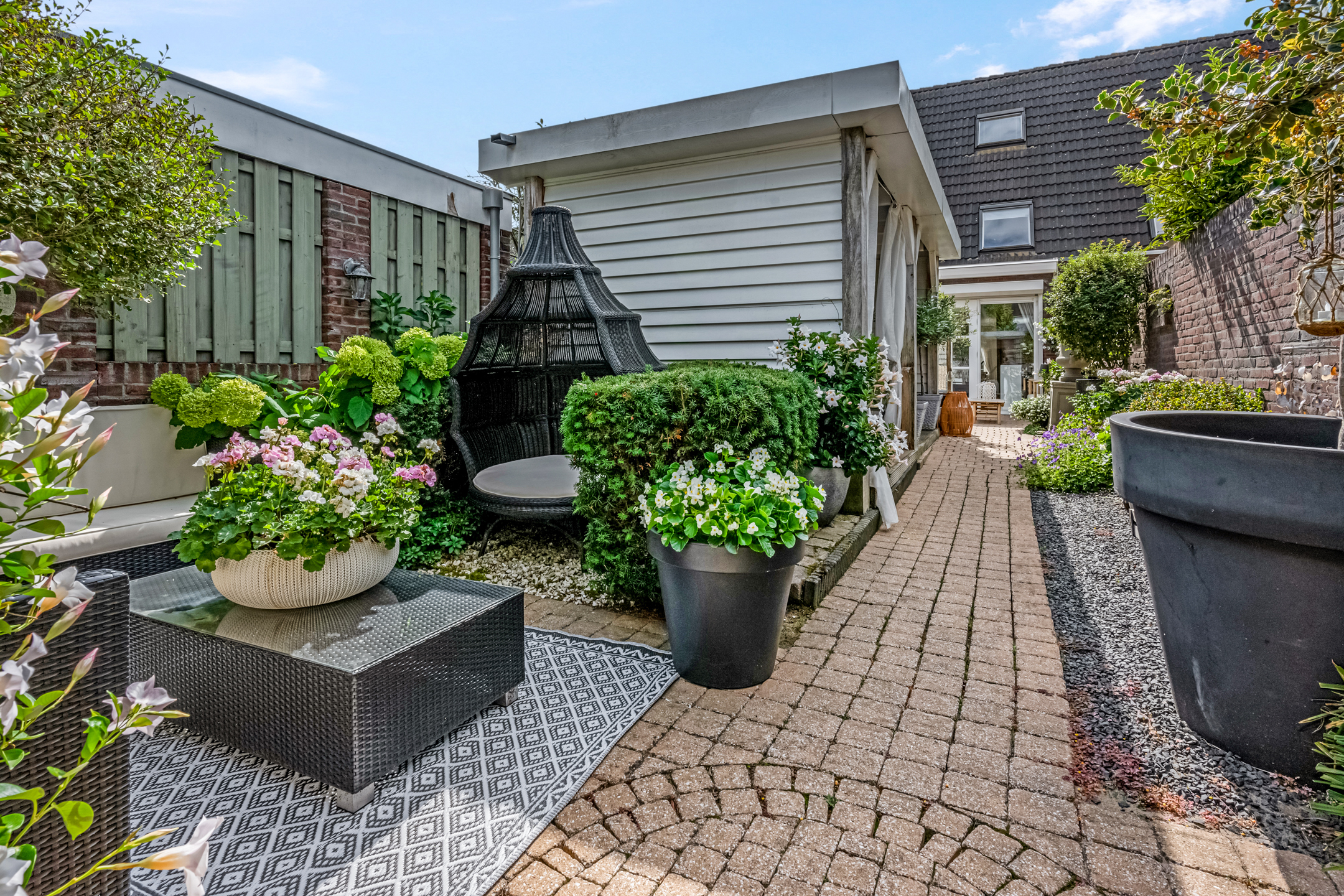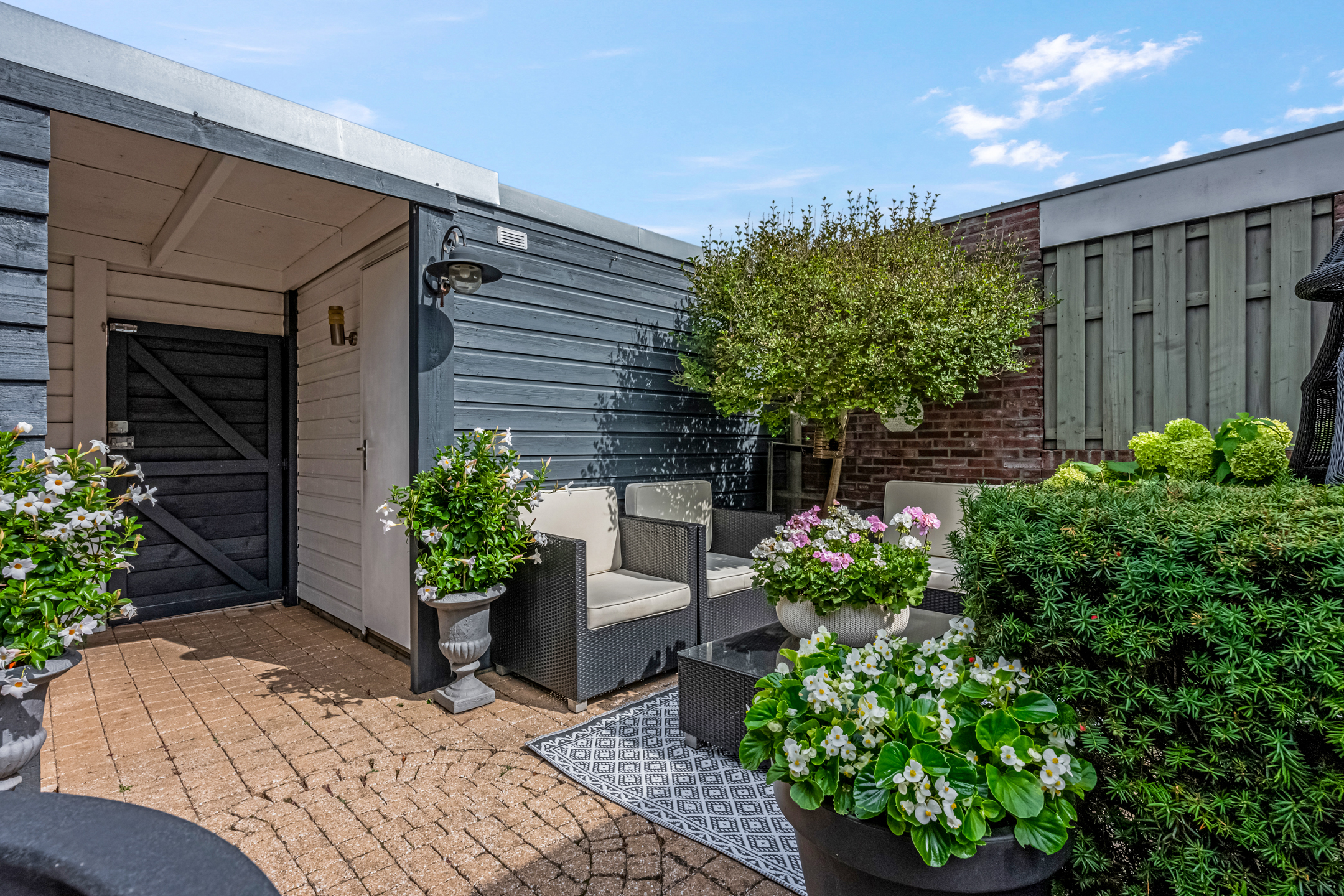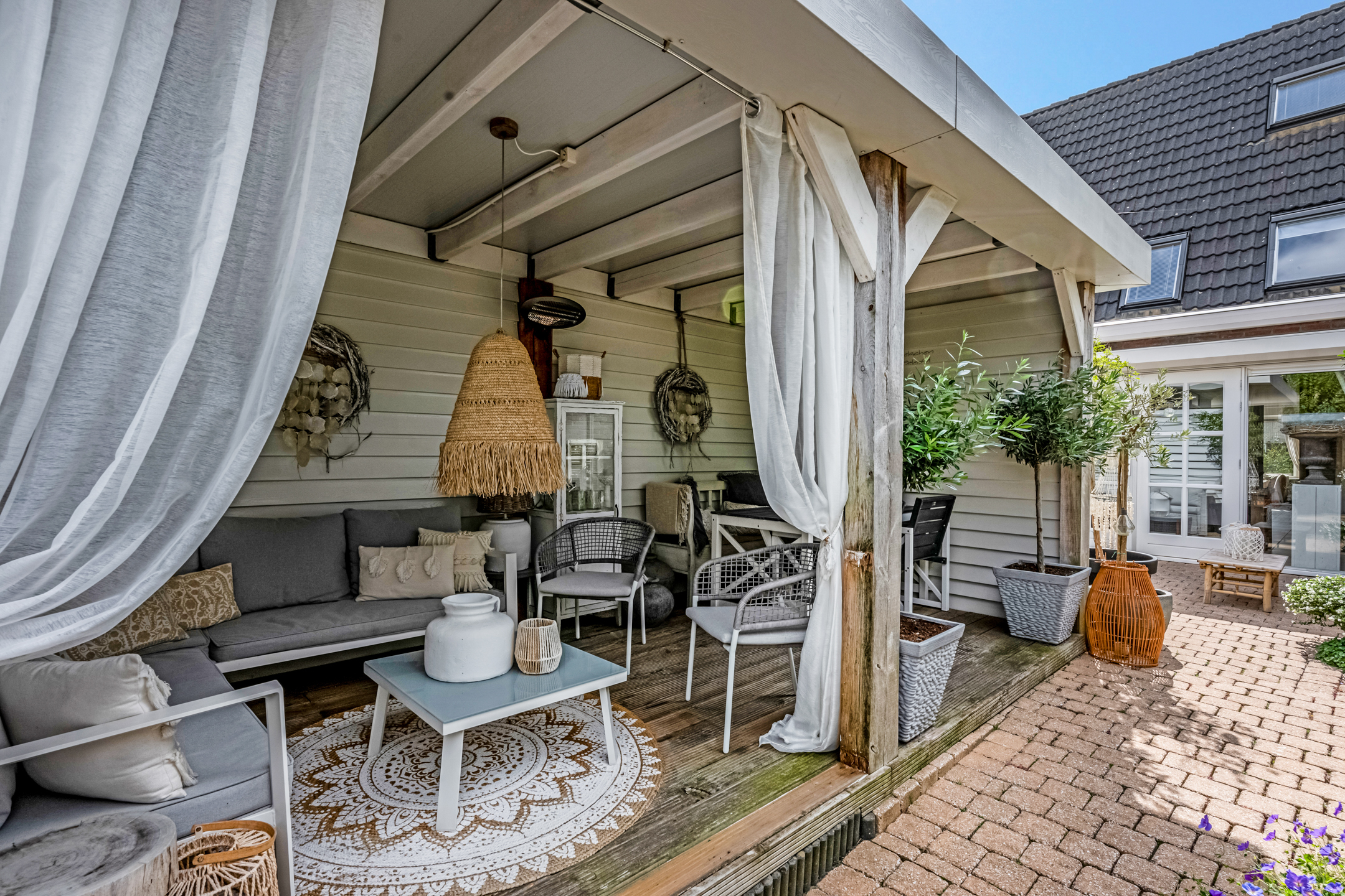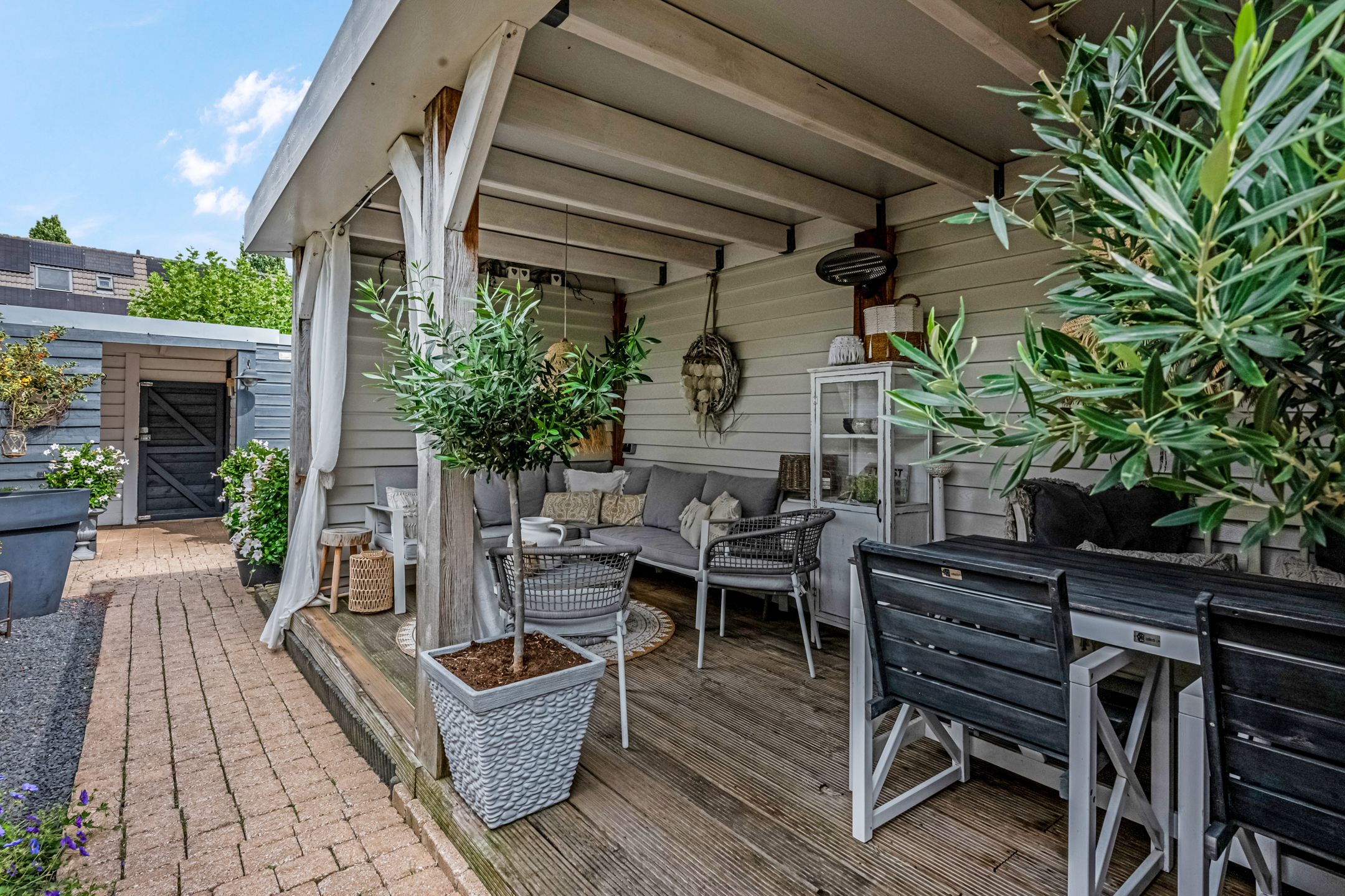 Vanuit de eethoek en via de achterom bereik je de netjes aangelegde, op het noordoosten gelegen tuin. De tuin biedt meerdere plekken om een heelrijk zithoek te creëren. Met het elektrische zonnescherm zorg je dat je op warme dagen ook in de tuin kunt genieten van het buitenleven. Onder de veranda zit je beschut en comfortabel, waardoor je er zowel in de zomer als in de winter een fijne plek hebt om te ontspannen.