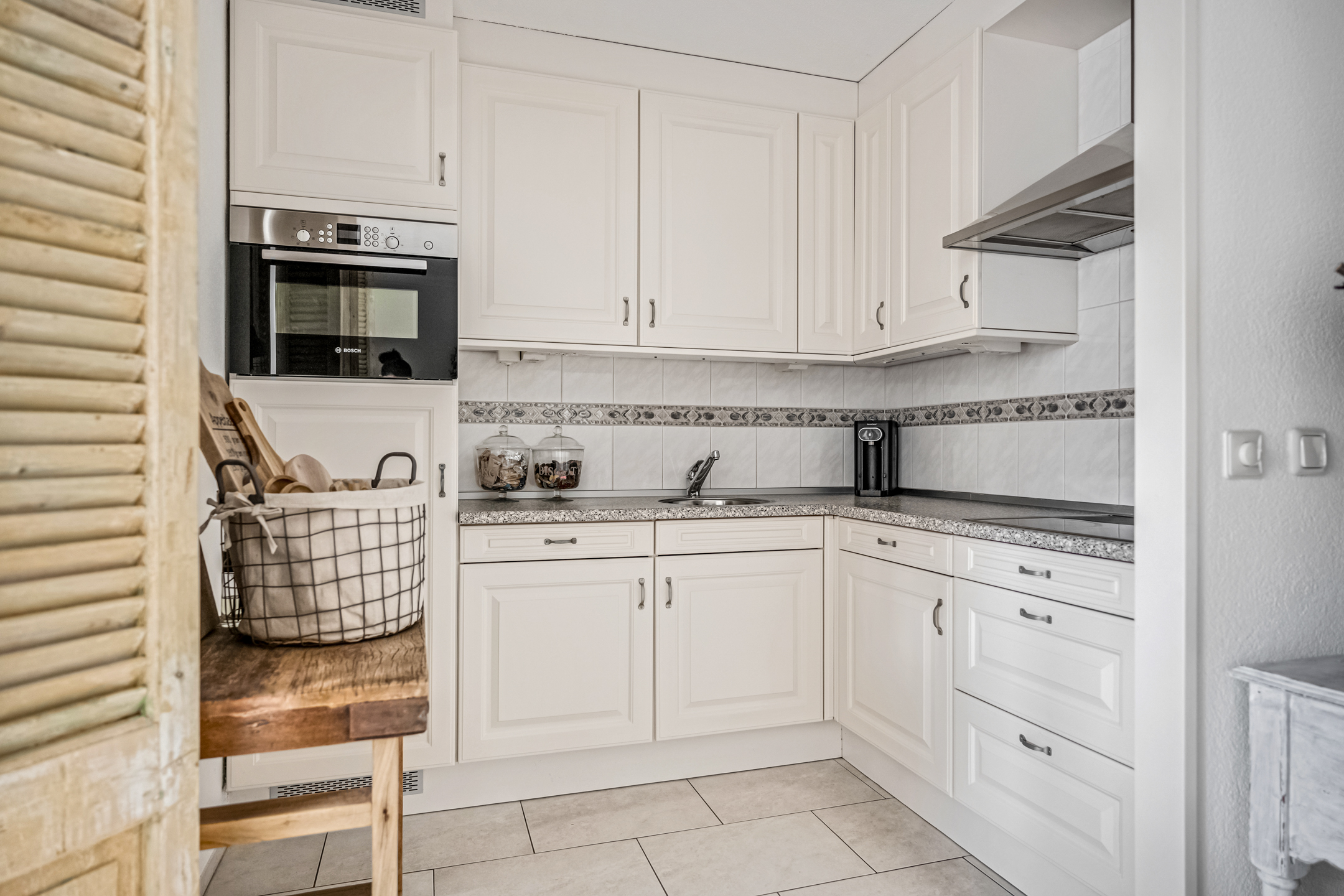 Centraal in de woonkamer bevinden zich de doorgangen naar de volledig betegelde toiletruimte met fonteintje en de vaste trapopgang naar de verdieping. Daarnaast is de keuken ook centraal gelegen op de begane grond. Deze eigentijdse keuken is voorzien van 4-pits inductiekookplaat, afzuigkap, combi-oven en een koelkast.