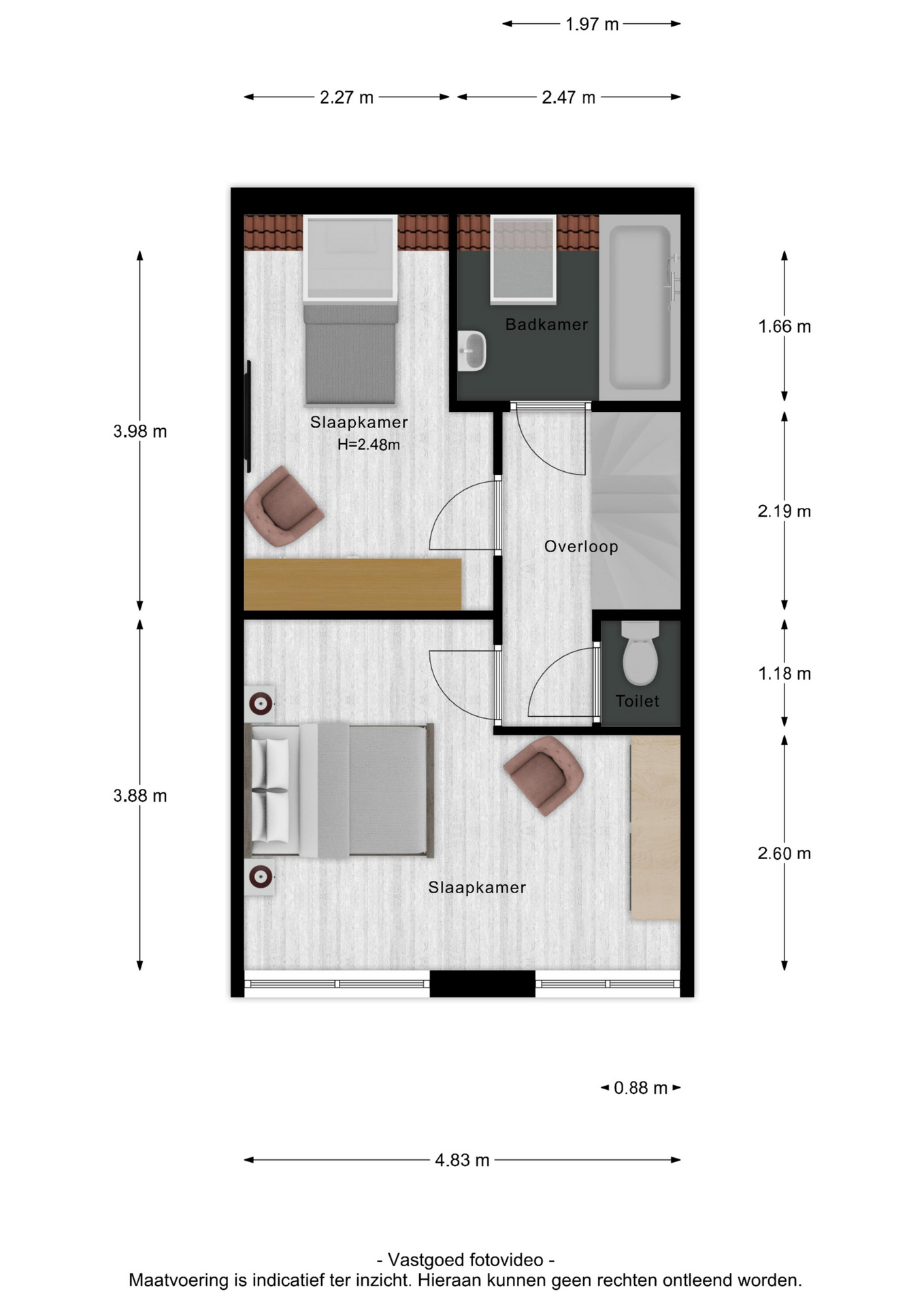 De tweede verdieping is met een vaste trap te bereiken en biedt verrassend veel mogelijkheden. Vanaf de ruime overloop kom je in twee afzonderlijke kamers. Beide kamers zijn lekker ruim, hebben een fijne lichtinval en zijn daardoor heel geschikt als slaapkamer, werkkamer of hobbyruimte. Op de overloop vind je daarnaast de aansluitingen voor de wasmachine en droger én de opstelplaats van de cv-ketel. Zo combineert deze verdieping praktisch gemak met volop leefruimte