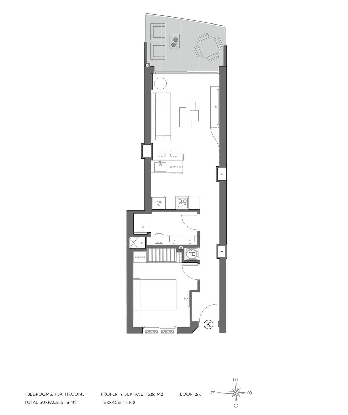 Bij binnenkomst kom je in een slim ingedeeld appartement van circa 47 m². De open keuken loopt mooi over in de woonkamer en vormt samen één lichte, prettige leefruimte. Dankzij de grote raampartijen valt er veel natuurlijk licht naar binnen. Vanuit de woonkamer stap je direct het balkon op, en hier zit misschien wel het mooiste punt van de woning: het zeezicht. De zee ligt letterlijk op een steenworp afstand, waardoor buiten zitten hier elke dag als vakantie voelt. Het balkon is circa 4,3 m² en dankzij de oostelijke ligging kun je hier heerlijk genieten van de ochtendzon.