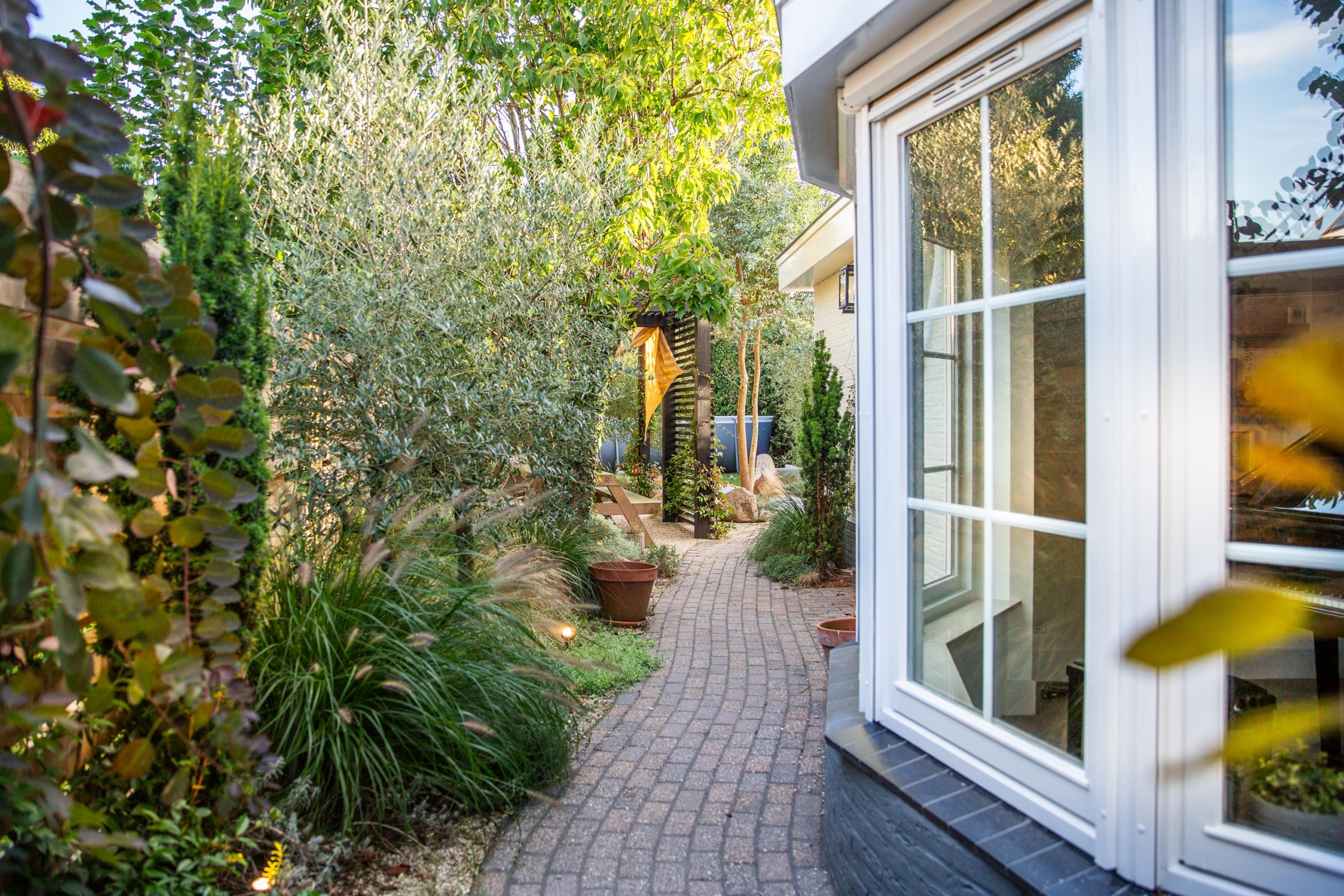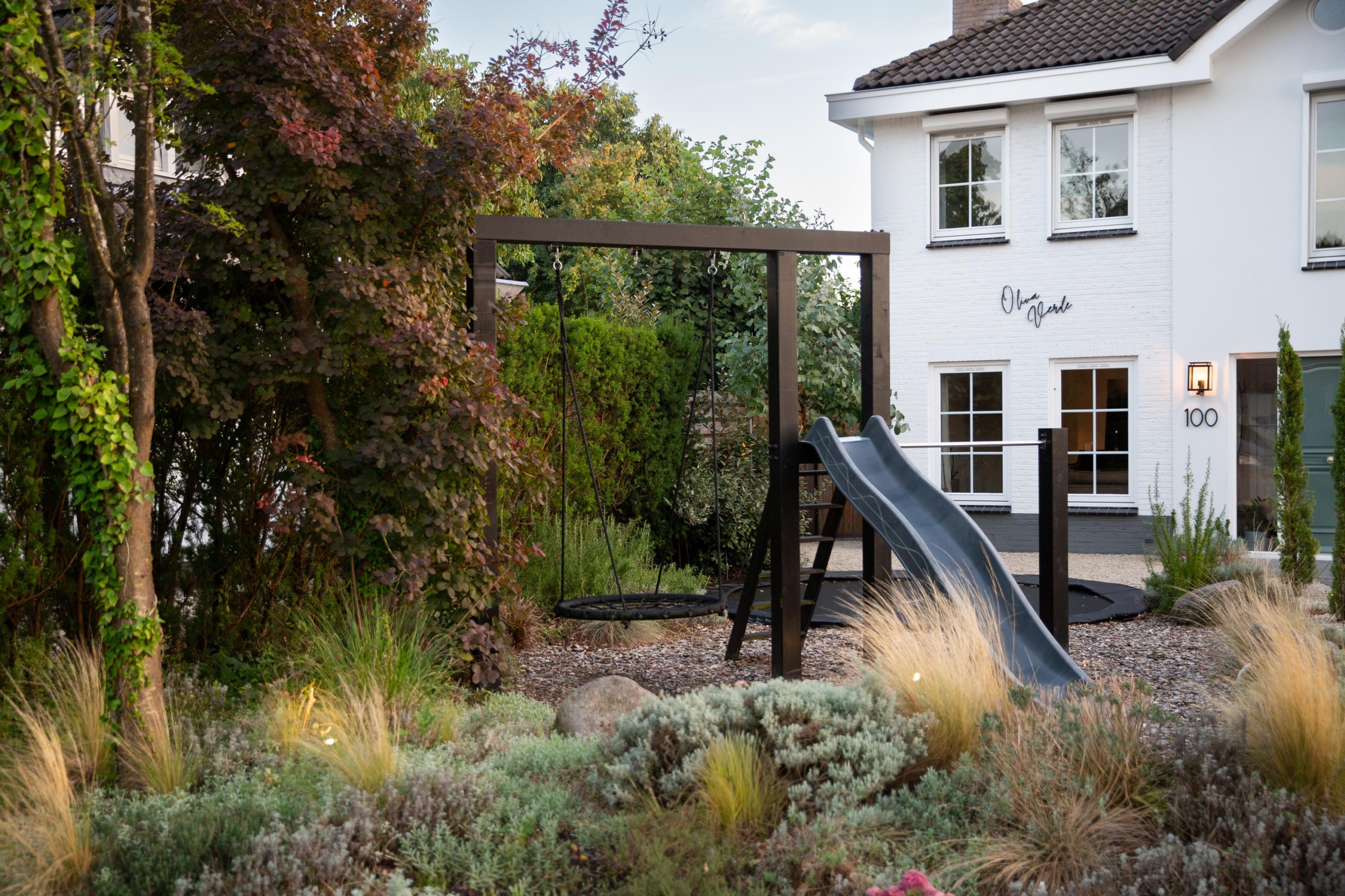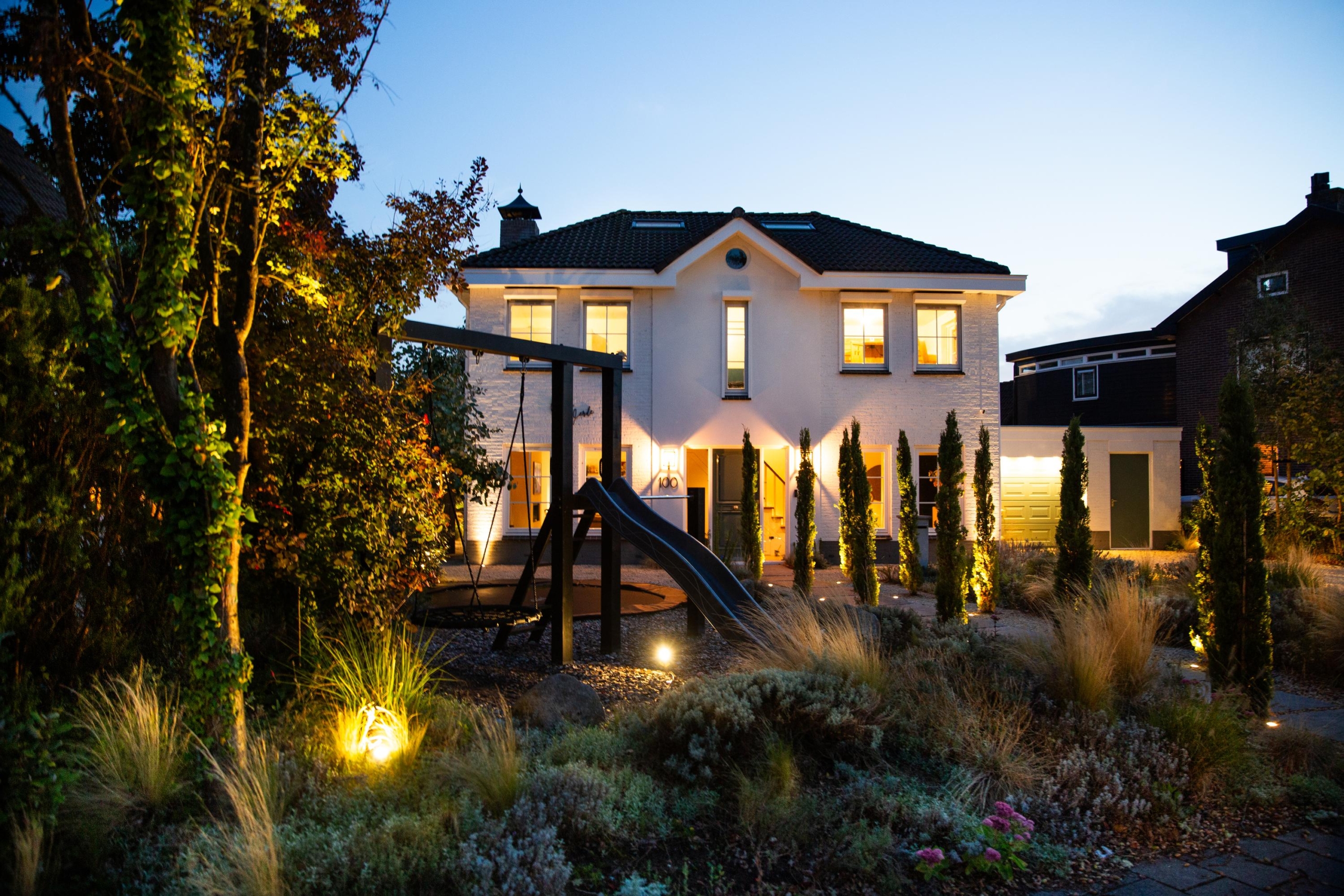 De tuin is rijk aan Toscaanse jasmijn langs de schutting, vijf eucalyptussen en laurierstruiken, wat zorgt voor een heerlijke geurbeleving en een luxe uitstraling. Omdat de tuin wintergroen is, geniet je ook in de koude maanden van een prachtig uitzicht. De tuin is ecologisch verantwoord aangelegd met natuurlijke bestrijdingsmiddelen, waardoor er het hele jaar door bloemen bloeien en bijen, vlinders en egels worden aangetrokken. Dankzij het in-lite lichtplan is de tuin ook in de avond een magische plek. Het kunstgras oogt en voelt als echt, waardoor onderhoud minimaal is en genieten maximaal.
