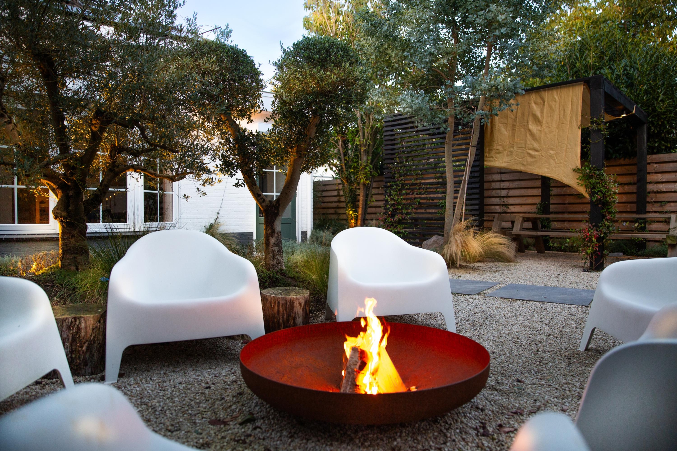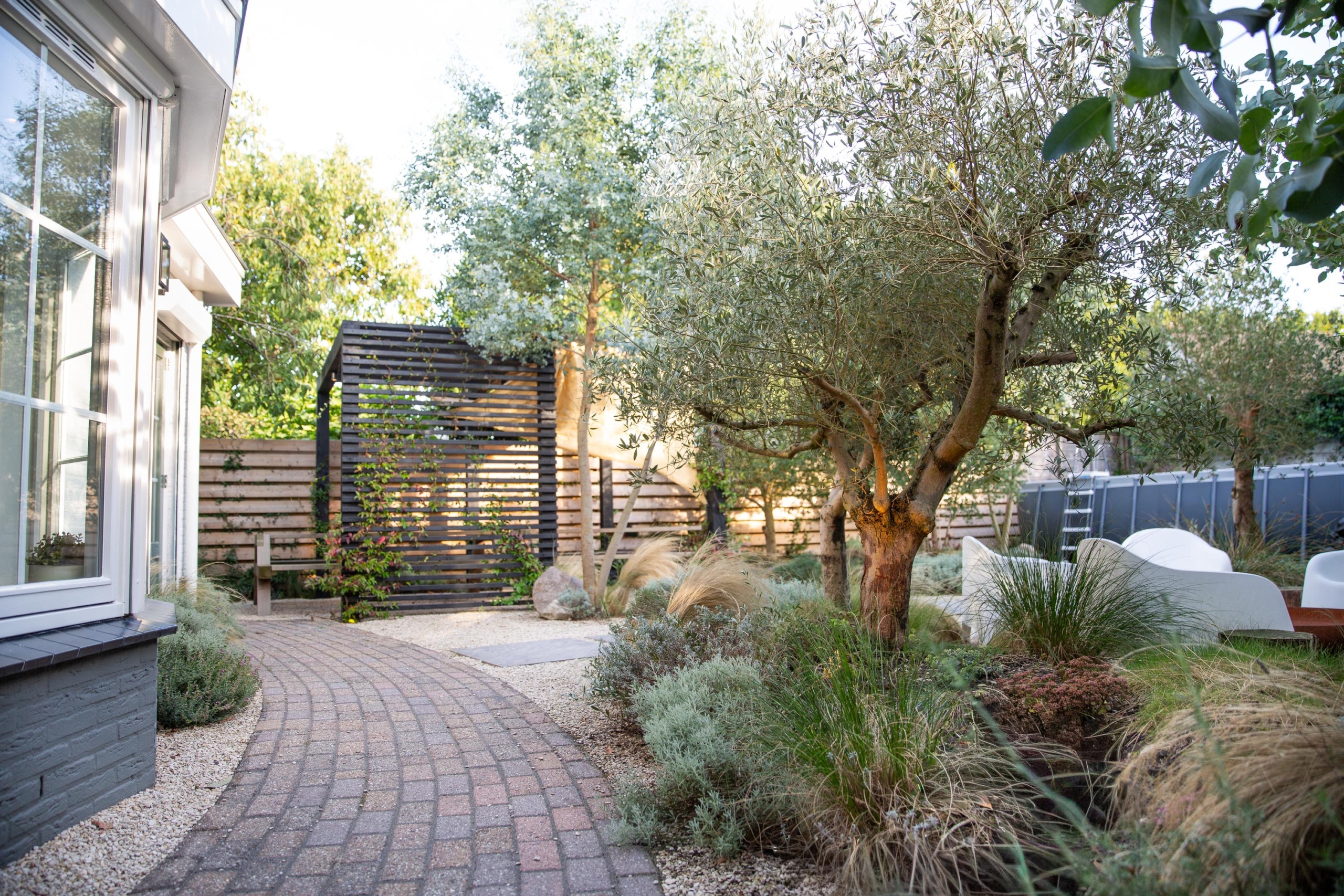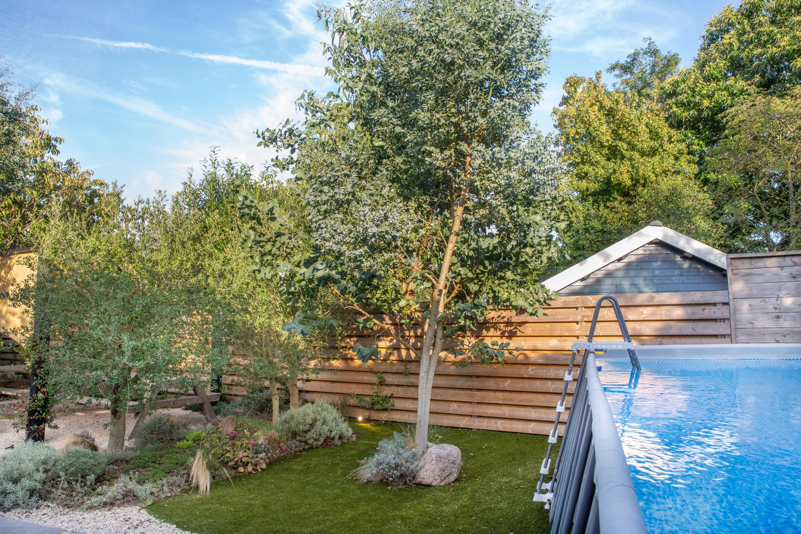 De achtertuin op het zuiden voelt als een mediterrane droom. Omringd door negen olijfbomen ervaar je nu al circa 90% privacy, die dankzij de snelgroeiende olijfbomen, eucalyptussen en laurier binnen 1 Ã 2 jaar volledig zal zijn. Ideaal voor wie waarde hecht aan rust en beschutting. Het verwarmde zwembad met zoutwaterfilter kan het hele jaar blijven staan; in de winter wordt het eenvoudig afgedekt en blijft het water schoon en gefilterd. Zo geniet je van gemak zonder jaarlijks af- en opbouwen. Neem een verfrissende duik, of gebruik de reeds aangelegde voorzieningen om eenvoudig een buitendouche te installeren. Geniet daarna met vrienden of familie bij de gezellige firepit.